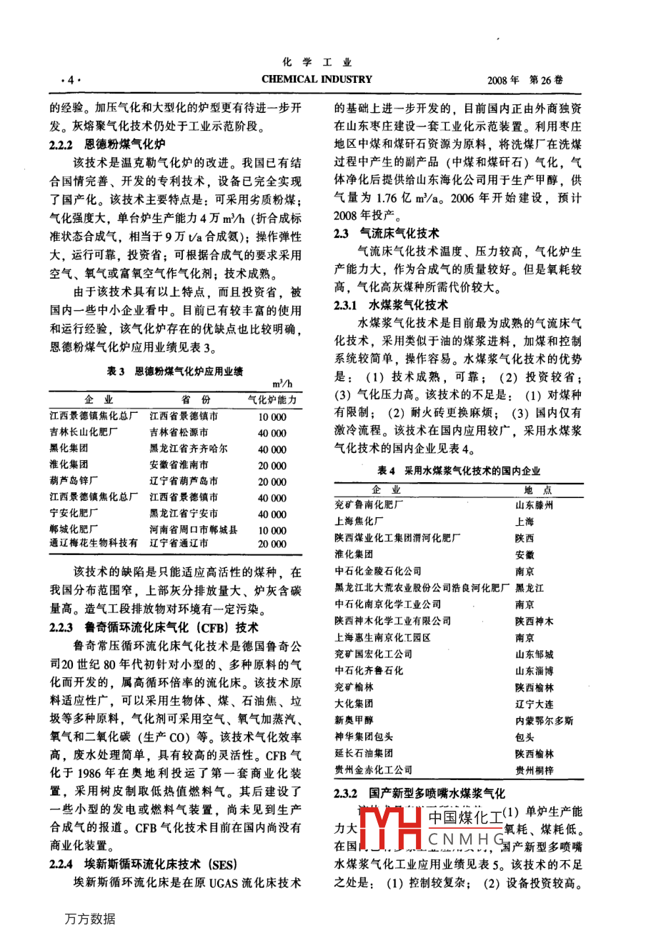 第26卷第4期化學工業(yè)2008年4月CHEMICAL INDUSTRY●1●“我國資源型化工產(chǎn)業(yè)發(fā)展分析報告會”特別報導(- ~)煤資源與煤氣化技術的選擇李志堅(石油和化學工業(yè)規(guī)劃院,北京100013)摘要:對國內(nèi)煤炭資源進行了概述并對已有的煤氣化技術進行了評述,提出了煤氣化技術比較的思路和基礎。煤氣化項目的成功與否,在于平衡好所選技術的可靠性與先進性;投資與運行費用;環(huán)保投入與社會效益。本文是在2008年資源型化工產(chǎn)業(yè)發(fā)展報告會的發(fā)言。關鍵詞:煤氣化;煤氣化廠;合成氣;技術經(jīng)濟對比;述評文章編號: 1673-9647 (2008) 4 -001-06中圉分類號: TQ54文獻標識碼: A1我國煤炭資源蒙東、黑東、云南;低變質(zhì)煙煤(長焰煤、不粘1.1 儲量煤、弱粘煤) 28535億t,占51.23%,主要分布我國煤炭資源相對豐富,預測總資源量為55 697于新疆、陜西、內(nèi)蒙古、寧夏等省區(qū)。中變質(zhì)煙煤億t,查明資源儲量為10 430億t,基礎儲量(氣煤、肥煤、焦煤和瘦煤)資源量15 993億t,3 326億t,可直接經(jīng)濟利用儲量為1 842億t。占28.71%,主要分布于華北。高變質(zhì)煤資源量為位列世界煤炭探明儲量第3名國家。但我國人均7 968億t,占14.31%,主要分布于山西、貴州和煤炭資源量才800t,為世界平均的55%,資源大四川南部。國的10%。我國在世界煤炭探明儲量前7位國家總體來說,我國煤資源具有以下特點:中儲采比最低。前6位分別是俄羅斯(500), 德(1)中高灰煤多。在尚未利用資源量8 260.41國(322), 澳大利亞(236),印度(230), 南非億t,其中特低灰(灰分小于5%)、低灰(灰分小(207)和美國(192)。 我國儲采比才69。而且,于10%)的煤1786.76億t,占尚未利用資源量的我國煤炭資源分布很不均勻。分布特點是:北多21.63%;低中灰(灰分大于10%~20%)的煤南少,西多東少。儲量大于>10 000億t新疆、內(nèi)3626.67億t,占尚未利用資源量的43.90%;中蒙兩個省區(qū);儲量在1000億~10 000億t的省區(qū)高灰(灰分大于20%~30%)的煤2 698.85億t,有山西、陜西、寧夏、貴州四省區(qū);安徽、云南、占尚未利用資源量32.67%。河北、山東四省區(qū)儲量在500億~1 000億t。我們(2)硫分適中。特低硫和低硫煤為4160.01必須要珍惜和合理利用我國的煤炭資源,提高煤億t,占尚未利用資源量的50.37%;低中硫、中炭利用效率。發(fā)展煤化工,將有限的煤炭資源轉(zhuǎn)硫煤2 823.30億t,占尚未利用資源量的34.18%;化為附加值較高的化工原料是我國煤炭資源合理硫分大于2.00%的煤占15.45%。就地域而言,內(nèi)蒙的利用途徑之一。從我國煤炭資源分布特點出發(fā),古、陜西、新疆三省區(qū)特低硫、低硫煤3225.77億t,煤化工產(chǎn)業(yè)宜在富煤地區(qū)發(fā)展,特別是煤資源豐占全國的39.05%;山西、陜西、內(nèi)蒙古三省區(qū)低富的后備煤炭資源產(chǎn)地,可充分發(fā)揮煤化工產(chǎn)品中硫、中硫煤2243.77億t,占全國的27.16%。運費相對較低的優(yōu)勢,對現(xiàn)有的煤炭市場影響也(3)發(fā)熱量較高。全國尚未利用儲量中煤的比較小。發(fā)熱量中國煤化i中高熱值煤占1.2 分品種資源量收稿日斯YHCNMH G我國煤種分布比較齊全。煤資源品種中,褐作者簡介:李志堅(1968-), 男,安徽省人,高級工程師,主要從煤保有資源量3 194億t,占5.74%,主要分布在事無機化工及化肥行業(yè)的規(guī)劃與咨詢工作?;瘜W工業(yè).2.CHEMICAL INDUSTRY2008年第26卷91.80%,低熱值煤少,主要是分布于云南和內(nèi)蒙1.3煤炭供需關系古東部的褐煤。煤炭在我國能源結(jié)構(gòu)中一直占主導地位,煤歸納起來,煤炭資源的種類齊全,包括了從.炭消費量也與國民經(jīng)濟同步增長。2000年,我國褐煤到無煙煤各種不同煤化階段的煤;數(shù)量和分煤炭產(chǎn)量為9.9億t。2007年達到25.36億t。年均布極不均衡。褐煤和低變質(zhì)煙煤資源量占全國煤增長率達到14%,同時我國CDP年均增長也達到炭資源總量的50%以上,動力燃料煤資源豐富。14%,煤炭產(chǎn)銷量保持了與GDP同步的增長速度。而中變質(zhì)煤,即傳統(tǒng)意義的“煉焦用煤”數(shù)量較我國煤炭消費結(jié)構(gòu)中,電力、鋼鐵、建材、少,特別是焦煤資源更顯不足;低變質(zhì)煙煤煤質(zhì)化工為四大煤炭消費大戶,分別占國內(nèi)消費總量優(yōu)良,是優(yōu)良的燃料、動力、化工用煤;高變質(zhì)的53%、13%、15%、5%?;ば袠I(yè)在煤炭消費煤(無煙煤)硫分高。中所占比例并不高,但是煤化工產(chǎn)業(yè)是煤炭消費從煤資源儲量看,我國適合煤氣化的資源儲量中增長最快的。預計到2010年,化工用煤將由量較大,可以滿足煤化工發(fā)展的要求。2005年的1.04億t增長到4億t左右,占到煤炭煤炭資源的優(yōu)化利用與煤種密切相關,低變總消費量的11.5%,由于煤化工產(chǎn)業(yè)主要依托后質(zhì)煤種的分子結(jié)構(gòu)主要是直鏈烴類,作為生產(chǎn)油備煤炭資源和其它產(chǎn)業(yè)不能采用的高硫煤、低質(zhì)品的原料相對較好,而高變質(zhì)煤種主要是復雜的煤為原料,因此,煤化工產(chǎn)業(yè)的快速發(fā)展對煤炭芳烴類,打斷分子鏈能耗較高。從煤資源合理利供需平衡影響不大,煤化工用煤從供應方面也是用角度,低變質(zhì)煤種宜采用焦化和溫和氣化(千可以保證的。我國煤炭產(chǎn)量、出口量和表觀消費餾)的方法,可將煤中的烴類轉(zhuǎn)化為高附加值的量見圖1。油品。目前的氣化一般是煤的深度轉(zhuǎn)化,是將