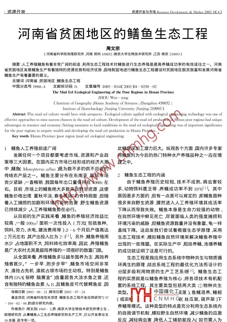 一資源開發(fā)資源開發(fā)與市場(chǎng)Resource Development & Market 2003 19 4)河南省貧困地區(qū)的鱔魚生態(tài)工程周文宗.(河南省科學(xué)院地理研究所河南鄭州450052 南京大學(xué)生物技術(shù)研究所江蘇南京210093)摘要:人工養(yǎng)殖鱔魚有著非常廣闊的前途利用生態(tài)工程技術(shù)對(duì)鱔魚進(jìn)行生態(tài)養(yǎng)殖是提高養(yǎng)鱔成功率的有效途徑之一-。河南省貧困地區(qū)發(fā)展鱔魚生產(chǎn)有著獨(dú)特的資源優(yōu)勢(shì)和經(jīng)濟(jì)優(yōu)勢(shì)因地制宜地進(jìn)行鱔魚生態(tài)工程建設(shè)對(duì)貧困地區(qū)脫貧致富和發(fā)展河南省鱔魚生產(chǎn)有著重要的意義。關(guān)鍵詞河南省貧困地區(qū)鱔魚生態(tài)工程中圖分類號(hào)S966.4文獻(xiàn)標(biāo)識(shí)碼A文章編號(hào):1005- 8141( 2003 )04 -0250-02The Mud Fel Ecological Engineering of the Poor Regions in Henan Province :ZHOU Wen - zong( Institute of Greography ,Henan Academy of Sciences , Zhengzhou 450052 ;Institute of Biotechnology Nanjing University ,Nanjing 210093 )Abstract :The mud eel culture would have wide prospects. Ecological culture applied with ecological engineering technology was one ofeffective approaches to raise success chances in the mud eel culture. Development of the mud eel production in Henan poor regions had uniqueadvantages in resource and economy. Suiting measures to local conditions in the mud eel ecological engineering was of important significancefor the poor regions to acquire wealth and developing the mud eel production in Henan Province.Key words :Henan Province poor region :mud eel ecological engineering1鱔魚人工養(yǎng)殖 前途廣闊此鱔魚深加工潛力巨大??v觀各個(gè)方面國內(nèi)許多專家發(fā)展任何一個(gè)項(xiàng)目都要考慮市場(chǎng)、資源和產(chǎn)業(yè)政將鱔魚列為今后的熱[門特種水產(chǎn)養(yǎng)殖品種之一應(yīng)在情策等三大因素。在國內(nèi)買方市場(chǎng)已經(jīng)形成的經(jīng)濟(jì)大潮理之中。中鱔魚(Monopterusalbus)是為數(shù)不多的供不應(yīng)求的傳統(tǒng)農(nóng)產(chǎn)品之一。鱔魚主要分布在東南亞國際市場(chǎng)2鱔魚生態(tài)工程的內(nèi)涵貨少緊缺-直暢銷我國每年出口量保持在4000t左由于鱔魚養(yǎng)殖歷史較短、技術(shù)不成熟、病蟲害較右。目前,市場(chǎng)上的鱔魚絕大多數(shù)來自野生資源這使多動(dòng)物餌料匱乏等養(yǎng)鱔成功率不到10%[2。其中鱔魚價(jià)格出現(xiàn)夏秋平淡、春冬高揚(yáng)”的奇特局面但隨原因是多方面的但有-點(diǎn)是可以肯定的即鱔魚苗種著人工捕撈的加劇和環(huán)境污染的危害野生鱔魚資源很多來自野生資源驟然進(jìn)入人工養(yǎng)殖環(huán)境其成活率已持續(xù)減少人工養(yǎng)殖鱔魚勢(shì)在必行。下降從而導(dǎo)致失敗。鱔魚本身是生命力較強(qiáng)的動(dòng)物從目前的生產(chǎn)實(shí)踐來看,鱔魚的養(yǎng)殖經(jīng)濟(jì)效益比在自然環(huán)境中鮮見死亡盡管面臨人類的強(qiáng)度捕撈和較高,-般100m2面積一次性投入1萬元包括魚種、環(huán)境污染的威脅但鱔魚資源數(shù)量并沒有象鱉、龜一樣飼料、勞力、水電、建池費(fèi)用等)5~6個(gè)月后產(chǎn)值高達(dá)直線下降。這啟發(fā)我們嘗試著根據(jù)生態(tài)學(xué)原理,采用2萬元左右其產(chǎn)出投入比為2:14。另外鱔魚養(yǎng)殖用生態(tài)工程技術(shù)模擬鱔魚自然環(huán)境來解決鱔魚養(yǎng)殖中水少,占地面積不大飼料轉(zhuǎn)化效率高因此養(yǎng)殖鱔魚出現(xiàn)的一些難題。在實(shí)際生產(chǎn)中稻田養(yǎng)鱔、池塘養(yǎng)鱔是廣大農(nóng)村尤其是庭院養(yǎng)殖的一項(xiàng)很好的致富門路。的成功就證明了這是可行的。從全國來看養(yǎng)殖鱔魚多以越冬囤養(yǎng)為主高效養(yǎng)生態(tài)工程是指應(yīng)用生態(tài)系統(tǒng)中物種共生與物質(zhì)循殖者甚少。”-步早,則步步早”,鱔魚市場(chǎng)空間非常環(huán)再生的原理結(jié)合系統(tǒng)工程的最優(yōu)化方法而設(shè)計(jì)的大,誰搶占先機(jī),誰就占領(lǐng)市場(chǎng)的主動(dòng)權(quán)。特別是鱔魚分層多級(jí)利用物質(zhì)的生產(chǎn)工藝系統(tǒng)3]。鱔魚生態(tài)工體內(nèi)DNA(俗稱腦黃金”)含量居各大淡水魚之首還程的實(shí)質(zhì)就是以鱔魚養(yǎng)殖為核心將各項(xiàng)技術(shù)有機(jī)配含有獨(dú)特的鱔魚血素A.B ,且鱔魚皮可代替鱷魚皮因套的系統(tǒng)工程。其主要類型包括兩大類:①物種共生收稿日期2003 -06-21修改日期2003-07 -24類型。中國煤化工戊蓮)魚鱔混養(yǎng)、鱔蚓基金項(xiàng)目河南省科技攻關(guān)項(xiàng)目鱔魚生態(tài)工程開發(fā)應(yīng)用研究"( 97(或田.MYHCNMH G2(絲瓜架、葫蘆架)下104 - 02 - 06的部分研究?jī)?nèi)容。作者簡(jiǎn)介周文宗( 1969 - )男南京大學(xué)生物技術(shù)研究所博士生,養(yǎng)鱔等模式。這種類型的特點(diǎn)是充分利用生態(tài)系統(tǒng)內(nèi)助理研究員從事鱔魚人工生態(tài)養(yǎng)殖研究和生產(chǎn)工作,已公開發(fā)表論文的自我調(diào)節(jié)機(jī)制模擬野生自然環(huán)境減少鱔魚的應(yīng)激10余篇獲專利-項(xiàng)。反應(yīng),減輕病蟲害降低人工輔助能投入(如勿需人為250資源開發(fā)與市場(chǎng)Resource Development & Market 2003 19(4 )資源開發(fā)_遮蔭和人工控制鱔魚生態(tài)密度。通過水草等生物措量