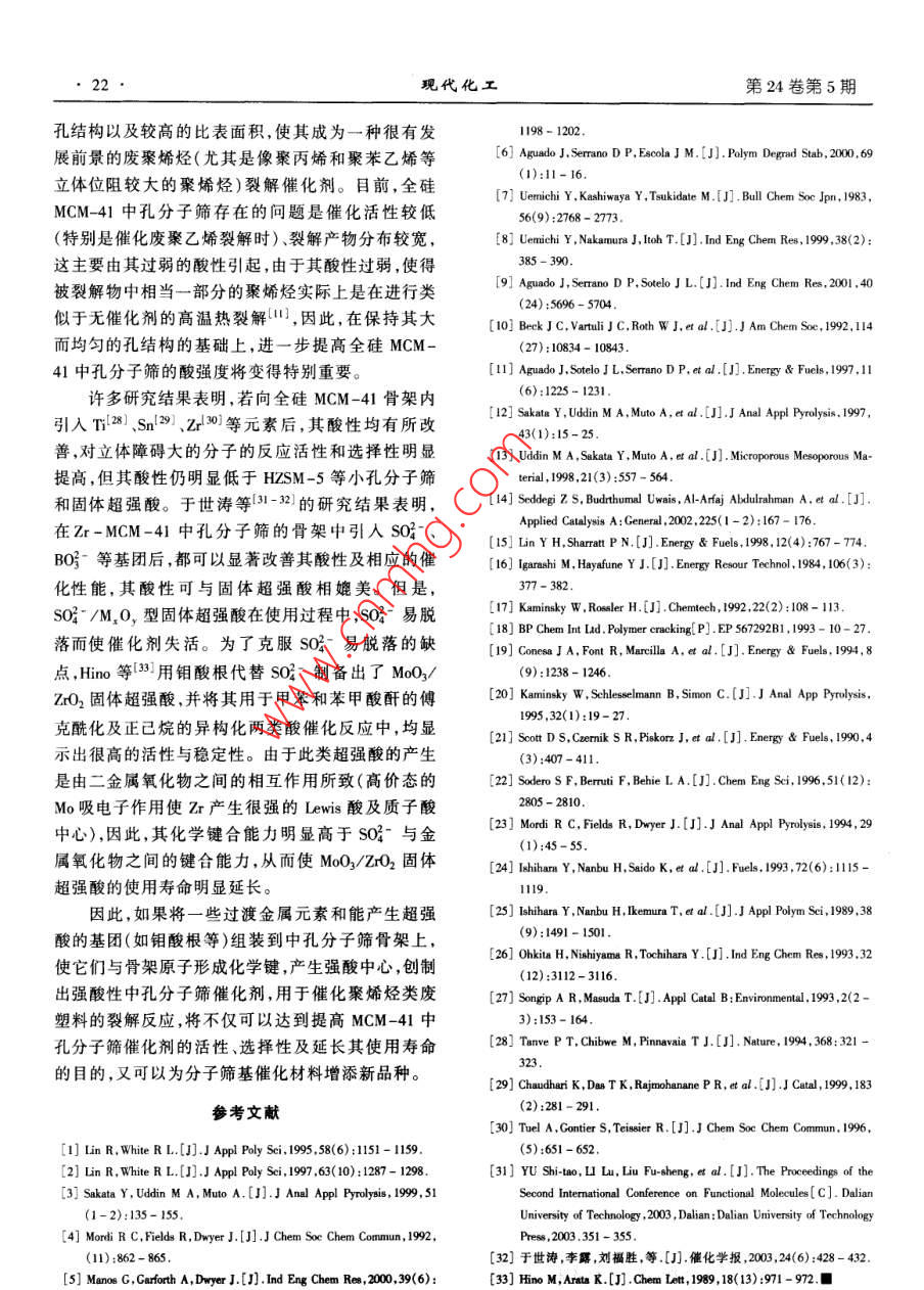 第24卷第5期現(xiàn)代化工May 20042004年5月Modem Chemical Industry19 ●廢聚烯烴催化裂解研究進(jìn)展解從霞',2劉福勝2 于世濤2葛曉萍2雷火星2 侯曉紅2楊錦宗'(1.大連理工大學(xué)精細(xì)化工國(guó)家重點(diǎn)實(shí)驗(yàn)室,遼寧大連116012;2.青島科技大學(xué)化工學(xué)院,山東青島266042)摘要:綜述了廢聚烯烴催化裂解反應(yīng)中所用的主要催化劑及反應(yīng)器的研究進(jìn)展。指出中孔分子篩由于其大而均勻的孔結(jié)構(gòu)以及較高的比表面積有望成為處理廢囊婚烴的有效催化劑,流化床反應(yīng)器是處理廢聚烯烴的有效反應(yīng)器。與傳統(tǒng)的小孔分子篩相比.目前所用的全硅型中孔分子篩還存在酸性弱、催化活性低等缺點(diǎn),建議應(yīng)通過(guò)在全硅型中孔分子篩骨架中引人某些過(guò)渡金屬元素和某些能產(chǎn)生超強(qiáng)酸的基團(tuán).進(jìn)-步提高該類催化劑的酸強(qiáng)度、催化活性及穩(wěn)定性。關(guān)鍵詞:廢聚烯烴;催化裂解:中孔分子篩中圖分類號(hào):TQ032;X705文獻(xiàn)標(biāo)識(shí)碼:A文章編號(hào):0253 - 4320(200)05 - 0019 - 04Progress in catalytic pyrolysis of waste polyolefinsXIE Cong-xial.2, LIU Fu-sheng”, YU Shi-tao”, GE Xiao-ping', LEI Huo xing2 ,HOU Xiao-hong2,YANG Jin- zong'(1. State Key Laboratory of Fine Chemicals, Dalian University of Technology, Dalian 116012, China; .2. Cllege of Chemical Engineering, Qingdao University of Science and Technology,Qingdao 266042, China)Abstract: The progress in various catalysts and reactors used in catalytie pyrolysis of waste polyolefins was reviewed.Itwas pointed out that the mesoporous molecular sieve (MCM- 41) would be expected to become an fectre catalyst for treatingwaste polyoleins because of its larger and more uniform mesopore structure and higher specific surface area ,and that a fluidizedbed reactor would be the efectre reaclor for the catalytice prolysis of waste polylefins . Compared to the conventional zeolites ofsmall sized pores , MCM-41 is stll of poorer acidity and lower catalytic activity . It was suggested that the research work be placedon improving the acidity , ativity and sability of MCM-41 by adding some tansition metals and some strong acid goups into itsframe .Key words: waste plyolefin; catalytic pyrolysis; megoporous molecular sieve廢塑料的回收利用可分為四級(jí):①一級(jí)回收利解及醇解等非催化熱裂解方法回收單體;對(duì)于聚烯用是指采用通常的加工方法將可回收的廢舊塑料加烴類廢塑料,由于其熱穩(wěn)定性較高,因此主要采用催工成與新料性能相同或相近的產(chǎn)品;②二級(jí)回收利化熱裂解的方式。通過(guò)三級(jí)回收利用既可以制得許用是指把廢舊塑料經(jīng)一種或多種加工方法加工成性多用途廣泛的化工基礎(chǔ)原料或精細(xì)化學(xué)品,也可以能比新料稍差的產(chǎn)品;③三級(jí)回收利用是指回收廢解決塑料廢棄物造成的環(huán)境污染問(wèn)題。因此,三級(jí)舊塑料中的化學(xué)成分,使之成為單體或燃料;④四級(jí)回收利用已引起國(guó)內(nèi)外研究者的廣泛關(guān)注。筆者在.回收利用是指通過(guò)廢舊塑料焚燒回收能量。由于一此對(duì)近年來(lái)廢聚烯烴催化裂解方面的國(guó)內(nèi)外研究進(jìn)級(jí)和二級(jí)回收利用對(duì)廢塑料的質(zhì)量要求較高,四級(jí)展進(jìn)行綜述?;厥绽脮?huì)釋放- - 些有害氣體導(dǎo)致空氣污染,因此,1無(wú)定形硅鋁氧化物和小孔分子篩催化裂解三級(jí)回收利用就成為廢塑料回收利用中最有發(fā)展?jié)摿Φ囊? 種途徑。早期文獻(xiàn)中所采用的催化劑主要包括無(wú)定形三級(jí)回收利用主要有2種形式,即熱裂解和催Si02- Al2O3及小孔分子篩(如HZSM-5)等。研究表化熱裂解。對(duì)于聚酯、聚酰胺及聚氨酯等縮聚型的明,當(dāng)采用無(wú)定形Si02- Al2O3和HZSM-5分子篩等廢塑料,由于其分子中存在活潑官能團(tuán),很容易經(jīng)水固體酸催化劑用于催化聚乙烯裂解反應(yīng)時(shí),反應(yīng)活收稿日期2003- 12- 30:修回日期:204-02-03基金項(xiàng)目:國(guó)家自然科學(xué)基金(20376035)及山東省自然科學(xué)基金( Y2002B04)資助項(xiàng)目作者簡(jiǎn)介:解從霞(1963- ),女.博士生,副教授;劉福勝(1963- ),男,博士,教授,主要從事催化新材料精細(xì)化學(xué)品合成及天然資源化學(xué)利用等方面的研究工作,通訊聯(lián)系人,0532 - 42729639@ pbli.qd. ad.cn:楊錦宗(1933- ),男,中國(guó)工程院院士.教授,博士生導(dǎo)師,主要從事催化新材料和精細(xì)化工領(lǐng)城的研究。2004年5月.解從霞等:廢聚烯烴催化裂解研究進(jìn)展21●因此,目前人們對(duì)于聚烯烴類廢塑料裂解反應(yīng)中所裂解PP和PE的速率可以和酸性的SA-1催化劑相用的催化劑的設(shè)計(jì)研究,主要圍繞解決上述3方面媲美,但液體產(chǎn)物收率較高。在FSM上得到的液體問(wèn)題進(jìn)行。產(chǎn)物的分布類似于煤油和柴油的混合物,而在SA-11992年美國(guó)Mobil公司的Beck等[10]首先報(bào)道上得到的液體產(chǎn)物的分布類似于汽油組分(6%13)。了新一類中孔分子篩的合成方法及形成機(jī)理,這種.催化劑壽命實(shí)驗(yàn)表明,SA-1的失活速度比FSM快按“液晶模板機(jī)理"形成的新型中孔分子篩的特點(diǎn)得多,這歸因于其較小的孔徑和較強(qiáng)的酸性而導(dǎo)致是:熱穩(wěn)定性好,具有兩端敞開(kāi)而開(kāi)闊的均勻-維線結(jié)炭較嚴(yán)重。在FSM催化劑上得到的結(jié)果表
