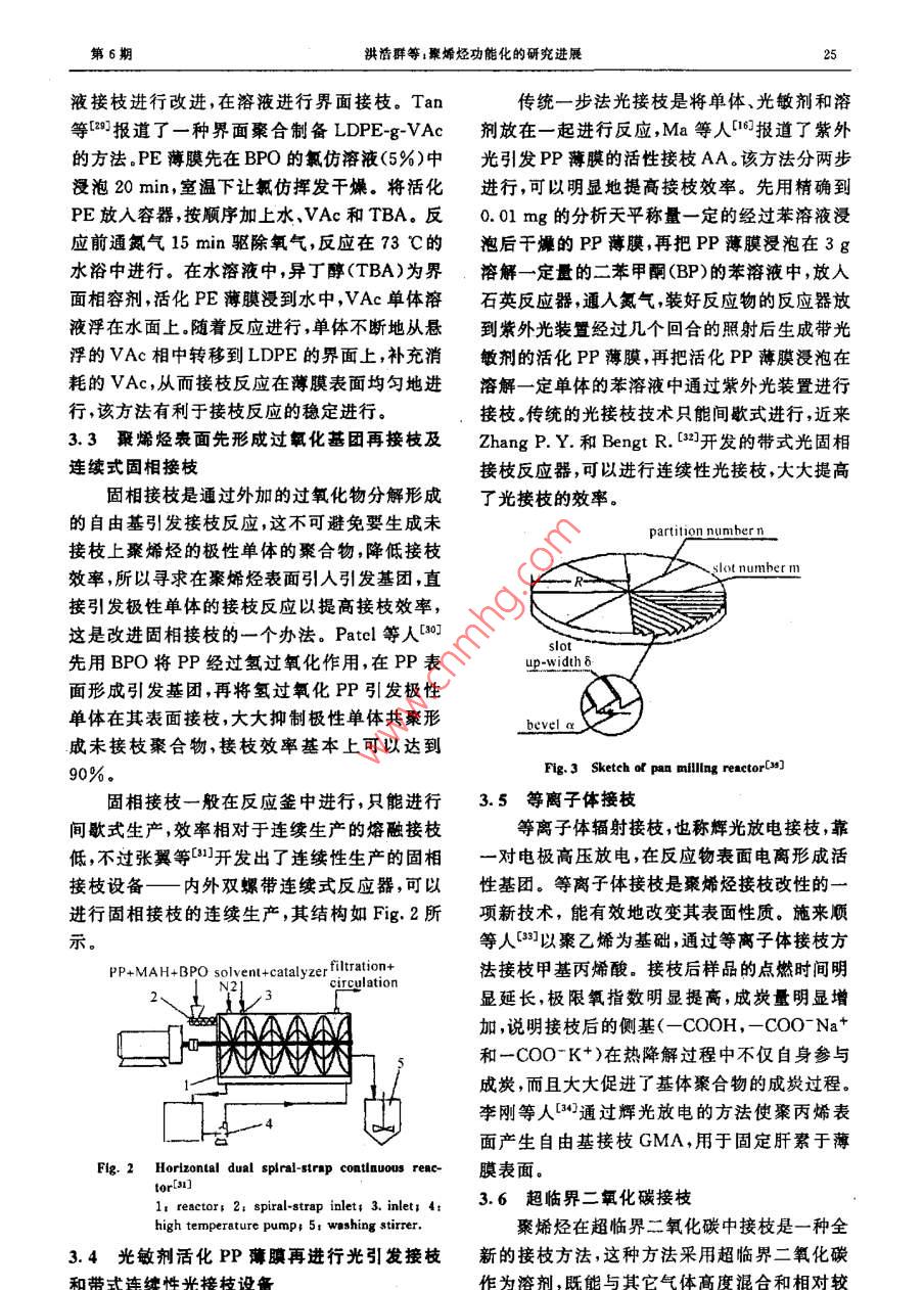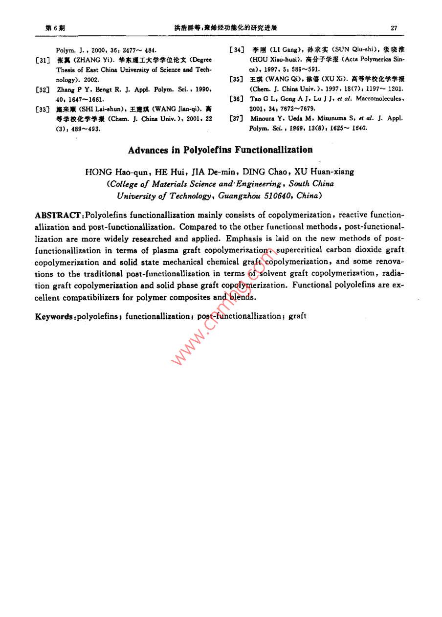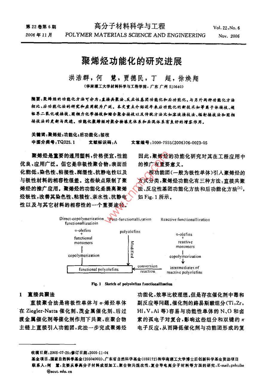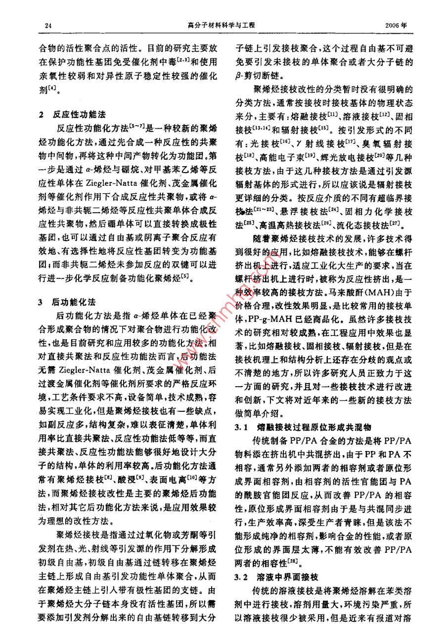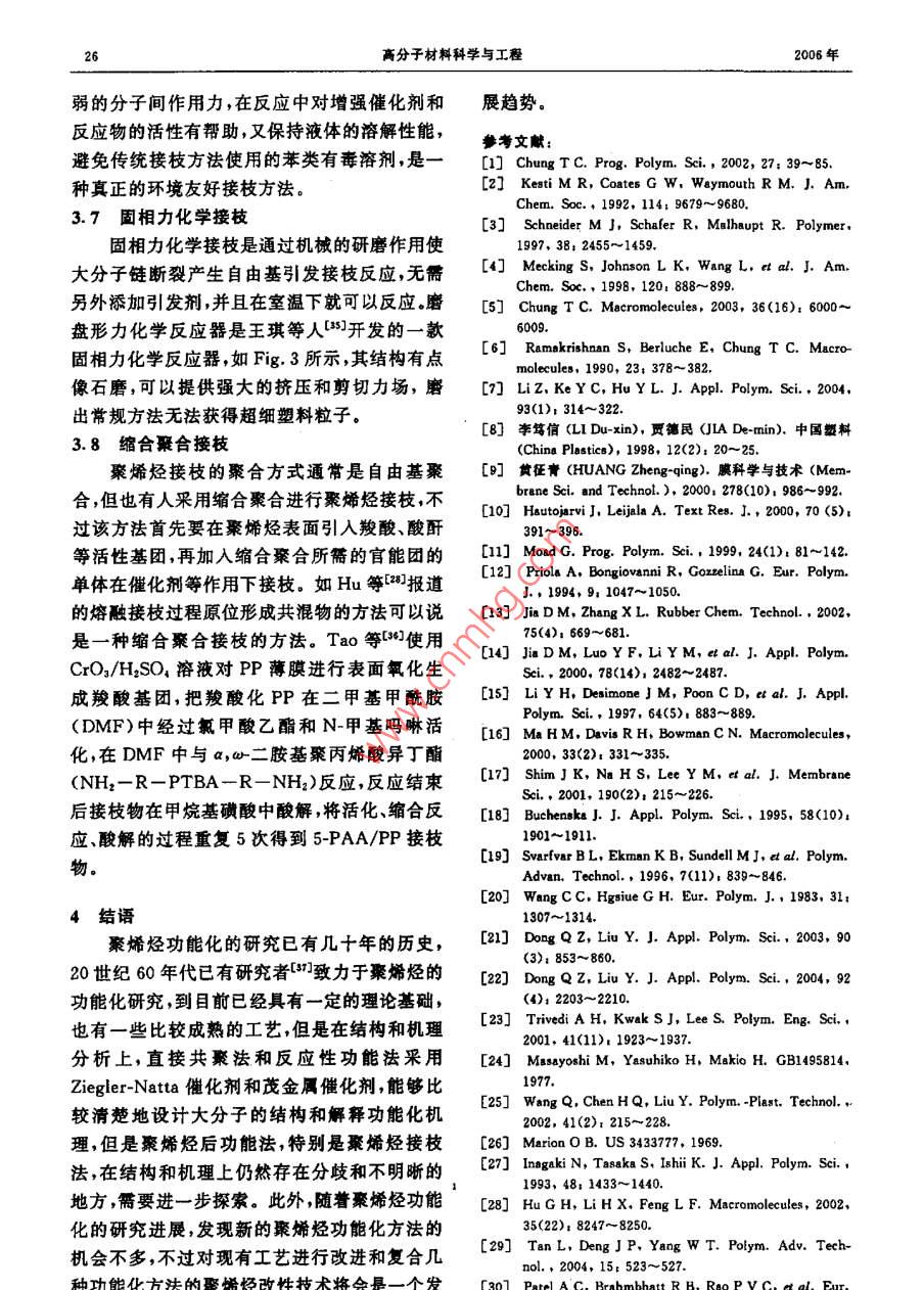 第22卷第6期高分子材料科學與工程Vol. 22,No. 62006年11月.POLYMER MATERIALS SCIENCE AND ENGINEERINGNov.2006聚烯烴功能化的研究進展洪浩群,何慧,賈德民,丁超,徐煥翔(華南理工大學材料科學與工程學院,廣東廣州510640)摘要;聚埽烴的功能化方法可分為:直接共聚法、反應性基團功能化和后功能化。與另外兩種功能化方法相比,后功能化法的研究和應用較為廣泛。本丈重點介紹近年來后功能化的新技術如等離子體揍枝、超臨界二氧化碳接技、固相力化學接枝和縮合聚合接枝以及傳統(tǒng)方法比如溶液接枝法、輻射接枝法和團相接枝法的更新與改進。功能化聚蜂烴對聚合物鎮(zhèn)充體系和共混體系有良好的增容作用。關鍵詞;聚烯烴;功能化后功能化1接枝中圖分類號:TQ325. 1文獻標識碼:A文章編號:1000- 755(2006)06-0023-05聚烯烴是重要的通用塑料,價格便宜,性能因此,聚烯烴的功能化研究對其在工程應用中優(yōu)良,應用廣泛。但它是非極性聚合物,表面活的推廣有重要意義?;艿?染色性、粘接性、潤濕性、抗靜電性以及按功能團(一般為極性單體)引人聚烯烴的與極性材料的相容性很差。這些缺點限制了聚方式分類,聚烯烴功能化有三種方法:直接共聚烯烴的推廣應用。聚烯烴的功能化是提高聚烯法、反應性基團功能化方法和后功能化方法1,烴極性,改普其染色性粘接性、親水性、抗靜電如Fig.1所示。性以及與其它材料的相容性的一個重要途徑。Direct- copolmerization Post-functionalli/ationReactive functionallixationfunctionallizatioina-olefinspolyolefinsfunctionalmonomersreactivecopolymerization|copolyincrizationconversionfunctional polyolelinsreaction.reactive polyolefinsFig.1 Sktch of polyolefins functlonllintlon1直接共聚法功能化,效率比較理想.但是存在催化劑中毒和直接聚合法是將極性單體與a-烯烴單體副反應等問題。催化劑的路易斯酸組分(Ti,Zr,在Ziegler-Natta 催化劑、茂金屬催化劑、后過Hf,V,Al等)容易與功能性單體的N、0和鹵渡金屬催化劑等催化劑作用下共聚,在聚合物素的孤電子對復合,影響這些組分和雙鍵的π主鏈.上直接引人功能團,此法--步完成聚烯烴電子反應,從而降低催化劑與功能團形成的復收稿日期2005- 07-25;能訂日期2005-11-04基金項目:國家自然科學基金(20304003)、廣東省自然科學基金(039172)和華南理工大學博士后創(chuàng)新科學基金資助項目聯(lián)系人:何麓,主要從事高分子材 料成型加工、聚合物共混改性、復合導電高分子材料等方面的研兗.E-mailpshuihe@ecut. edu. cn24高分子材料科學與工程2006年合物的活性聚合點的活性。目前的研究主要放子鏈上引發(fā)接枝聚合,這個過程自由基不可避在保護功能性基團免受催化劑中毒[z.3]和使用免要引發(fā)未接枝的單體聚合或者大分子鏈的親氧性較弱和對異性原子穩(wěn)定性較強的催化β-剪切斷鏈。劑的。聚烯烴接枝改性的分類暫時沒有很明確的分類方法,通常按接枝時接枝基體的物理狀態(tài)2反應性功能法來分,主要有:熔融接[11、溶液接枝[12、固相反應性功能化方法-”]是一種較新的聚烯接枝153.1和輻射接枝(05]。按引發(fā)形式的不同烴功能化方法,通過先合成-種反應性的共聚有:光接枝[8、2射線接枝[2、臭氧輻射接物中間物,再將這種中間產(chǎn)物轉(zhuǎn)化為功能團。第枝5(8]、高能電子束[輝光放電接枝[0]等幾種一步是通過a-烯烴與硼烷、對甲基苯乙烯等反接枝方法,由于這幾種接枝方法是通過引發(fā)源應性單體在Ziegler-Natta催化劑、茂金屬催化輻射基體的形式進行,所以應該說是輻射接枝劑等催化劑作用下合成反應性共聚物,或?qū)-更詳細的 分類。按反應介質(zhì)的不同有超臨界接烯烴與非共軛二烯烴等反應性共聚單體合成反枝法[1~0]、懸浮接枝法[21、固相力化學接枝應性共聚物,然后硼單體可以直接轉(zhuǎn)換成極性法[63、高溫高熱接枝法[28]、流化態(tài)接枝法[2]。基團,也可以通過自由基或陰離子聚合反應有隨著聚烯烴接枝技術的發(fā)展,許多技術得效地、有選擇性地將反應性基團轉(zhuǎn)變?yōu)楣δ芑胶芎玫膽?比如熔融接枝技術,能夠在螺桿團;而非共軛二烯烴未參加反應的雙鍵可以進擠出機上進行,適應工業(yè)化大生產(chǎn)的要求,當在行進一步化學反應制備功能化聚烯烴5。螺桿擠出機上進行時,被稱為反應性擠出,是一種效率較高的接枝方法。馬來酸酐(MAH)由于3后功能化法價格合理,改性效果明顯,是比較常用的接枝單后功能化方法是指a~烯烴單體在已經(jīng)聚體,PP-g-MAH已經(jīng)商品化。雖然許多接枝技合形成聚合物的情況下對聚合物進行功能化改術的研究相對較成熟,在工程應用中效果也顯性,也是目前研究和應用較多的功能化方法。相著,比如熔融接枝、固相接枝、輻射接枝,但是在.對直接共聚法和反應性功能法而言,后功能法接枝機理上和結(jié)構分析上還存在分歧的觀點或無需Ziegler-Natta 催化劑、茂金屬催化劑、后不清楚的地方,所以許多研究人員正致力于這過渡金屬催化劑等催化劑所要求的嚴格反應環(huán)一方面的研究,并且對一些接枝技術進行改進境,工藝條件要求不高,設備簡單,技術成熟,容和創(chuàng)新,下文將對近年來的一些新的接枝方法易實現(xiàn)工業(yè)化,但是聚烯烴接枝也有一些缺點,做簡單介紹。如副反應多,結(jié)構復雜,難以表征清楚,單體利3.1熔融接枝過程原位形成共混物用率比直接共聚法、反應性功能法低等等,