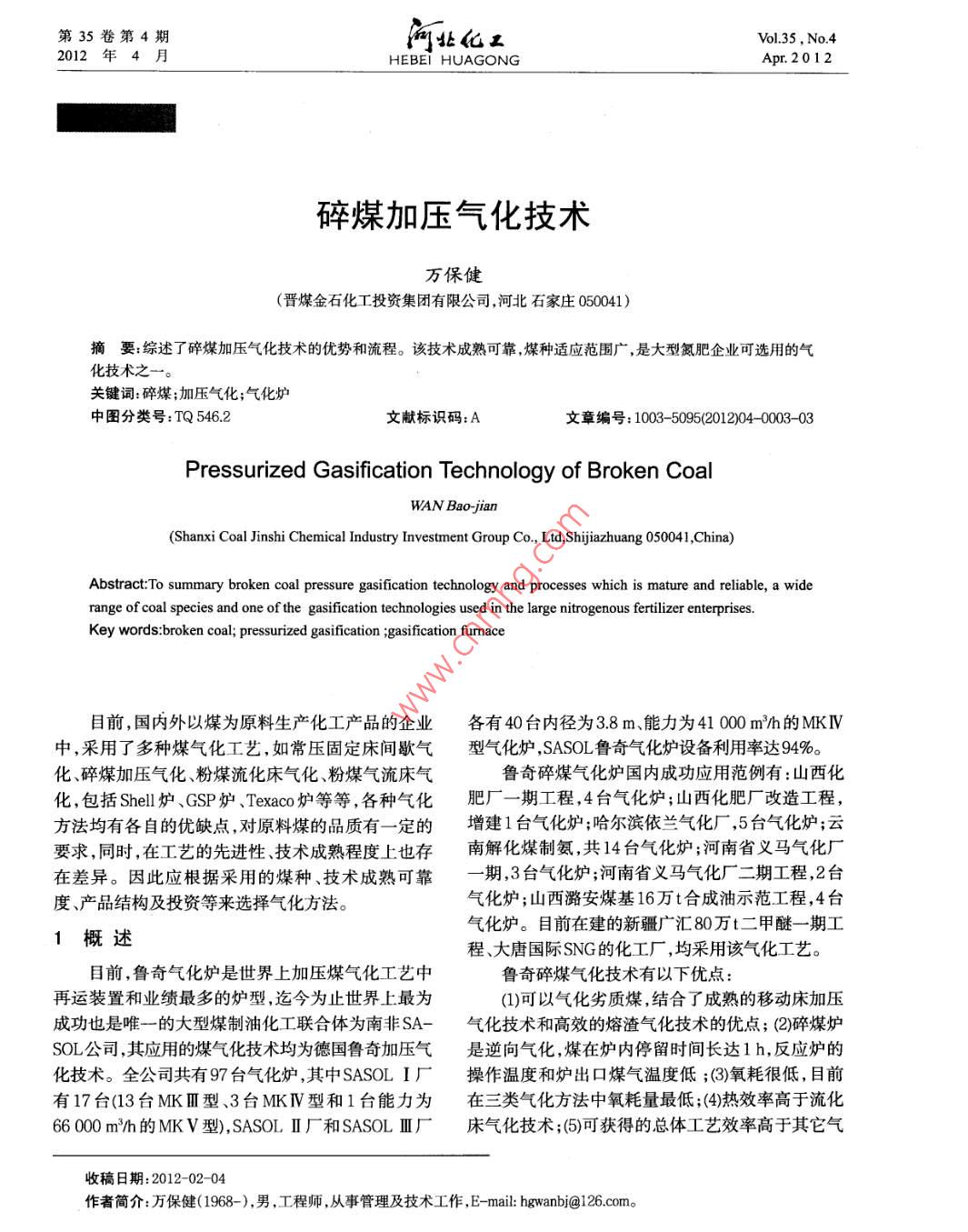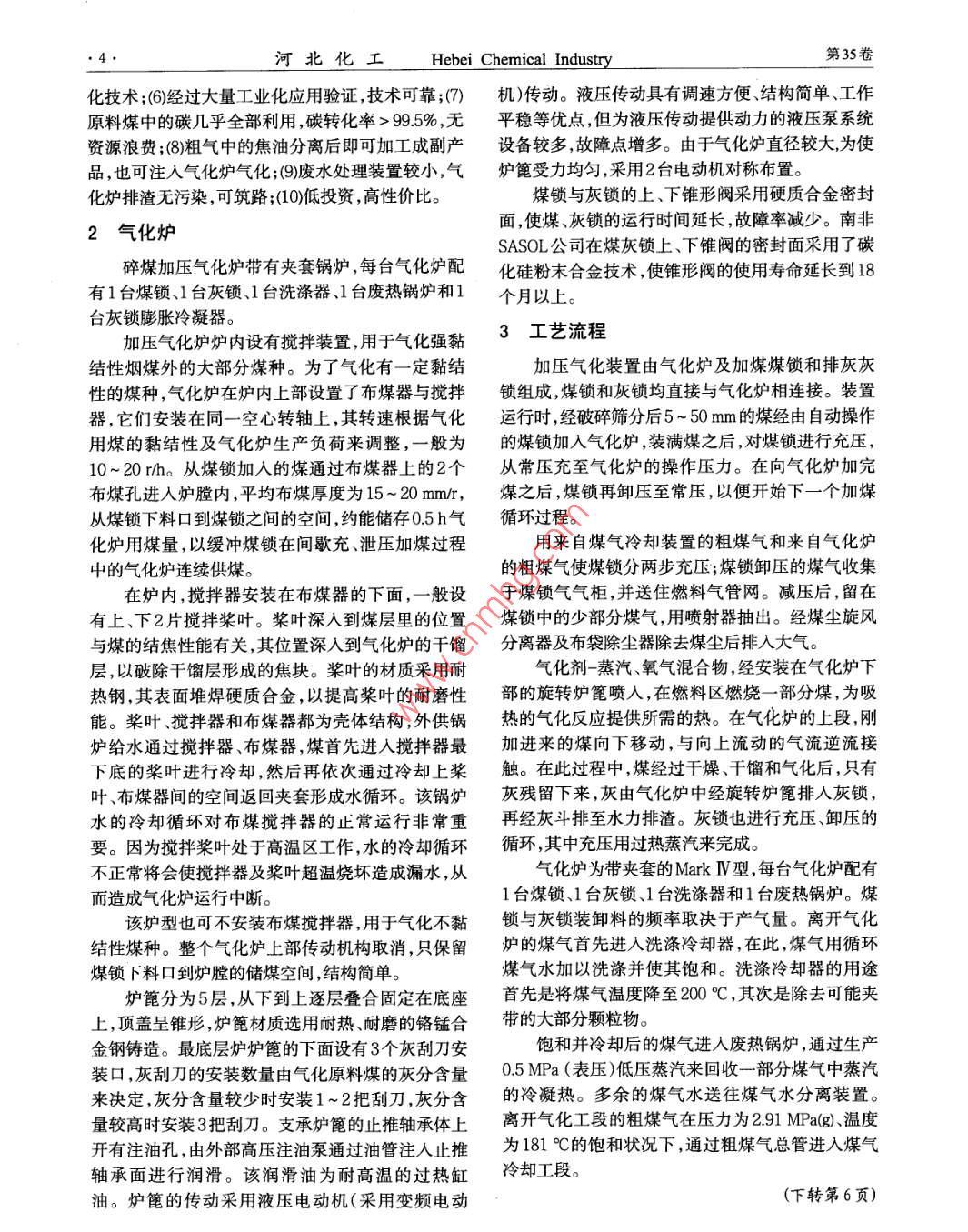 第35卷第4期河北化工Vol.35, No.42012年4月HEBEI HUAGONGApr.2012碎煤加壓氣化技術(shù)萬保健(晉煤金石化工投資集團(tuán)有限公司,河北石家莊050041)摘要:綜述了碎煤加壓氣化技術(shù)的優(yōu)勢和流程。該技術(shù)成熟可靠,煤種適應(yīng)范圍廣,是大型氮肥企業(yè)可選用的氣化技術(shù)之一。關(guān)鍵詞:碎煤;加壓氣化;氣化爐中圖分類號:TQ 546.2文獻(xiàn)標(biāo)識碼:A文章編號:1003- 5095(2012)04-0003-03Pressurized Gasification Technology of Broken CoalWAN Baojian(Shanxi Coal Jinshi Chemical Industry Investment Group Co, Ld,Shjazhuang 050041,China)Abstract:Tosummary broken coal pressure gasification technology and processes which is mature and reliable, a widerange of coal species and one of the gasification technologies used in the large nitrogenous fertilizer enterprises.Key words:broken coal; pressurized gasification ;gasification furmace目前,國內(nèi)外以煤為原料生產(chǎn)化工產(chǎn)品的企業(yè)各有40臺內(nèi)徑為3.8m、能力為41000m/h的MKIV中,采用了多種煤氣化工藝,如常壓固定床間歇?dú)庑蜌饣癄t, SASOL魯奇氣化爐設(shè)備利用率達(dá)94%?;⑺槊杭訅簹饣?、粉煤流化床氣化粉煤氣流床氣魯奇碎煤氣化爐國內(nèi)成功應(yīng)用范例有:山西化化,包括Shell爐、GSP爐、Texaco爐等等,各種氣化肥廠一期工程,4臺氣化爐;山西化肥廠改造工程,方法均有各自的優(yōu)缺點,對原料煤的品質(zhì)有- -定的增建1臺氣化爐;哈爾濱依蘭氣化廠,5臺氣化爐;云要求,同時,在工藝的先進(jìn)性、技術(shù)成熟程度上也存南解化煤制氨,共14臺氣化爐;河南省義馬氣化廠在差異。因此應(yīng)根據(jù)采用的煤種、技術(shù)成熟可靠- -期,3臺氣化爐;河南省義馬氣化廠二期工程,2臺度、產(chǎn)品結(jié)構(gòu)及投資等來選擇氣化方法。氣化爐;山西潞安煤基16萬t合成油示范工程,4臺氣化爐。目前在建的新疆廣匯80萬t二甲醚一期工1概述程、大唐國際SNG的化工廠,均采用該氣化工藝。目前,魯奇氣化爐是世界上加壓煤氣化工藝中魯奇碎煤氣化技術(shù)有以下優(yōu)點:再運(yùn)裝置和業(yè)績最多的爐型,迄今為止世界上最為(1)可以氣化劣質(zhì)煤,結(jié)合了成熟的移動床加壓成功也是唯-的大型煤制油化工聯(lián)合體為南非SA-氣化技 術(shù)和高效的熔渣氣化技術(shù)的優(yōu)點; (2)碎煤爐SOL公司,其應(yīng)用的煤氣化技術(shù)均為德國魯奇加壓氣是逆向氣化,煤在爐內(nèi)停留時間長達(dá)1h,反應(yīng)爐的化技術(shù)。全公司共有97臺氣化爐,其中SASOL I廠操作溫度和爐出口煤氣溫度低;(3)氧耗很低,目前有17臺(13臺MKI型、3臺MKIV型和1臺能力為在三類氣化方法中氧耗量最低;(4)熱效率高于流化66 000 m^/h的MK V型),SASOL I廠和SASOL II廠床氣化技術(shù);(5)可獲得的總體工藝效率高于其它氣收稿日期:2012-02-04作者簡介:萬保健(1968-),男,工程師,從事管理及技術(shù)工作, E- -mail: hgwanbj@126.com?!?.河北化工Hebei Chemical Industry第35卷催化劑層,覆蓋在催化劑表面,羰基鐵在催化劑表面另外,可在水冷器殼程的上水管處加蒸汽管,上的積累越多,高級醇及烷烴(即石蠟)的生成量就先將上水閥關(guān)死,然后通人蒸汽,管程內(nèi)壁附著的越大,從而造成甲醇產(chǎn)品、設(shè)備、管道和閥門結(jié)蠟。石蠟受熱融化流出,達(dá)到除蠟的目的。2.2溫度的影響針對結(jié)蠟現(xiàn)象,可采取以下預(yù)防措施:生產(chǎn)實踐證明,在甲醇生產(chǎn)過程中,合成塔反(1)提高催化劑的質(zhì)量,降低催化劑中Fe、Ni等應(yīng)溫度控制太低,使人塔氣在低于催化劑正?;钚杂泻υ?溫度的情況下進(jìn)入催化劑層,生成的粗甲醇中就會(2)正常生產(chǎn)中,合成塔操作溫度控制在190~帶有大量石蠟,主要是在開車投料階段,合成塔反300 °C ,停車置換期間,合成塔溫度≥190°C,并且應(yīng)溫度還未達(dá)到正常操作值( < 190 °C)時或在停車置換徹底, (CO + CO2)含量<0.5%;過程中,合成塔反應(yīng)溫度下降,而原料氣又未置換(3)原料氣中的CO含量不能太高,可適當(dāng)提高干凈,因此產(chǎn)生的石蠟最多。CO2含量;操作過程中,溫度波動幅度大,也容易結(jié)蠟。(4)定期清洗,檢修期間對水冷器、分離器及閥合成反應(yīng)中,當(dāng)合成反應(yīng)溫度>300°C時,有利于副門里的蠟和Fe等雜質(zhì)全部清理。反應(yīng)的生成,加速了石蠟的生成。4結(jié)論2.3 原料氣的影響甲醇合成過程中,合成氣中CO含量過高,合成甲醇生產(chǎn)過程中,普遍存在結(jié)蠟現(xiàn)象,會對生空速過低,使氣體與催化劑的接觸時間長,轉(zhuǎn)化率產(chǎn)造成影響。石蠟的產(chǎn)生比較復(fù)雜,通過分析結(jié)蠟高,但造成純度下降,石蠟等副產(chǎn)物增多。當(dāng)合成原因,并在生產(chǎn)中采取有效措施,預(yù)防并減少石蠟氣人塔溫度控制過高時,合成氣中的水蒸氣在含有的生成,可實現(xiàn)穩(wěn)定生產(chǎn)。Fe的催化劑的作用下與CO反應(yīng)生成石蠟,同時還參考文獻(xiàn)會生成乙醇。([]陳子欣甲醇生產(chǎn)過程結(jié)蠟的原因及解決方法[D.中氨肥, 2001,3石蠟的處理方法及預(yù)防(4):35-37.[2]王磊,張國連.我廠甲醇合成系統(tǒng)運(yùn)行情況總結(jié)[J]山東化工,甲醇合成過程中結(jié)蠟現(xiàn)象嚴(yán)重,會造成系統(tǒng)的2002,31(3):28-29.管道.設(shè)備、閥門堵塞。當(dāng)水冷器的堵塞嚴(yán)重時,使[3]羅學(xué)良.對甲醇合成過程中結(jié)蠟現(xiàn)象的探討J1.氮