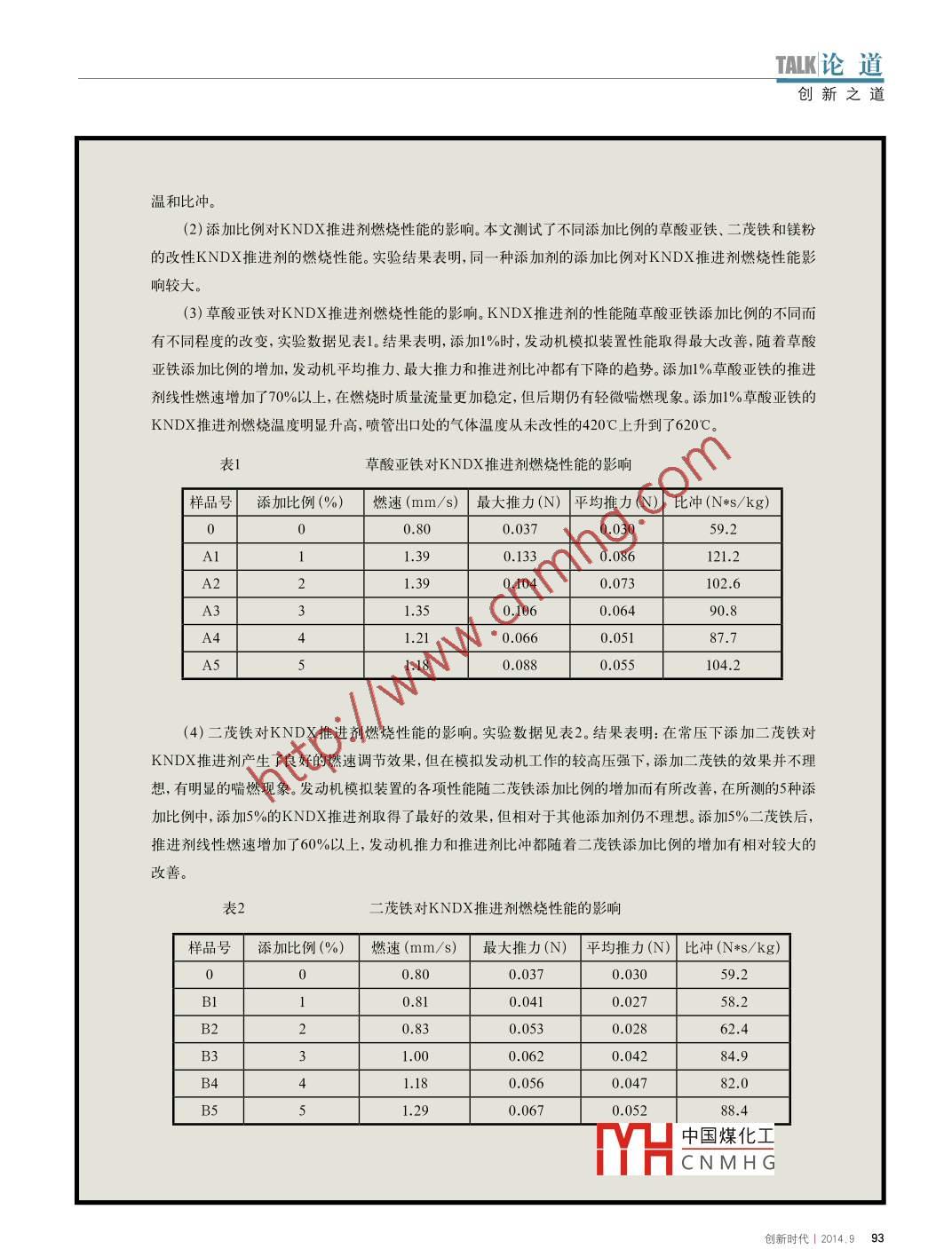 論道|TALK創(chuàng)新之道添加劑種類及添加比例對(duì)KNDX推進(jìn)劑燃燒性能的影響.凌一洲/文摘要:研究了常壓下9種添加劑對(duì)KNDX推進(jìn)劑燃燒性能的影響,并從中挑選出3種效果較好的添加劑。模擬固體火箭發(fā)動(dòng)機(jī)工作時(shí)推進(jìn)劑的燃燒情況,研究了選出的3種添加劑的添加比例對(duì)KNDX推進(jìn)劑燃燒性能的影響。結(jié)果表明,不同添加劑和添加比例對(duì)KNDX推進(jìn)劑燃燒性能都有明顯影響,添加5%鎂粉或1%草酸亞鐵的KNDX推進(jìn)劑燃速、溫度和比沖等性能最佳。關(guān)鍵詞:改性KNDX推進(jìn)劑添加劑燃燒性能引言硝酸鉀-葡萄糖復(fù)合推進(jìn)劑(KNDX)是由硝酸鉀(KN)和葡萄糖(DX)為主要原料制成的推進(jìn)劑。因?yàn)槠湓蟽r(jià)廉易得、制作簡(jiǎn)單方便、貯存安全穩(wěn)定,并且有較完備的推進(jìn)劑性能參數(shù)可用于內(nèi)彈道模擬和火箭設(shè)計(jì),所以被廣泛應(yīng)用。然而KNDX推進(jìn)劑比沖不高,可以通過添加少量添加劑來有效調(diào)節(jié)該推進(jìn)劑的燃燒性能。針對(duì)這種情況,本文通過實(shí)驗(yàn)測(cè)試并分析了各種添加劑和添加比例對(duì)KNDX推進(jìn)劑燃燒性能的影響。1.實(shí)驗(yàn)推進(jìn)劑裝人自行設(shè)計(jì)的燃燒裝置中,模擬發(fā)動(dòng)機(jī)工KNDX推進(jìn)劑樣品的制備:將硝酸鉀和葡萄作時(shí)推進(jìn)劑的燃燒情況,測(cè)試其燃速、溫度和比沖糖固體分別粉碎并過篩,按質(zhì)量比65:35稱取硝酸等性能數(shù)據(jù)。鉀和葡萄糖,并混合均勻,再次過篩,用變色硅膠2.結(jié)果與討論干燥推進(jìn)劑,并密封保存。常壓下推進(jìn)劑燃燒實(shí)驗(yàn):將碳酸鈣和9種添(1)添加劑種類對(duì)KNDX推進(jìn)劑燃燒性能的加劑分別添加3%和5%在KNDX推進(jìn)劑中制成20影響。結(jié)果表明,添加二茂鐵、 鎂粉、草酸亞鐵、乙種改性KNDX推進(jìn)劑(其中添加碳酸鈣的2種為酸鉛、 升華硫、氧化鐵和氧化銅可以有效地改善推對(duì)照組)。將20種改性KNDX推進(jìn)劑和未改性的進(jìn)劑燃燒性能,使推進(jìn)劑在燃燒時(shí)溫度更高、燃速KNDX推進(jìn)劑分別燃燒,測(cè)試其燃速、溫度、燃面更快、殘?jiān)?添加鋁粉和碳粉對(duì)KNDX推進(jìn)劑和殘?jiān)康葦?shù)據(jù)。的燃燒無明顯改變;添加碳酸鈣會(huì)降低推進(jìn)劑的定壓強(qiáng)下推進(jìn)劑燃燒實(shí)驗(yàn):將草酸亞鐵、二燃燒性能。添加不同種類的添加劑,性能改善的情茂鐵和鎂粉3種添加劑分別添加1%、2%、3%、4%況也不同,燃速調(diào)節(jié)劑(例如草酸鹽、二茂鐵和鉛、和5%在KNDX推進(jìn)劑中制成15種改性KNDX推銅的氧化物及其鹽)主要提高推進(jìn)劑的燃速,金屬進(jìn)劑。將15種改性KNDX推進(jìn)劑和未改性KNDX可 燃劑(例如鎂中國(guó)煤化工的燃YHCNMHG92 INOVATION TIME 1 2014.9TALKI論道創(chuàng)新之道溫和比沖。(2)添加比例對(duì)KNDX推進(jìn)劑燃燒性能的影響。本文測(cè)試了不同添加比例的草酸亞鐵、二茂鐵和鎂粉的改性KNDX推進(jìn)劑的燃燒性能。實(shí)驗(yàn)結(jié)果表明,同-種添加劑的添加比例對(duì)KNDX推進(jìn)劑燃燒性能影響較大。(3)草酸亞鐵對(duì)KNDX推進(jìn)劑燃燒性能的影響。KNDX推進(jìn)劑的性能隨草酸亞鐵添加比例的不同而有不同程度的改變,實(shí)驗(yàn)數(shù)據(jù)見表1。結(jié)果表明,添加1%時(shí),發(fā)動(dòng)機(jī)模擬裝置性能取得最大改善,隨著草酸亞鐵添加比例的增加,發(fā)動(dòng)機(jī)平均推力最大推力和推進(jìn)劑比沖都有下降的趨勢(shì)。添加1%草酸亞鐵的推進(jìn)劑線性燃速增加了70%以上,在燃燒時(shí)質(zhì)量流量更加穩(wěn)定,但后期仍有輕微喘燃現(xiàn)象。添加1%草酸亞鐵的KNDX推進(jìn)劑燃燒溫度明顯升高,噴管出口處的氣體溫度從未改性的420C.上升到了620C。表1草酸亞鐵對(duì)KNDX推進(jìn)劑燃燒性能的影響樣品號(hào)添加比例 (%)燃速(mm/s)|最大推 力(N)平均推力(N)| 比沖 (N*s/ kg)00.800.0370.03059.2A11.390.1330.086121.2\20.1040.073102.6\31.350.1060.06490.8A41.210.0660.05187.7A51.180.0880.055104.2(4)二茂鐵對(duì)KNDX推進(jìn)劑燃燒性能的影響。實(shí)驗(yàn)數(shù)據(jù)見表2。結(jié)果表明:在常壓下添加二茂鐵對(duì)KNDX推進(jìn)劑產(chǎn)生了良好的燃速調(diào)節(jié)效果,但在模擬發(fā)動(dòng)機(jī)工作的較高壓強(qiáng)下,添加二茂鐵的效果并不理想,有明顯的喘燃現(xiàn)象。發(fā)動(dòng)機(jī)模擬裝置的各項(xiàng)性能隨二茂鐵添加比例的增加而有所改善,在所測(cè)的5種添加比例中,添加5%的KNDX推進(jìn)劑取得了最好的效果,但相對(duì)于其他添加劑仍不理想。添加5%二茂鐵后,推進(jìn)劑線性燃速增加了60%以上,發(fā)動(dòng)機(jī)推力和推進(jìn)劑比沖都隨著二茂鐵添加比例的增加有相對(duì)較大的改善。表2二茂鐵對(duì)KNDX推進(jìn)劑燃燒性能的影響樣品號(hào)添 加比例(%)燃速(mm/s)最大推力(N)|平 均推力(N) |比沖(N*s/kg)310.0410.02758.2320.830.0530.02862.43331.000.0620.04284.93440.0560.04782.0350.0670.05288.4中國(guó)煤化工TYHCNMHG創(chuàng)新時(shí)代12014.9 93論道TALK創(chuàng)新之道(5)鎂粉對(duì)KNDX推進(jìn)劑燃燒性能的影響。實(shí)驗(yàn)數(shù)據(jù)見表3。結(jié)果表明:改性KNDX推進(jìn)劑各方面的性能都隨著鎂粉添加比例的增加而穩(wěn)步提高。在1%-5%的添加比例范圍內(nèi