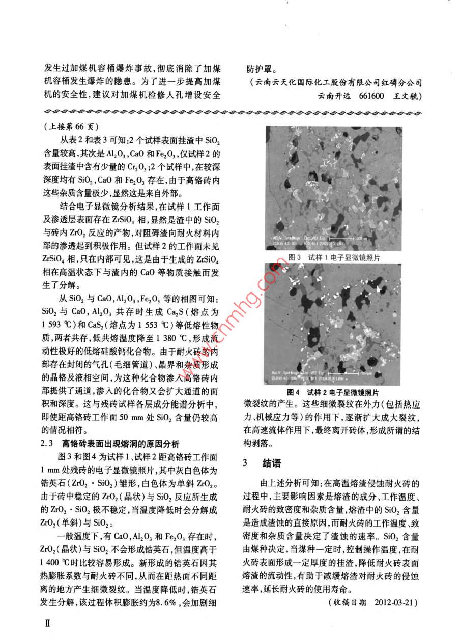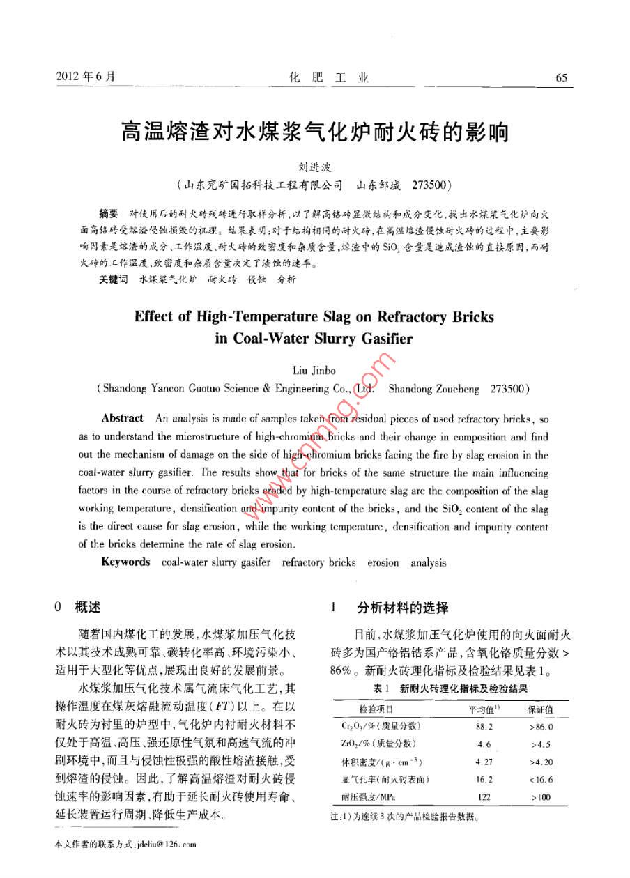2012年6月化肥工業(yè)高溫熔渣對水煤漿氣化爐耐火磚的影響劉進波(山東兗礦國拓科技工程有限公司山東鄒城273500)摘要對使后的耐火磚殘磚迸行取樣分杄,以了解高鉻磚顯微結(jié)構(gòu)和成分變化,找出水煤漿氣化爐向火面高鉻磚受熔渣侵蝕毀的杋理。結(jié)果表明:對于結(jié)枃相冋的耐火畤,在髙漒煷渣侵蝕硏火磚的過程中,主要影響因素是熔渣的成分、工作溫度、耐火磚的致密度和雜質(zhì)含量,熔渣中的SO2含量是造成渣蝕的直接原因,而耐火磚的工作溫度、致密度和雜質(zhì)含量決定了渣飲的速率。關(guān)鍵詞水煤裟氣化爐耐火磚侵蝕分析Effect of High-Temperature Slag on Refractory Bricksin Coal-Water Slurry GasifierLiu jinboShandong Yancon Guotuo Science& Engineering Co, Ltd. Shandong Zoucheng 273500)Abstract An analysis is made of samples taken from residual pieces of used refractory bricks, soas to understand the microstructure of high-chromium bricks and their change in composition and findout the mechanism of damage on the side of high-chromium bricks facing the fire by slag erosion in thecoal-water slurry gasifier. The results show that for bricks of the same structure the main influencingfactors in the course of refractory bricks eroded by high-temperature slag are the composition of the slagworking temperature, densification and impurity content of the bricks, and the SiO, content of the slapis the direct cause for slag erosion, while the working temperature, densification and impurity contentof the bricks determine the rate of slag erosionKeywords coal-water slurry gasifer refractory bricks erosion analysis0概述1分析材料的選擇隨著內(nèi)煤化工的發(fā)展,水煤漿加壓氣化技日前,水煤漿加壓氣化爐使用的向火面耐火術(shù)以其技術(shù)成熟可靠、碳轉(zhuǎn)化率高、環(huán)境污染小磚多為國產(chǎn)鉻鋁鋯系產(chǎn)品,含氧化鉻質(zhì)量分數(shù)>適用于大型化等優(yōu)點,展現(xiàn)出良好的發(fā)展前景。86%。新耐火磚理化指標及檢驗結(jié)果見表1。水煤漿加壓氣化技術(shù)屬氣流床氣化工藝,其表1新耐火磚理化指標及檢驗結(jié)果操作溫度在煤灰熔融流動溫度(FT)以上。在以檢驗項日平均值)保證值耐火磚為襯里的爐型中,氣化爐內(nèi)襯耐火材料不C2O3/%(質(zhì)量分數(shù))僅處于高溫、高壓、強還原性氣氛和高速氣流的沖>4.5刷環(huán)境中,而且與侵蝕性極強的酸性熔渣接觸,受體積密度/(g·cm3)到熔渣的侵蝕。因此,了解高溫熔渣對耐火磚侵量氣孔率(耐火磚表面)16.2蝕速率的影響因素,有助于延長耐火磚使用壽命、耐壓強度/MPa10延長裝置運行周期、降低生產(chǎn)成本。注:1)為連續(xù)3次的產(chǎn)品檢驗報告數(shù)據(jù)本文作者的聯(lián)系力式:dclu(126.com化肥工業(yè)第39卷第3期向火面耐火磚使用周期較為平穩(wěn)向火面拱頂磚平均壽命為12000h,筒體部位磚使用壽命10000h以上,錐底部位磚使用壽命6000h以上為更好地了解耐火磚的渣蝕情況,選取山東兗礦魯南化肥廠德士古氣化爐運行后更換下的殘磚作為樣品進行分析。樣品磚累計運行時間為l1270h,筒體部位減薄較嚴重,平均剩余厚度為60~70mm,蝕損160mm左右,K磚熱偶磚及中部個別位置已能看到后面背襯磚;拱頂耐火磚蝕損較少,平均蝕損110mm左右。分別選取拱頂和筒體部位的耐火磚,作為試圖1試樣1電子顯微鏡照片樣1和試樣2。其中:試樣1是氣化爐拱頂高鉻磚,使用情況較好;試樣2是筒體高鉻磚,侵蝕速率大使用壽命偏短,且表面已出現(xiàn)熔洞。2熔渣侵蝕分析借助電子顯微鏡和能譜儀對2種殘磚試樣進行詳細分析。21殘磚表面掛渣情況圖1顯示:試樣1表面熔渣層較厚,熔渣均勻致密,對高鉻磚表面形成一定的保護。圖2顯示:試樣2所處區(qū)域溫度偏高,表面熔圖2試樣2電子顯微鏡照片渣厚度均不超過0.3mm,且從熔渣在高鉻磚表面2.2殘磚成分分析的附著情況看,該熔渣黏度較低,流動性好,在氣化采用能譜儀對試樣1和試樣2各層的成分進爐操作過程中不可能起到以渣抗渣的保護層效果。行分析結(jié)果見表2和表3。表2試樣1各層成分能譜分析結(jié)果/%(質(zhì)量分數(shù)O2 Fe203 Cr,O,掛渣成分1.200.8116.760.71l1.65工作面0.620.6712.310.292.2860.01l1.48100.408.2210.120.311.719.230.848.979.890.332.170.7164.5811.640.590.9165.8113.1640ml.651.270.750.9965.8214.62表3試樣2各層成分能譜分析結(jié)果/%(質(zhì)量分數(shù)項日N20MoA2o3so2k2oTiO掛渣成分1.3916.160.7014.570.810.210.728.017.962.1059.163.08101.7869.062.346630mm0.810.669.387.4140 mm0.7770.10.9650 mm62.16(下轉(zhuǎn)第Ⅱ頁)發(fā)生過加煤機容桶爆炸事故,徹底消除了加煤防護罩。機容桶發(fā)生爆炸的隱患。為了進一步提高加煤(云南云天化國際化工股份有限公司紅磷分公司機的安全性,建議對加煤機檢修人孔增設(shè)安全云南開遠661600王文毓)分必必小必必必必心必必必必必必必必必必必小小必必辦辦必必必辦必辦辦必辦必辦必必必(上接第66頁)從表2和表3可知2個試樣表面掛渣中SiO2含量較高其次是A2O3,CaO和Fe2O3,僅試樣2的表面掛渣中含有少量的Cr2O3;2個試樣中在較深深度均有SO2,CaO和Fe2O3存在由于高鉻磚內(nèi)熱略這些雜質(zhì)含量極少,顯然這是來自外部。結(jié)合電子顯微鏡分析結(jié)果,在試樣1工作面及滲透層表面存在 Zrsio4相,顯然是渣中的SO2與磚內(nèi)ZO2反應(yīng)的產(chǎn)物,對阻礙渣向耐火材料內(nèi)部的滲透起到積極作用。但試樣2的工作面未見ZsO4相,只在內(nèi)部可見,這是由于生成的ZSiO4圖3試樣1電子顯