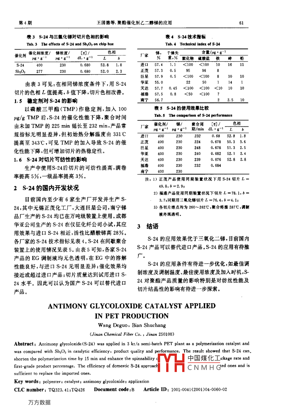 第24卷第4期合成纖維工業(yè)201年8月CHINA SYNTHETIC FIBER INDUSTRYAug.2001聚酯催化劑乙二醇銻的應(yīng)用王國(guó)德邊樹(shù)昌(濟(jì)南化纖總公司,山東濟(jì)南250100:在3kt/半違續(xù)聚酯裝置上使用乙二醇悌(s-24)作案合催化劑合成了1.5kt聚酯,比較乙二醇錦與三氧化二銻的催化效果,產(chǎn)品質(zhì)量及使用的效果,表明S24的聚合時(shí)間比三氧化二銻縮短15minS24可提高切片的可紡性、滿卷率及一等品率。國(guó)產(chǎn)S24的催化效果接近或超過(guò)進(jìn)冂產(chǎn)品可以替代進(jìn)口關(guān)鍵詞:東磨催化劑乙二醇銻應(yīng)用中圖分類(lèi)號(hào):TQ323.41;TQ426文獻(xiàn)識(shí)別碼:B文章編號(hào):1001-0041(200)04006002目前聚酯工業(yè)普遍使用銻化合物做聚合催化使用以防S24析出而導(dǎo)致催化劑濃度變化。產(chǎn)了15k切片,隨后推廣到引進(jìn)的鐘紡公司技Mm劑,主要使用三氧化二銻和醋酸銻。1998年濟(jì)南衰1s24的技術(shù)指標(biāo)化纖總公司研究院開(kāi)始在3kt/a半連續(xù)聚酯裝置上對(duì)進(jìn)口的乙二醇銻(S24)進(jìn)行試用研究,生分析值56~58.8干燥失重,%0.51.I術(shù)60kt/a連續(xù)聚酯裝置,所生產(chǎn)的聚酯切片自氯化物/g:g<100度高,可紡性好,從而引起國(guó)內(nèi)催化劑生產(chǎn)廠家和硫酸鹽/四g·g≤100<100聚酯生產(chǎn)廠家的關(guān)注。半連續(xù)聚酯裝置及連續(xù)聚鐵含量/嶇g·g-1酯裝置的使用情況表明,使用S24催化劑生產(chǎn)的砷含量/{g·g鉛含量/g·g1聚酯切片白度高,可紡性好目前國(guó)內(nèi)許多廠家對(duì)1.3催化效果乙二醇銻進(jìn)行開(kāi)發(fā)并在聚酯裝置上使用。催化劑溶液在酯化結(jié)束后聚合前加入,聚合1S24及其應(yīng)用工藝與使用三氧化二銻相同,催化效果對(duì)比見(jiàn)表2。由表2可見(jiàn),在相同銻濃度條件下,S-24比三1.1特性氧化銻的聚合時(shí)間縮短15min,S-24可加快反應(yīng)s-24為白色或淡白色結(jié)晶固體易吸潮分速度解不溶于水作為聚合催化劑有以下特點(diǎn),(1)在饔2s24與三化鉚的催化效果比較EG中的溶解度大。由于在EG中的溶解度大,其Tab.,2 Tbe comparison of catalytic efficiency between24nnd調(diào)配比三氧化銻更容易,使用較方便;(2)經(jīng)提純b0的乙二醇銻產(chǎn)品不含三氧化銻中的其他雜質(zhì),因催化劑聚合終聚合周催化劑濃度/銻濃度!Ta/℃溫度/℃期/ming·glg·g此雜質(zhì)含量少純度高;(3)活性高。乙二醇銻的催化為均相催化,可使聚合反應(yīng)在較短的時(shí)間內(nèi)達(dá)sb2O3286-28724727230260~262到同樣的聚合效果;(4)聚酯產(chǎn)品色澤和熱穩(wěn)定性注:切片粘數(shù)0680dL/g好,可紡性好。S24技術(shù)指標(biāo)見(jiàn)表1.4對(duì)切片色相的影響1.2乙二醇溶液的調(diào)制中國(guó)煤化工對(duì)比見(jiàn)表3將S24調(diào)制成4%的EG溶液,其調(diào)制液無(wú)CNMHG期:2010-08色透明,無(wú)不溶物。常溫放置有少許晶粒析出。在作者簡(jiǎn)介;王國(guó)德(1966-),男,河北省定州市人,高級(jí)工80℃放置,無(wú)析出物。因此建議在90C左右恒溫程師現(xiàn)從事聚酯生產(chǎn)管理及聚酯新產(chǎn)品的開(kāi)發(fā)第4期王國(guó)德等.聚酯催化劑乙二醇銻的應(yīng)用613S-24與三氧化錦對(duì)切片色相的影響變4S24技術(shù)指標(biāo)Tab. 3 The effects of S-24 and Sb,O on chlp hueTab 4 Technical inder of s-24催化劑像化劑濃度/綠濃度[刃/色相廠家錦,干燥失含量/{·g1d%重,%氯化物硫酸鹽錢(qián)s-242300.68052.81.8進(jìn)口57.41.1<100<10010168052.02.3茂57.30.59596巨星57.90.5<100<10081010由表3可見(jiàn):在相同銻濃度條件下,用S24華亞55.0切片的色相L值提高,b值下降,切片色相改普。天達(dá)57.70.45<100<10福港5750.8<100715穩(wěn)定劑對(duì)S24的影響南寧56.7以磷酸三甲酯(TMP)作穩(wěn)定劑,加入100變5s24的使用效果比較g/gTMP后,S24的催化性能下降,聚合時(shí)間Tab. 5 The comparison of S-i performance由未加TMP的225min延長(zhǎng)至232min,產(chǎn)品常廠家做化劑/銻/,聚合周6,工興·g-1嶇·g-1期/ min dL·g規(guī)指標(biāo)無(wú)明顯差異,但初始熱分解溫度由331C進(jìn)口4002302320.6852.81.8提高至343℃,可見(jiàn)TMP的加入導(dǎo)致S24的催正茂402302240.67850.33.6化性能下降但可增加切片的熱穩(wěn)定性。遷星4000.67851.32.51.6S-24對(duì)切片可紡性的影響天達(dá)4002302390.6765282.8生產(chǎn)中使用S-24后切片的可紡性提高滿卷福400232320.684率提高5%,一級(jí)品率提高3‰。注:1)正茂產(chǎn)品使用同期裝置狀況下用S24切片L=2S24的國(guó)內(nèi)開(kāi)發(fā)狀況2)福港產(chǎn)品使用同期裝量狀況下切片L目前國(guó)內(nèi)至少有6家生產(chǎn)廠開(kāi)發(fā)并生產(chǎn)S3.7同期用三氧化悌切片L=76.4,b24,其中無(wú)錫正茂化工廠,大連巨星公司,南寧銻3)各切片熔點(diǎn)均為260~262℃,聚合終溫287℃,調(diào)制品廠生產(chǎn)的S24均已在萬(wàn)噸級(jí)裝置上使用。成都液外觀透明華亞公司生產(chǎn)的S24在儀征化纖公司小試,其應(yīng)3結(jié)語(yǔ)用效果與進(jìn)口S24相近,活性比醋酸銻高28%。各廠家的S-24技術(shù)指標(biāo)見(jiàn)表4。S24在間歇聚合S-24的應(yīng)用效果優(yōu)于三氧化二銻,目前國(guó)內(nèi)裝置上的使用情況見(jiàn)表5。由表5可知,各家S24S24產(chǎn)品可以替代進(jìn)口產(chǎn)品。S-24的應(yīng)用有待推產(chǎn)品的EG調(diào)制液均無(wú)色透明,在EG中的溶解性能良好,與進(jìn)口S-24無(wú)明顯差