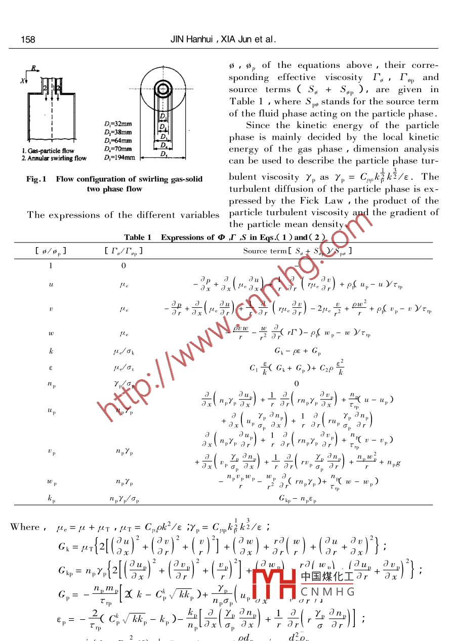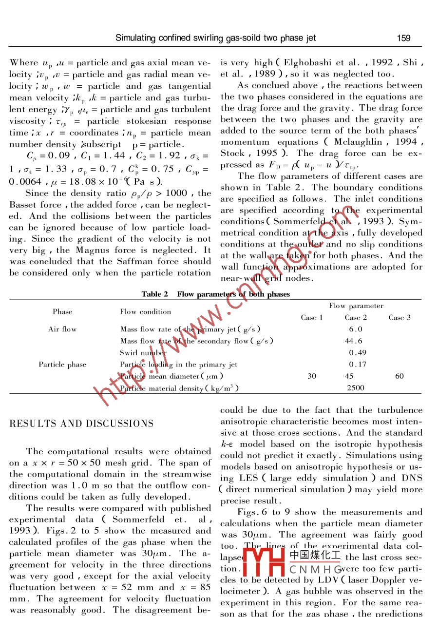 SSN 1009-3095 Joumal of Zhejiang University SCIENCE V 3 No. 2 P 157-161 Apr. -June, 2002http:/www.periodicals.comcn;http:/www.zju.educ/englishhttp:/www.zjupress.com;httpV/lib.Zju.educneindex.htm:jzu_s@mail.hz.zj.cn157Simulating confined swirling gas-solid two phase jetJIN Han-hu(金晗輝), XIA Jur(夏鈞), FAN Jian-ren(樊建人) cen Ke-f岑可法)Department of Energy Engineering Zhejiang Universily, Hangzhou, 310027, ChinaReceived May 21, 2001 i revision accepted July 28, 200Abstract: a h-E-k, multi-fluid model was used to simulate confined swirling gas-solid two phcomprised of particle-laden flow from a center tube and a swirling air stream entering the testfrom the coaxial annular. After considering the drag force bet ween the two phases and gravity a seriesof numerical simulations of the two-phase flow of 30um, 45]m, 60jm diameter particleformed on a xx r=50 x 50 mesh grid respectively. The results showed that the k-E-kp multi-fluid model can be applied to predict moderate swirling multi-phase flow. When the particle diameter is large, theles with the wall will influence the predictithe particles the stronger the collision with the wall and the more obvious the difference bet ween meaured and calculated resultsKey words: A k-E-kp multi-fluid model Two phase flow, Confined s wiring jetDocument code: ACLC number: TK16INTRODUCTIONcal simulation by using the h-E-hp multi-fluidmodel with the particle phase considered asConfined swirling two phase flows are pseudo-fluid phasd Spalding, 1981)widely utilized in engineering applicationssuch as combustion systems cyclone separa- MATHEMATICAL MODELtors etc. They are used to enhance the flamestability and to mix properly the fudizer in combustion systems. In cyclone sepa-The schematic diagram of the flow confirators they are used to separate particles by uration is shown in Fig. 1. The central primaentrifugal force. In all of those engineeringry jet is loaded with particles and the annularSystems, the behavior of both the particles jet provides s wiring air stream. The 2-d gas-and the air is of great importancesolid two phase flo w model can be obtained onthe basis of the standard k-E model ofStudies were carried out to find the flowphase. The conservation equations ofcharacteristics of the particles and the air model in cylindrical coordinates can be writtenthrough experiment and numerical simulationSommerfeld et al., 19932000;Heas follo wing( Huang et al., 1991)Gas pha2000). In their numericales, the flowcharacteristics of the particles were investigat- ax/e)+/ed by using the Lagrangian approach which a(a1showed that interaction bet ween the particleF)+Sn+S(1)phase and the air phase mainly depended onhe local eddy lifetime and the stokesian reParticle phasesponse time of the particles. More than a中國煤化工100 000 particles were needed to describe the dxCNMHGflow characteristics of the particle phase_aCrowe, 1985). This paper presents nume)+12(n2y)+sx(2)Project supported by Zhejiang Provincial Natural Science Foundation China( No. 598017)A數(shù)據(jù)epFax:+86-0571-87951358,E-mail:fanir@mailhz.zj.cn15JIN Hanhui xIA Jun et alφ, s. of tIabetheirspesource terms ( STable 1 where s stands for the source termof the fluid phase acting on the particle phaseDf the particleD=70mDenergy of the gas phase, dimension analysis2. Annular swirling flowD,=194mmcan be used to describe the particle phase turFig 1 Flow configuration of swirling gas-solid bulent viscosity y as Y= CHok k2/E. Thetwo phase flowturbulent diffusion of the particle phase is ex-Fick lThe ex pressions of the different variables particle turbulent viscosity and the gradient ofthe particle mean densitTable 1 Expressions of p, r, s in eqs. (1)and(2)[/,][F/FSource term[S +S)S]3()-)r(G1+Gn)+C2np(…2mx)+1npgGWhereu+UT, AT=Cupk/h2/a wtdu dar dGralwd/a中國煤化工刁GnpPIxh-Ch√h)CNMHGr」1萬數(shù)據(jù)((1+R6)1,Rp=n-/p 18Simulating conf ined swirling gas-soild two phase jet159Where up ,u= particle and gas axial mean ve- is very high( Elghobashi et al., 1992, Shilocity i u,, v= particle and gas radial mean ve- et al., 1989), so it was neglected toolocity wparticle andgentialAs conclued above, the reactions bet weenmean velocity ;hp ,k= particle and gas turbu- the two phases considered in the equations arelent energy iyp wue= particle and gas turbulent the drag force and the gravity. The drag forcevIscosIty ,Irparticle stokesian response between the two phases and the gravity aretime ' x,r= coordinates i n.= particle mean added to the source term of the both phasesnumber density subscript p= particlemomentum equations( Mclaughlin, 1994C.=009,C1=1.44,C2=1.92,ak= Stock1995). The dragorce cane ex-l,σε=1.33,σn=0.7p=0.75, Cm= pressed as F0.0064,=18.08×10(Pas)The flow parameters of different cases areshown in Table 2. The boundary conditionsSince the density ratio Pp/p>1000, theBasset force the added force, can be neglectare specified as follows. ThAnd the collisions bet ween the particlescified according to the experimentalcan be ignored because of low particle load- conditions( Sommerfeld et al., 1993). Sym-ng. Since the gradient of the velocity is notmetrical condition at the axis, fully develebig, the Magnus force is neglectedconditions at the outlet and no slip conditionswas concluded that the Saffman force should at the wall are taken for both phases. And thebe considered only when the particle rotation wall function approximations are adopted fornear-wall grid nodesTable 2 Flow parameters of both phasesPhaseFlow conditionFlow paranMass flow rate of the primary jet(g/s)Mass flow rate of the secondary flow(g/s)44,6Swirl numberParticle phaseParticle loading in the primary jet0,17Particle mean diameter (umParticle material der2500could be due to the fact that the turbulenceRESULTS AND DISCUSSIONSanisotropic characteristic becomes most inten-sive at those cross sections. And the standardThe computational results were obtainedk-E model based on the isotropic hypothesisonax×r=