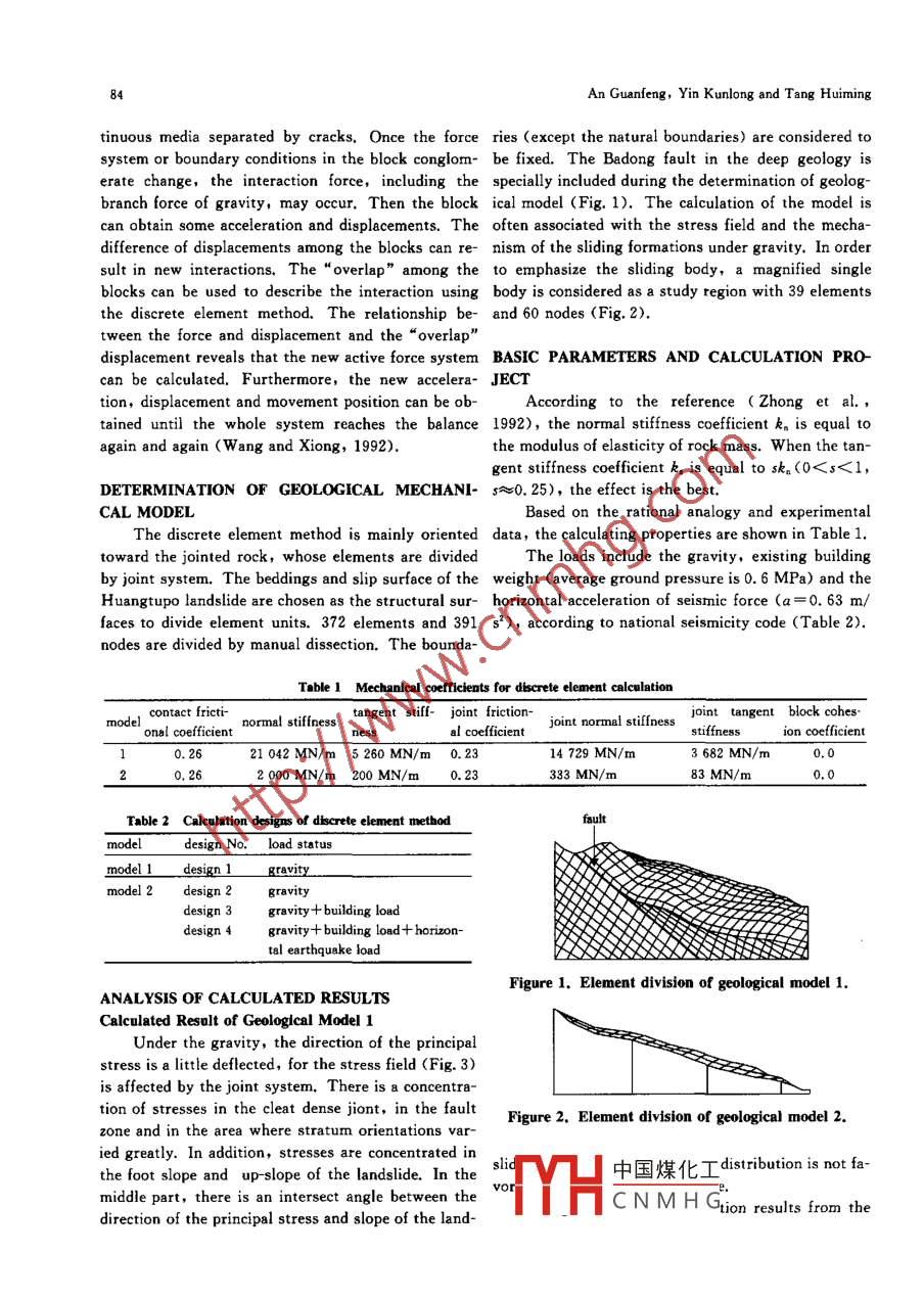 Journal of Chima University of Geosciences, Vol. 13,No. 1, p. 83 - 85, March 2002ISSN 1002 - 0705Printed in ChinaDiscrete Element Analysis of Huangtupo Landslide *An Guanfeng Yin Kunlong Tang Huimingp5AEngineering Faculty , China University of Geosciences , Wuhan 430074ABSTRACT: On the basis of the deep geology and the geological structure of Huangtupo landslide, anancient landslide ia the reservoir of the Three Gorges, the geo-environmental model of the landslide is es-tablished to analyze quntitatively the slidig mechanism by using the discrete element method. It is con-cluded that interbedding structure of soft and hard formation consists of the main geological background,which induced the arching of the formation under gravity. Stability anlysis of different loadings showsthat the ground building weight on the middle slope may restrain the extension of shear sliding zone be-low. but may activate the foot area which will reduce the safety factor of the front.KEY WORDS: Huangtupo landslide, geological model, discrete element method, landslide mechanism,LANDSLIDE INTRODUCTIONThe exposed rock at the head of HuangtupoHuangtupo landslide, located on the southern landslide is Lower Triassic limestone seriesbank of the Yangtz River about 1 km upstream to the Jialingjiang Formation whose dip angle is steep. TheBadong County in Hubei Province, is an ancient field geological investigation and the deep geophysicallarge-scale landslide with an area of 1.38 km2, an av- exploration have proved that a fault lies betweenerage thickness of 30 m, and a volume of 4X 10' m'. Jialingjiang Formation limestone and Badong Forma-Since 1982, large-scale civil engineering construction tion mudstone.has been conducted on the landslide, due to improperThe stratum envolved in the Huangtupo land-geological conclusion. Up to now, the town has come slide are limited to the superlicial layer of the syn-into being. After 1992, new engineering geological cline, which belongs to the ancient landslide bodyinvestigation prompts new town to be shifted to the formed during the downcutting of the Yanglze River.Xirangpo 5 km upstream from the landslide ( Wu,According to the deep geology and the geological1999 ; Zhonget al,,1992).structure of the superficial ancient landslide body,The foot elevation of Huangtupo landslide is 80 the geo environmental model of the Huanglupo land-ma. s. 1. on the river, while the head elevation is slide is established. Discrete element numerical simu-640 ma. s. 1.. The slope varies from 30° to 40° un-lation method is used to study the relationship beder the elevation of 225 m, and the middle section of tween the Huangtupo landslide and its deep geolog-the slope is about 20°. The landslide consists of Mid- ical stratum, and to predict and evaluate the stabilitydle Triassic series Badong Formation, amaranth mud- of the landslide in difeent loeds.stone including siltstone, marlite and a broken blockstructure. The landslide area is located on the south-PRINCIPLE OF DISCRETE ELEMENT METHODern part of Guandu syncline whose axis extends alongThe discrete element method can be used to solvethe river bed. The sedimentary bedding dips towards efietively the interaction among the blocks andthe river, and the bedding is wave shaped, belonging movement procedure under the block conglomeratet0 the prone sliding geological structure.via gravity. From this assumption, we can concludethat the block is nearly rigid, and the theory of New-This peper is supported by the National Natural Science Foundetionton's second law is adopted to conduct the research in-of China (No. 40072084).to the block conglomerate movement and to simulateManuseript recived December 2], 2001.thep1l mass through theManuscript acepted January 25, 2002.micr中國煤化工is taken as discon-TYHCNMHG34An Guanfeng, Yin Kunlong and Tang Huimingtinuous media separated by cracks. Once the force ries (except the natural boundaries) are considered tosystem or boundary conditions in the block conglom- be fixed. The Bedong fault in the deep geology iserate change, the interaction force, including the specially included during the determination of geolog-branch force of gravity, may occur. Then the block ical model (Fig. 1). The calculation of the model iscan obtain some acceleration and displacements. The often associated with the stress field and the mecha-difference of displacements among the blocks can re- nism of the sliding formations under gravity. In ordersult in new interactions. The “overlap”among the to emphasize the sliding body, a magnified singleblocks can be used to describe the interaction using body is considered as a study region with 39 elementsthe discrete element method. The relationship be- and 60 nodes (Fig. 2).tween the force and displacement and the“overlap"displacement reveals that the new active force system BASIC PARAMETERS AND CALCULATION PRO-can be calculated. Furthermore, the new accelera- JECTtion, displacement and movement position can be ob-According to the reference ( Zhong et al. ,tained until the whole system reaches the balance 1992), the normal stiffness coefficient kn is equal toagain and again (Wang and Xiong, 1992).the modulus of elasticity of rock mass. When the tan-gent stiffness coefficient k, is equal to sk.(0