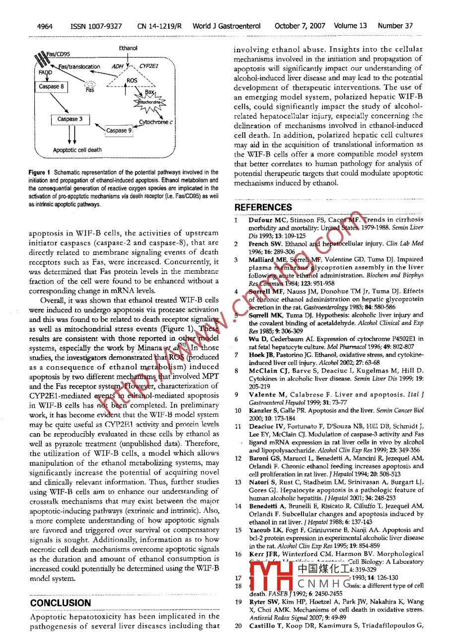 oNatalia A Osna, MD, PhD, Series EditorEffect of ethanol on pro-apoptotic mechanisms in polarizedhepatic cellsBenita L McVicker, Dean Tuma, Carol A CaseyBenita L McVicker, Dean J Tuma, Carol A Casey, Liver Key words: Hepatoma hybrid cells; Ethanol; Apoptosis;Study Unit, Department of Veterans Affairs Medical Center; and Fas receptor; CaspaseDepartments of Intermal Medicine and Biochemistry moleculariology, University of Nebraska Medical Center, Omaha, NE MCVicker BL, Tuma D), Casey CA. Effect of ethanol on pro-Supported by the National Institute on Alcohol Abuse and apoptotic mechanisms in polarized hepatic cells. World JAlcoholism and the Departinent of Veterans AffairsGastroenterol2007;13(37):4960-4966Correspondence to: Benita L McVicker, PhD, veterans AffairsMedical Center, Research Service (151), 4101 Woolworth Avenue,http:!www.wignet.com100927131908Omaha, NE 68105, United States. bmevicker @ unmc.eduTelephone:+1-402-3468800-3547Fax:+1-402-4490604Received: June 30. 2007Revised: July 18, 2007INTRODUCTIONIt has been well established that chronic ethanol consump-Abstraction can lead to a variety of pathological consequences(ethanol-relateed liver injuries such as hepatomegaly,Chronic ethanol consumption is associated with serious fatty liver, alcoholic hepatitis and cirrhosis), yet theand potentially fatal alcohol-related liver injuries such as mechanism(s)by which ethanol causes hepatotoxicityhepatomegaly,alcoholic hepatitis and cirrhosis. Moreover, requires further clarification From several years oft has been docume nted that the clinical progression investigation, certain factors have been identified as havingwith an increase in hepatocellular death that involves a role in ethanol-induced toxicity, such as changes inapoptotic mechanisms. Although much informationredox status(NAD/NADH ratio), the accumulation ofhas been learned about the clinical manifestations acetaldehyde(a product of ethanol oxidation), depletionassociated with alcohol-related diseases, the search of antioxidants such as glutathione, and the generation ofcontinues for a better understanding of the molecular reactive oxygen species(roS). As a consequence, it hasind or cellular mechanisms by which ethanol exerts itsen demonstrated that amongst the various deleteriousdeleterious effects such as the induction of pro-apoptoticeffects that can result from ethanol administration, it hasmechanisms and related cell damaging events. As part been shown that alcohol-induced diseases are accompaniedof the effort to enhance our understanding of those by morphological liver changes that include the increasedparticular cellular pathways and mechanisms associated production of apoptotic cells". More specifically, itvith ethanol toxicity, researchers over the years have has been demonstrated that ethanol administration isutilized a variety of model systems. Recently, work linked to hepatocyte apoptosis" 4 and that the numberhas come forth demonstrating the utility of a hybrid of apoptotic cells detected in the liver correlates withstudy of alcohol-associated alterations in hepatocellularchanisms Success with such emerging modelApoptosis is a regulated mode of cell death, which issystems could aid in the development of potential chatacterized by specific biochemical and morphologicaltherapeutic treatments for the prevention of alcoholchanges in the cell. Morphologically, during inductioninduced apoptotic cell death that may ultimately serve of apoptosis, the affected cells shrink, lose cytoskeletalas a significant target in delaying the onset and/orprogression of clinical symptoms of alcohol-mediated contacts and undergo chromatin condensation. duringliver disease. This review article summarizes the currentunderstanding of ethanol-mediated modifications in cellsurvival and thus the promotion of pro-apoptotic eventswith emphasis on analyses made in various experimentalCTH中國(guó)煤化工 d and eliminatedCNMH Gg cells!. The searchodel systems, particularly the more recentlyical anu signal transduction pathwayscharacterized WIF-B cell systeminvolved in producing the characteristic apoptoticmorphological cellular changes has been unde@2007 The WG Press. All rights reservedseveral years. The current dogma is that apoptosis isw而點(diǎn)教播McVicker BL et al Ethanol-mediated apoptosis in hepatic cellsthought to occur by two main pathways involving either an cthanol, apoptosis is the preferential mode of injuryextrinsic route(which utilizes death receptors), and/or an as death was found to be triggered by the Fas receptorintrinsic pathway that involves mitochondrial intracellular system". 'Thus, ethanol administration is related to cellularstress signals". Once triggered, the apoptotic machinery injury mechanisms, yet a complete understanding of theis set into motion through the activation of a family of presumably intertwined factors that can be involved inintracellular cysteine proteases known as caspases, which hepatotoxicity is still sought. The following is a briefamplify appropriate signals by acting as initiators as well as revicw of current knowledge concerning the factorsexecutioners in the death program. For instance, there are identified in alcohol-mediated apoptotic liver damagedownstream executioner enzymes(caspases 3, 6, and 7)that are activated by upstream initiator caspases(caspases 8, Oxidative stress and alcohol-induced liver apoptosis2,9, and 10) that are in turn regulated by specific protein- Following the recognition that ethanol and its metabolitesprotein interactions. As an example, caspases may be induce the formation of reactive oxygen species(ROS)invated in an extrinsic manner by membrane signaling liver cells; studies were able to link the ethanol-mediatedevents(death domain transmembrane receptors)and/ or induction of oxidative stress to the observed enhancementby intracellular intrinsic changes resulting in the release of of apoptosis. Specifically, it has been demonstratedspecific proteins from the m