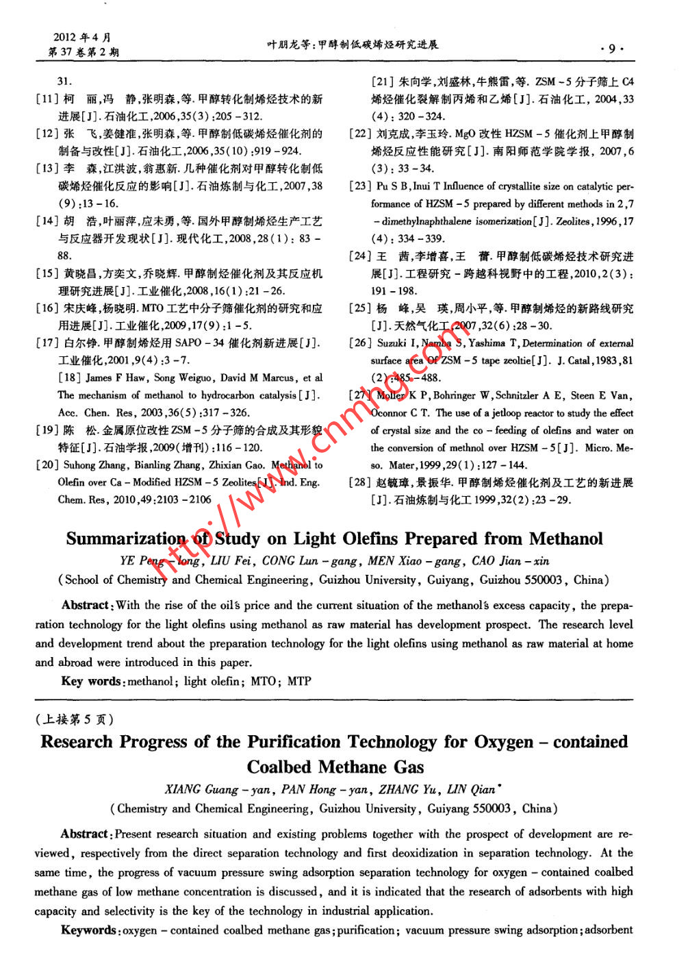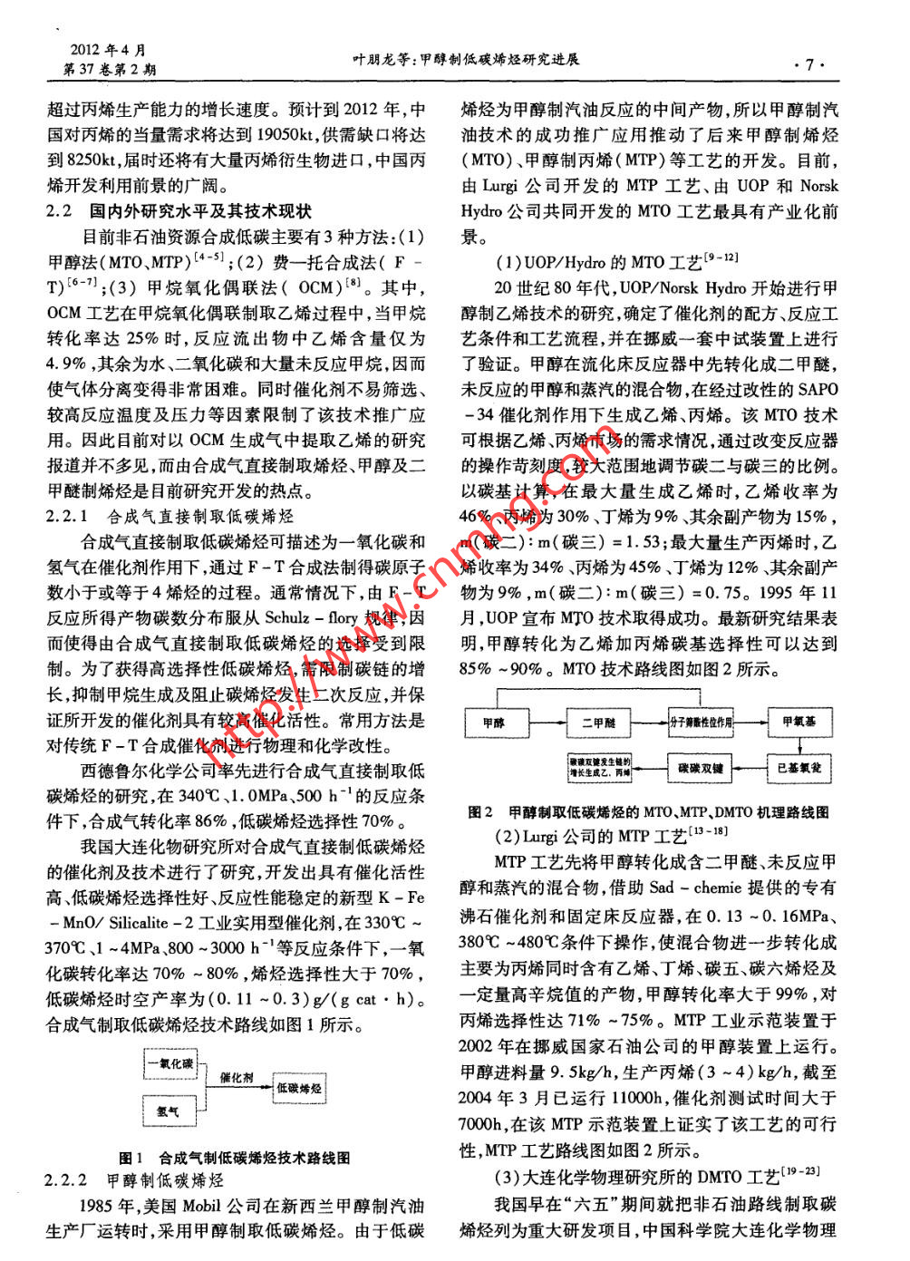 貴州化工2012年4月, 6.GuizhouChermicalIndustry第37卷第2期甲醇制低碳烯烴研究進(jìn)展葉朋龍,劉飛, 叢輪剛,門曉剛,曹建新”(貴州大學(xué)化學(xué)與化工學(xué)院,貴州貴陽50003)摘要:隨著石油價(jià)格的 上漲,及甲醇產(chǎn)能過剩的現(xiàn)狀,以甲醇為原料合成低碳烯烴技術(shù)顯示了良好的發(fā)展前景。文章介紹了甲醇制烯烴技術(shù)的國內(nèi)外研究水平和發(fā)展趨勢(shì)。關(guān)鍵詞:甲醇;低碳烯烴; MTO; MTP中圖分類號(hào):TQ223.121文獻(xiàn)標(biāo)識(shí)碼:A文章編號(hào):1008 -9411(2012)02 -0006 -04甲醇是重要的有機(jī)原料,是C1化學(xué)工業(yè)的基礎(chǔ)維、合成橡膠、合成塑料(聚乙烯及聚氯乙烯)、合成產(chǎn)品,然而其自身價(jià)位較低,附加值不高。甲醇的深乙醇(酒精)的基本化工原料,也用于制造氯乙烯、加工與工業(yè)應(yīng)用是許多國家競(jìng)相開發(fā)的-一個(gè)重要領(lǐng)苯乙烯、環(huán)氧乙烷、醋酸、乙醛、乙醇和炸藥等,尚可域,且甲醇工業(yè)的發(fā)展在很大程度上取決于甲醇工用作水果和蔬菜的催熟劑,是一種已證實(shí)的植物激業(yè)應(yīng)用領(lǐng)域的開拓與深加工產(chǎn)品的開發(fā)。目前,我素。乙烯用量最大的是生產(chǎn)聚乙烯,約占乙烯耗量國甲醇供大于求的矛盾十分突出,如何提高甲醇的的45% ;其次是由乙烯生產(chǎn)的二氯乙烷和氯乙烯;附加值,成為亟待解決的問題。乙烯氧化制環(huán)氧乙烷和乙二醇。另外乙烯烴化可制苯乙烯,乙烯氧化制乙醛、乙烯合成酒精、乙烯制取1甲醇生產(chǎn)及利用現(xiàn)狀高級(jí)醇等。近幾年,我國掀起了甲醇項(xiàng)目投資熱,從2000中國乙烯存在巨大的市場(chǎng)缺口和消費(fèi)增長(zhǎng)空年到2008年,全國甲醇產(chǎn)能年均增長(zhǎng)率達(dá)24.8%,間,國產(chǎn)乙烯的市場(chǎng)占有率一直較低。為緩解國內(nèi)而同期表觀消費(fèi)量年均增長(zhǎng)率為18. 9%。據(jù)最新乙烯供應(yīng)緊張,滿足國內(nèi)經(jīng)濟(jì)發(fā)展需求,雖然中國石統(tǒng)計(jì),目前我國新建、擬建甲醇項(xiàng)目共34個(gè)(不包括油、中國石化和中海油加快實(shí)施乙烯擴(kuò)能計(jì)劃,但截二甲醚、甲醇制烯烴企業(yè)自身配套的甲醇生產(chǎn)裝至目前中國乙烯當(dāng)量消費(fèi)供需缺口多達(dá)11190kt。置) ,預(yù)計(jì)到“十一五”末期,我國甲醇產(chǎn)能將達(dá)到26從整體情況看,中國乙烯工業(yè)還有較大的發(fā)展空間。~30.6Mt/a,而同期國內(nèi)需求量的增長(zhǎng)則存在不確丙烯用量最大的是生產(chǎn)聚丙烯,另外丙烯可制定性。丙烯腈、異丙醇、苯酚和丙酮、丁醇和辛醇、丙烯酸及甲醇的主要下游需求領(lǐng)域是甲醛、羰基法醋酸、其脂類以及制環(huán)氧丙烷和丙二醇、環(huán)氧氯丙烷和合甲醇燃料、二甲醚等,其中甲醛、羰基法醋酸產(chǎn)業(yè)呈成甘油等?,F(xiàn)穩(wěn)定增長(zhǎng)態(tài)勢(shì)”,但這并不足以消化增長(zhǎng)過快的近年來,由于丙烯下游產(chǎn)品快速發(fā)展,極大促進(jìn)甲醇產(chǎn)能;甲醇燃料、二甲醚則受政策影響較大,而了中國丙烯需求量快速增長(zhǎng)(2-3]。2010 年,中國新且目前我國的甲醇燃料標(biāo)準(zhǔn)還不完善。增大型乙烯生產(chǎn)裝置,同時(shí)煉廠生產(chǎn)能力還將繼續(xù)隨著甲醇應(yīng)用領(lǐng)域的開發(fā),特別是甲醇制烯烴擴(kuò)大,這將增加丙烯的產(chǎn)出。乙烯聯(lián)產(chǎn)丙烯的生產(chǎn)技術(shù)的開發(fā)及應(yīng)用,將為甲醇工業(yè)提供巨大潛力,也能力已達(dá)到7220kt/a,丙烯總生產(chǎn)能力達(dá)到將為我國中小合成氨企業(yè)走出困境,為甲醇下游產(chǎn)10800kt/a。乙烯裝置聯(lián)產(chǎn)丙烯占丙烯總供給比例品多樣化帶來光明前景。將進(jìn)-步提高。但同期下游裝置對(duì)丙烯需求量年均增長(zhǎng)速度達(dá)5. 8% ,丙烯資源供應(yīng)略微緊張。2低碳烯烴 研究現(xiàn)狀截至目前,我國丙烯的表觀消費(fèi)量達(dá)到.2.1低碳烯烴 市場(chǎng)需求分析10490kt。從當(dāng)量需求來看,丙烯供需矛盾十分突低碳烯烴主要包括乙烯和丙烯。乙烯是合成纖出。2010年,丙烯當(dāng)量需求的年均增長(zhǎng)率達(dá)7.6% ,金項(xiàng)目:貴州省科學(xué)技術(shù)基金項(xiàng)目(編號(hào):黔科合J字[2011]2017) ;貴州大學(xué)博士啟動(dòng)基金項(xiàng)目(編號(hào):2010 -014) ;貴州省綠色化工創(chuàng)新人才團(tuán)隊(duì)項(xiàng)目;貴州赤天化集團(tuán)有限責(zé)任公司產(chǎn)學(xué)研合作項(xiàng)目資助.收稿日期:2011 -12 -24;修返日期:2012-02-17作者簡(jiǎn)介:葉朋龍(1986 -) ,男,在讀碩士研究生,主要從事工業(yè)催化研究。通訊作者:曹建新,E - mail: jxcao@ gzu. edu. en.2012年4月第37卷第2期葉朋龍等:甲醇制低碳烯烴研究進(jìn)展.7.超過丙烯生產(chǎn)能力的增長(zhǎng)速度。預(yù)計(jì)到2012年,中烯烴為甲醇制汽油反應(yīng)的中間產(chǎn)物,所以甲醇制汽國對(duì)丙烯的當(dāng)量需求將達(dá)到19050kt,供需缺口將達(dá)油技術(shù)的成功推廣應(yīng)用推動(dòng)了后來甲醇制烯烴到8250kt,屆時(shí)還將有大量丙烯衍生物進(jìn)口,中國丙(MTO)、甲醇制丙烯(MTP)等工藝的開發(fā)。目前,烯開發(fā)利用前景的廣闊。由Lurgi公司開發(fā)的MTP工藝、由UOP和Norsk2.2國內(nèi)外研究水平及其技術(shù)現(xiàn)狀Hyd