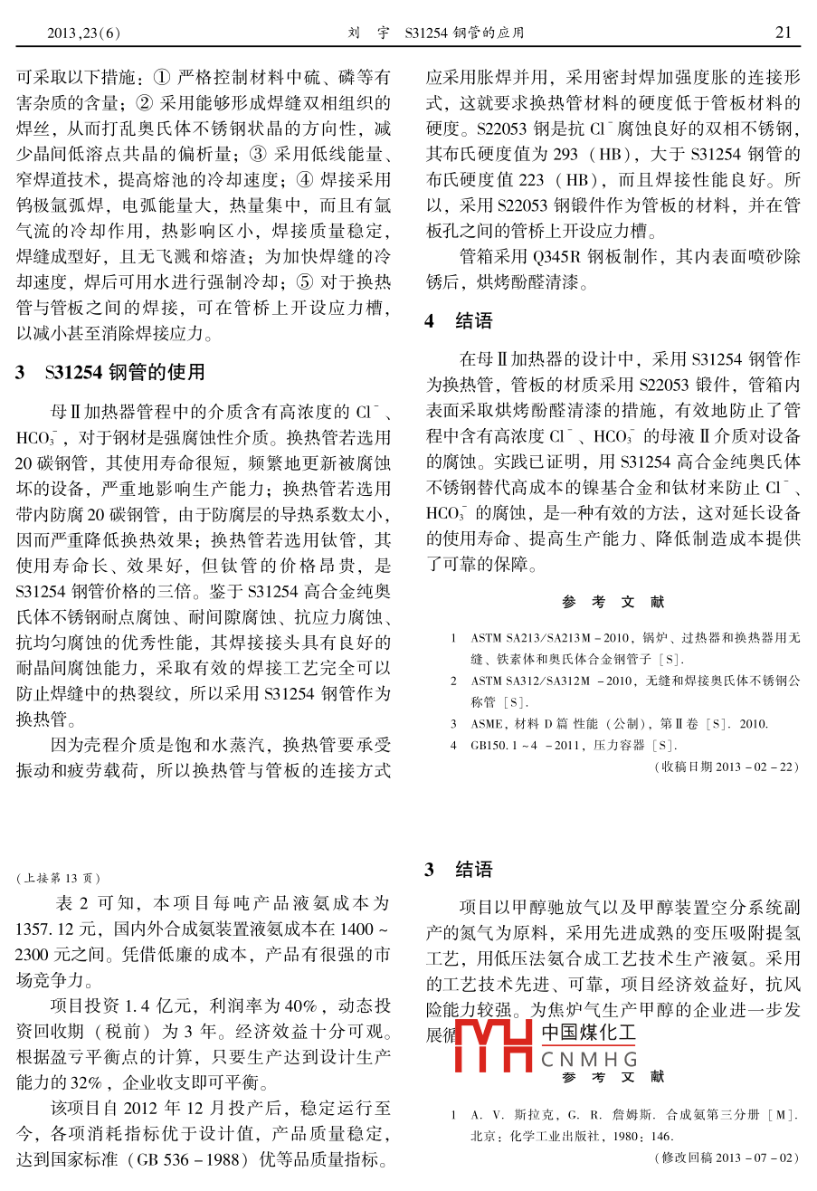 CHEMICAL ENGINEERING DESIGN化工設(shè)計(jì)2013,23(6)甲醇弛放氣制合成氨彭奕*黃維柱李林四川天一科技股份有限公司成都610225艾軍河北旭陽焦化有限公司定州100107摘要介紹以焦?fàn)t氣生產(chǎn)甲醇過程中產(chǎn)生的弛放氣與甲醇裝置空分系統(tǒng)副產(chǎn)的氮?dú)鉃樵?生產(chǎn)合成氨的新工藝及其技術(shù)性能、能耗和經(jīng)濟(jì)指標(biāo)。關(guān)鍵詞馳放氣合成氨新工藝目前合成氨生產(chǎn)的主要原料有天然氣、石腦常采用甲烷化工藝來脫除微量碳,由于甲烷化反油、重質(zhì)油和煤等,其工藝技術(shù)成熟、可靠,而應(yīng)本身要消耗一些氫氣,同時(shí)生成的甲烷又作為利用焦?fàn)t氣制甲醇的馳放氣生產(chǎn)合成氨成則為合惰性氣體混入新鮮合成氣中,惰性氣體含量越高,成氨生產(chǎn)的全新原料路線吹除氣量越大,原料氣損失越多,氨凈值降低?,F(xiàn)以某焦化公司甲醇馳放氣為原料生產(chǎn)100kt/由于新鮮氣凈化程度高,采用低壓氨合成,a液氨項(xiàng)目為例。該項(xiàng)目利用焦?fàn)t氣生產(chǎn)甲醇過程合成壓力控制在≤15MPa(G)。過去國(guó)內(nèi)自主設(shè)計(jì)中產(chǎn)生的地放氣以及甲醇裝置空分系統(tǒng)的氮?dú)鉃榈暮铣砂毖b置設(shè)計(jì)壓力多為32MP。氨合成壓力的原料生產(chǎn)液氨。利用焦?fàn)t氣制甲醇裝置的弛放氣制合成氨的高低,是影響氨合成生產(chǎn)中能量消耗的主要因素之一,主要能量消耗還包括原料氣壓縮功、循環(huán)項(xiàng)目屬于典型的廢氣利用項(xiàng)目,這種生產(chǎn)液氨的氣壓縮功和氨分離的冷凍功。與32MPa合成工藝新工藝方案,其生產(chǎn)技術(shù)、能耗及經(jīng)濟(jì)指標(biāo)均處相比,15MPa合成工藝雖然循環(huán)機(jī)功率和冰機(jī)功率于較先進(jìn)水平,具有良好的經(jīng)濟(jì)效益更大,但新鮮氣壓縮功率大幅降低,同時(shí)降低了1工藝方案和裝置能耗指標(biāo)系統(tǒng)的漏損,節(jié)能效果顯著。由于操作壓力和溫來自于甲醇裝置的馳放氣經(jīng)過變壓吸附提取度較低,對(duì)設(shè)備、管道的材質(zhì)要求有所降低,容氫并除去對(duì)合成催化劑有害的一氧化碳、二氧化易制造和管理。在一定空速下,合成壓力越高碳和氧。來自空分的氮?dú)鈮嚎s之后進(jìn)行脫氧,再出口氨濃度越高,氨凈值越高。隨著低溫高活性與氫氣混合后進(jìn)行干燥,除去水分。干燥后的混催化劑的研制和改進(jìn),壓力降低帶來的氨凈值低合氣進(jìn)入聯(lián)合壓縮機(jī),加壓后進(jìn)氨合成系統(tǒng)。變的不足得到克服。有研究成果表明:15MPa比壓吸附的解吸氣和氨合成系統(tǒng)放空氣都去燃?xì)?2MPa節(jié)省設(shè)備投資12%,其中合成氣壓縮機(jī)及管網(wǎng)。級(jí)間設(shè)備等費(fèi)用節(jié)省37%原料氣的凈化流程見圖1凈化后的新鮮氣在合成塔前補(bǔ)進(jìn),降低循環(huán)氮?dú)庑迈r氣進(jìn)合成氨系統(tǒng)功耗和冷凍功耗,并減少吹除氣量。采用高凈值的氨合成塔。反應(yīng)氣出塔溫度300℃以上,出塔氣甲醇馳放氣解吸氣進(jìn)燃料管壓吸附提氫體反應(yīng)熱多級(jí)利用,并產(chǎn)生中壓飽和蒸汽,出塔圖1原料氣的凈化流程方框圖熱氣在熱交換器與進(jìn)合成塔冷氣換熱后,再采用項(xiàng)目原料氣凈化部分采用變壓吸附提氫技術(shù)水冷降溫,達(dá)到節(jié)水目的。之后反應(yīng)氣采用兩級(jí)以及等壓干燥的專有技術(shù),深度凈化后的新鮮氣氨冷,收集液氨。放空點(diǎn)設(shè)置在循環(huán)機(jī)進(jìn)口點(diǎn)當(dāng)量氧原子小于等于10mm,合成系統(tǒng)的惰性氣體此γ目統(tǒng)中氨都已基本分離,含量極低,這樣合成系統(tǒng)氨凈值高,吹除氣量很氨CNMHG。以煤、氣、油為原料制合成氣的凈化工藝通奕:高級(jí)工程師。1993年畢業(yè)于四川輕化工學(xué)院。從事工藝設(shè)計(jì)和項(xiàng)目管理工作。聯(lián)系電話:(028)85963543,E-mai:tkee@tianke.com。2013,23(6)奕等甲醇弛放氣制合成氨表1合成氨裝置能耗氨合成塔熱交換器廢熱鍋爐名稱噸氨消能耗指標(biāo)能耗耗量(GJ)9.656油分離言器甲醇馳放氣,Nm循環(huán)壓縮機(jī)冷交換器氮?dú)?Nm3700補(bǔ)充氣壓縮氨泠凝器IⅡ新鮮水2.510.015冰機(jī)」氣氨液氨分離器脫鹽水,t液氨馳放氣氨回收液氨減壓槽蒸汽1.0MPa,t37630.30氨冷凝液氨貯槽裝車蒸汽2.45MPa,t液氨球罐解吸氣,12317.2968.981料甲變壓吸附提氫,原料氣精制能耗合計(jì)28.03注:液氨裝置單位產(chǎn)品綜合能耗是按國(guó)家標(biāo)準(zhǔn)GB/^T2589解吸氣去燃料管網(wǎng)原料氮?dú)?008計(jì)算,28.03GJ/t折標(biāo)煤為957.6(標(biāo)準(zhǔn)煤的低位發(fā)熱值為圖2全系統(tǒng)流程方框圖29271kJ/kg)項(xiàng)目建了一套完善的氨回收系統(tǒng)。合成系統(tǒng)氨行業(yè)加權(quán)平均綜合能耗應(yīng)降至1515千克標(biāo)煤需要排放的氣體有3種:①?gòu)难h(huán)氣排放的吹除噸。本項(xiàng)目的能耗為971千克標(biāo)煤/噸,處于領(lǐng)先氣,100Nm/h,氨含量約2.9%,氫含量約72%,水平。直接排放至燃料管網(wǎng)做燃料;②液氨減壓槽的馳放氣,350Nm3/h,其中氨含量約40%,考慮采用2技術(shù)經(jīng)濟(jì)液氨蒸發(fā)冷卻的方式,回收其中85%的氨,采用甲醇馳放氣生產(chǎn)100kt/a合成氨裝置主要技術(shù)系統(tǒng)二級(jí)氨冷的蒸發(fā)壓力,讓蒸發(fā)后的氣氨能回經(jīng)濟(jì)指標(biāo)見表2
