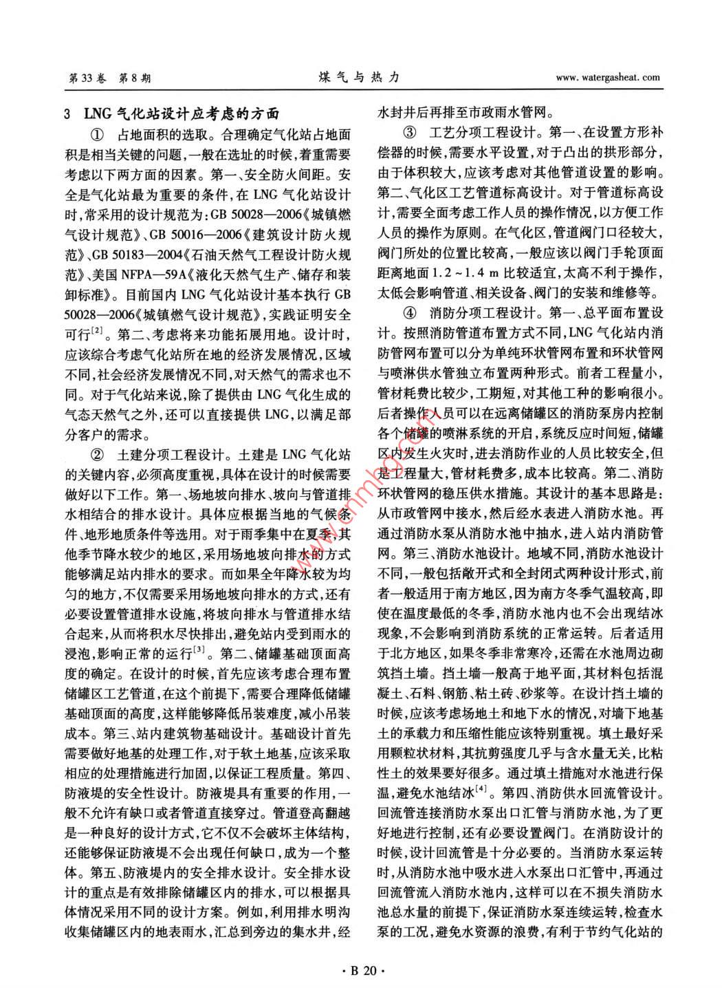 第33卷第8期煤氣與熱力Vol. 33 No.82013年8月GAS & HEATAug.2013LNG氣化站的選址與設(shè)計(jì)于春美(新地能源工程技術(shù)有限公司,河北廊坊065001)摘要:探討了LNG氣化站選址與設(shè)計(jì)的相關(guān)問題,包括選址的考慮因素、占地面積、土建設(shè)計(jì)、工藝設(shè)計(jì)、消防設(shè)計(jì)、電氣與儀表自控設(shè)計(jì)等方面。關(guān)鍵詞: LNG 氣化站;選址; 設(shè)計(jì)中圖分類號(hào): TU996文獻(xiàn)標(biāo)識(shí)碼: B文章編號(hào): 1000 -4416(2013)08 -0B19 -03民的危害,也避免對(duì)城市基礎(chǔ)設(shè)施造成危害。另一方面,LNG氣化站與城區(qū)用氣負(fù)荷區(qū)域的距離不應(yīng)該過遠(yuǎn),這樣能夠減少從氣化站至城區(qū)的燃?xì)夤芫W(wǎng)長度,減小工程量,降低工程造價(jià),會(huì)取得更好的經(jīng)濟(jì)效益”。②盡量靠近城市 外環(huán)路,保證運(yùn)輸安全。在選址的時(shí)候,要注意盡量靠近城市外環(huán)路。這樣能夠有效避免運(yùn)輸事故的發(fā)生,保證運(yùn)輸安全。LNG槽車長度為17 m,寬度達(dá)3 m,要求有8 m的轉(zhuǎn)彎半徑才能順利地轉(zhuǎn)彎,并且要求有足夠?qū)挼穆访娌拍鼙WC車輛順利通行。因此,站外良好的交通條件十作者簡介:于春美(1975- ),女 ,遼寧大連人,工程師,分重要,有利于運(yùn)輸?shù)捻樌M(jìn)行,也有利于保障運(yùn)輸大學(xué),從事燃?xì)庠O(shè)計(jì)工作。安全。1概述③周圍交通便利,方便供水供電。站址的選近些年來,隨著經(jīng)濟(jì)的發(fā)展和人民生活水平的擇必須考慮交通因素,只有交通便利,才能方便提高,對(duì)能源的需求量越來越大。天然氣是重要的LNG的運(yùn)輸。此外,還要考慮供水、供電方便,這樣能源,對(duì)經(jīng)濟(jì)的發(fā)展和人民生活水平的提高具有重有利于氣化站順利施工,良好運(yùn)行,避免由于交通、要的作用。選址和設(shè)計(jì)是LNG氣化站的一項(xiàng)基本水、電等因素導(dǎo)致供氣中斷。工作,也是進(jìn)行LNG氣化站建設(shè)的前提,只有做好④與周圍景觀相協(xié)調(diào),取得最佳建設(shè)效果。選址和設(shè)計(jì)工作,才能使LNG氣化站更好地運(yùn)行。為了達(dá)到最佳的效果,在選址的時(shí)候,還應(yīng)該注意氣LNG氣化站的選址與設(shè)計(jì)是-項(xiàng)系統(tǒng)和復(fù)雜的工化站與周圍的景觀相協(xié)調(diào),以取得最佳的設(shè)計(jì)效果。作,為了達(dá)到最佳的供氣效果,必須全面考慮多方面⑤場地比較平整, 節(jié)約工程建設(shè)投資。選擇因素,合理選擇,科學(xué)設(shè)計(jì)。平整的場地,不僅有利于工程建設(shè)的順利展開,為站2 LNG氣化站選址應(yīng)考慮的方面內(nèi)道路、場地建設(shè)提供足夠的地基承載力,還有利于①充分利用現(xiàn)有燃?xì)夤芫W(wǎng),靠近現(xiàn)有用氣負(fù).機(jī)械化作業(yè)和施工,提高施工效果。此外,在進(jìn)行場荷。一方面,對(duì)于LNG氣化站來說,它需要與城市地平整的時(shí)候,還應(yīng)該減少土地平整、土地回填、地居民密集區(qū)有-定的安全距離,這樣當(dāng)火災(zāi)或者爆基處理等所產(chǎn)生的費(fèi)用,以提高氣化站工程建設(shè)的炸發(fā)生的時(shí)候,其危險(xiǎn)不會(huì)擴(kuò)展到居民區(qū),減少對(duì)居綜合效益。.B19.第33卷第8期煤氣與熱力www. watergasheat. com3 LNG氣化站設(shè)計(jì)應(yīng)考慮的方面水封井后再排至市政雨水管網(wǎng)。①占地面積的選取。 合理確定氣化站占地面③工藝分項(xiàng)工程設(shè)計(jì)。第一、在設(shè)置方形補(bǔ)積是相當(dāng)關(guān)鍵的問題,一般在 選址的時(shí)候,著重需要償器的時(shí)候,需要水平設(shè)置,對(duì)于凸出的拱形部分,考慮以下兩方面的因素。第-、安全防火間距。安由于體積較大,應(yīng)該考慮對(duì)其他管道設(shè)置的影響。全是氣化站最為重要的條件,在LNG氣化站設(shè)計(jì)第二氣化區(qū)工藝管道標(biāo)高設(shè)計(jì)。對(duì)于管道標(biāo)高設(shè)時(shí),常采用的設(shè)計(jì)規(guī)范為:GB 50028- -2006《 城鎮(zhèn)燃計(jì),需要全面考慮工作人員的操作情況,以方便工作氣設(shè)計(jì)規(guī)范》、CB 50016- 2006《建筑設(shè)計(jì)防火規(guī)人員 的操作為原則。在氣化區(qū),管道閥門口徑較大,范》、GB 50183- -2004《石 油天然氣工程設(shè)計(jì)防火規(guī)閥門所處的位置比較高,一般應(yīng)該以閥門手輪頂面范》、美國NFPA- -59A《液化天然氣生產(chǎn)、儲(chǔ)存和裝距離地面1.2~1.4 m比較適宜,太高不利于操作,卸標(biāo)準(zhǔn)》。目前國內(nèi)LNG氣化站設(shè)計(jì)基本執(zhí)行GB太低會(huì)影響管道、相關(guān)設(shè)備、閥門的安裝和維修等。50028-2006<城鎮(zhèn)燃?xì)庠O(shè)計(jì)規(guī)范》,實(shí)踐證明安全④消防分項(xiàng)工程設(shè)計(jì)。 第一、總平面布置設(shè)可行2]。第二、考慮將來功能拓展用地。設(shè)計(jì)時(shí),計(jì)。按照消防管道布置方式不同, LNG氣化站內(nèi)消應(yīng)該綜合考慮氣化站所在地的經(jīng)濟(jì)發(fā)展情況,區(qū)域防 管網(wǎng)布置可以分為單純環(huán)狀管網(wǎng)布置和環(huán)狀管網(wǎng)不同,社會(huì)經(jīng)濟(jì)發(fā)展情況不同,對(duì)天然氣的需求也不與噴淋供水管 獨(dú)立布置兩種形式。前者工程量小,同。對(duì)于氣化站來說,除了提供