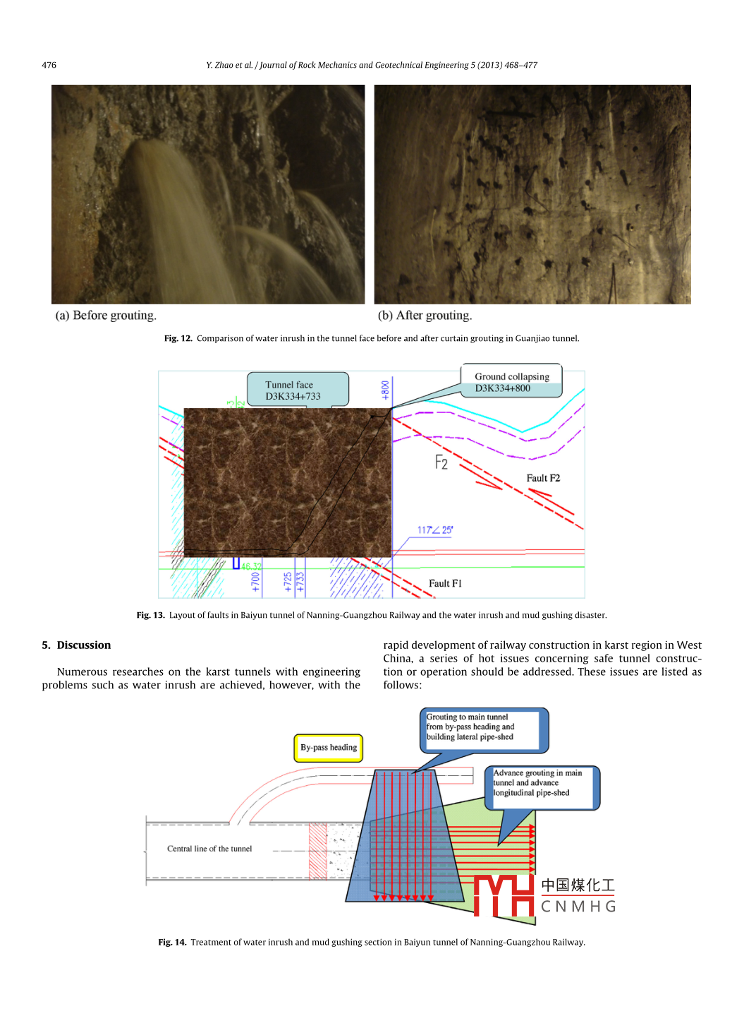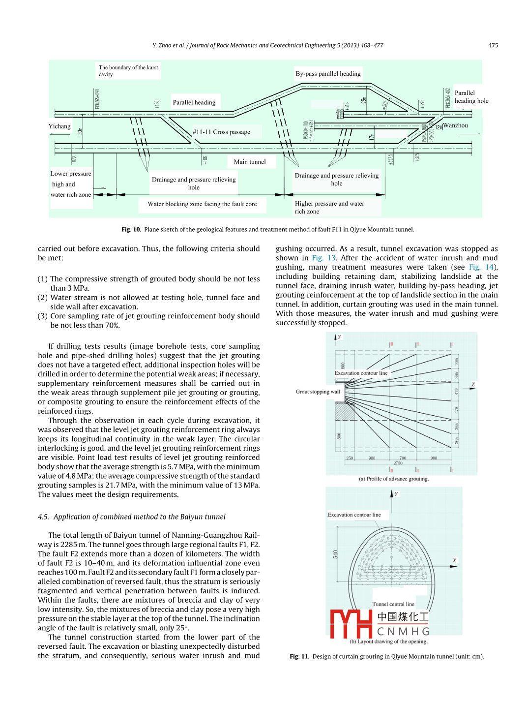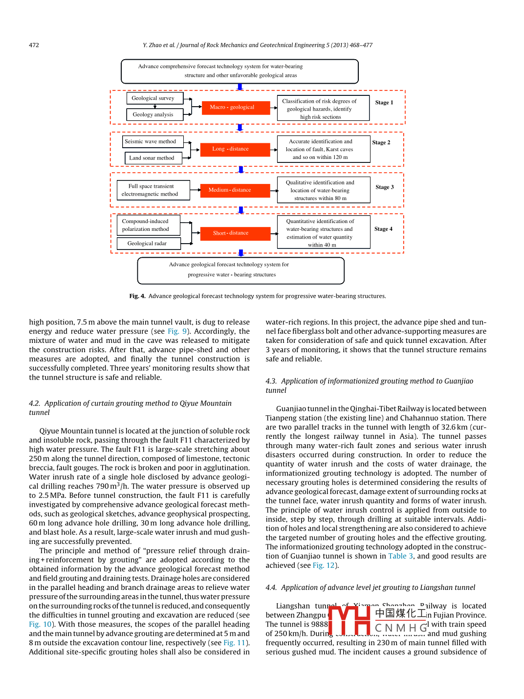 Journal of Rock Mechanics and Geotechnical Engineering 5 (2013) 468- 477Journal of Rock Mechanics and Geotechnical EngineeringRockMechanJournal of Rock Mechanics and Geotechnical。歲然。Engineering20CSRMEjournal homepage: www.rockgeotech.orgPrevention and treatment technologies of railway tunnel water inrush and mudgushing in ChinaYong Zhaoa,*, Pengfei Lib, Siming Tianaa Project Design and Approval Center of Ministry of Railways, Beijing 100844, Chinab College of Architecture and Civil Engineering, Beiing University of Technology, Beijing 100022, ChinaARTICLEINFOABSTRACTArticle history:Water inrush and mud gushing are one of the biggest hazards in tunnel construction. Unfavorable geo-logical sections can be observed in almost all railway tunnels under construction or to be constructed,Recevea n oecemper 0ine 2013and vary in extent. Furthermore, due to the different heights of mountains and the lengths of tunnels, theAccepted 24 July 2013locations of the unfavorable geological sections cannot be fully determined before construction, whichincreases the risk of water inrush and mud gushing. Based on numerous cases of water inrush and mudKeywords:gushing in railway tunnels, the paper tries to classify water inrush and mud gushing in railway tunnelsTunnel engineeringin view of the conditions of the surrounding rocks and meteorological factors associated with tunnelUnfavorable geological regionsWater inrush and mud gushingmechanisms are summarized, and site - specific treatment method is put forward. The treatment methodsPressure relief technologyAdvance grouting technologyinclude choosing a method of advance geological forecast according to risk degrees of different sec-Advance jet groutingtions in the tunnel, determining the items of predictions, and choosing the appropriate methods, i.e.draining-oriented method, blocking oriented method or draining- and-blocking method. The treatmenttechnologies of railway water inrush and mud gushing are also summarized, including energy relief andpressure relief technology. advance grouting technology. and advance jet grouting technology associatedwith their key technical features and applicable conditions. The resuits in terms of treatment methodscan provide reference to the prevention and treatment of tunnel water inrush and mud gushing.⑥2013 Institute of Rock and Soil Mechanics, Chinese Academy of Sciences. Production and hosting byElsevier B.V. All rights reserved.1. Introductionrium of surrounding rocks undergo drastic changes due to theexcavation of underground projects, which causes instant releaseUp to now, nearly ten thousand kilometers of railway tunnelsof the energy stored in underground water carrying mud and sandhave been built under a variety of complex geological conditions inthat gush to the tunnel face at a high speed (Lin and Song, 2012).China. In tuInnel construction, water inrush and mud gushing aren recentyears, morethan0 casesof watersh andthe challenging isues. They are characterized by the largest geolog-mud gushing have been observed in China, causing serious lossesical hazards and the potential risks (see Fig. 1). In this paper, waterof human life and economics and deterioration of constructioninrush and mud gushing in underground projects basically referto the dynamic destruction of structure in unfavorable geologicalunderground construction are involved. For drainage in large quan-sections. The hydrodynamic system and the dynamic equilib-tity over a long period of time is costly, the ecological environmentscan seriously be undermined, leading to the depletion of waterresources, death of vegetation and destruction of farmlands.Water inrush seriously threatens construction when the tunnel* Corresponding author. Tel: +86 13601 107599.goes through water-rich area, which frequently occurs in unfa-E-mail address: jdzxzhaoyong@sina.com (Y. Zhao).vorable geological sections. For examples, serious water inrushPeer review under responsibility of Instute of Rock and Soil Mechanics, Chineseand mud gushing occurred in the Yuanliang mountain tunnel ofAcademy ofSciences.Chongqing-Huaihua Railway. The peak duration of the water inrushlasted for roughly 051 with watar discharoa nf雷nr 1x 105 m:themud in the tunnel_value of mud wasESEVERI Production and hosting by EIsevierapproximately 1.5MHc N M H Gfwater irush andmud gushing of t1674-7755◎2013 Institute of Rock and Soil Mechanics, Chinese Academy oftain tunnel, accounting for economic losses over RMB 20 million.Sciences. Production and hosting by Elsevier B.V. All rights reserved.http://dx.doi.og/10.1016/jj.imge.2013.07.009In the Malujing tunnel of Yichang-Wanzhou Railway, water inrushY. Zhao et al. /Jourmal of Rock Mechanics and Geotechnical Engineering 5 (2013) 468- 477469Water inush andTable 1Types of water inrush and mud gushing.Landslide or largeClassification criteriaType9%" deformation45(1)Water inrush and mud gushingThe location of water inrush and mud at tunnel facegushing(2)Water inrush and mud gushing■Rockburstat tunnel vault(3) Water inrush and mud gushingat tunnel floor■Others(4)Water inrush and mud gushingat tunnel sidewallsFig. 1. Types of geological disasters in tunnels excavated by dill-and- blast method(1) Sudden burst of water inrushand their percentages.and mud gushing(2) Delayed water inrush and mudand mud gushing occurred in the“DK255 + 978" karst tunnels on(3) Sluggish water inrush and mud21 January 2006, with the value of water inrush of approximately7.2 x 105 m3 and the mud of about 7.0 x 104 m3. The water inrush(1) Super large scale water inrushand mud gushing flooded the 3152 m parallel heading and 2508 mThe quantity of water inrush and mud(2) Large- scale water inrush andmain tunnel in vicinity of exit, and caused the damages of a largenumber of equipment and machinery with economic losses over(3) Medium scale water inrush andRMB 10 million. After that, the treatments of this accident tookmud gushingfor 3 years. In the Yesanguan tunnel of Yichang-Wanz