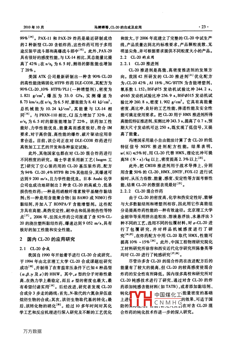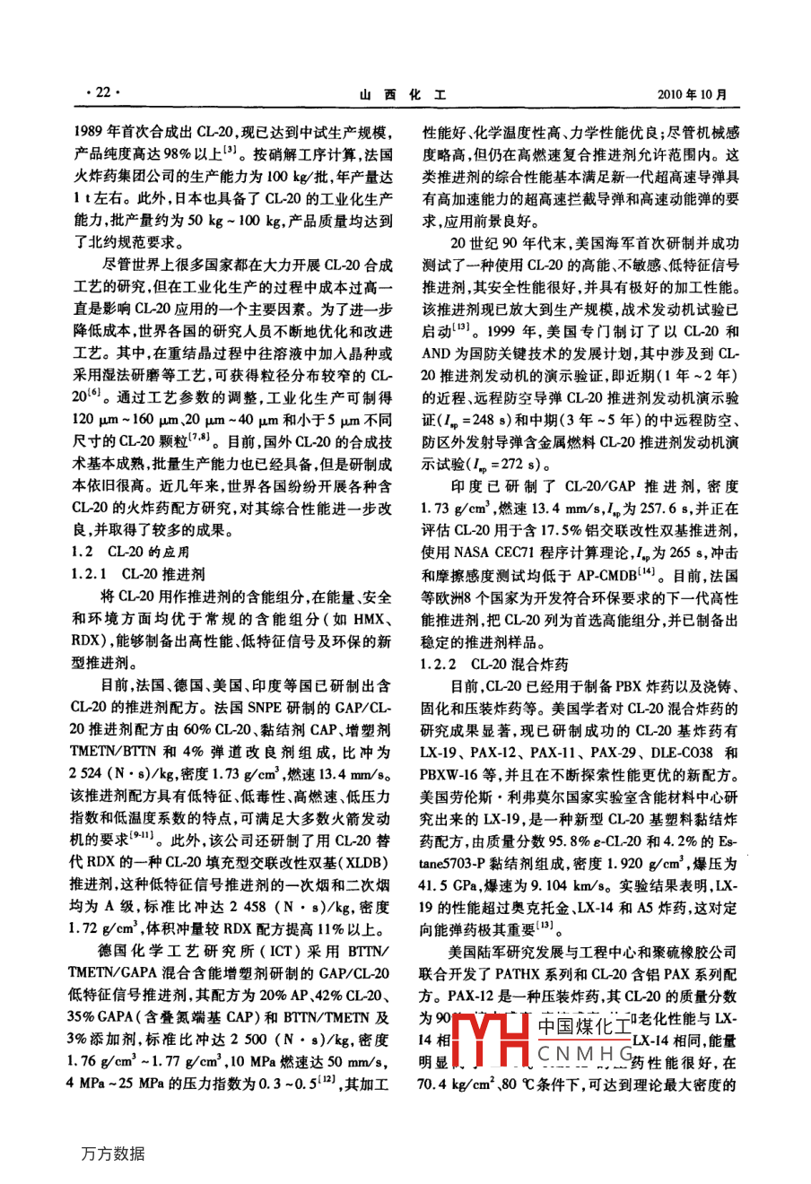 第30卷第5期山西化工Vol.30 No.S2010年10月SHANXI CHEMICAL INDUSTRYOct.2010,綜述與論壇...........CL-20的合成及應(yīng)用馬婷婷,茍瑞君,李文軍,王義寧(中北大學(xué)化工與環(huán)境學(xué)院,山西太原030051)摘要:概述了高能最密度化合物CL-20的合成及其在高性能固體推進(jìn)劑、高性能混合炸藥,低信號特征推進(jìn)劑、高燃速推進(jìn)劑和高性能火炮發(fā)射藥等技術(shù)領(lǐng)域的研究進(jìn)展,并對其應(yīng)用前景進(jìn)行了展望。關(guān)鍵詞:六硝基六氮雜異伍茲烷:推進(jìn)劑;高能量密度化合物;混合炸藥;發(fā)射藥中圖分類號:TQ56文獻(xiàn)標(biāo)識碼:A文章 編號:004-7050(2010)05-0021-04先合成籠狀胺或其衍生物,然后將胺轉(zhuǎn)化為相應(yīng)的引言硝胺。自從1987年美國采用Nielsen合成法制得高能量密度含能材料是當(dāng)前炸藥研究領(lǐng)域的熱CL-20以來,瑞典和印度也采用Nelsen合成路線合點(diǎn)之一。六硝基六氮雜異伍茲烷(俗稱CL-20,簡寫成了CL-20。之后,許多國家對Nielsen 的合成方為HNIW)是近幾年來發(fā)現(xiàn)合成的新型高密度、高法及合成工藝進(jìn)行了改進(jìn)優(yōu)化研究。近20年來,各能量高爆壓、高爆速的籠形化合物,是迄今為止應(yīng)國科學(xué)家所研究的可用來合成CL-20的硝化前體不用的能量最高的單質(zhì)炸藥。CL-20 由美國海軍武器下10種干。但實(shí)踐證明,可用于放大生產(chǎn)的硝化前中心Nielsen最早合成出來,被美國專家稱之為“突體只有3種,即HBIW進(jìn)行一次氫解得到的四乙酰破性的第4代含能材料”,是“威力最強(qiáng)大的非核炸基二芐基六氮雜異伍茲烷( TADB)、TADB在不同條藥”。國際火炸藥界將其譽(yù)為“炸藥合成史上的一件下再次氫解得到的四乙?;柞;s異伍個(gè)重大突破”。近年來,盡管對其他氧化劑進(jìn)行了茲烷( TADF)和四乙?;s異伍茲烷(TAIW)。合成與應(yīng)用研究,但其能量水平都比CL-20稍遜- -北約集團(tuán)經(jīng)歷7次修改,于2003年制定了北約各成疇。因此,美國認(rèn)為,“未來10年~15年內(nèi)要大幅員國統(tǒng)- -遵守的CL-20質(zhì)量標(biāo)準(zhǔn),要求產(chǎn)品化學(xué)純度地提高傳統(tǒng)武器性能, CL-20仍是惟- - 的選擇”。度≥99% ,e-CL-20晶型純度≥95%。通過近20多年的研究, CL-20的合成技術(shù)及在火炸美國聚硫橡膠公司通過對Nielsen最初的合成藥中的應(yīng)用研究已在世界各國取得了很大的進(jìn)展。路線進(jìn)行修改(即HBIW脫芐工藝的改進(jìn)) ,開發(fā)并建立了放大合成CL-20的工藝生產(chǎn)線,產(chǎn)品純度可1國外CL-20的應(yīng)用研究達(dá)96%以上3.4。之后,研究人員取消了原亞硝化1.1 CL-20的合成工藝而改用二次氫化?;に?并由美國Cordant隨著科技的迅速發(fā)展, CL-20合成技術(shù)在不斷技術(shù)公司付諸中試生產(chǎn)。截止2001年,已生產(chǎn)產(chǎn)品改進(jìn)中日趨成熟。CL-20 屬籠狀結(jié)構(gòu)化合物,一般4 536 kg,純度高達(dá)97% ~98%5。美國具備了CL~20的工業(yè)化生產(chǎn)能力,按硝解工序計(jì)算,其現(xiàn)有生產(chǎn)能力已達(dá)到200 kg/批。收稿日期:20100421作者簡介:馬婷婷,女, 1985年出生,中北大學(xué)在讀碩土研究生。研中國煤化工生Nielsen合成法究方向:火炸藥安全及技術(shù)。的基碼!YHC NMH G行了改進(jìn),并于●22●山西化工2010年10月1989年首次合成出CL-20 ,現(xiàn)已達(dá)到中試生產(chǎn)規(guī)模,性能好、化學(xué)溫度性高、力學(xué)性能優(yōu)良;盡管機(jī)械感產(chǎn)品純度高達(dá)98%以上”。按硝解工序計(jì)算,法國度略高,但仍在高燃速復(fù)合推進(jìn)劑允許范圍內(nèi)。這火炸藥集團(tuán)公司的生產(chǎn)能力為100 kg/批,年產(chǎn)量達(dá)類推進(jìn)劑的綜合性能基本滿足新- -代超高速導(dǎo)彈具1 t左右。此外,日本也具備了CL-20的工業(yè)化生產(chǎn)有高加速能力的超高速攔截導(dǎo)彈和高速動能彈的要能力,批產(chǎn)量約為50 kg~ 100 kg,產(chǎn)品質(zhì)量均達(dá)到求,應(yīng)用前景良好。了北約規(guī)范要求。20世紀(jì)90年代末,美國海軍首次研制并成功盡管世界上很多國家都在大力開展CL-20合成測試了一種使用CL-20的高能、不敏感、低特征信號工藝的研究,但在工業(yè)化生產(chǎn)的過程中成本過高- -推進(jìn)劑,其安全性能很好,并具有極好的加工性能。直是影響CL-20應(yīng)用的-一個(gè)主要因素。為了進(jìn)步該推進(jìn)劑現(xiàn)已放大到生產(chǎn)規(guī)模,戰(zhàn)術(shù)發(fā)動機(jī)試驗(yàn)已降低成本,世界各國的研究人員不斷地優(yōu)化和改進(jìn)啟動以。1999年,美國專門制訂了以CL-20和工藝。其中,在重結(jié)晶過程中往溶液中加入晶種或AND為國防關(guān)鍵技術(shù)的發(fā)展計(jì)劃,其中涉及到CL-采用濕法研磨等工藝,可獲得粒徑分布較窄的CL-20推進(jìn)劑發(fā)動機(jī)的演示驗(yàn)證,即近期(1年~2年)20l6)。通過工藝參數(shù)的調(diào)整,工業(yè)化生產(chǎn)可制得的近程、遠(yuǎn)程防空導(dǎo)彈CL-20 推進(jìn)劑發(fā)動機(jī)演示驗(yàn)120μm~160μm、20μm~40μm和小于5μm不同.證(1p =248 s)和中期(3年~5年)的中遠(yuǎn)程防空、尺寸的CL-20顆粒l7,則。目前,國外CL-20的合成技防區(qū)外發(fā)射導(dǎo)彈含金屬燃料CL-20推進(jìn)劑發(fā)動機(jī)演術(shù)基本成熟,批量生產(chǎn)能力也已經(jīng)具備,但是研制成示試驗(yàn)(1p =272 s)。