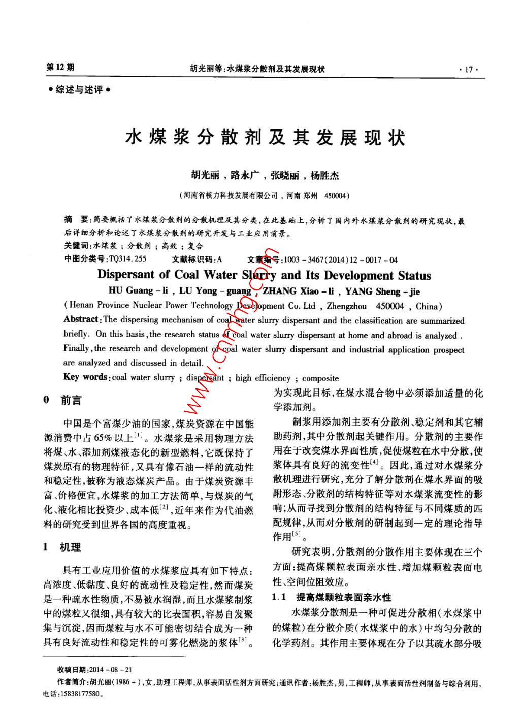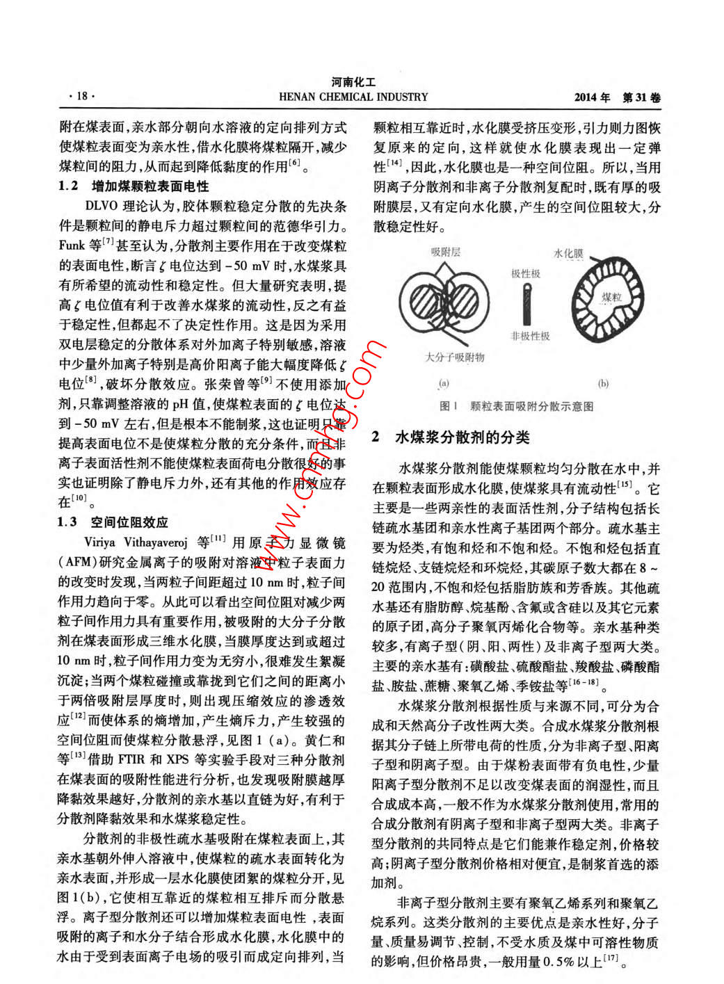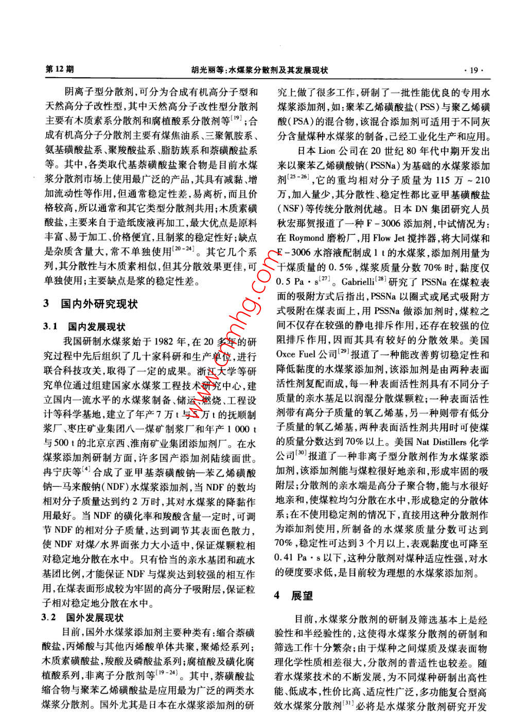 第12期胡光麗等:水煤漿分散劑及其發(fā)展現(xiàn)狀·綜述與述評水煤漿分散劑及其發(fā)展現(xiàn)狀胡光麗,路永廣,張曉麗,楊勝杰(河南省核力科技發(fā)展有限公司,河南鄭州450004)摘要:簡要概括了水煤漿分散劑的分散機(jī)理及其分類,在此基礎(chǔ)上,分析了國內(nèi)外水煤漿分散劑的研究現(xiàn)狀,最后詳細(xì)分析和論述了水煤漿分散劑的研究開發(fā)與工業(yè)應(yīng)用前景。關(guān)鍵詞:水煤漿;分散劑;高效;復(fù)合中圖分類號:TQ314.255文獻(xiàn)標(biāo)識碼:A文章編號:1003-3467(2014)12-0017-04Dispersant of Coal Water Slurry and Its Development StatusHU Guang-li, LU Yong-guang, ZHANG Xiao-li, YANG Sheng-jieHenan Province Nuclear Power Technology Development Co Ltd, Zhengzhou 450004, China)Abstract: The dispersing mechanism of coal water slurry dispersant and the classification are summarizedbriefly. On this basis, the research status of coal water slurry dispersant at home and abroad is analyzedFinally, the research and development of coal water slurry dispersant and industrial application prospectare analyzed and discussed in detailKey words: coal water slurry i dispersant high efficiency; composite0前言為實現(xiàn)此目標(biāo),在煤水混合物中必須添加適量的化學(xué)添加劑。中國是個富煤少油的國家,煤炭資源在中國能制漿用添加劑主要有分散劑、穩(wěn)定劑和其它輔源消費中占65%以上。水煤漿是采用物理方法助藥劑,其中分散劑起關(guān)鍵作用。分散劑的主要作將煤、水、添加劑煤液態(tài)化的新型燃料,它既保持了用在于改變煤水界面性質(zhì),促使煤粒在水中分散,使煤炭原有的物理特征,又具有像石油一樣的流動性漿體具有良好的流變性。因此通過對水煤漿分和穩(wěn)定性被稱為液態(tài)煤炭產(chǎn)品。由于煤炭資源豐散機(jī)理進(jìn)行研究,充分了解分散劑在煤水界面的吸富、價格便宜,水煤漿的加工方法簡單,與煤炭的氣附形態(tài)分散劑的結(jié)構(gòu)特征等對水煤漿流變性的影化液化相比投資少、成本低21,近年來作為代油燃響,從而尋找到分散劑的結(jié)構(gòu)特征與不同煤質(zhì)的匹料的研究受到世界各國的高度重視。配規(guī)律,從而對分散劑的研制起到一定的理論指導(dǎo)作用51機(jī)理研究表明,分散劑的分散作用主要體現(xiàn)在三個具有工業(yè)應(yīng)用價值的水煤漿應(yīng)具有如下特點方面:提高煤顆粒表面親水性、增加煤顆粒表面電高濃度、低黏度、良好的流動性及穩(wěn)定性,然而煤炭性、空間位阻效應(yīng)是一種疏水性物質(zhì),不易被水潤濕,而且水煤漿制漿1.1提高煤顆粒表面親水性中的煤粒又很細(xì),具有較大的比表面積,容易自發(fā)聚水煤漿分散劑是一種可促進(jìn)分散相(水煤漿中集與沉淀,因而煤粒與水不可能密切結(jié)合成為一種的煤粒)在分散介質(zhì)(水煤漿中的水)中均勻分散的具有良好流動性和穩(wěn)定性的可霧化燃燒的漿體。化學(xué)藥劑。其作用主要體現(xiàn)在分子以其疏水部分吸收稿日期:2014-08-21作者簡介:胡光麗(1986-),女,助理工程師,從事表面活性劑方面研究;通訊作者:楊勝杰男,工程師從事表面活性劑制備與綜合利用,電話:15838177580河南化工18HENAN CHEMICAL INDUSTRY2014年第31卷附在煤表面,親水部分朝向水溶液的定向排列方式顆粒相互靠近時,水化膜受擠壓變形,引力則力圖恢使煤粒表面變?yōu)橛H水性,借水化膜將煤粒隔開,減少復(fù)原來的定向,這樣就使水化膜表現(xiàn)出一定彈煤粒間的阻力,從而起到降低黏度的作用6。性,因此,水化膜也是一種空間位阻。所以,當(dāng)用12增加煤顆粒表面電性陰離子分散劑和非離子分散劑復(fù)配時,既有厚的吸DLVO理論認(rèn)為,膠體顆粒穩(wěn)定分散的先決條附膜層,又有定向水化膜,產(chǎn)生的空間位阻較大,分件是顆粒間的靜電斥力超過顆粒間的范德華引力。散穩(wěn)定性好。Funk等甚至認(rèn)為,分散劑主要作用在于改變煤粒吸附層水化膜的表面電性斷言電位達(dá)到-50mV時,水煤漿具極性極有所希望的流動性和穩(wěn)定性。但大量研究表明,提高電位值有利于改善水煤漿的流動性,反之有益數(shù)2)C于穩(wěn)定性,但都起不了決定性作用。這是因為采用雙電層穩(wěn)定的分散體系對外加離子特別敏感,溶液非極性極中少量外加離子特別是高價陽離子能大幅度降低大分子吸附物電位,破壞分散效應(yīng)。張榮曾等9不使用添加劑,只靠調(diào)整溶液的pH值,使煤粒表面的電位達(dá)圖1顆粒表面吸附分散示意圖到-50mV左右,但是根本不能制漿,這也證明只靠提高表面電位不是使煤粒分散的充分條件,而且非2水煤漿分散劑的分類離子表面活性劑不能使煤粒表面荷電分散很好的事水煤漿分散劑能使煤顆粒均勻分散在水中,并實也證明除了靜電斥力外,還有其他的作用效應(yīng)存在顆粒表面形成水化膜,使煤漿具有流動性5。它在主要是一些兩親性的表面活性劑,分子結(jié)構(gòu)包括長13空間位阻效應(yīng)鏈?zhǔn)杷鶊F(tuán)和親水性離子基團(tuán)兩個部分。疏水基主Viriya Vithayaveroj等用原子力顯微鏡要為烴類,有飽和烴和不飽和烴。不飽和烴包括直(AFM)研究金屬離子的吸附對溶液中粒子表面力鏈烷烴、支鏈烷烴和環(huán)烷烴,其碳原子數(shù)大都在8的改變時發(fā)現(xiàn),當(dāng)兩粒子間距超過10m時,粒子間20范圍內(nèi)不飽和烴包括脂肪族和芳香族。其他疏作用力趨向于零