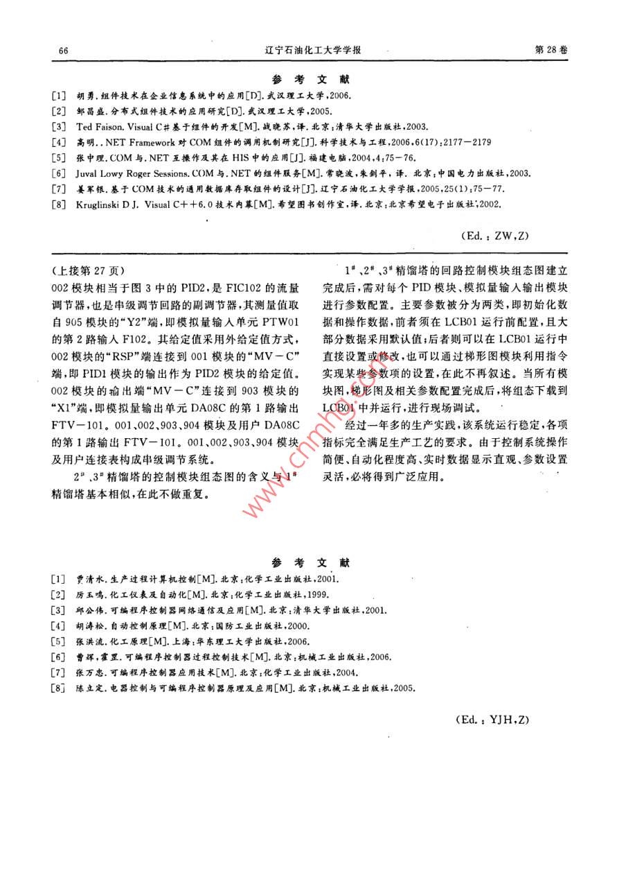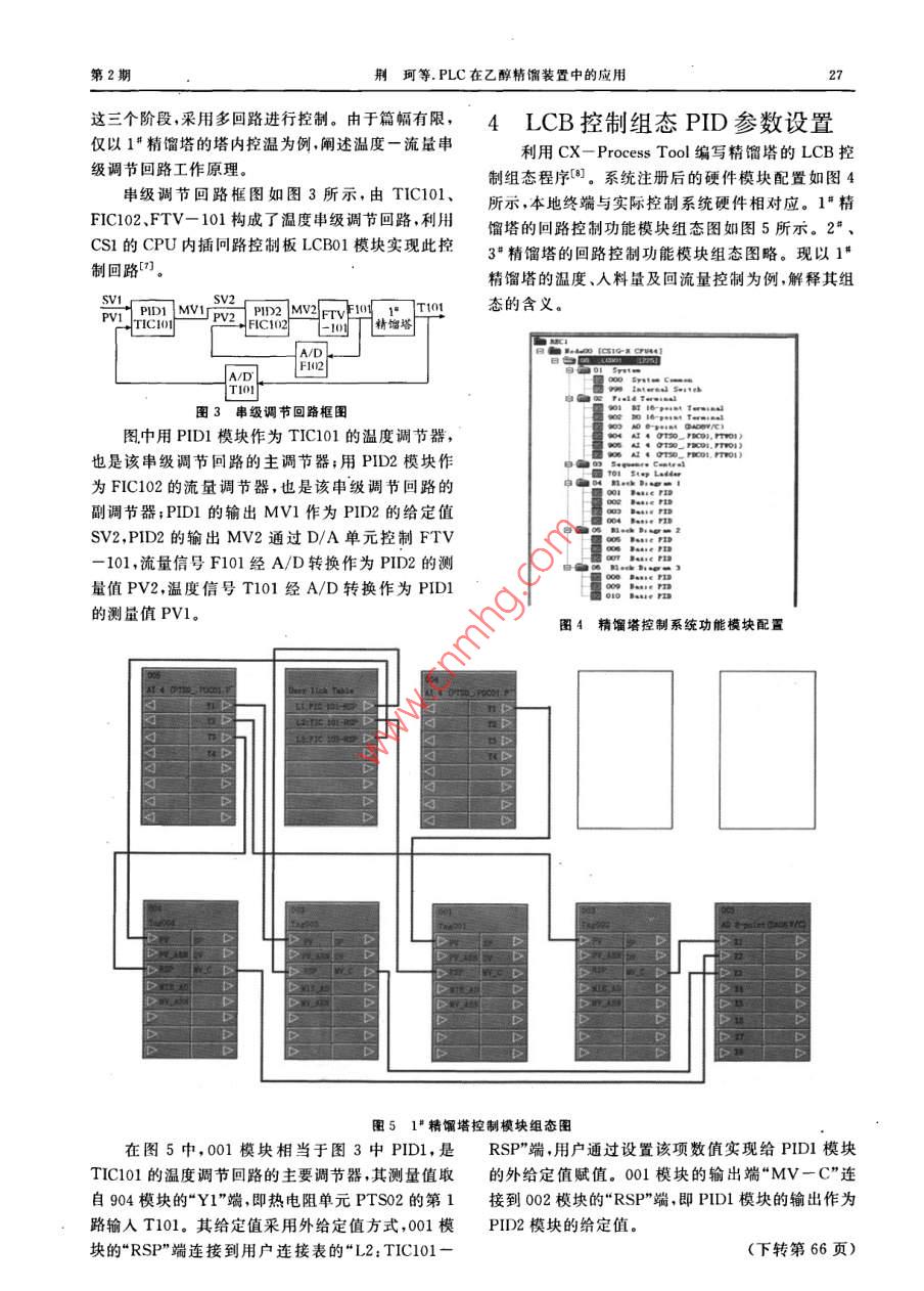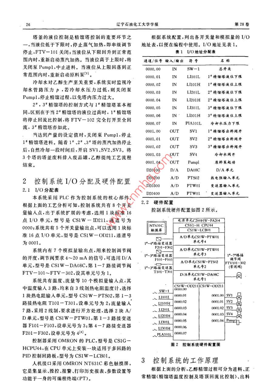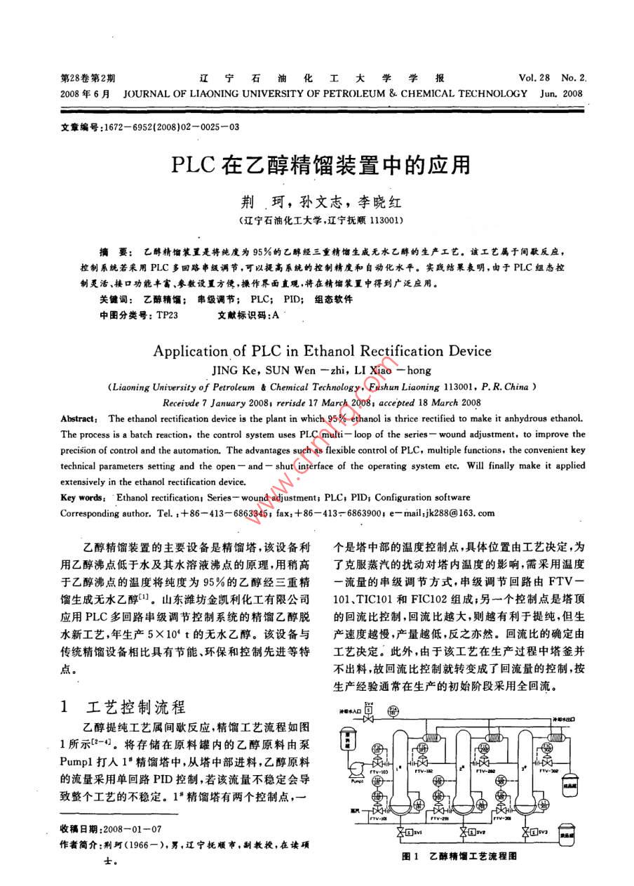 第28卷第2期遼寧石油化工大學(xué)學(xué)報(bào) Vol. 28 No.2.2008年6月 JOURNAL OF LIAONING UNIVERSITY OF PETROLEUM& CHEMICAL TECHNOLOGY Jun.2008文章編號(hào):1672-6952(2008)02-0025-03PLC在乙醇精餾裝置中的應(yīng)用荊珂,孫文志,李曉紅遼寧石油化工大學(xué),遼寧撫順113001)摘要:乙醇精餾裝置是將純度為95%的乙醇經(jīng)三重精餾生成無(wú)水乙醇的生產(chǎn)工藝該工藝屬于間反應(yīng),控制系統(tǒng)若采用PLC多回路串級(jí)調(diào)節(jié),可以提高系統(tǒng)的控制精度和自動(dòng)化水平。實(shí)踐結(jié)果表明,由于PLC組態(tài)控制靈活、接口功能豐富、參數(shù)設(shè)置方便,操作界面直觀將在精餾裝置中得到廣泛應(yīng)用關(guān)鍵詞:乙醇精餾;串級(jí)調(diào)節(jié);PLC;PID;組態(tài)軟件中國(guó)分類號(hào):TP23文獻(xiàn)標(biāo)識(shí)碼:A Application of PLC in Ethanol Rectification Device JING Ke, SUN Wen-zhi, LI Xiao-hong(Liaoning University of Petroleum& Chemical Technology Fushun Liaoning113001,p.r. China) Receivde 7 January 2008; rerisde 17 March 2008 accepted 18 March 2008 Abstract: The ethanol rectification device is the plant in which 95% ethanol is thrice rectified to make it anhydrous ethanol. The process is a batch reaction, the control system uses PLC multi-loop of the series-wound adjustment, to improve the precision of control and the automation. The advantages such as flexible control of PLC, multiple functions, the convenient key technical parameters setting and the open-and- shut interface of the operating system etc. Will finally make it applied extensively in the ethanol rectification device. Key words: Ethanol rectification: Series-wound adjustment: PLC: PID: Configuration software Corresponding author. Tel. +86-413-6863345 jk288@163.com.tel:+86-413-686334fax:+86-413-6863900e-mailjk288@163.com乙醇精餾裝置的主要設(shè)備是精餾塔,該設(shè)備利個(gè)是塔中部的溫度控制點(diǎn),具體位置由工藝決定,為用乙醇沸點(diǎn)低于水及其水溶液沸點(diǎn)的原理,用稍高了克服蒸汽的擾動(dòng)對(duì)塔內(nèi)溫度的影響,需采用溫度于乙醇沸點(diǎn)的溫度將純度為95%的乙醇經(jīng)三重精一流量的串級(jí)調(diào)節(jié)方式,串級(jí)調(diào)節(jié)回路由FTV一餾生成無(wú)水乙醇山東濰坊金凱利化工有限公司101、TIC101和FIC102組成;另一個(gè)控制點(diǎn)是塔頂應(yīng)用PLC多回路串級(jí)調(diào)節(jié)控制系統(tǒng)的精餾乙醇脫的回流比控制,回流比越大,則越有利于提純,但生水新工藝,年生產(chǎn)5×10t的無(wú)水乙醇該設(shè)備與產(chǎn)速度越慢,產(chǎn)量越低,反之亦然。回流比的確定由傳統(tǒng)精餾設(shè)備相比具有節(jié)能環(huán)保和控制先進(jìn)等特工藝決定。此外,由于該工藝在生產(chǎn)過(guò)程中塔釜并點(diǎn)。不出料,故回流比控制就轉(zhuǎn)變成了回流量的控制,按生產(chǎn)經(jīng)驗(yàn)通常在生產(chǎn)的初始階段采用全回流。1工藝控制流程乙醇提純工藝屬間歇反應(yīng),精餾工藝流程如圖1所示[2-4。將存儲(chǔ)在原料罐內(nèi)的乙醇原料由泵Pump1打入1#精餾塔中,從塔中部進(jìn)料,乙醇原料的流量采用單回路PID控制,若該流量不穩(wěn)定會(huì)導(dǎo)致整個(gè)工藝的不穩(wěn)定。1精餾塔有兩個(gè)控制點(diǎn),一收稿日期:2008-01-07作者簡(jiǎn)介:荊珂(1966一),男,遼寧撫順市,副教授,在讀碩士圖1乙醇精餾工藝流程圖26遼寧石油化工大學(xué)學(xué)報(bào)第28卷塔釜的液位控制是精餾塔控制的重要環(huán)節(jié)之根據(jù)系統(tǒng)配置,列出各開關(guān)量和模擬量的1/O一當(dāng)液位低于下限時(shí),停止蒸氣加熱,即串級(jí)調(diào)節(jié)地址表,以便在編程中使用/O地址見(jiàn)表1停止,FTV-101關(guān)閉;當(dāng)液位從下限回升到正常范表11/地址分配表圍內(nèi)時(shí),重新啟動(dòng)蒸汽加熱。當(dāng)液位高于上限時(shí)將通道/住號(hào)輸入/輸出符號(hào)名稱關(guān)閉泵 Pumpl,中止進(jìn)料。當(dāng)液位從上限回落到正00.00inw-1總開關(guān)常范圍內(nèi)時(shí),重新啟動(dòng)原料泵50000.01nl10l1精餾塔液位下限冷卻水對(duì)乙醇生產(chǎn)至關(guān)重要,系統(tǒng)實(shí)時(shí)監(jiān)視冷00.02inl101H精塔液位上限卻水管路壓力p,若冷卻水壓力過(guò)低,則關(guān)閉泵00003INLT201L2#精餾塔液位下限Pump,停止精餾過(guò)程,以免塔內(nèi)壓力過(guò)大0000.041NL1201H2精餾塔液位上限2,3精餾塔的控制方式與1精餾塔基本相000.05N.3013精餾塔液位下限同,區(qū)別在于當(dāng)2#精餾塔的液位過(guò)高時(shí),1#精餾塔0000.06n301H3精餾塔液位上限將停止回流比控制,將FTV-102完全打開至全回0000.07 IN PIA101L冷卻水壓力下限流,3精餾塔亦如此。當(dāng)達(dá)到產(chǎn)量的設(shè)定值時(shí),關(guān)閉泵Pumpl,停止0001.00 OUT SVI11精餾塔出料閥開1#精餾塔進(jìn)料。隨著1#、2#、3塔的蒸汽加熱停止0001.01 OUT SV222精餾塔出料閥開后,自然冷卻一段時(shí)間后,開啟SV1、SV2、SV3。將0001.02 OUT SV333精餾塔出料閥開3個(gè)塔的塔釜廢料排入廢品罐,乙醇提純工藝流程001.03 OUT SV44冷卻水閥開結(jié)束。0001.04 OUT Pumpl原粹泵起動(dòng)D20100D/ADA08CD/A單元2控制系統(tǒng)I/O分配及硬件配置D20200a/DPTS02熱電阻輸入單元20300a/dpTw01變送器輸入單元2.11/O分配表D20400A/ PTWO11變送器輸入單元本系統(tǒng)采用PLC作為控制系統(tǒng)的核心部件。根據(jù)上面的工藝分析可知,控制系統(tǒng)共有8個(gè)開關(guān)