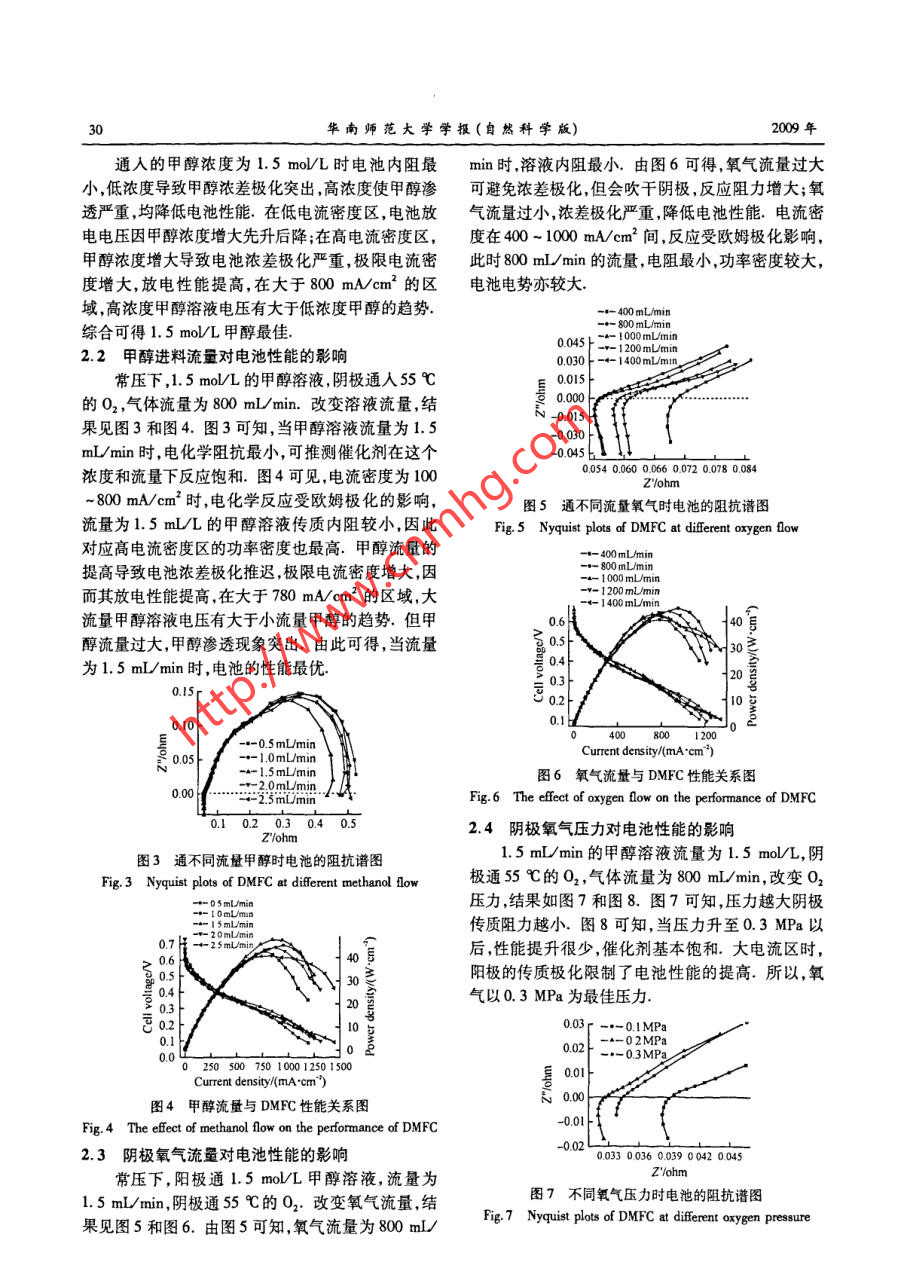華南師范大學(xué)學(xué)報(bào)(自然科學(xué)版)2009年11月JOURNAL OF SOUTH CHINA NORMAL UNIVERSITY第28屆全國化學(xué)與物理電源Nov. 2009(NATURAL SCIENCE EDITION)學(xué)術(shù)年會(huì)論文選.上(增刊)文章編號(hào): 1000 - 5463(2009)S1 -0029 -04直接甲醇燃料電池運(yùn)行參數(shù)的研究劉桂成,王同濤,馬傲冬,王新東,葉鋒(北京科技大學(xué)治金與生態(tài)工程學(xué)院,北京10083)摘要:以載量均為4 mg/cm2的Pt- Ru黑和Pt黑分別為陽極、陰極催化劑,以碳布為擴(kuò)散層,以Naficn115為質(zhì)子交換膜,制備膜電極,組裝直接甲醇燃料電池并通過恒電位法和交流阻抗法分別測試性能和阻抗.研究考察了各種工藝參數(shù)對(duì)電池電化學(xué)性能的影響,得出55 C下最佳工藝參數(shù)為:甲醇濃度為1.5 mol/L、流量為1. 5mL/min時(shí)陽極反應(yīng)達(dá)到最優(yōu),氧氣壓力在0.3 MPa.流量在800 mL/min時(shí)陰極反應(yīng)達(dá)到最佳.關(guān)鍵詞:直接甲醇燃料電池;電化學(xué)性能;膜電極中圖分類號(hào):TM11.4文獻(xiàn)標(biāo)識(shí)碼:A直接甲醇燃料電池(DMFC)是一種通過甲醇和氧氣在兩極發(fā)生氧化還原反應(yīng)產(chǎn)生電能的裝置.2結(jié)果與討論因優(yōu)點(diǎn)顯著,其商業(yè)化備受關(guān)注[1-21.本文制備出2.1甲醇進(jìn)料濃 度對(duì)電池性能的影響在較低溫度(55 C)下運(yùn)行的DMFC,考察了各種運(yùn)反應(yīng)物為甲醇和氧氣,氣體流量暫定800行參數(shù).mL/min,甲醇溶液流量暫定1. 0 mL/min.改變進(jìn)料濃度,結(jié)果見圖1和圖2.1實(shí)驗(yàn).015p -- 1.0mol/L0.010- -- 1.5 mol/L1.1膜電極( MEA)的制備0.005-- 2 0 mol/L以載量均為4 mg/cm' 的Pt - Ru黑( Johnson0.000Matthey公司)和Pt黑(Johnson Matthey 公司)分別N -0.005-0.010為陽、陰極催化劑,加入正丙醇和w( Nafion) =5%的溶液( Aldrich化學(xué)有限公司)制成漿料.以Nafion-0.010.051 0.054 0.057 0.060 0.063Z'/ohm115膜(杜邦公司)為質(zhì)子交換膜,以PTFE膜為轉(zhuǎn)圖1通不同濃 度甲醉時(shí)電池的阻抗介質(zhì),在135 C 7.2 MPa熱轉(zhuǎn)壓150 s,制成CatalystFig.1 Nyquist plots of DMFC at dferent methanol concentation- Coated Membrane. 以碳布(Toray公司)為擴(kuò)散層,- L.0mol/L陰極擴(kuò)散層使用PTFE溶液疏水處理,熱壓制成0.6-- 1.5 mol/L+40室i -- 2.0mol/LMEAI.弓0.5H30P 0.41.2電池的組裝 、活化和測試-20g 0.3-將MEA密封在兩塊有效面積為5 cm2的石墨元0.2-流場板中央.流場板兩側(cè)分別依次加上集流板、絕. 0.1緣片和端板,夾緊,組裝成電池.通入低濃度甲醇水0.,0 200 400 600 800 0002000Current density/(mA^cm)溶液,小電流放電活化9 h后,在VMP2型電化學(xué)綜合測試系統(tǒng)(普林斯頓公司)上分別采用恒電位穩(wěn)圖2甲醇濃度與DMFC性能關(guān)系圖態(tài)極化法和交流阻抗法測試55C下電池的性能和Fig.2 The efect of methanol concentation on the performance阻抗of DMFC收稿日期: 2009-10-19基金資助:國家863計(jì)劃資助項(xiàng)目(2007 AA05Z150) ;國家自然科學(xué)基金資助項(xiàng)目(50528404)作者簡介:劉桂成(1983 - ) ,男,河北人,北京科技大學(xué)博士研究生,主要研究方向:直接甲醇燃料電池, Email:!og67@ 163. com.30華南師范大學(xué)學(xué)報(bào)(自然科學(xué)版)2009年通人的甲醇濃度為1.5 mol/L時(shí)電池內(nèi)阻最min時(shí),溶液內(nèi)阻最小,由圖6可得,氧氣流量過大小,低濃度導(dǎo)致甲醇濃差極化突出,高濃度使甲醇滲可避免濃差極化,但會(huì)吹千陰極,反應(yīng)阻力增大;氧透嚴(yán)重,均降低電池性能.在低電流密度區(qū),電池放氣流量過小,濃差極化嚴(yán)重,降低電池性能.電流密電電壓因甲醇濃度增大先升后降;在高電流密度區(qū),度在400~1000mA/em2間,反應(yīng)受歐姆極化影響,甲醇濃度增大導(dǎo)致電池濃差極化嚴(yán)重,極限電流密此時(shí)800 mL/min的流量,電阻最小,功率密度較大,度增大,放電性能提高,在大于800 mA/cm2的區(qū)電池電勢亦較大.域,高濃度甲醇溶液電壓有大于低濃度甲醇的趨勢.-- 400 mL/min綜合可得1. 5 mol/L甲醇最佳.0.045卜- 1200mLUmin2.2甲醇進(jìn)料流量對(duì)電池性能的影響0.030 t -←- 1400mL/mn常壓下,1.5 mol/L的甲醇溶液,陰極通人55 C0.015的02 ,氣體流量為800 mL/min.改變?nèi)芤毫髁?結(jié)N -0.015果見圖3和圖4.圖3可知,當(dāng)甲醇溶液流量為1.5-0.030mL/min時(shí),電化學(xué)阻抗最小,可推測催化劑在這個(gè)-0.0450.054 0.060 0.066 0.072 0.078 0.084濃度和流量下反應(yīng)飽和.圖4可見,電流密度為100~800mA/cm2*時(shí),電化學(xué)反應(yīng)受歐姆極化的影響,圖5通不同流量氧 氣時(shí)電池的阻抗譜圖流量為1.5mL/L的甲醇溶液傳質(zhì)內(nèi)阻較小,因此Fig.5 Nyquist plots of DMFC at diferent oaxygen flov對(duì)應(yīng)高電流密度區(qū)的功率密度也最高.甲醇流量的-- 400mL/min提高導(dǎo)致電池濃差極化推遲,極限電流密度增大,因-- 800 mL/min-- 1000 mUmin而其放電性能提高,在大于780 mA/cm2的區(qū)域,大-- I 200 mL/min流量甲醇溶液電壓有大于小流量甲醇的趨勢.但甲0.640號(hào)醇流量過大,甲醇滲透現(xiàn)象突出。由此可得,當(dāng)流量為1.5mL/min時(shí),電池的性能最優(yōu)03-0.2-10復(fù)0.10-1- 0.5 mL/minCurent density/(mA.cm)員0.05+- 1.0mLmin1.5 mL/min圖6氧氣流量與DMFC性能關(guān)系圖一2.0mL/min0.00 ------.3“--“-Fig.6 The efet of oxygen flow on the performance of DMFC0.1 0.2_ 0.3 0.4 0.52.4陰極氧氣壓力對(duì) 電池性能的影響Z'/ohm1.5 mL/min的甲醇溶液流量為1.5 mol/L,陰.圖3通不同流量甲 醇時(shí)電池
