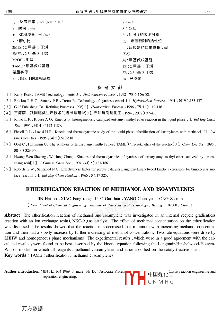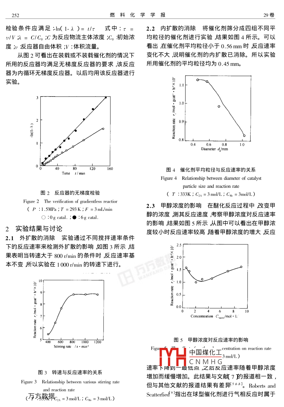 第29卷第3期料化學(xué)學(xué)報(bào)Vol 29 No. 32001年6月JOURNAL OF FUEL CHEMISTRY AND TECHNOLOGY文章編號(hào):0253-24020013-0251-05甲醇與異戊烯醚化反應(yīng)的研究靳海波,肖芳榮,羅國(guó)華,楊春育,佟澤民北京石油化工學(xué)院化工系,北京102600)摘要:采用國(guó)產(chǎn)大孔磺酸樹臘(NκC9)在無(wú)梯度反應(yīng)器內(nèi)對(duì)異戊烯與甲醇醚化反應(yīng)進(jìn)行了研究。在消除內(nèi)擴(kuò)散和外擴(kuò)散的情況下考察了甲醇濃度對(duì)醚仳反應(yīng)速率的影響。根據(jù)Iw杋理和均相反應(yīng)機(jī)理推導(dǎo)岀相應(yīng)的模型方程經(jīng)模型篩選和參數(shù)估值得岀ⅠHHW模型為最佳模型。在該模型中反應(yīng)速率的實(shí)驗(yàn)值與模擬值有較好的一致性關(guān)鍵詞∵甲基叔戊基醚;醚化反應(yīng);異戊烯;甲醇中圖分類號(hào):mO032文獻(xiàn)標(biāo)識(shí)碼:A近年來(lái)作為辛烷值添加劑的醚類含氧化合物1.3分析方法實(shí)驗(yàn)所用分析儀器為HP5890氣〔MTBE、TAME等)得到了迅速地發(fā)展,其中甲基叔相色譜儀程序升溫控制具體條件如下色譜柱為戊基醚TAME的生產(chǎn)因素具有原料充足、較低的雷4m、Φ3不銹鋼涸定相為10%1,234四2氰乙德蒸氣壓(RP)及能顯著降低汽油中的烯烴含量等氧基甲基呷烷;FI檢測(cè)器汽化室溫度為180℃特點(diǎn)將得到更快的發(fā)展4]。TAME還可進(jìn)一步裂檢測(cè)室溫度180℃載氣N流量為4.5mmin-1H,解生產(chǎn)異戊烯后者可用于合成其它精細(xì)化工產(chǎn)品流量為45 ml: min空氣流量為250mmin-l。如粉檀麝香等)14試驗(yàn)裝置與試驗(yàn)條件反應(yīng)器為250mL磁力TAME是由甲醇和異戊烯在催化劑的作用下液攪拌反應(yīng)釜。原料液由微量泵計(jì)量送入預(yù)熱器中,相醚化合成得到的江業(yè)化生產(chǎn)TAME的原料是催然后進(jìn)入反應(yīng)器進(jìn)行液相合成反應(yīng)流出物流經(jīng)冰化裂化和蒸氣裂解C餾分在異戊烯的三種異構(gòu)體水浴冷凝進(jìn)入產(chǎn)品罐如圖1所示。壓力由調(diào)節(jié)閥中僅2-甲基-1-丁燉2MB廂2甲基2-丁爔2M2B具有醚化反應(yīng)活性3-甲基1-丁爔3MIB溵有醚化反應(yīng)活性。工業(yè)化的催化劑為大孔徑強(qiáng)酸性離子交換樹脂37(如 Amberlystl15、 Lewatit spc118)等。在液相合成TAME的反應(yīng)中除了異戊烯的醚化反應(yīng)外還存在兩種異戊烯的異構(gòu)化反應(yīng)。本文采用內(nèi)循環(huán)無(wú)梯度反應(yīng)器對(duì)異戊烯與甲醇的醚化反應(yīng)進(jìn)行了研究并就幾個(gè)關(guān)鍵問(wèn)題進(jìn)行了圖1試驗(yàn)裝置討論推導(dǎo)出較合適的動(dòng)力學(xué)方程式。Figure 1 Schematic diagram of apparatus1試驗(yàn)部分I- feed :- micro-pump :3 A, 4- chech valve 5, 17-3 way1.1試驗(yàn)原料正戊烷:分析純,含量9%;異戊vavle 6-stirrer :7-heater ;8-thermometer :9-preheater烯含量12%2MB、88%2MB;正庚烷:分析純,含10-thermostatic bath ;1l-reactor 12- thermograph 13≥99%;甲醇:分析純,含量99.5%,水分小于pressure gauge 15 19-icebath 16- regulator 18- product0.05%甲苯分析純含量≥99.5%。調(diào)節(jié)反應(yīng)器內(nèi)部裝有一不銹鋼金屬催化劑筐來(lái)裝1.2催化劑南開大學(xué)化工廠生產(chǎn)的大孔徑強(qiáng)酸載催應(yīng)扣頭:4MPa,溫度為50℃中國(guó)煤化性苯乙烯系陽(yáng)離子交換樹脂NKC-9)全交換量6q醚化反應(yīng)的特性。CNMHG4.7 mmol/g(干),比表面積77m3/g,粒度0.4mm~1.5采用階躍法對(duì)反應(yīng)器1.25mm含水≥10%。進(jìn)行無(wú)梯度檢驗(yàn)溶劑為正庚烷示蹤物為甲苯。其收稿日期:2000-12-01;修回日期:2001-04-03作者簡(jiǎn)介乃數(shù)蟈)男吉林安圖人劇教授工學(xué)博士從事反應(yīng)工程與分離工程等方面的研究燃料化學(xué)報(bào)檢驗(yàn)條件應(yīng)滿足:ln(1-λ)=1/r式中:r2.2內(nèi)擴(kuò)散的消除將催化劑篩分成四組不同平υ/λ=C/Co;C為反應(yīng)物流主體濃度沁軔始濃均粒徑的催化劑進(jìn)行實(shí)驗(yàn)結(jié)果如圖4所示??梢远圈追磻?yīng)器自由體積;:體積流量??闯鲈诖呋瘎┢骄叫∮?.56mm時(shí)反應(yīng)速率從圖2可看出在裝載或不裝載催化劑的情況下變化不大說(shuō)明催化劑的內(nèi)擴(kuò)散已消除。所以實(shí)驗(yàn)所用的反應(yīng)器均滿足無(wú)梯度反應(yīng)器的要求該反應(yīng)所用催化劑的平均粒徑均為0.45mm器為內(nèi)循環(huán)無(wú)梯度反應(yīng)器。以后均用該反應(yīng)器進(jìn)行實(shí)驗(yàn)0圖4催化劑平均粒徑與反應(yīng)速率的關(guān)系Time f minFigure 4 Relationship between diameter of catalystparticle size and reaction rate圖2反應(yīng)器的無(wú)梯度檢驗(yàn)T: 333K: C2A=3 mol/L CMe 3mol/LFigure 2 The verification of gradientless reactior(P: 1. 5MPa:T=293K,F=3 mL/mi2.3甲醇濃度的影響在醚化反應(yīng)過(guò)程中改變甲o(hù):0 g catal.;●:6gcal醇的濃度測(cè)其反應(yīng)速度考察甲醇濃度對(duì)反應(yīng)速率的影響結(jié)果如圖5所示從圖中可以看出在甲醇濃實(shí)驗(yàn)結(jié)果與討論度較小時(shí)反應(yīng)速率較高隨著甲醇濃度的增大反應(yīng)2.1外擴(kuò)散的消除實(shí)驗(yàn)通過(guò)不同攪拌速率條件下的反應(yīng)速率來(lái)檢測(cè)外擴(kuò)散的影響如圖3所示結(jié)果表明當(dāng)轉(zhuǎn)速大于800r/min的條件時(shí)反應(yīng)速率基本不變所以實(shí)驗(yàn)在1000r/min的轉(zhuǎn)速下進(jìn)行。50.5圖5甲醇濃度對(duì)反應(yīng)速
