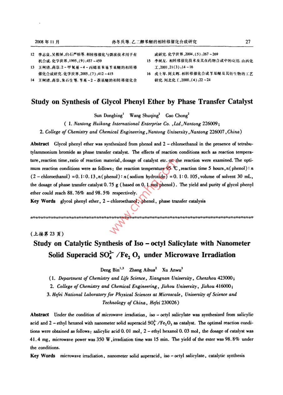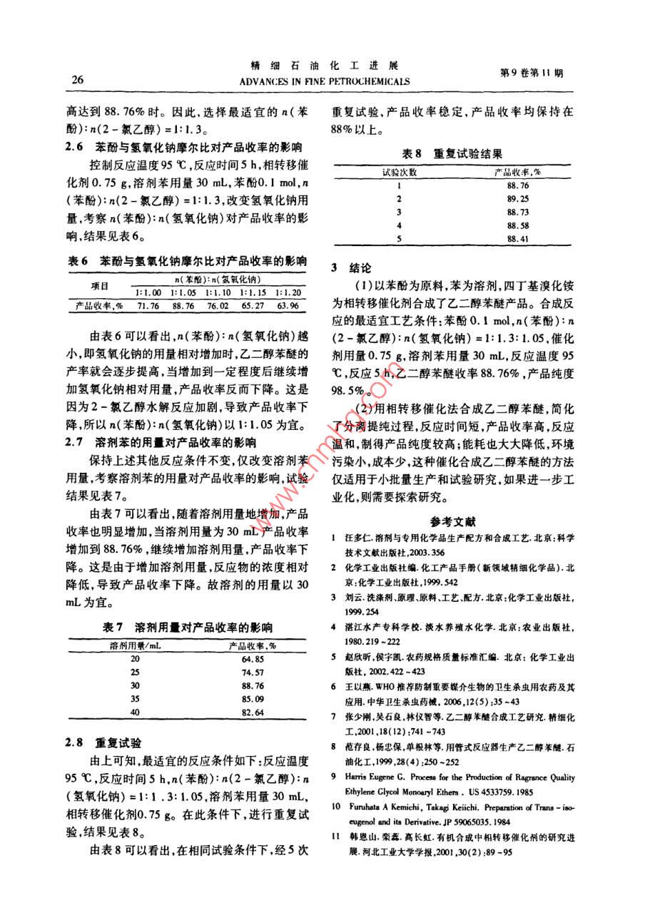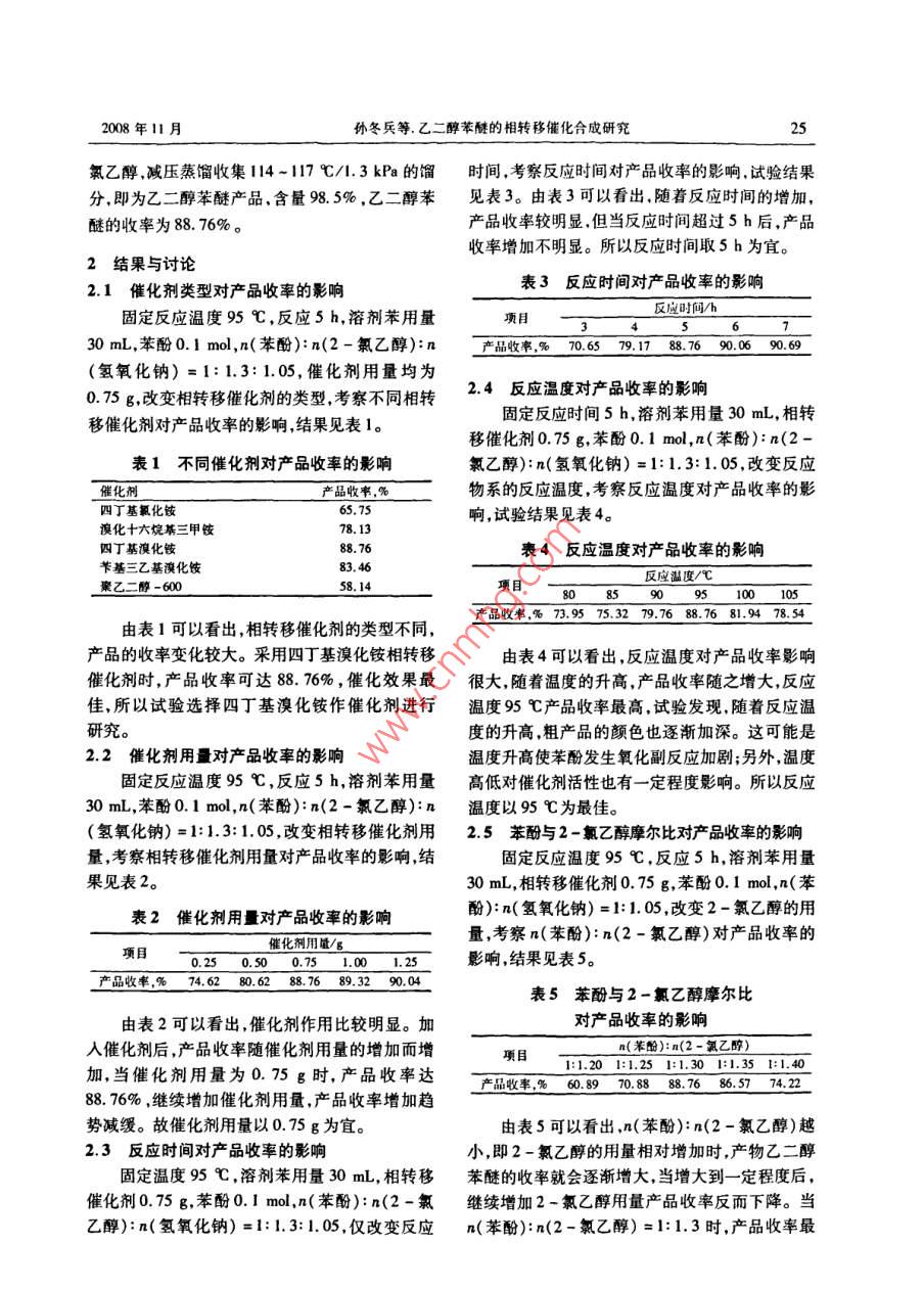 精細(xì)石油化工進(jìn)展第9卷第l1期ADVANCES IN FINE PETROCHEMICALS乙二醇苯醚的相轉(zhuǎn)移催化合成研究孫冬兵!王樹清2高崇2(1南通惠康國際企業(yè)有限公司南通226009;2南通大學(xué)化學(xué)化工學(xué)院南通226007)摘要在四丁基溴化銨相轉(zhuǎn)移催化劑存在下,以苯酚2-氯乙醇為原料合成乙二醇苯醚分別研究了反應(yīng)溫度、反應(yīng)時間原料配比、催化劑用量等對合成反應(yīng)的影響試驗確定合成乙二醇苯醚的最佳工藝條件如下:0.1mol苯酚,n(苯酚):n(2-氯乙醇):n(氫氧化鈉)=1:1.3:1.05反應(yīng)溫度95℃反應(yīng)5h溶劑苯用量為30mL,催化劑用量為0.75g,在此條件下,乙二醇苯醚的收率可達(dá)88.76%,乙二醇苯醚純度98.5%關(guān)鍵詞乙二醇苯醚2-氯乙醇,苯酚相轉(zhuǎn)移催化乙二醇苯醚,別名2-苯氧基乙醇,是一種略收率達(dá)88.76%。帶芳香的無色或淡黃色透明液體,既具有羥基又1試驗有醚基,為各種有機物的優(yōu)良溶劑,可用作洗滌1.1儀器和試劑劑、化妝品、感光印刷板、墨水以及水性涂料的溶原料:苯酚,分析純,廣東汕頭市西隴化工廠劑(;因它具有揮發(fā)性低沸點高毒性小等特2-氯乙醇化學(xué)純中國醫(yī)藥(集團(tuán))上?;瘜W(xué)試點特別適用于圓珠筆芯油墨溶劑。在醫(yī)藥業(yè)可劑公司氫氧化鈉分析純江蘇省金壇試劑廠;四用作麻醉劑,對白血球過多癥、敗血病都有防治效丁基溴化銨,分析純,上海青浦合成試劑廠;苯,分果,可用于殺菌性除臭劑和防打酣滴液的配方析純,廣東汕頭市西隴化工廠。中;復(fù)方苯氧乙醇(主要藥物成分有苯氧乙醇、硼儀器:WZS-I型阿貝折射儀,上海光學(xué)儀器酸酒精等)紗條可用于治療耳部疾病“;氟康唑廠;日本日立L-7420高效液相色譜儀,日本日立滴眼液(由氟康唑苯氧乙醇及磷酸鹽組成)在臨公司產(chǎn)床應(yīng)用中對霉菌性角膜炎有較好療效-0。乙二1.2合成步驟醇苯醚傳統(tǒng)的合成方法是在無機酸(如濃硫酸、1.2.1苯酚鈉鹽的制備鹽酸或磷酸)催化下由環(huán)氧乙烷與苯酚合成(-9在裝有溫度計的三口反應(yīng)瓶中,加入氫氧化鈉但該法存在副反應(yīng)多產(chǎn)品純度不高設(shè)備腐蝕嚴(yán)42g(0.105m),水30mL,苯酚94g(.1ml),重,后處理中含有大量的酸性廢水造成環(huán)境污染在常溫下苯酚完全溶解后備用。等缺點。為克服這些缺點采用相轉(zhuǎn)移催化法合1.2.2z二醇苯醚的制備成乙二醇苯醚,相轉(zhuǎn)移催化反應(yīng)是一種有機合成在裝有電動攪拌器、回流冷凝器和溫度計的新方法0-12),是在相轉(zhuǎn)移催化劑存在下由一相三口反應(yīng)瓶中,加入0.75g催化劑、溶劑苯轉(zhuǎn)移入另一相中進(jìn)行的化學(xué)反應(yīng)。它不需要無水30mL、2-氯乙醇10.47g(0.13mol),升溫至條件,反應(yīng)速度快反應(yīng)條件溫和、產(chǎn)品收率高。85℃,滴入制備好的苯酚鈉鹽溶液加料后控制近年來在香料及醫(yī)藥中間體的合成中采用相轉(zhuǎn)反應(yīng)溫度95℃,劇烈攪拌5h。停止反應(yīng),分出有移法合成了一些新的化合物改進(jìn)了某些化合物機相用100mL80℃的熱水洗滌1-2次,無水合成的工藝條件。現(xiàn)用四丁基溴化銨作相硫酸鈉干燥。減壓蒸餾除去溶劑苯和過量的2轉(zhuǎn)移催化劑6),在堿性的水-苯體系中,由苯酚與2-氯乙醇為原料合成乙二醇苯醚。試驗研究結(jié)果表明,采用相轉(zhuǎn)移法合成乙二醇苯醚,反應(yīng)條收稿日期:2008-08-11。作者簡介:孫冬兵,工程師,主要從事化工工藝和精細(xì)化學(xué)件溫和,反應(yīng)時間短操作簡便,產(chǎn)品質(zhì)量好,產(chǎn)品品的研究與生產(chǎn)管理。2008年11月孫冬兵等,乙二醇苯醚的相轉(zhuǎn)移催化合成研究氯乙醇減壓蒸餾收集14-17℃/1.3kPa的餾時間,考察反應(yīng)時間對產(chǎn)品收率的影響試驗結(jié)果分,即為乙二醇苯醚產(chǎn)品,含量98.5%,乙二醇苯見表3。由表3可以看出隨著反應(yīng)時間的增加,醚的收率為88.76%。產(chǎn)品收率較明顯,但當(dāng)反應(yīng)時間超過5h后,產(chǎn)品收率增加不明顯。所以反應(yīng)時間取5h為宜。2結(jié)果與討論21催化劑類型對產(chǎn)品收率的影響表3反應(yīng)時間對產(chǎn)品收率的影響固定反應(yīng)溫度95℃,反應(yīng)5h,溶劑苯用量項目反應(yīng)時間/h30mL,苯酚0.lmol,n(苯酚):n(2-氯乙醇):n產(chǎn)品收率,%70.657.1788.7690.0690.69(氫氧化鈉)=1:1.3:1.05,催化劑用量均為0.75g,改變相轉(zhuǎn)移催化劑的類型,考察不同相轉(zhuǎn)2.4反應(yīng)溫度對產(chǎn)品收率的影響移催化劑對產(chǎn)品收率的影響,結(jié)果見表1。固定反應(yīng)時間5h,溶劑苯用量30mL,相轉(zhuǎn)移催化劑075g,苯酚0.1mol,n(苯酚):n(2表1不同催化劑對產(chǎn)品收率的影響氯乙醇):n(氫氧化鈉)=1:1.3:1.05,改變反應(yīng)產(chǎn)品收率,%物系的反應(yīng)溫度,考察反應(yīng)溫度對產(chǎn)品收率的影四丁基氯化銨響,試驗結(jié)果見表4。溴化十六烷基三甲銨78.13四丁基溴化銨表4反應(yīng)溫度對產(chǎn)品收率的影響芐基三乙基溴化銨反應(yīng)溫度℃聚乙二醇-60080859095100105產(chǎn)品收率,%73957532197688.76897854由表1可以看出,相轉(zhuǎn)移催化劑的類型不同產(chǎn)品的收率變化較大。采用四丁基溴化銨相轉(zhuǎn)移由表4可以看出,反應(yīng)溫度對產(chǎn)品收率影響催化劑時,產(chǎn)品收率可達(dá)88.76%,催化效果最很大,隨著溫度的升高,產(chǎn)品收率隨之增大,反應(yīng)佳,所以試驗選
