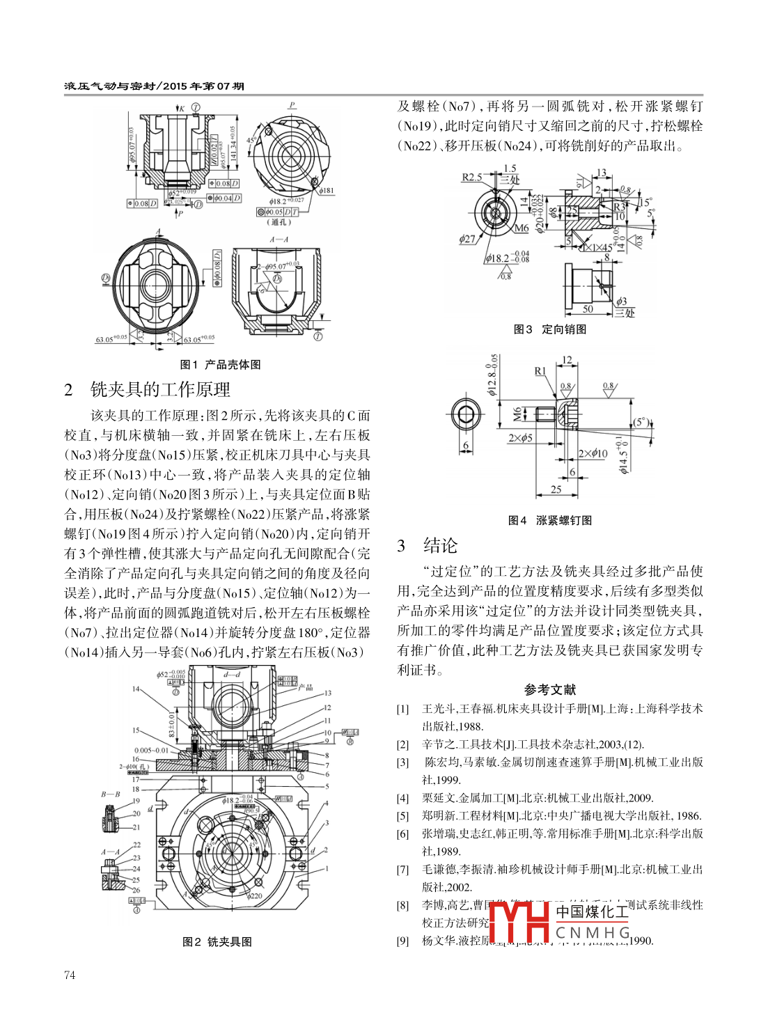 Hydraulics Pneumatics Seals/No 07. 2015do:10.3969ssn.1008-0813201507.024“過定位”方式的應(yīng)用鄧外梅(中航力源液壓股份有限公司,貴州貴陽550018)摘要:由于產(chǎn)品中的兩個(gè)跑道位置度要求高、加上工藝定位基準(zhǔn)與設(shè)計(jì)基準(zhǔn)不重合,造成累積誤差大,無論采用哪一種加工方法均無法保證設(shè)計(jì)技術(shù)要求。設(shè)想用一種“過定位”的工藝方法,來消除產(chǎn)品定向時(shí)的徑向及角向間隙所產(chǎn)生的誤差,從理論上分析并計(jì)算了定位及定向誤差,設(shè)計(jì)并制造了銑跑道夾具,通過該銑夾具的使用,保證了產(chǎn)品殼體內(nèi)兩圓弧跑道的尺寸及位置度要求;此種工藝方法具有推廣價(jià)值關(guān)鍵詞:圓弧跑道;銑夾具;過定位;定向銷;漲緊螺釘中圖分類號(hào):TH137文獻(xiàn)標(biāo)志碼:A文章編號(hào):1008-0813(2015)07-0073-0The Application of"Over-positioningDENG Wai-mei(AVIC Liyuan Hydraulic, Co, Ltd, Guiyang 550018, China)Abstract: As two tracks positioning degree of the product is demanding, combined with non-coincidence for the process positioning baseand design datum, which lead to obvious cumulative error, the design technical requirements are unable to be guaranteed no matter adoptingwhat kind of processing methods. Imagining an"over-positioning process to eliminate the errors arising from the radial direction and angular direction clearance during product positioning, analyze and calculate theoretically the position and orientation error, design and manufac-ture the milling track fixture, ensure the size and positioning degree requirements for two circular track inside of product shell through these of milling fixture: This process method has promotion valueKey words: circular track; milling fixture; over-positioning; directional pin; tight screw0引1工藝方法及銑夾具圖1所示產(chǎn)品,系通軸液壓泵中的殼體件,需在普為了保證該產(chǎn)品兩圓弧跑道的位置度要求,在工通銑床上精銑2-d95.07的圓弧跑道,兩圓弧跑道與藝方法上用一種“過定位”的方式來定向產(chǎn)品,將正常軸瓦是一對(duì)摩擦副,它的尺寸及位置度直接影響著液的定位方式是中心軸和菱形銷定向,現(xiàn)改為圓柱銷定體泵的性能及壽命;圖1中要求,兩圓弧中心連線對(duì)基向,這必然導(dǎo)致產(chǎn)品孔無法裝入圓柱銷上,為了解決該準(zhǔn)中心的同軸度允差0.08,兩圓弧對(duì)稱基準(zhǔn)中心允差問題,將圓柱銷設(shè)計(jì)成彈性的、其尺寸公差加大,待產(chǎn)0.08,設(shè)計(jì)基準(zhǔn)中心為b73.025的臺(tái)階孔,從工藝性品同時(shí)裝入定位軸和定向銷后,再用漲緊螺釘將定向考慮,定位基準(zhǔn)中心孔為65200,定位面為T面,定向銷漲大至與產(chǎn)品定向孔無間隙配合,待產(chǎn)品加工完后孔為山18.2-;工藝基準(zhǔn)孔與設(shè)計(jì)基準(zhǔn)孔存在著同軸度將漲緊螺釘擰松,定向銷縮小至安裝產(chǎn)品之前的尺寸,誤差d0.04,定向孔與兩圓弧跑道中心連線夾角為45°、即可將產(chǎn)品取出,為此,設(shè)計(jì)并制造了專用工裝—銑分度圓直徑為d181、該定向孔的位置度誤差為d0.05,夾具,如圖2所示,該銑夾具主要由底座(No1)、分度盤對(duì)該產(chǎn)品而言,兩圓弧跑道軸心連線對(duì)設(shè)計(jì)基準(zhǔn)中心(No15)、定位墊圈(Nol0)、定位軸(No12)、定向銷線的同軸度誤差為6008-004=d004,對(duì)稱度誤差為(N020)、漲緊螺釘(No19)定位器(N014)、導(dǎo)套(No6)0.08-0.04=0.04,還存在著定向孔的位置度d0.05,對(duì)于壓板(No24)、校正環(huán)(No13)、左右壓板(No3)及螺栓銑加工精度是非常之高,無論采用何種工藝方法均無(No7)組成法保證該產(chǎn)品的位置度要求。從理論上分析該夾具的定位軸(No12)與產(chǎn)品中心定位孔的最大間隙誤差為0.019-(-60.01)=0.029定位軸的最大旋轉(zhuǎn)間隙d0.01,即d0.029+d0.01為d0.039<產(chǎn)品的同軸度誤差d0.04.夾具定向銷(No20)的「稿日期:201504-24位置度誤差為d中國煤化工0015之和作者簡介:鄧外梅(1962-),女,江西宜春人,高級(jí)工程師大學(xué),主要從為60.03<產(chǎn)品的CNMH具的結(jié)構(gòu)及事工裝設(shè)計(jì)及工裝工藝。制造精度能滿足產(chǎn)品的加工精度要求液壓氣動(dòng)與密封/2015年第07期及螺栓(No7),再將另一圓弧銑對(duì),松開漲緊螺釘(No19),此時(shí)定向銷尺寸又縮回之前的尺寸,擰松螺栓(No22)、移開壓板(No24),可將銑削好的產(chǎn)品取出R25.0.osD990.04Do00sDU(通孔)82350三處圖3定向銷圖圖1產(chǎn)品殼體圖2銑夾具的工作原理該夾具的工作原理:圖2所示,先將該夾具的C面校直,與機(jī)床橫軸一致,并固緊在銑床上,左右壓板(No3)將分度盤(No15)壓緊,校正機(jī)床刀具中心與夾具校正環(huán)(No13)中心一致,將產(chǎn)品裝入夾具的定位軸(No12)、定向銷(No20圖3所示)上,與夾具定位面B貼合,用壓板(No24)及擰緊螺栓(No22)壓緊產(chǎn)品,將漲緊圖4漲緊螺釘圖螺釘(No19圖4所示)擰入定向銷(No20)內(nèi),定向銷開有3個(gè)彈性槽使其漲大與產(chǎn)品定向孔無間隙配合(完3結(jié)論全消除了產(chǎn)品定向孔與夾具定向銷之間的角度及徑向“過定位”的工藝方法及銑夾具經(jīng)過多批產(chǎn)品使誤差),此時(shí),產(chǎn)品與分度盤(No15)定位軸(No12)為用,完全達(dá)到產(chǎn)品的位置度精度要求,后續(xù)有多型類似體,將產(chǎn)品前面的圓弧跑道銑對(duì)后,松開左右壓板螺栓產(chǎn)品亦采用該“過定位”的方法并設(shè)計(jì)同類型銑夾具,(Na7)、拉出定位器(No14)并旋