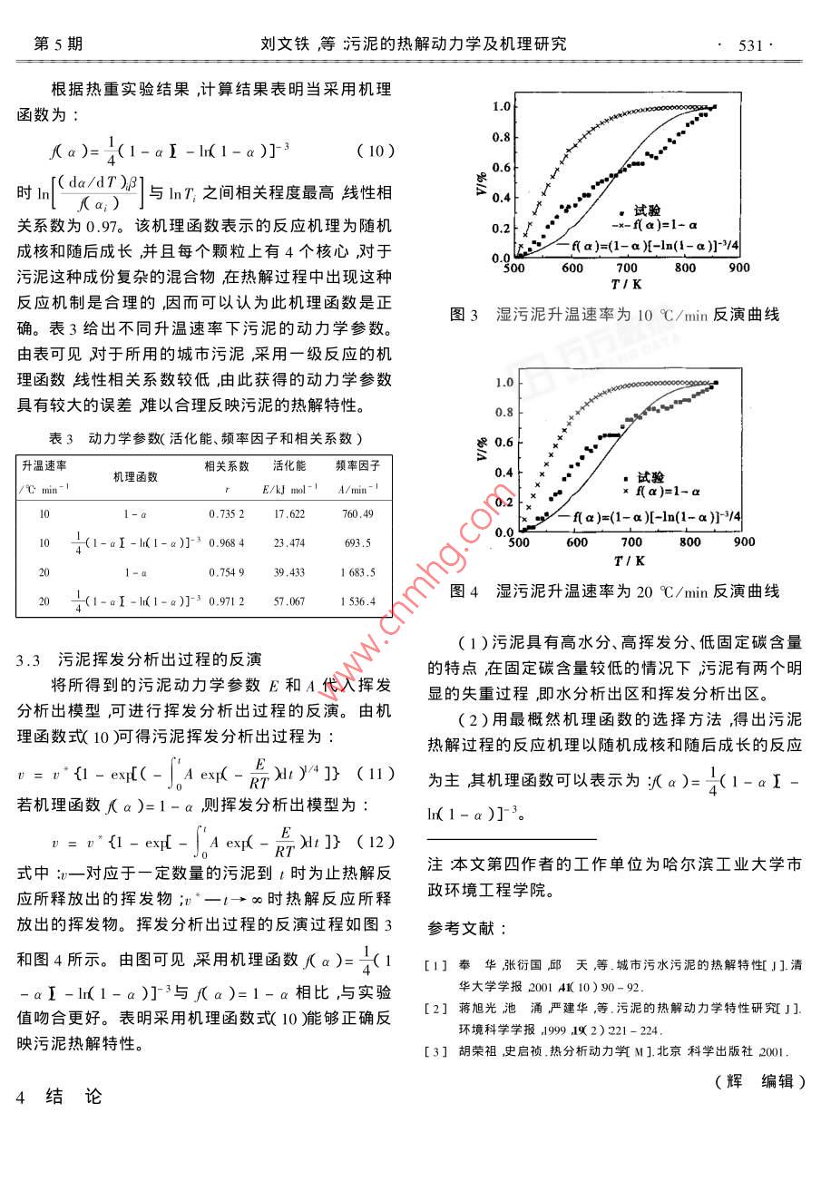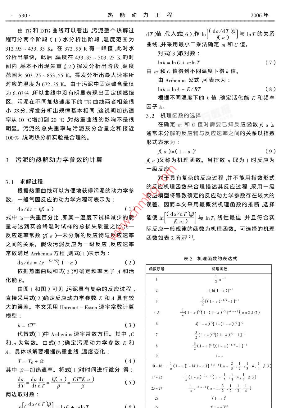 第21卷第5期熱能程ol. 21 No. 52006年9月JOURNAL OF ENGINEERING FOR THERMAL ENERGY AND POWERSep.,2006文章編號(hào)1001-2060(200605-0529-03污泥的熱解動(dòng)力學(xué)及機(jī)理研究劉文鐵王淑彥陸慧林崔崇威〔哈爾濱工業(yè)大學(xué)能源科學(xué)與工程學(xué)院黑龍江哈爾濱150000摘要利用綜合熱分析儀對(duì)污水處理廠原始污泥進(jìn)行了熱因此與煤燃燒不同的是在污泥的燃燒過(guò)程中其分析實(shí)驗(yàn)獲得了不同升溫速率下污泥的TG和DrG曲線。高水分和高揮發(fā)分將對(duì)燃燒起主要作用而固定碳實(shí)驗(yàn)結(jié)果表明采用一級(jí)反應(yīng)模型預(yù)測(cè)污泥熱解特性具有一的影響較小。定的局限性。利用熱分析動(dòng)力學(xué)采用最概然機(jī)理函數(shù)選擇法提出了污泥熱解的機(jī)理函數(shù)為∫a)=(1-aI-l(1表1污泥的工業(yè)分析干燥基)α)]34分析獲得的污泥活化能E和指前因子A并給出了揮發(fā)分固定碳灰分結(jié)合水發(fā)熱量污泥熱解動(dòng)力學(xué)計(jì)算模型。AJ/% M,/% Q,/MJ kg40.8110.23關(guān)鍵詞污泥熱解機(jī)理函數(shù)中圖分類號(hào):TK121文獻(xiàn)標(biāo)識(shí)碼:A2.2污泥的熱分析前言采用ZRY-2P型熱分析儀進(jìn)行熱重法(TG)和微商熱重法(DTG)分析試驗(yàn)采用10℃/min及20污泥的熱分解過(guò)程是污泥在氣化和燃燒過(guò)程中℃mn不同的加熱速率。典型的熱重曲線分別見(jiàn)的初始階段對(duì)污泥穩(wěn)定著火和燃燒過(guò)程有著重大圖1和圖2的影響。因此深入研究污泥的熱分解將增進(jìn)對(duì)污泥的各種轉(zhuǎn)換過(guò)程的理解對(duì)完善污泥的氣化和燃0燒過(guò)程的控制和設(shè)計(jì)有著一定的現(xiàn)實(shí)意義。DTG由于污泥的熱解過(guò)程非常復(fù)雜整個(gè)熱解過(guò)程2既有化學(xué)變化也包括各種物理現(xiàn)象和岀現(xiàn)許多物理化學(xué)過(guò)程的改變。盡管人們對(duì)污泥熱解做了大量的研究工作但是在熱解反應(yīng)機(jī)理方面仍然存在著許多模糊不清之處。已有對(duì)污泥熱解動(dòng)力學(xué)參數(shù)研008001000究時(shí)假設(shè)反應(yīng)過(guò)程為一級(jí)反應(yīng)研究污泥的熱解特T/K性-2。然而污泥是一種非均質(zhì)的復(fù)雜有機(jī)物物質(zhì)圖1污泥熱重分析曲線(10℃/min)的組合體其熱解特性是許多相互竟?fàn)幓蚱叫蟹磻?yīng)的綜合反映污泥的熱解過(guò)程及其化學(xué)動(dòng)力學(xué)參數(shù)必然與許多因素有關(guān)。所以,尋找這些影響因素與熱解動(dòng)力學(xué)之間的關(guān)系就顯得特別重要。DTG402污泥熱解特性的實(shí)驗(yàn)研究2.1污泥的靜態(tài)特性實(shí)驗(yàn)所用試樣取自大慶城市污水處理廠。污泥6008001000的工業(yè)分析結(jié)果表明水分含量為82.10%,其干燥基工業(yè)分析數(shù)據(jù)如表1所示。由表可見(jiàn)污泥具有圖2污泥熱重分析曲線(20℃/min)高水分,干基揮發(fā)分較高而固定碳含量較低的特點(diǎn)。收稿日期2003-12-29;修訂日期2006530·熱能動(dòng)力工程2006年由TG和DrG曲線可以看出,污泥整個(gè)熱解過(guò)程可分兩個(gè)階段〔1)水分析出階段,溫度范圍為dT雁值代入式(6)作ln(dodT21與mT的關(guān)系312.954335K。在372.95K有一峰值,此時(shí)水曲線并采用最小二乘法確定m和C值。分析出最快。此后溫度在433.35~503.25K的時(shí)對(duì)式(3取對(duì)數(shù)間內(nèi)基本不出現(xiàn)失重〔2)揮發(fā)分析出階段,溫度Ink= InC+ mIn T(7)范圍為503,25~853.55K。揮發(fā)分析出最大速率所田m和C值得到不同溫度下得k值。對(duì)應(yīng)的溫度為672.35K。由于污泥中固定碳含量?jī)H由 Arrhenius公式可表示為為6.03%所以曲線中沒(méi)有明顯表現(xiàn)出固定碳燃燒Ink=InA-E/RT區(qū)。污泥在不同加熱速度下的TG曲線兩者相差很根據(jù)不同溫度下的k值確定活化能E和頻率小水分、揮發(fā)分析出規(guī)律基本相同這說(shuō)明加熱速因子A。率從10℃增加到20℃,對(duì)熱重曲線的影響不是很3.2機(jī)理函數(shù)的選擇明顯。污泥的總失重率與污泥灰分含量之和接近在確定m和C值時(shí)需要已知反應(yīng)函數(shù)f(ab100%說(shuō)明熱分析實(shí)驗(yàn)是合理的。通常未分解的反應(yīng)物與反應(yīng)速率之間的關(guān)系以指數(shù)形式表示為f a)=(l-a y3污泥的熱解動(dòng)力學(xué)參數(shù)的計(jì)算a)又稱為機(jī)理函數(shù)。當(dāng)指數(shù)n取為1時(shí)反應(yīng)為級(jí)反應(yīng)3.1求解過(guò)程對(duì)于具有復(fù)雜的反應(yīng)過(guò)程并不能用指數(shù)形式根據(jù)熱重曲線可以方便地獲得污泥的動(dòng)力學(xué)參的反應(yīng)機(jī)理函數(shù)來(lái)合理描述其反應(yīng)過(guò)程采用一級(jí)數(shù)。一般氣固反應(yīng)的動(dòng)力學(xué)方程可表示為反應(yīng)模型將導(dǎo)致確定的反應(yīng)動(dòng)力學(xué)參數(shù)存在較大的da/dt=kf a)(1)誤差。因而本文采用最概然機(jī)理函數(shù)的推斷選擇式中一失重百分比即某一溫度下試樣減少的質(zhì)能使(①)]與x線性最佳并且符合實(shí)量與達(dá)到實(shí)驗(yàn)終溫時(shí)試樣的總損失質(zhì)量之比;一際反應(yīng)一般規(guī)律的函數(shù)為機(jī)理函數(shù)??蛇x擇的機(jī)理反應(yīng)速率常數(shù)a)末分解的反應(yīng)物與反應(yīng)速率函數(shù)如表2所示2之間的關(guān)系。假設(shè)污泥反應(yīng)為一級(