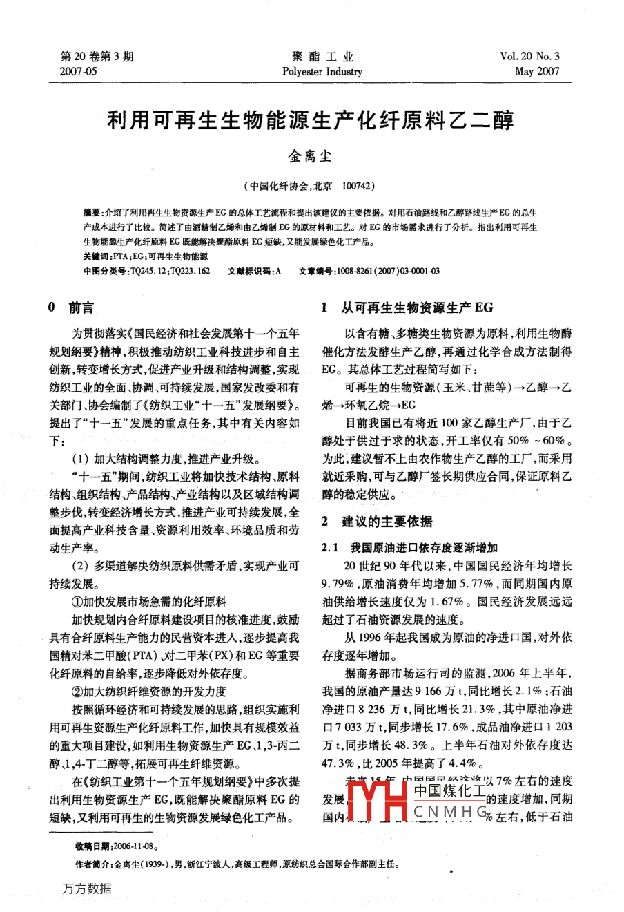 第20卷第3期聚酯工業(yè)Vol 20 No. 3200705Polyester IndustryMay 2007利用可再生生物能源生產(chǎn)化纖原料乙二醇金離塵(中國化纖協(xié)會,北京100742)摘要:介紹了利用再生生物資源生產(chǎn)EC的總體工藝流程和提出該建議的主要依據(jù)。對用石油路線和乙醇路線生產(chǎn)EG的總生產(chǎn)成本進(jìn)行了比較。簡述了由酒精制乙烯和由乙烯制EG的原材料和工藝。對EG的市場需求進(jìn)行了分析。指出利用可再生生物能源生產(chǎn)化纖原料EG既能解決聚酯原料EG短缺,又能發(fā)展綠色化工產(chǎn)品關(guān)鍵詞FTA;EG;可再生生物能源中圖分類號:TQ245,12;TQ223.162文獻(xiàn)標(biāo)識碼:A文章編號:10088261(2007)0300014030前言1從可再生生物資源生產(chǎn)EG為貫徹落實《國民經(jīng)濟和社會發(fā)展第十一個五年以含有糖、多糖類生物資源為原料,利用生物酶規(guī)劃綱要》精神,積極推動紡織工業(yè)科技進(jìn)步和自主催化方法發(fā)酵生產(chǎn)乙醇,再通過化學(xué)合成方法制得創(chuàng)新轉(zhuǎn)變增長方式,促進(jìn)產(chǎn)業(yè)升級和結(jié)構(gòu)調(diào)整,實現(xiàn)EG。其總體工藝過程簡寫如下紡織工業(yè)的全面協(xié)調(diào)、可持續(xù)發(fā)展,國家發(fā)改委和有可再生的生物資源(玉米、甘蔗等)→乙醇→乙關(guān)部門、協(xié)會編制了《紡織工業(yè)“十一五”發(fā)展綱要》。烯→環(huán)氧乙烷→EG提出了“十一五”發(fā)展的重點任務(wù),其中有關(guān)內(nèi)容如目前我國已有將近100家乙醇生產(chǎn)廠,由于乙下醇處于供過于求的狀態(tài),開工率僅有50%-60%。(1)加大結(jié)構(gòu)調(diào)整力度推進(jìn)產(chǎn)業(yè)升級。為此,建議暫不上由農(nóng)作物生產(chǎn)乙醇的工廠,而采用“十一五”期間,紡織工業(yè)將加快技術(shù)結(jié)構(gòu)原料就近采購,可與乙醇廠簽長期供應(yīng)合同,保證原料乙結(jié)構(gòu)、組織結(jié)構(gòu)、產(chǎn)品結(jié)構(gòu)、產(chǎn)業(yè)結(jié)構(gòu)以及區(qū)域結(jié)構(gòu)調(diào)醇的穩(wěn)定供應(yīng)。整步伐轉(zhuǎn)變經(jīng)濟增長方式推進(jìn)產(chǎn)業(yè)可持續(xù)發(fā)展,全面提高產(chǎn)業(yè)科技含量、資源利用效率、環(huán)境品質(zhì)和勞建議的主要依據(jù)動生產(chǎn)率。2.1我國原油進(jìn)口依存度逐漸增加(2)多渠道解決紡織原料供需矛盾,實現(xiàn)產(chǎn)業(yè)可20世紀(jì)90年代以來,中國國民經(jīng)濟年均增長持續(xù)發(fā)展。979%,原油消費年均增加5.77%,而同期國內(nèi)原①加快發(fā)展市場急需的化纖原料油供給增長速度僅為1.67%。國民經(jīng)濟發(fā)展遠(yuǎn)遠(yuǎn)加快規(guī)劃內(nèi)合纖原料建設(shè)項目的核準(zhǔn)進(jìn)度鼓勵超過了石油資源發(fā)展的速度。具有合纖原料生產(chǎn)能力的民營資本進(jìn)入,逐步提高我從1996年起我國成為原油的凈進(jìn)口國,對外依國精對苯二甲酸(PTA)對二甲苯(PX)和EG等重要存度逐年增加?;w原料的自給率,逐步降低對外依存度。據(jù)商務(wù)部市場運行司的監(jiān)測,2006年上半年,②加大紡織纖維資源的開發(fā)力度我國的原油產(chǎn)量達(dá)9166萬t,同比增長2.1%;石油按照循環(huán)經(jīng)濟和可持續(xù)發(fā)展的思路組織實施利凈進(jìn)口8236萬t,同比增長21.3%,其中原油凈進(jìn)用可再生資源生產(chǎn)化纖原料工作加快具有規(guī)模效益口7033萬t,同步增長17.6%,成品油凈進(jìn)口1203的重大項目建設(shè),如利用生物資源生產(chǎn)EG、1,3丙二萬t,同步增長48.3%。上半年石油對外依存度達(dá)醇、1,4-丁二醇等拓展可再生纖維資源。47.3%,比2005年提高了4.4%。在《紡織工業(yè)第十一個五年規(guī)劃綱要》中多次提同同日好*以7%左右的速度出利用生物資源生產(chǎn)EG,既能解決聚酯原料EG的發(fā)展,中國煤化的速度增加,同期短缺,又利用可再生的生物資源發(fā)展綠色化工產(chǎn)品。國內(nèi)CNMHG%左右低于石油收稿日期:2006-1108。作者簡介:金離塵(1939-),男浙江寧波人,高級工程師,原紡織總會國際合作部副主任。聚酯工業(yè)第20卷需求增長速度,國內(nèi)石油供需缺口逐年加大表12種生產(chǎn)路線成本比較國際能源署(EA)在對我國的能源狀況進(jìn)行深Tae1 Cost comparison of two kinds of production route入研究后預(yù)測,我國2000~2030年石油需求的年均乙烯增長率為3%,原油進(jìn)口依存度將達(dá)到82%。乙烯價格/82.2石油化工裝置產(chǎn)能不斷增加烯消耗/8公用工程及所有其它成本/多(1)石油化工產(chǎn)業(yè)為了滿足快速增長的市場需副產(chǎn)品和碳排放交易/多利息和折舊/8981求,加快了發(fā)展速度,產(chǎn)品產(chǎn)量迅速增長。EG的成本/(多t-1)(2)原油一次加工能力,乙烯、合成樹脂、合成EG的銷售價格s已8001200纖維、合成橡膠的生產(chǎn)能力都已位居世界前列。副產(chǎn)品DEG/TEG的價格和EG一樣8008/,實際上國內(nèi)EC價格已達(dá)10008/t)(3)化工用油(尤其石腦油)短缺的矛盾逐步顯現(xiàn)。預(yù)計未來國內(nèi)化工用油年缺口量將達(dá)800萬t石化路線與乙醇路線生產(chǎn)EG的成本差為以上。1658/t,不難從表1比較得出結(jié)論,采用綠色化工2005年我國原油產(chǎn)量已達(dá)到1.82億t,但仍進(jìn)生產(chǎn)路線生產(chǎn)EG不僅符合我國的十一五”加快實口原油1.26億t另外還進(jìn)口成品油3143萬t,石施石油替代戰(zhàn)略,
