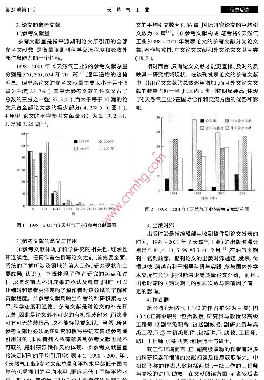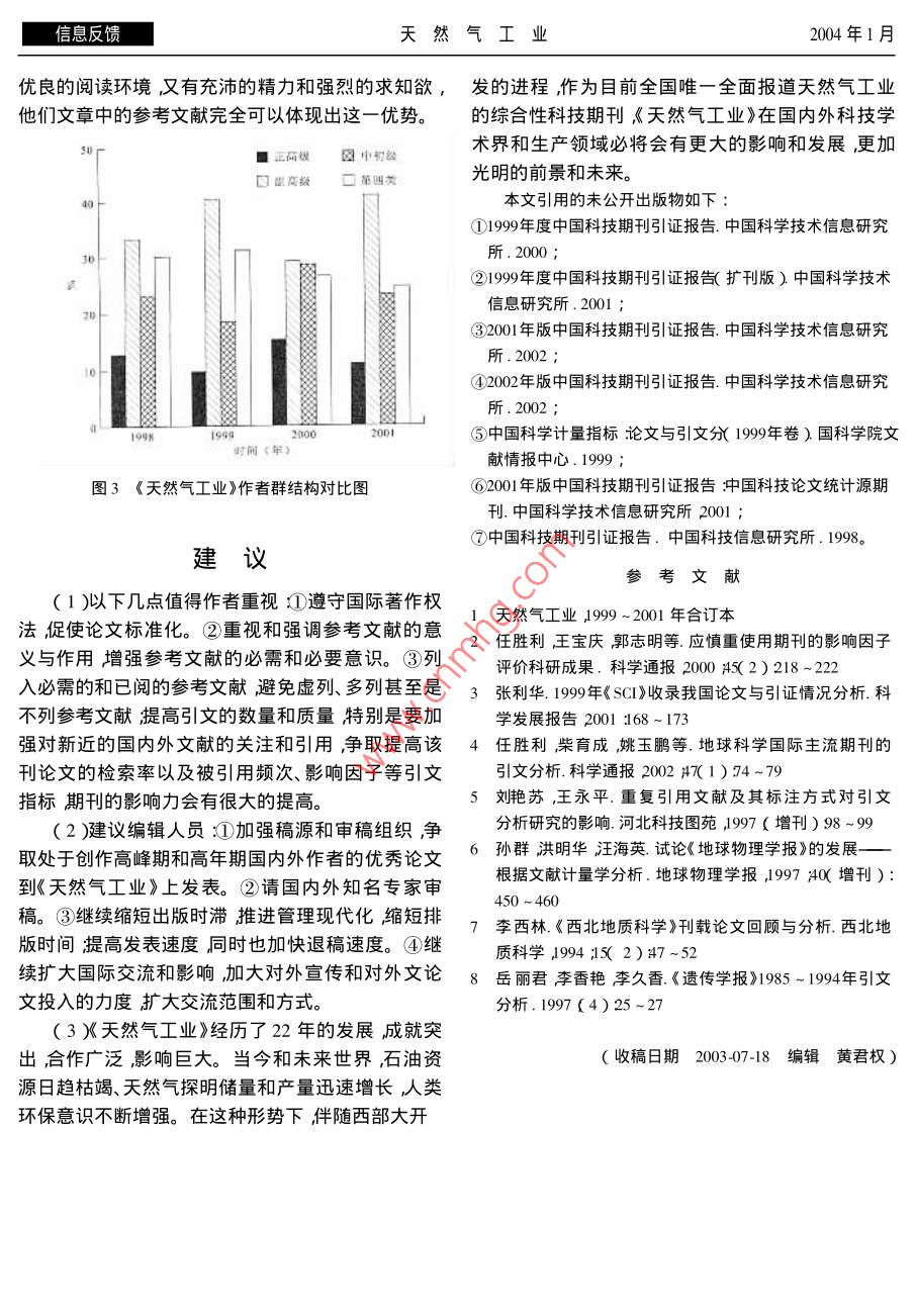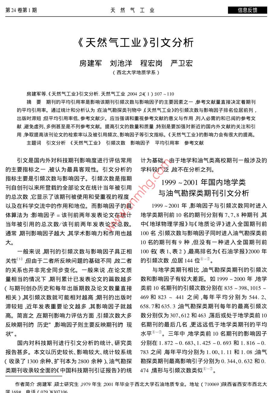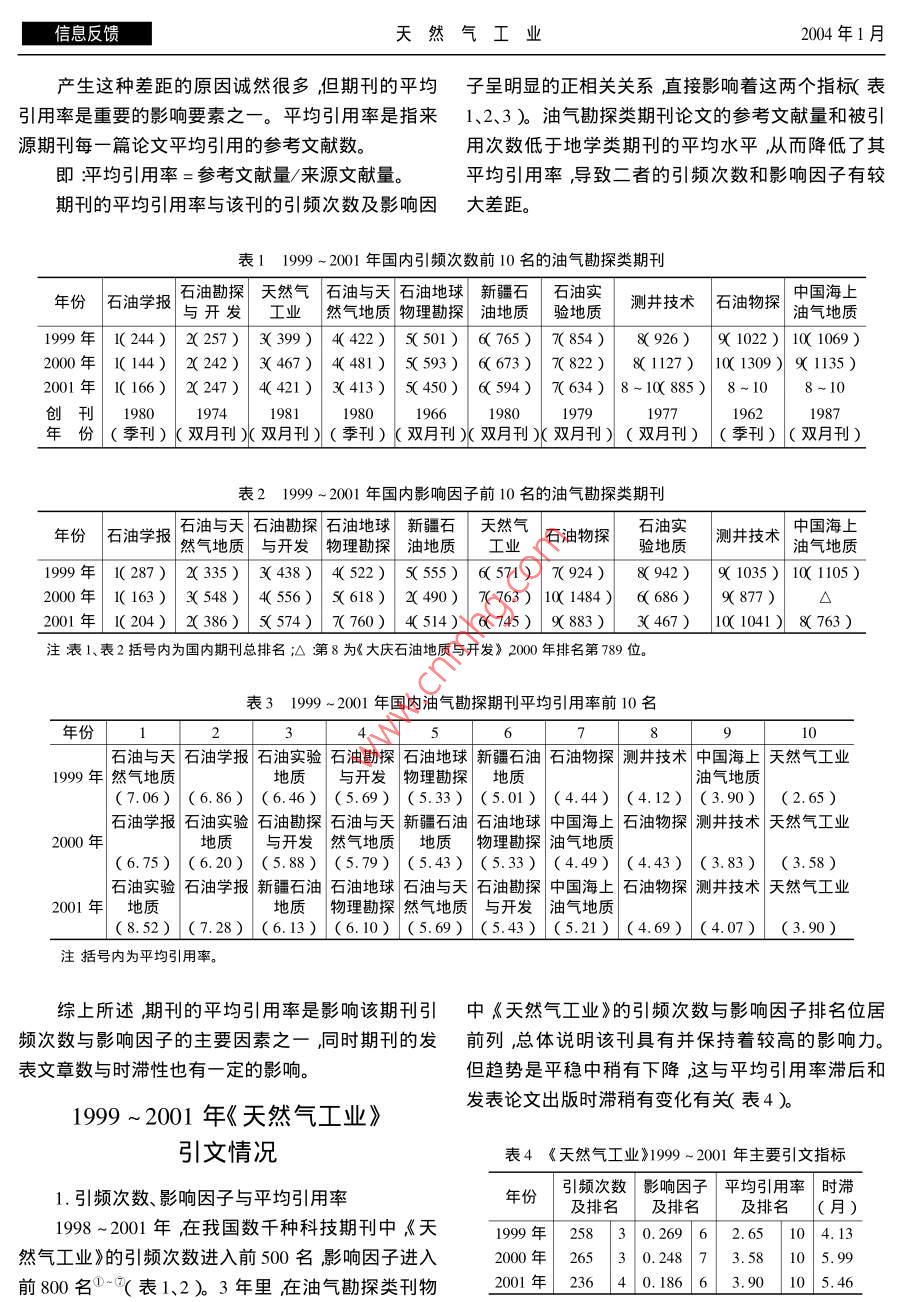 第24卷第1期天然氣工業(yè)信息反饋《天然氣工業(yè)》引文分析房建軍劉池洋程宏崗嚴(yán)衛(wèi)宏(西北大學(xué)地質(zhì)學(xué)系)房建軍等.《天然氣工業(yè)》引文分析.天然氣工業(yè)2004 24( 1 ):107-110摘要期刊的平均引用率是影響該期刊引頻次數(shù)與影響因子的主要因素之一參考文獻(xiàn)量直接決定著期刊的平均引用率。通過(guò)統(tǒng)計(jì)和分析認(rèn)為在油氣勘探類刊物中《天然氣工業(yè)》的引頻次數(shù)與影響因子排名位居前列,出版時(shí)滯短;但平均引用率低、參考文獻(xiàn)少。應(yīng)當(dāng)強(qiáng)調(diào)和重視參考文獻(xiàn)的意義與作用列入必需的和已閱的參考文獻(xiàn)避免虛列、多例甚至是不列參考文獻(xiàn)。提高引文的數(shù)量和質(zhì)量特別是要加強(qiáng)對(duì)新近的國(guó)內(nèi)外文獻(xiàn)的關(guān)注和引用爭(zhēng)取提高該刊論文的檢索率以及被引用頻次、影響因子等引文指標(biāo)?!短烊粴夤I(yè)》的影響力會(huì)有很大的提高。主題詞引文分析 《天然氣工業(yè)》 引頻次數(shù)影響因子平均引用率參考文獻(xiàn)引文是國(guó)內(nèi)外對(duì)科技期刊影響度進(jìn)行評(píng)估常用計(jì)為基礎(chǔ)。由于地學(xué)和油氣類高校期刊一般涉及的的主要指標(biāo)之一被認(rèn)為最具客觀性。引文分析的學(xué)科較廣泛故不在分析之列。指標(biāo)主要是引頻次數(shù)與影響因子。引頻次數(shù)是指期1999 ~ 2001年國(guó)內(nèi)地學(xué)類刊自創(chuàng)刊以來(lái)所登載的全部論文在統(tǒng)計(jì)當(dāng)年被引用的總次數(shù),它顯示了該期刊被使用和受重視的程度,與油氣勘探類期刊引文分析以及在科學(xué)交流中的作用和地位。而影響因子的具1999 ~ 2001年,影響因子與引頻次數(shù)同時(shí)進(jìn)入體算法為:影響因子=該刊前兩年發(fā)表論文在統(tǒng)計(jì)地學(xué)類 期刊前10名的期刊分別有7、7.8種期刊其當(dāng)年被引用的總次數(shù)/該刊前兩年發(fā)表論文總數(shù)。.中《地球物理學(xué)報(bào)》與《地質(zhì)論評(píng)》進(jìn)入全國(guó)期刊前通常期刊影響因子越大其學(xué)術(shù)影響力和作用也越100 名引頻次數(shù)與影響因子同時(shí)進(jìn)入油氣勘探類前大。10名的期刊有9種,但沒(méi)有一種進(jìn)入全國(guó)期刊前一般來(lái)說(shuō)期刊的引頻次數(shù)與影響因子具正相100名( 表1、表2 ) ,最高排名為《石油學(xué)報(bào)》2000年關(guān)性'3)但由于二者所反映問(wèn)題的基礎(chǔ)不同故二者的引頻次數(shù) 位居144位° :。.的關(guān)系也并非完全同步變化。一般來(lái)說(shuō) ,在論文質(zhì)與地學(xué)類期刊相比,油氣勘探類期刊的引頻次量相當(dāng)?shù)那闆r下期刊累計(jì)已發(fā)表論文的篇數(shù)越多數(shù)和影響因子 有較大差距。如1999 ~2000年地學(xué)(與期刊創(chuàng)辦歷史和每年出版期數(shù)及論文數(shù)量直接類 前10名期刊的引頻次數(shù)分別在835 ~ 398、1015 ~相關(guān))其引頻次數(shù)就可能相對(duì)越高;期刊的出版時(shí)469和823~441之間,每年平均分別為544.2、滯較短,近年發(fā)表重要論文越多,其影響因子就越658.7和635.3油氣勘探類期刊每年的最高引頻次高。簡(jiǎn)言之在期刊影響力評(píng)估方面引頻次數(shù)大多數(shù)分別僅為 307、612和463落后或處于地學(xué)類前10反映期刊的歷史”影響因子則主要反映期刊的現(xiàn)名期刊的最后幾名,更遠(yuǎn)遠(yuǎn)低于地學(xué)類期刊的平均狀”。水平0一。三年中地學(xué)類前10名期刊的影響因子國(guó)內(nèi)對(duì)科技期刊進(jìn)行引文分析的統(tǒng)計(jì)、研究類分別在1. 872 ~0. 683、1. 425 ~0.693和1.816 ~0. .報(bào)告甚多。本文以歷史較長(zhǎng)、影響較大、統(tǒng)計(jì)較系統(tǒng)783之間每年平均分別為1.00、1.11和1.08油氣(收錄了1300余種、擴(kuò)刊本為2800余種)油氣勘探勘探類期刊最高影響引子分別為0.344、0.632和0.類期刊收錄較全面的《中國(guó)科技期刊引證報(bào)告》的統(tǒng)474情形與引頻次數(shù)類似①-⑦。作者簡(jiǎn)介:房建軍碩士研究生,1979 年生2001 年畢業(yè)于西北大學(xué)石油地質(zhì)專業(yè)。地址( 710069 )陜西省西安市西北大學(xué)160#1由話( 009 8307 106信息反饋天然氣工業(yè)2004年1月產(chǎn)生這種差距的原因誠(chéng)然很多,但期刊的平均子呈明顯的正相關(guān)關(guān)系,直接影響著這兩個(gè)指標(biāo)(表引用率是重要的影響要素之一。平均引用率是指來(lái)1、2、3 )。油氣勘探類期刊論文的參考文獻(xiàn)量和被引源期刊每一篇論文平均引用的參考文獻(xiàn)數(shù)。用次數(shù)低于地學(xué)類期刊的平均水平,從而降低了其即:平均引用率=參考文獻(xiàn)量/來(lái)源文獻(xiàn)量。平均引用率,導(dǎo)致二者的引頻次數(shù)和影響因子有較期刊的平均引用率與該刊的引頻次數(shù)及影響因大差距。表1 1999 ~ 2001年國(guó)內(nèi)引頻次數(shù)前10名的油氣勘探類期刊石油勘探天然氣石油與天石油地球新疆石|石油實(shí)中國(guó)海上年份| 石油學(xué)報(bào)|與開(kāi)發(fā)工業(yè)然氣地質(zhì)|物理勘探油地質(zhì)驗(yàn)地質(zhì)測(cè)井技術(shù)石油物探油氣地質(zhì)1999年1(244)| 2(257)| 3( 399)| 4( 422)| 5( 501 )| 6( 765 )| 7( 854 )8( 926)9( 1022)| 10( 1069 )2000年1( 144)| 2( 242)