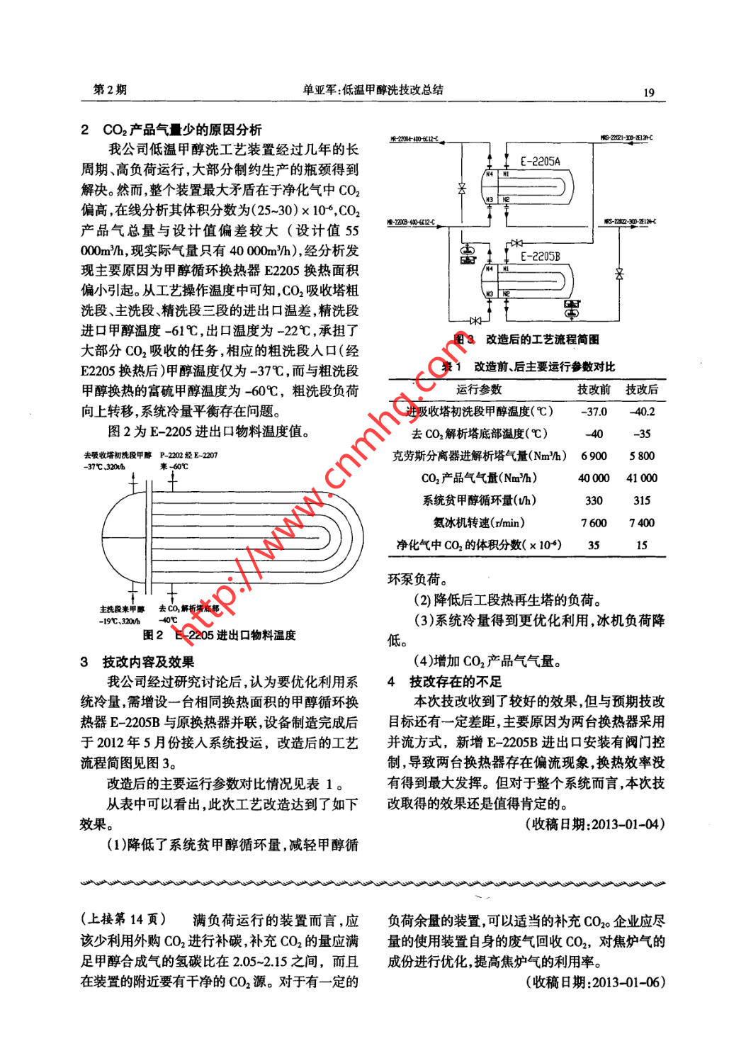 8氮肥技術2013年第34卷第2期低溫甲醇洗技改總結單亞軍(江蘇靈谷化工有限公司江蘇宜興214213)摘要簡要介紹了該公司在低溫甲醇洗裝置中新增一-臺 甲醇循環(huán)換熱器的技改情況,并對投運后取得的效果和存在的不足進行了總結。關鍵詞低溫甲醇洗技改總結Technical transformation summary in low temperaturemethanol washing deviceSHAN Ya- jun(Jiangu Linggu Chemical Company Limited, Yixing, 214213, Jiangsu Province)Abstract The paper briely introduces technical reformnation situation of a new added methanol circulation heat exchanger inlow temperature methanol washing device of our company. And it is summarized afer it is put into production that the efect we havegotten and the existing deficiencies.Keywords low temperature methanol washing device, technical transformation, summary我公司低溫甲醇洗工藝采用大連理工大學運行,至今已運行3年多時間,最長連續(xù)運行時開發(fā)的工藝包,由東華工程科技股份有限公司負間達到216d,為公司帶來較好的經濟效益。責設計。2009年5月開始水聯(lián)動試車,6月投入1低溫甲醇洗工藝流程(見圖 1)- 日歉牲氣去硫網收。二氧化碳產品氣C-20。l CT.18-212 |。凈化氣去甲續(xù)化國-2205IC-9脫鹽水2。換氣p 2015L幾202三P-2206NBV-2201]低壓蒸。低壓蒸汽T-低壓惠汽冷奉腋左點汽冷要標正話58-218E 2223p-K-2201廣TeP-2205AB管2210 -20P-2209AB.火炬v-203 .P-2203/3去C-22031 c 2201(吸收塔) 2 C- 2202(中壓閃蒸塔) 3 C-2203(汽提/CO,解析塔) 4 C-2204(熱再生塔)C-2205(甲醇/水分離塔)、6 C-2206(尾氣水洗塔) 7 V-2201(原料氣分離罐)、8 V-2202(克勞斯氣分離器) 9 V-2206(熱再生塔回流罐) 10 K-2201(循環(huán)氣壓編機) , 11 S-2201(貧20 E-2208(貧1富甲醇換熱器)21 E-2209(富CO,甲醇中間氨冷器) 22 E 2210(氮氣冷卻器) 23 E-2212(熱再生塔頂冷凝器)24 E-2213(克勞斯氣再加熱器) 25 E- 2214(克勞斯氣/尾氣換熱器) 26 E- -2215(熱再生塔再沸器) 27E -2216(甲醇!水分離塔再沸器)28 E 2218(循環(huán)氣壓編機后冷器) 29 E -2219(循環(huán)氣壓縮機中間換熱器) 30 E -220(無碗甲醇氨冷器) 31E- 222甲醇1水分離塔進料換熱器) 32 E-2223(洗海水換熱器) 33 E 2224 (尾氣加熱器)圍1低溫甲醇洗工藝流程簡圖第2期單亞軍:低溫甲醇洗技改總結l92 CO2產品氣少的原因分析我公司低溫甲醇洗工藝裝置經過幾年的長E-2205A周期高負荷運行,大部分制約生產的瓶頸得到解決。然而,整個裝置最大矛盾在于凈化氣中CO2偏高,在線分析其體積分數(shù)為(25~30) x 10*,CO2產品氣總量與設計值偏差較大(設計值55000m/h,現(xiàn)實際氣量只有40 000m/h) ,經分析發(fā)需] E-2205B現(xiàn)主要原因為甲醇循環(huán)換熱器E2205換熱面積偏小引起。從工藝操作溫度中可知,CO2吸收塔粗洗段、主洗段精洗段三段的進出口溫差,精洗段的J進口甲醇溫度-61C,出口溫度為-22C,承擔了圖3 改造后的工藝流程簡圖大部分CO2吸收的任務,相應的粗洗段入口(經E2205換熱后)甲醇溫度僅為-37C,而與粗洗段表1改造前、后主要運行參數(shù)對比甲醇換熱的富硫甲醇溫度為. -60, 粗洗段負荷運行參數(shù)技改前技改后向上轉移,系統(tǒng)冷量平衡存在問題。進吸收塔初洗段甲醇溫度(C)-37.0- 40.2圖2為E -2205進出口物料溫度值。去CO2解析塔底部溫度(9)-35去吸收塔初冼段甲醇P-2202 經E-2207克勞斯分離器進解析塔氣量(Nm2/h) 69005 800-37C.320b來-60%CO2產品氣氣量(Nm?h)40000 41 000系統(tǒng)貧甲醇循環(huán)量(th)330 .315氨冰機轉速(r/min)7600 7 400凈化氣中CO2的體積分數(shù)( x 10*)1:環(huán)泵負荷。(2)降低后工段熱再生塔的負荷。主洗段來甲醇去 CO,解析塔底部-19C.320/h(3)系統(tǒng)冷量得到更優(yōu)化利用,冰機負荷降圍2 E- 2205進出口物料溫度低。3技改內容及效果(4)增加CO2產品氣氣量。我公司經過研究討論后,認為要優(yōu)化利用系4技改存在的不足統(tǒng)冷量,需增設一臺相同換熱面積的甲醇循環(huán)換本次技改收到了較好的效果,但與預期技改熱器E 2205B與原換熱器并聯(lián),設備制造完成后目標還有一定差距,主要原因為兩臺換熱器采用于2012年5月份接人系統(tǒng)投運,改造后的工藝并流方式,新增E-2205B進出口安裝有閥門控流程簡圖見圖3。制,導致兩臺換熱器存在偏流現(xiàn)象,換熱效率沒改造后的主要運行參數(shù)對比情況見表1。有得到最大發(fā)揮。但對于整個系統(tǒng)而言,本次技從表中可以看出,此次工藝改造達到了如下改取得的效果還是值得肯定的。效果。(收稿日期:2013-01-04)(1)降低了系統(tǒng)貧甲醇循環(huán)量,減輕甲醇循(上接第14頁)滿負荷運行的裝置而言,應負荷余量的裝置,可以適當?shù)难a充CO2。企業(yè)應盡該少利用外購CO2進行補碳,補充CO2的量應滿量的使用裝置自身的廢氣回收CO2,對焦爐氣的足甲醇合成氣的氫碳比在2.05~2.15之間,而且成份進行優(yōu)化,提高焦爐氣的利用率。在裝置的附近要有干凈的CO2源。對于有一定的(收稿日期:2013-01-06)