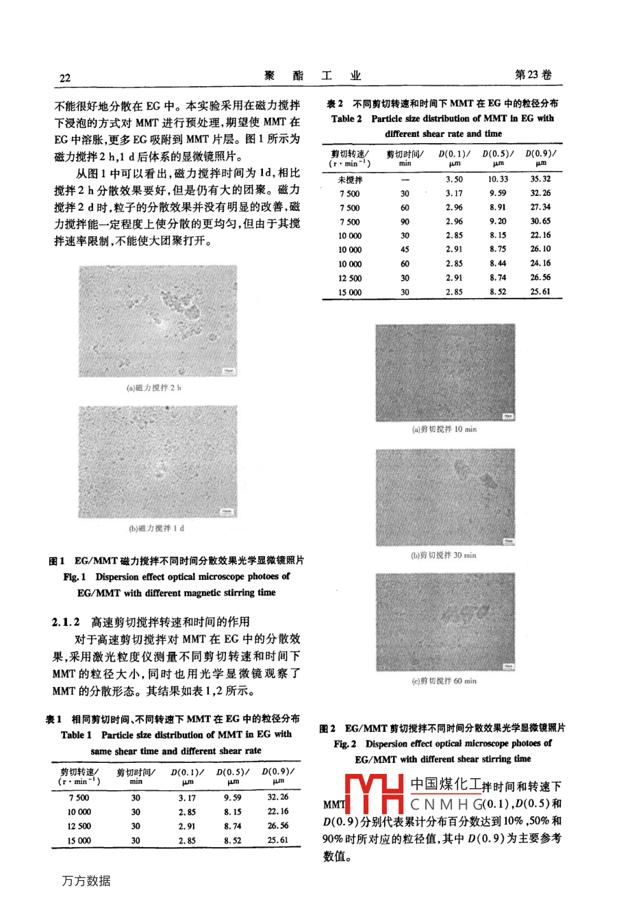 第23卷第1期聚酯工業(yè)Vol 23 No. 1201001yester IndustryJan.2010doi:10.3969/f.in.10088261.2010.01.006蒙脫土在乙二醇中的分散性研究史君,郝翔2,聶聰2,王小群(1北京化工大學(xué)理學(xué)院,北京100013;2.北京航空航天大學(xué)材料學(xué)院,北京100083)摘要:以乙二醇(EG)為分散介質(zhì)研究了不同分散及處理方法對蒙脫土(MMT)在乙二醇中分散性的影響用激光粒度儀和光學(xué)顯微鏡對分散效果進(jìn)行表征。結(jié)果表明采用高速剪切攪拌與超聲波分散結(jié)合的方法有助于形成蒙脫土粒徑相對小而分散均勻的EG/MMT分散體系。在此基礎(chǔ)上對EC/MMr分散體系進(jìn)行沉降分級可以有效除去難于分散的MMT大團(tuán)聚粒子。關(guān)鍵詞:袋脫土,乙二醇分散中圖分類號:TQ223.162文獻(xiàn)標(biāo)識碼:A文章編號:10088261(2010)014002105聚對苯二甲酸乙二醇酯(PET)具有剛性和強(qiáng)京東方康明科技開發(fā)有限公司。度大、抗蠕變和尺寸穩(wěn)定性好等優(yōu)點(diǎn),廣泛應(yīng)用于纖1.3實驗步驟維薄膜和包裝瓶等工程塑料領(lǐng)域12,采用納米蒙1.31MMT在EG中的分散脫土(MMT)改性的PET復(fù)合材料具有更好的耐熱室溫下將一定量的MMT和EC配制成質(zhì)量比阻隔和阻燃性能。然而納米MMT由于粒徑小、為1:15的混合液,采用磁力攪拌高速剪切以及超表面能大,具有自發(fā)團(tuán)聚的趨勢,而且其層間親聲波分散等方法分散一定時間待用。水極性大在極性較小的乙二醇中不易分散,團(tuán)聚1.3.2MMT的沉降分級體的存在將大大影響納米MMT在PET復(fù)合材料中室溫下將MMT在磁力攪拌條件下浸泡24h,高發(fā)揮作用。速剪切攪拌與超聲波協(xié)同作用4個周期(剪切分散本課題前期研究發(fā)現(xiàn)通過原位聚合法制備10mn,超聲波5min為1個周期)后靜置沉降不同PET/MMT復(fù)合材料,MMT在組分乙二醇(EG)中的時間待用分散好壞對MMT在 PET/MMT復(fù)合材料的分散以1.4表征及測試及該復(fù)合材料的性能有重要影響。因此,將MMT1.4.1激光粒度儀以較小粒徑均勻分散在EG中是至關(guān)重要的用 Mastersizer2000型激光粒度儀測量分散液中國內(nèi)研究者有將納米AT00,納米SO2(以及MMT的粒徑大小。將分散液稀釋到一定比例攪拌微細(xì)Cu粉體等用不同處理方法分散在乙二醇轉(zhuǎn)速為1700r/min中通過原位聚合法改性PET的研究,但關(guān)于MMT1.4.2光學(xué)顯微鏡在EG中的分散性研究鮮有報道。本文報告MMT將分散液取樣滴在載玻片上,用蓋玻片壓緊,用分散在EG中的研究,不同的分散及處理方法對 Motic Ba300型光學(xué)顯微鏡(放大倍數(shù)為400)觀察MMT在EG中分散效果的影響。MMT在EG中的分散形態(tài)。光學(xué)顯微鏡分辨率低1實驗部分能觀察到的顆粒大小有限并且取樣代表性較差但是對于分散性不很好的 EG/MMT體系,可以大致1.1實驗原料及試劑觀察MMT的分散形態(tài),并且是一種快速在線觀察鈉基MMT,工業(yè)級,浙江豐虹粘土化工有限公分散效果的方法,避免了分散液中溶劑揮發(fā)造成的司,陽離子交換容量為100mmo/100g;EC,工業(yè)表面張力影響級,中石油遼陽化纖分公司。12設(shè)備2結(jié)果及討論CL3型恒溫加熱磁力攪拌器,鞏義市予華儀器2.1不同分散方法對MMT在EG中分散效果作用有限責(zé)任公司;實驗室高剪切分散乳化機(jī)FSLI,上2.1.1中國煤化工海法孚萊機(jī)電科技發(fā)展有限公司;超聲波均化器,北由CNMHG相對較小MMT收稿日期:20091021作者簡介:史君(1967-),女,遼寧黑山人,高級工程師博士在讀從事石油化工領(lǐng)域研究工作。聚酯第23卷不能很好地分散在EG中。本實驗采用在磁力攪拌表2不同剪切轉(zhuǎn)速和時間下MMT在EG中的粒徑分布下浸泡的方式對MMT進(jìn)行預(yù)處理,期望使MMT在Ta2 Particle stze distribution of MMT in EG withEG中溶脹,更多EG吸附到MMT片層。圖1所示為different shear rate and time磁力攪拌2h,1d后體系的顯微鏡照片。剪切轉(zhuǎn)速/剪切時間′D(0.1)/D(0.5)/D(0.9)/(r.min")從圖1中可以看出,磁力攪拌時間為1d,相比未攪拌3.500.3335.32攪拌2h分散效果要好,但是仍有大的團(tuán)聚。磁力3.179.5932.26攪拌2d時,粒子的分散效果并沒有明顯的改善,磁2.968,9127.34力攪拌能一定程度上使分散的更均勻,但由于其攪30.65拌速率限制,不能使大團(tuán)聚打開1000022.161000050012500a磁力攪拌2h(b)磁力攪拌1d圖1EG/MMT磁力攪拌不同時間分散效果光學(xué)顯微鏡照片(b)剪切攪拌30minFig. 1 Dispersion effect optical microscope photoes ofEG/MMT with different magnetic stirring time2.1.2高速剪切攪拌轉(zhuǎn)速和時間的作用對于高速剪切攪拌對MMT在EG中的分散效果,采用激光粒度儀測量不同剪切轉(zhuǎn)速和時間下MMT的粒徑大小,同時也用光學(xué)顯微鏡觀察了()剪切攪拌60minMMT的分散形態(tài)。其結(jié)果如表1,2所示。表1相同剪切時間不同轉(zhuǎn)速下MMT在EG中的粒徑分布Table 1 Particle size distribution of MMT in EG with圖2EG/MMT剪切攪拌不同時間分散效果光學(xué)顯微鏡照片same shear time and different shear ratFig. 2 Dispersion effect optical microscope photoeEG/MMT with different shear stirring time剪切轉(zhuǎn)速/剪切時間/D(0.1)′D(0.5)/D(0.9)/V凵中國煤化工拌時聞和轉(zhuǎn)速下32.26MMT2.858.1522.16CNMHG(0.1),D(0.5)和301250026.56D(0.9)分別代表累計分布百分?jǐn)?shù)達(dá)到10%,0%和15002.8590%時所對應(yīng)的粒徑值,其中D(0.9)為主要參考數(shù)值第1期史君,等:蒙脫土在乙二醇中的分散性研究由剪切分散和未剪切的粒徑比較