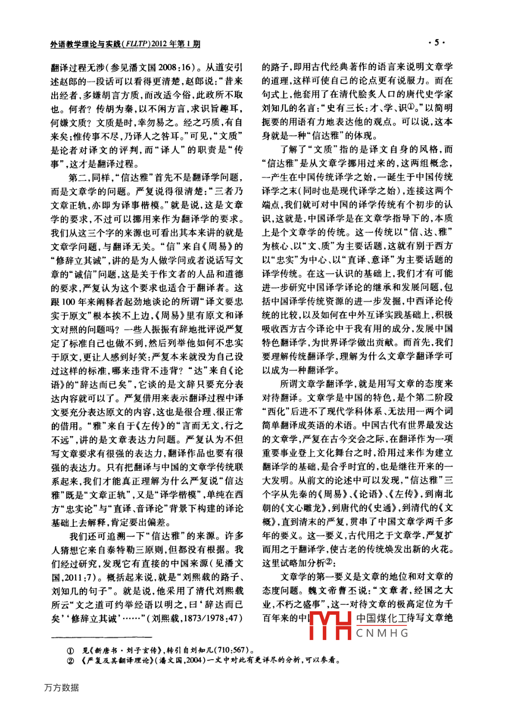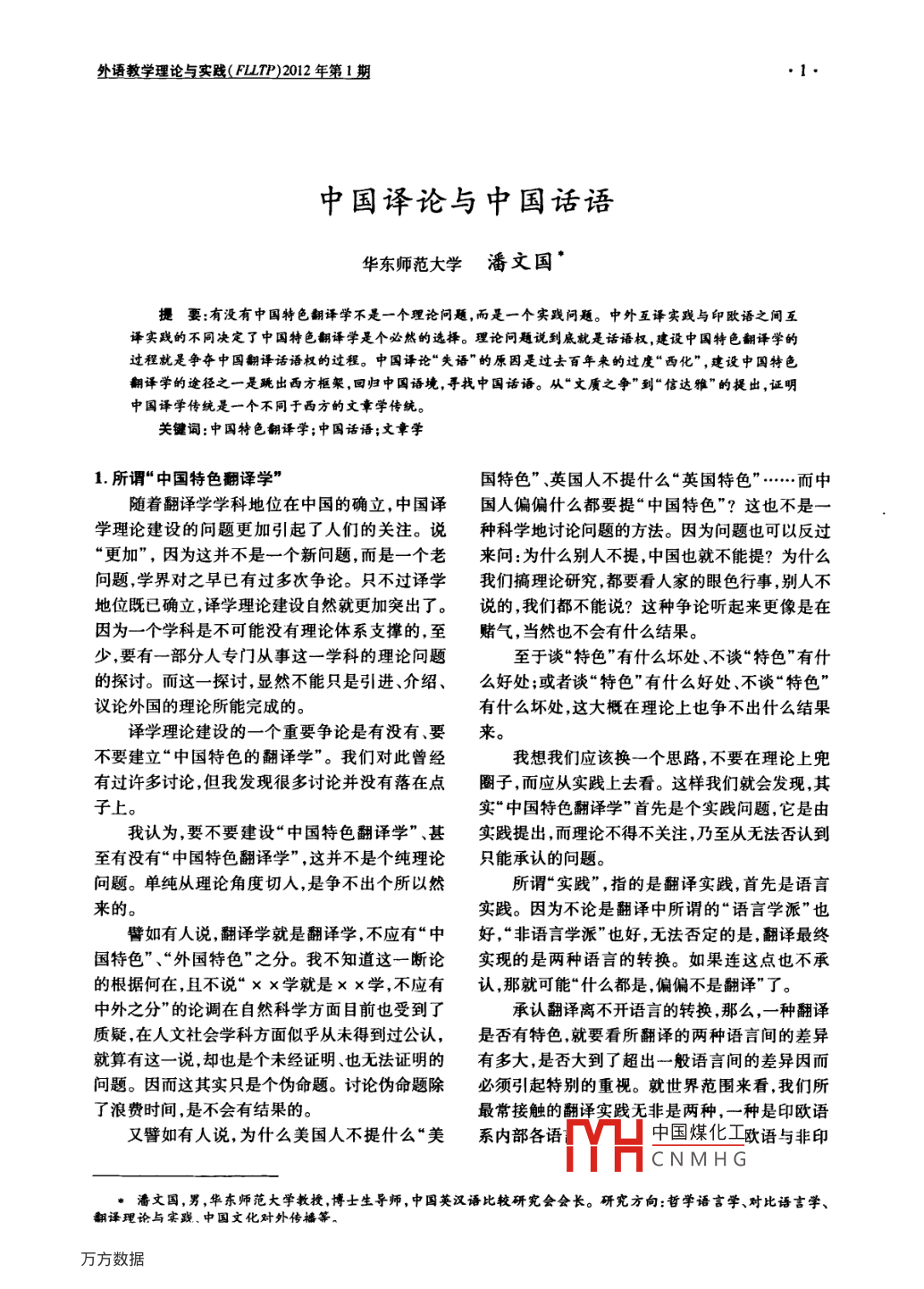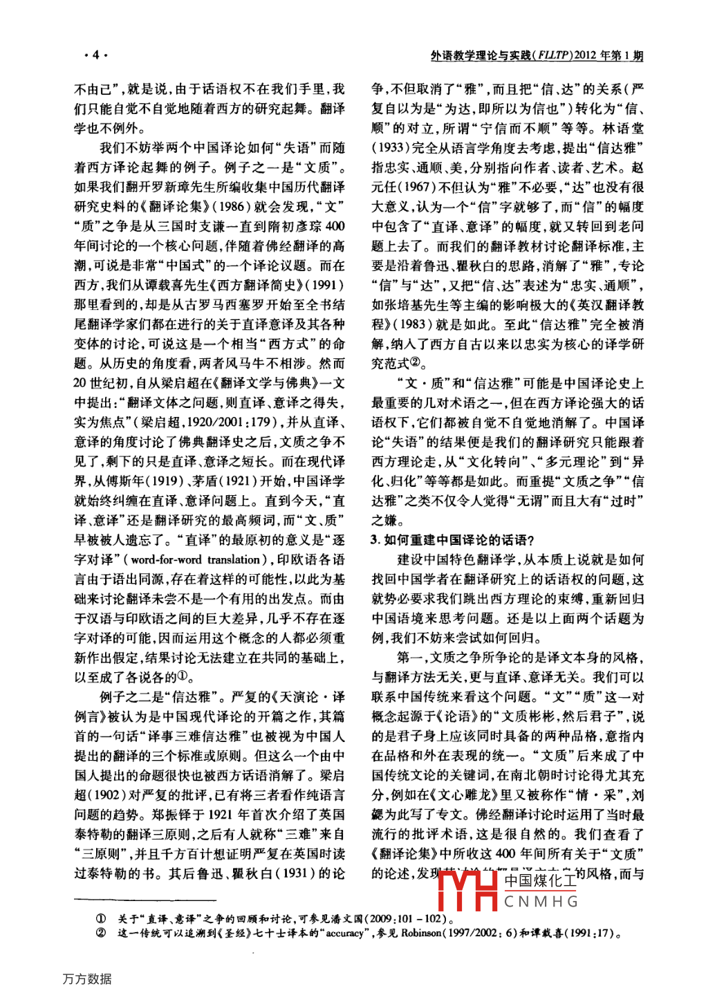外語(yǔ)教學(xué)理論與實(shí)賤(FLTP)202年第1期中國(guó)譯論與中國(guó)話語(yǔ)華東師范大學(xué)潘文國(guó)提要:有沒(méi)有中國(guó)特色翻譯學(xué)不是一個(gè)理論問(wèn)題,而是一個(gè)實(shí)踐問(wèn)題。中外互譯實(shí)踐與印歐語(yǔ)之間互譯實(shí)踐的不冏決定了中國(guó)特色翻譯學(xué)是個(gè)必然的選擇。理論問(wèn)題說(shuō)到底就是話語(yǔ)權(quán),建設(shè)中國(guó)特色翻譯學(xué)的過(guò)程就是爭(zhēng)奪中國(guó)翻譯話語(yǔ)權(quán)的過(guò)程。中國(guó)譯論“失語(yǔ)”的原因是過(guò)去百年來(lái)的過(guò)度“西化”,建設(shè)中國(guó)特色翻譯學(xué)的途徑之一是跳出西方框架,回歸中國(guó)語(yǔ)境,尋找中國(guó)話語(yǔ)。從“文質(zhì)之爭(zhēng)”到“信達(dá)雅”的提出,證明中國(guó)譯學(xué)傳統(tǒng)是一個(gè)不同于西方的文章學(xué)傳統(tǒng)。關(guān)鍵詞:中國(guó)特色翻譯學(xué);中國(guó)話語(yǔ);文章學(xué)1所謂“中國(guó)特色翻譯學(xué)”國(guó)特色”、英國(guó)人不提什么“英國(guó)特色”……而中隨著翻譯學(xué)學(xué)科地位在中國(guó)的確立,中國(guó)譯國(guó)人偏偏什么都要提“中國(guó)特色”?這也不是一學(xué)理論建設(shè)的問(wèn)題更加引起了人們的關(guān)注。說(shuō)種科學(xué)地討論問(wèn)題的方法。因?yàn)閱?wèn)題也可以反過(guò)更加”,因?yàn)檫@并不是一個(gè)新問(wèn)題,而是一個(gè)老來(lái)問(wèn):為什么別人不提,中國(guó)也就不能提?為什么問(wèn)題,學(xué)界對(duì)之早已有過(guò)多次爭(zhēng)論。只不過(guò)譯學(xué)我們搞理論研究都要看人家的眼色行事,別人不地位既已確立,譯學(xué)理論建設(shè)自然就更加突出了。說(shuō)的,我們都不能說(shuō)?這種爭(zhēng)論聽起來(lái)更像是在因?yàn)橐粋€(gè)學(xué)科是不可能沒(méi)有理論體系支撐的,至賭氣,當(dāng)然也不會(huì)有什么結(jié)果。少,要有一部分人專門從事這一學(xué)科的理論問(wèn)題至于談“特色”有什么壞處、不談“特色”有什的探討。而這一探討,顯然不能只是引進(jìn)、介紹、么好處;或者談“特色”有什么好處、不談“特色議論外國(guó)的理論所能完成的。有什么壞處,這大概在理論上也爭(zhēng)不出什么結(jié)果譯學(xué)理論建設(shè)的一個(gè)重要爭(zhēng)論是有沒(méi)有、要來(lái)。不要建立“中國(guó)特色的翻譯學(xué)”。我們對(duì)此曾經(jīng)我想我們應(yīng)該換一個(gè)思路,不要在理論上兜有過(guò)許多討論,但我發(fā)現(xiàn)很多討論并沒(méi)有落在點(diǎn)圈子,而應(yīng)從實(shí)踐上去看。這樣我們就會(huì)發(fā)現(xiàn),其子上。實(shí)“中國(guó)特色翻譯學(xué)”首先是個(gè)實(shí)踐問(wèn)題,它是由我認(rèn)為,要不要建設(shè)“中國(guó)特色翻譯學(xué)”甚實(shí)踐提出,而理論不得不關(guān)注,乃至從無(wú)法否認(rèn)到至有沒(méi)有“中國(guó)特色翻譯學(xué)”,這并不是個(gè)純理論只能承認(rèn)的問(wèn)題。問(wèn)題。單純從理論角度切入,是爭(zhēng)不出個(gè)所以然所謂“實(shí)踐”,指的是翻譯實(shí)踐,首先是語(yǔ)言來(lái)的。實(shí)踐。因?yàn)椴徽撌欠g中所謂的“語(yǔ)言學(xué)派”也譬如有人說(shuō),翻譯學(xué)就是翻譯學(xué),不應(yīng)有“中好,“非語(yǔ)言學(xué)派”也好,無(wú)法否定的是,翻譯最終國(guó)特色”、“外國(guó)特色”之分。我不知道這一斷論實(shí)現(xiàn)的是兩種語(yǔ)言的轉(zhuǎn)換。如果連這點(diǎn)也不承的根據(jù)何在,且不說(shuō)“ⅹx學(xué)就是xx學(xué),不應(yīng)有認(rèn),那就可能“什么都是,偏偏不是翻譯”了。中外之分”的論調(diào)在自然科學(xué)方面目前也受到了承認(rèn)翻譯離不開語(yǔ)言的轉(zhuǎn)換,那么,一種翻譯質(zhì)疑,在人文社會(huì)學(xué)科方面似乎從未得到過(guò)公認(rèn),是否有特色,就要看所翻譯的兩種語(yǔ)言間的差異就算有這一說(shuō),卻也是個(gè)未經(jīng)證明、也無(wú)法證明的有多大,是否大到了超出一般語(yǔ)言間的差異因而問(wèn)題。因而這其實(shí)只是個(gè)偽命題。討論偽命題除必須引起特別的重視。就世界范圍來(lái)看,我們所了浪費(fèi)時(shí)間,是不會(huì)有結(jié)果的。最常接觸的翻譯實(shí)踐無(wú)非是兩種,一種是印歐語(yǔ)又譬如有人說(shuō),為什么美國(guó)人不提什么“美系內(nèi)部各語(yǔ)中國(guó)煤化工歐語(yǔ)與非印CNMHG潘文國(guó),男,華東師范大學(xué)教授,博士生導(dǎo)師,中國(guó)英漢語(yǔ)比較研究會(huì)會(huì)長(zhǎng)。研究方向:哲學(xué)語(yǔ)言學(xué)、對(duì)比語(yǔ)言學(xué)翻譯理論與實(shí)踐、中國(guó)文化對(duì)外傳播箏外語(yǔ)教學(xué)理論與實(shí)踐(FLTP)012年第1期歐語(yǔ)之間的翻譯。后一種最典型的就是漢語(yǔ)與印對(duì)應(yīng)的法語(yǔ)詞 le peche是陽(yáng)性名詞,不可能成為歐語(yǔ)之間的對(duì)譯(還有日語(yǔ)、韓語(yǔ)與印歐語(yǔ)之間生孩子的母親,而與Deah[死亡]對(duì)應(yīng)的 la mort的對(duì)譯,可以類推,這里暫且不討論)。我們發(fā)卻是一個(gè)陰性名詞,也不可能是兒子son。參見現(xiàn),這是兩種非常不同的翻譯實(shí)踐,不但印歐語(yǔ)之 Jespersen,1924:236)。間的翻譯與漢語(y