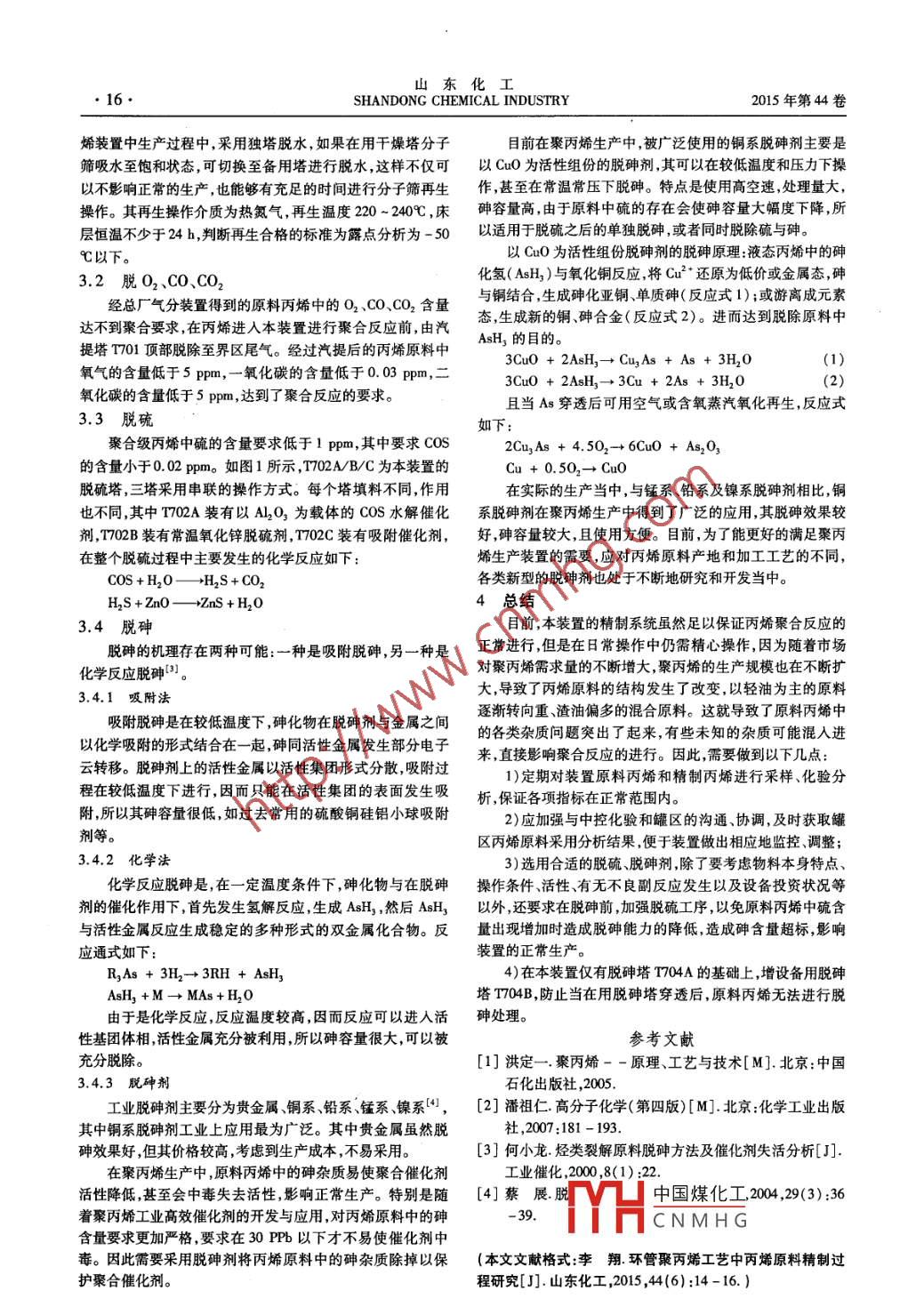 山東化工14SHANDONG CHEMICAL INDUSTRY2015年第44卷環(huán)管聚丙烯工藝中丙烯原料精制過程研究李翔(中國石油化工股份有限公司洛陽分公司,河南洛陽,471012)摘要:主要對(duì)影響丙烯聚合反應(yīng)的雜質(zhì)進(jìn)行分析,結(jié)合洛陽石化140k/a聚丙烯裝置,闡述了原料丙烯脫除H2O、O2、CO、CO2、硫以及砷等精制過程。在實(shí)際生產(chǎn)當(dāng)中,關(guān)于如何加強(qiáng)原料丙烯精制本文提供了一定的參考價(jià)值;催化劑;反應(yīng)活性;精制中圖分類號(hào):TQ325.14文獻(xiàn)標(biāo)識(shí)碼:A文章編號(hào):1008-021X(2015)06-0014-03The Study on the Raw Material Refining Process ofPropylene in the Loop Polypropylene ProcessLi xiangLuoyang Branch, SINOPEC, Luoyang 471012, ChinaAbstract: This paper mainly analyzes the influence of the impurities in the polymerization reaction, combined with LuoyangPetrochemical 140 kt/a PP plant, exnds the raw material propylene removal of H20, O2, CO, CO2, sulfur and arsenirefining process. In the actual production, this paper provides a certain reference value on how to strengthen the rawmaterial propylene refiningKey words: propylene; catalyst; reactivity: refining洛陽石化140ka聚丙烯裝置采用了國產(chǎn)化第二代環(huán)TCl2+H2O→→Ti(OH)3+HCl管液相本體聚合工藝技術(shù)該技術(shù)被廣泛的應(yīng)用于聚丙烯生水的存在同時(shí)影響聚合反應(yīng)的進(jìn)行,使反應(yīng)發(fā)生鏈終產(chǎn),是目前國內(nèi)外最先進(jìn)和最主要的生產(chǎn)技術(shù)之一。環(huán)管反止。其反應(yīng)機(jī)理:應(yīng)器具有全容積裝料、單位反應(yīng)容積所占有的傳熱面積大傳熱系數(shù)高生產(chǎn)強(qiáng)度高,而且環(huán)管內(nèi)物料流速快凝膠少ICar一CHCH( H CH)nC+H2O切換牌號(hào)的時(shí)間短設(shè)備結(jié)構(gòu)簡單等特點(diǎn)日。本裝置原料丙烯為催化裂化,氣體分餾而得。由于丙烯[Cat]-OH CH3- CH(CHCH)nC3H的沸點(diǎn)與H2S、COS的沸點(diǎn)較為接近,所以經(jīng)氣分裝置分離出的丙烯依然會(huì)含有一定量的H2S及微量的cOs,微量的碗1.2O2對(duì)聚合反應(yīng)的影響化物可使下游聚合催化劑中毒從而影響催化劑的活性和產(chǎn)丙烯中氧氣的存在,與高效主催化劑發(fā)生氧化還原反品性質(zhì);同時(shí)丙烯中含有的微量水、CO、CO2、O2、砷等也會(huì)使應(yīng)使之被毒化,直接影響聚合反應(yīng)的進(jìn)行其中毒機(jī)理:催化劑中毒并影響生產(chǎn)和產(chǎn)品性質(zhì)。因此,原料丙烯在進(jìn)入TiCI,+02-TiOCI,+ TiCl4TiCL +Tio聚合裝置反應(yīng)前,必須進(jìn)行預(yù)脫硫、砷、CO、CO2、O2和深度干燥等處理。氧氣的存在不僅嚴(yán)重影響主催化劑的反應(yīng)活性而且進(jìn)入反應(yīng)器后直接影響聚合反應(yīng)的進(jìn)行,使聚合反應(yīng)發(fā)生鏈終1原料丙烯中雜質(zhì)的危害性原料丙烯中雜質(zhì)的存在嚴(yán)重影響聚合反應(yīng)的進(jìn)行,本止,其反應(yīng)機(jī)理文對(duì)各類雜質(zhì)對(duì)聚合反應(yīng)影響的機(jī)理分析如下:1.1H2O對(duì)聚合反應(yīng)的影響[Cat.]CH(CH2 CH)n C3 H7+Oz水能使主催化劑三氯化鈦和活性劑三乙基鋁發(fā)生水解CH: CH3反應(yīng),直接讓主催失去活性。所以原料丙烯中的水含量必須-[ CH( CHCH)得到有效的控制。1.3CO、CO2對(duì)聚合反應(yīng)的影響活性劑三乙基鋁失活的原理:丙烯原料中CO、CO2的存在不僅影響催化劑的定向能A(C2H3)3+H2O一→A(OH)3+C2H力,而且在聚中國煤化工合反應(yīng)發(fā)生鏈終主催化劑遇水發(fā)生水解,失活過程:止降低催化H反應(yīng)進(jìn)行的機(jī)理CNMHG收稿日期:2014-12-31作者簡介:李翔(1990—),助理工程師2012年畢業(yè)于遼寧石油化工大學(xué),本科學(xué)歷現(xiàn)從事聚丙烯生產(chǎn)技術(shù)工作。第6期李翔:環(huán)管聚丙烯工藝中丙烯原料精制過程研究15·為毒的原理如下:①AsH3會(huì)隨丙烯進(jìn)入環(huán)管內(nèi),之后遇熱分解為As吸附在以MgCl2為載體的主催化劑表面,包裹了催化CH3 CH[Cat* -CH2 CH(CH CH)nC,H,+CO劑的活性中心,進(jìn)而使其喪失活性;②與主催活性中心TC3反應(yīng),生成了穩(wěn)定的雙金屬化合物。[Cat]-OCCH2 CH(CHCH)nC3H2原料丙烯精制過程原料丙烯精制過程總體上先后經(jīng)歷了干燥脫水、不凝氣汽提、脫硫、再干燥脫水、脫砷然后進(jìn)入丙烯原料罐,由高速[."CH, CH(CH, CH)n C3H,+CO2原料泵打人環(huán)管反應(yīng)器進(jìn)行聚合反應(yīng)。洛陽石化140kt/a聚丙烯裝置聚合級(jí)精制丙烯工藝指標(biāo)如表1,其精制原則流-[Cat], CH(CH2 CH)nC3 H7程圖如圖1所示。1.4硫、砷對(duì)聚合反應(yīng)的影響表1聚合級(jí)精制丙烯工藝指標(biāo)硫是丙烯中極其有害的物質(zhì),無論是有機(jī)硫還是無機(jī)硫質(zhì)量指標(biāo)對(duì)丙烯聚合反應(yīng)都是有害的,在本裝置中,特別是原料丙烯丙烯/%≥99.5中的COs,能使聚合反應(yīng)發(fā)生鏈終止,大大降低了聚合反應(yīng)Co/′×10-6的活性其反應(yīng)機(jī)理如同CO2對(duì)聚合反應(yīng)的影響C02/ x10≤5砷能引起催化劑中毒,其原因與其特殊的結(jié)構(gòu)有關(guān),能H2O/×10-6形成-3,+3,+5價(jià)的氧化態(tài)。三價(jià)砷的最外層電子有一對(duì)未共用的4s電子,很容易與鈦元素-鈦原子的最外層電子O2/×10-6排布為3d2432,的d軌道結(jié)合形成配位鍵使其中毒失活,而COS/ x 10-6且這種中毒很難活化。砷/×10-6通常砷以AsH3的形式存在原料