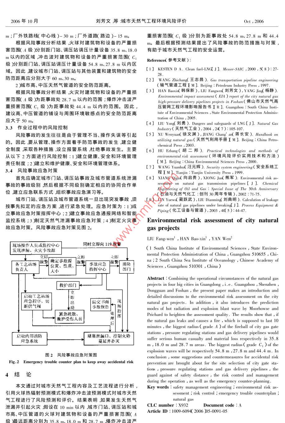 第6卷第5期安全與環(huán)境學(xué)報Vol 6 No 52006年10月Journal of safety and EnvironmentOct,2006reduction[J]. Progress in Geography(地理科學(xué)進(jìn)展),文章編號:1009-6094(2005002004,x4):28-34[6] ZHANG Peng(張鵬), MA Xiaohong馬小紅) Research on the rela城市天然氣工程環(huán)境風(fēng)險評價onship of China economy development and circumstance pollutior JJJournal of Hunan University of Science and Engineering(湖南科技學(xué)院學(xué)報),2005,孓5):264-268劉芳文,韓保新,顏文[7] QIAN Zhenwei(錢振為). Energy consumption per GDP and economy(I國家環(huán)境保護總局華南環(huán)境科學(xué)研究所廣州510655growth patter[ J]. China energy(中國能源),2005,5):10-142中國科學(xué)院南海海洋研究所廣州510301)[8] BIRDCALL N, Another look at population and global warming[MIWPS1020 World Bank, Washington D. C., 1992摘要:結(jié)合廣州、深圳、東莞、佛山等城市的天然氣工程情況,對城9] SHAFIK N, BANDYOPADHYAY S. Economic growth and市天然氣工程的環(huán)境風(fēng)險評價進(jìn)行了討論,并采用穆爾哈斯environmental quality ? M]. Time Series and Cross-Country Evidence,( Moorhouse廂和普里恰特 Prichard濃提出的熱輻射預(yù)測模式和爆炸沖擊WPS, World Bank, Washington D. C., 1992波預(yù)測模式對城市天然氣工程進(jìn)行了風(fēng)險評價。結(jié)果表明如果發(fā)生10] HE Jiankun(何建坤),LUBi(劉濱). Analysis of Carbon emission天然氣泄漏并引起火災(zāi)假設(shè)在10min以內(nèi)城市門站、調(diào)壓站和城市intensity as the main index for greenhouse gas emission mitigation commegaton com高中壓管道的火球?qū)ㄖ锖驮O(shè)備的嚴(yán)重?fù)p害范圍(A級)最遠(yuǎn)距離mitments[J]. Journal of Tsinghua University: Science and分別為35.8m、18.0m和28.7m爆炸沖擊波嚴(yán)重?fù)p害范圍C1級)分別為距事故處54.8m、27.8m和44.4m。最后從城市門站、調(diào)壓站選[] HE Jiankun(何建坤), SU Mingshan(蘇明山). Global climat址及輸氣管道選線、安全防范距離、作業(yè)過程中的風(fēng)險控制與管理以China Environmental Protection industry(9h214mn:[J.及事故應(yīng)急對策四方面提出了風(fēng)險事故的防范措施與對策。change and China energy development strategy in環(huán)保產(chǎn)業(yè)),2002,關(guān)鍵詞:安全管理工程;環(huán)境風(fēng)險評價;風(fēng)險控制;事故應(yīng)急對策I(2):30天然氣[12] LIU Bin(劉濱). Primary research into scenario on carbon emission in-中圖分類號:X932文獻(xiàn)標(biāo)識碼:Aensity[J. Climate Change Newsletter(氣候變化通訊),2003,6(4):20210引言Economic growth and its effects on carbon自20世紀(jì)80年代開始,天然氣(LNG〕就是世界上發(fā)emission in China快的燃料之一年貿(mào)易增加率為8%。引進(jìn)LNG對改善城WANG Zhong-ying, WAN市的能源結(jié)構(gòu)提高用能水平、特別是用能安全性減少環(huán)境Indo污染加快城市發(fā)展具有極為重要的意義。但液化天然氣屬1 Institute of Geographical Sciences and Natural Resources re-于甲類易燃、易爆危險品在輸送、儲存、使用等過程中有可search, Chinese Academy of Sciences, Beijing 100101, China能發(fā)生泄漏,當(dāng)泄漏數(shù)量較大、達(dá)到天然氣在空氣中的爆炸極2 Graduate School of Chinese Academy of Sciences, Beijing1000限或遇明火時就會發(fā)生爆炸2給周圍環(huán)境和生j造成嚴(yán)重的破壞。因此城市天然氣工程運行的可靠性直接Abstract: This paper intends to present the authors' analysis of the影響該城市的經(jīng)濟發(fā)展。在天然氣利用工程的規(guī)劃、選址、施relationship between the GDP growth and carbon emission in工和使用過程中必須注意天然氣風(fēng)險事故的環(huán)境影響和安oday with the correlative analytical method(R2=0.9581).The全性。oncnt pattert廣東LNG項目于1999年底經(jīng)國務(wù)院批準(zhǔn)立項,期工程mainly dependentvestment and structural expansion of sec-將建設(shè)370萬T/a的LNG接收站以及廣州、深圳、東莞、佛山ondary industry hasemission increase of green等四城市的天然氣工程項目其氣源供應(yīng)方為澳大利亞西北house gas. The investment rate of China exceeds35%-40%of大陸架天然氣項目(NWSGDP during the period of 1980 to 2003, which is higher than otherountries. As a result, China has brought about tremendous develop-本文旨在結(jié)合廣州、深圳、東莞、佛山等四城市利用廣東ment of its heavy industry with ever increasing consumption of energyLNG項目情況對城市天然氣工程的環(huán)境風(fēng)險進(jìn)行評價。resources.Such a consequence on the one hand has led to hig1工程概況proportion of secondary industry to the whole50%) On the other hand, its energy consumption has to be depen-1.1天然氣組分及物化特性參數(shù)dent heavily on coal( over 60%), which emits large amounts of gases廣州、深圳、東莞、佛山等四城市天然氣均來源于廣東han oil or natural gas.Thus, it will be inevitable to consume more LNG項目液化天然氣因產(chǎn)地不同其組分也有所不同典型energy and increase the emission of greenhouse gases in future. HowLNG及廣東LNG項目推薦組分的物化特性參數(shù)見表ever, under the background of globalization our economic growthshould depend more on technological improvement, scientific and in.1.2城市天然氣工程內(nèi)容及工藝流程stitutional innovation. With the high efficient use of renewable energy城市天然氣工程主要包括城市門站、調(diào)壓站、城市高中壓and environment-friendly technology, China can and is sure to make管道等其工藝流程見圖1。contributions to global efforts to prevent glo