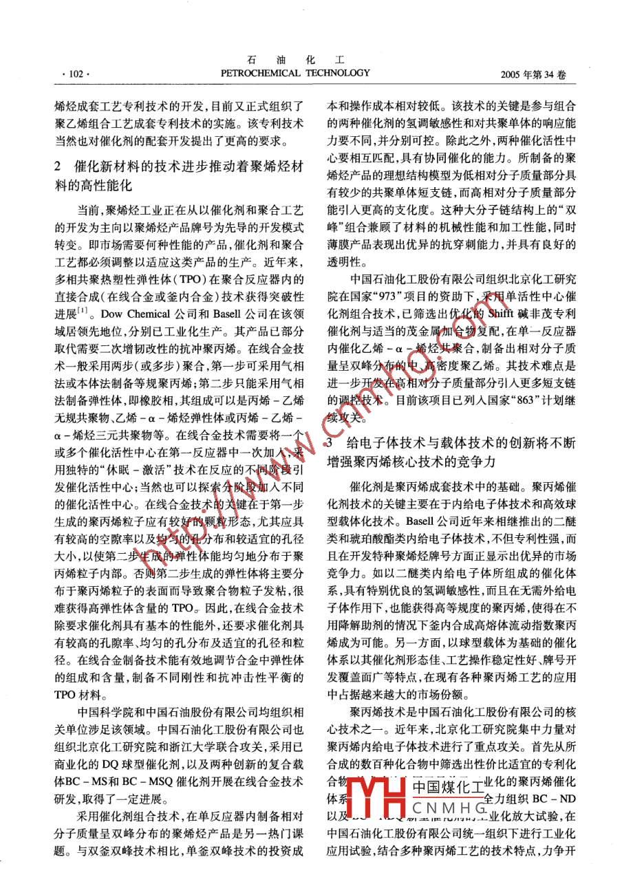 石油化工2005年第34卷第2期PETROCHEMICAL TECHNOLOGY特約述評從現(xiàn)代聚烯烴工業(yè)之發(fā)展看催化材料的技術進步陳偉(中國石油化工股份有限公司北京化工研究院,北京100013)摘要」催化新材料與烯烴聚合工藝組成了現(xiàn)代聚烯烴工業(yè)的發(fā)展基礎,而開發(fā)高附加值的高性能聚烯烴材料已逐漸成為推動本行業(yè)技術進步的最重要的驅動力。另外,“組合技術”的觀念從催化材料、聚合工藝、產品結構以及高通量快速篩選等方面都得到充分體現(xiàn)。從組合技術、高性能化、給電子體與載體技術以及單活性中心催化劑等方面簡述催化新材料的技術進步及其在現(xiàn)代聚烯烴工業(yè)發(fā)展中不可替代的重要作用。[關鍵詞]催化材料;聚烯烴工業(yè);技術進步;組合技術;高性能化;單活性中心催化劑[文章編號]1000-8144(2005)02-0101-04[中圖分類號]TQ325.1文獻標識碼]A縱觀聚烯烴工業(yè)幾十年的發(fā)展歷程,催化材料例,其設計生產能力已超過450k/a。工藝發(fā)展的的創(chuàng)新與修飾對整個聚烯烴工業(yè)的發(fā)展起著決定性另一特點是選用冷凝技術和超臨界技術。為適應開的作用;與此同時,烯烴聚合工藝的優(yōu)化與聚烯烴產發(fā)具有市場競爭力和高附加值的高性能化聚烯烴產品的高性能化也不斷促進著催化材料的技術進步。品,更多的工藝開發(fā)商將“組合技術”的理念運用于在世界聚烯烴產品趨于飽和的時代,中國的聚工藝創(chuàng)新中,從 Dow Chemical公司組合氣相流化床烯烴工業(yè)發(fā)展方興未艾。2003年我國聚丙烯和聚聚丙烯 Unipol工藝,到 Borealis公司環(huán)管與氣相流乙烯產量分別達到3.942Mt和4.129Mt。未來兩化床組合聚乙烯 Borstar工藝,再到 Basell/公司2004年之內,已經證實的擴能增長均為50%左右,產能年剛工業(yè)化的多區(qū)循環(huán)聚丙烯 Spherizone工藝,無將分別超過6M;與國內需求增長相比,國產化自不體現(xiàn)出其“組合”的特點。當然,“組合工藝”的出給率在現(xiàn)在50%左右的基礎上將有大幅度提高。現(xiàn)也對催化劑的開發(fā)提出了更高的要求。比如:催需要指出的是,如果按歐美國家人均消費塑料產品化劑的動力學控制以及催化效率在各個反應器內的的標準來預測我國聚烯烴市場的發(fā)展將是不現(xiàn)實平衡分配;催化劑在一個反應器對氫氣的高敏感性的,因為資源的巨大缺口將制約我國聚烯烴工業(yè)一在另一反應器對共聚單體插入的高響應能力等;特味追求產量的發(fā)展模式。今后國內外市場統(tǒng)一的公別是為保證催化劑粒子以及初級聚合物粒子在全工平競爭需要具有成本競爭力的大型化成套工藝技藝流程中的平穩(wěn)輸送,對催化劑的粒徑和粒型提出術,當然更需要占據市場的高附加值的高性能化聚了更高的要求。烯烴產品。上述兩方面都離不開催化新材料的技術北京化工研究院目前正承擔著上海石油化工股進步。份有限公司250k/a聚乙烯 Borstar工藝所用催化聚烯烴工業(yè)一方面向著大型化和長周期穩(wěn)定運劑國產化的任務。在完成知識產權侵權分析工作的行發(fā)展;另一方面,其“組合技術”的理念從聚合工基礎上,中國石油化工集團公司已組織相關單位于藝、聚烯烴產品結構以及高通量評價表征等方面都2003年進行了國產催化劑的首次工業(yè)化試驗,在滿得到了充分的體現(xiàn)。為了滿足這種“組合技術”的足雙峰催化劑基本要求的前提下,國產技術的特點要求,催化新材料正面臨著不斷創(chuàng)新的挑戰(zhàn)。之一就是聚合物粒型控制略優(yōu)于進口催化劑,從而本文將從以下6個方面闡述催化材料的技術進在一定程度上改善了工藝操作的穩(wěn)定性步在現(xiàn)代聚烯烴工業(yè)中的作用。流企業(yè)賣標準,二流企業(yè)賣技術,三流企業(yè)1催化新材料的技術進步必須滿足聚烯烴賣產中國煤化工司多年來致力于聚組合工藝”不斷發(fā)展的需要CNMHG[收稿白期19;[修改稱日期」2004-11-22現(xiàn)代聚烯烴工藝技術的發(fā)展方向之一是大型[作者簡介陳偉(90-),男,四川省綿陽市人博土教授級高化,以Unication公司單氣相流化床聚乙烯工藝為工,電話010-6429565,電郵chenwei@bni.ac.cn石油化工PETROCHEMICAL TECHNOLOGY2005年第34卷烯烴成套工藝專利技術的開發(fā),目前又正式組織了本和操作成本相對較低。該技術的關鍵是參與組合聚乙烯組合工藝成套專利技術的實施。該專利技術的兩種催化劑的氫調敏感性和對共聚單體的響應能當然也對催化劑的配套開發(fā)提出了更高的要求。力要不同,并分別可控。除此之外,兩種催化活性中2催化新材料的技術進步推動著聚烯烴材心要相互匹配具有協(xié)同催化的能力。所制備的聚烯烴產品的理想結構模型為低相對分子質量部分具料的高性能化有較少的共聚單體短支鏈,而高相對分子質量部分當前,聚烯烴工業(yè)正在從以催化劑和聚合工藝能引入更高的支化度。這種大分子鏈結構上的“雙的開發(fā)為主向以聚烯烴產品牌號為先導的開發(fā)模式峰”組合兼顧了材料的機械性能和加工性能,同時轉變。即市場需要何種性能的產品,催化劑和聚合薄膜產品表現(xiàn)出優(yōu)異的抗穿刺能力,并具有良好的工藝都必須調整以適應這類產品的生產。近年來,透明性。多相共聚熱塑性彈性體(TPO)在聚合反應器內的中國石油化工股份有限公司組織北京化工研究