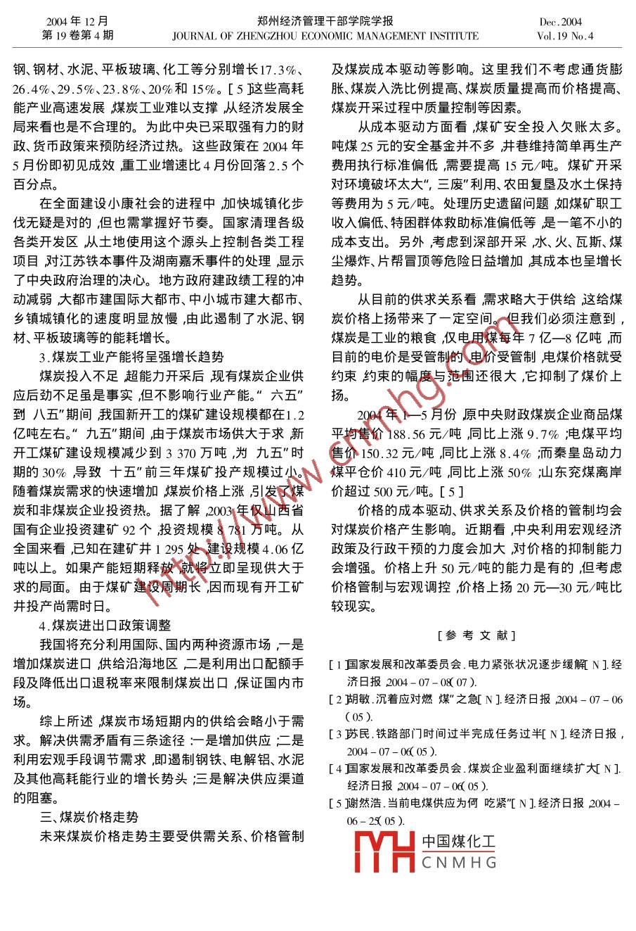 2004年12月鄭州經(jīng)濟(jì)管理干部學(xué)院學(xué)報(bào)Dec. 2004第19卷第4期JOURNAL OF ZHENGZHOU ECONOMIC MANAGEMENT INSTTUTEVol.19 No.4煤炭供求關(guān)系與價(jià)格走勢(shì)呂朝暉(鄭州經(jīng)濟(jì)管理干部學(xué)院管理系河南鄭州451191 )摘要在相當(dāng)長(zhǎng)的時(shí)期內(nèi)煤炭產(chǎn)業(yè)仍是我國(guó)重要的基礎(chǔ)產(chǎn)業(yè)。長(zhǎng)期看煤炭供小于求短期看供略小于求供求關(guān)系應(yīng)較為協(xié)調(diào)。目前的煤炭供求關(guān)系不協(xié)調(diào)主要受制于煤炭運(yùn)輸、電煤價(jià)格管制等因素。未來(lái)煤炭?jī)r(jià)格走勢(shì)主要受供需關(guān)系、價(jià)格管制及煤炭成本驅(qū)動(dòng)等影響。關(guān)鍵詞煤炭供給需求煤炭?jī)r(jià)格預(yù)測(cè)中圖分類號(hào):F407 .25文獻(xiàn)標(biāo)識(shí)碼:A文章編號(hào):1671 - 4989( 2004 )4 - 0016- 03-、煤炭長(zhǎng)期供求關(guān)系要百年以上的時(shí)間。當(dāng)前我國(guó)再生能源、核能、氫煤炭是我國(guó)最廉價(jià)、最可靠、完全可以清潔利用能、風(fēng)能、太陽(yáng)能的開(kāi)發(fā)利用雖然有了很大發(fā)展,但和不可再生的自然資源。在一次能源生產(chǎn)和消費(fèi)構(gòu)是開(kāi)發(fā)利用速度依然趕不上石油和天然氣資源枯竭成中20世紀(jì)80年代煤炭始終保持在75%以上現(xiàn)的速度。綜上所述煤炭依然是我國(guó)最主要的能源。在仍保持在70%左右。經(jīng)能源專家預(yù)測(cè),2020 年以煤炭是最廉價(jià)的能源。煤炭開(kāi)發(fā)利用成本低。前煤炭依然是我國(guó)的主要能源,在一次能源消費(fèi)構(gòu)據(jù)我國(guó)一五”到九五"的統(tǒng)計(jì)資料顯示,雖然煤炭成中的比重不會(huì)低于60% ,50 年內(nèi)不會(huì)低于50%。工業(yè)總投資2450.83億元,僅為石油工業(yè)投資在將來(lái)相當(dāng)長(zhǎng)的時(shí)期內(nèi)煤炭產(chǎn)業(yè)仍將是我國(guó)重要(5637.09億元)的43.5% ,但煤炭在我國(guó)一次能源的基礎(chǔ)產(chǎn)業(yè)煤炭仍將是我國(guó)能源安全的基石。生產(chǎn)或消費(fèi)總量的比重,始終是石油和天然氣的3豐富的煤炭資源是我國(guó)最可靠的能源。據(jù)統(tǒng)倍以上國(guó)家以較小的投入獲得較大的能源供應(yīng)份計(jì)我國(guó)查明化石能源資源量為7456億噸標(biāo)準(zhǔn)煤。額。在國(guó)際上按同等熱值計(jì)算天然氣、石油的價(jià)格煤炭、石油、天然氣累計(jì)查明資源儲(chǔ)量分別為10201是煤炭的4- -5倍。2000 年,我國(guó)原油進(jìn)口7 026.5億噸、160億噸、20 606億立方米分別占不可再生能萬(wàn)噸噸油耗資211.5美元當(dāng)年我國(guó)國(guó)有重點(diǎn)煤礦源查明資源儲(chǔ)量7 456 億噸標(biāo)準(zhǔn)煤的96. 57%、出礦價(jià)僅為139.69元/噸。由此看來(lái),國(guó)內(nèi)石油和3.06%、0.37%。世界上煤炭資源的開(kāi)采年限大大天然氣價(jià)格大大高于煤炭?jī)r(jià)格。高于石油和天然氣。煤炭是完全可以清潔利用的能源。我國(guó)煤炭主.我國(guó)近期可替代煤炭的能源資源品種雖多但要是用于發(fā)電。火電是我國(guó)主要的終端能源。當(dāng)數(shù)量有限。當(dāng)前水能和核能發(fā)展較快,但仍存在許前我國(guó)燃煤電廠采用煙氣脫硫措施的火電機(jī)組容多制約因素。水能開(kāi)發(fā)周期長(zhǎng)投資大對(duì)生態(tài)環(huán)境量?jī)H為500萬(wàn)千瓦左右,占 2002年火電裝機(jī)容量26影響大舉世聞名的三峽工程遭遇反對(duì)的聲音很強(qiáng)555萬(wàn)千瓦的1.9%,因此煤炭產(chǎn)品粗放式燃燒是烈這是重要的原因。三門峽大壩的修建方案受蘇我國(guó)當(dāng)前重要的煤煙型污染源。目前國(guó)內(nèi)外先進(jìn)聯(lián)專家的主導(dǎo)未考慮排沙上游泥沙淤積造成了生火力發(fā)電的實(shí)踐充分證明燃煤電廠可以安裝高效態(tài)問(wèn)題。核能建設(shè)周期更長(zhǎng)投資更大,且核燃料棒脫硫設(shè)備高效除塵設(shè)備和可以減少氧化氮的燃燒的來(lái)源及廢棄處理存在困難??傊?在相當(dāng)長(zhǎng)的時(shí)器等環(huán)境保護(hù)設(shè)備消除煤煙型污染。燃煤電廠采期內(nèi)水能和核能在能源總量構(gòu)成中還會(huì)大大低于用脫硫、除塵和燃?xì)饴?lián)合循環(huán)發(fā)電技術(shù)完全可以實(shí)煤炭、石油的比重。雖然核能、氫能和可以再生的新現(xiàn)煤炭清潔燃燒和提高發(fā)電效率。能源將進(jìn)一步開(kāi)發(fā)和利用,最終會(huì)取代化石能源的中國(guó)煤化工|對(duì)短缺的國(guó)家。1992主體地位但據(jù)專家初步估計(jì)實(shí)現(xiàn)這一轉(zhuǎn)變至少需年我MYHCNMH G生產(chǎn)能源總量,從1993收稿日期2004-09 - 23作者簡(jiǎn)介:呂朝暉( 1966- ),女 河南焦作人鄭州經(jīng)濟(jì)管理干部學(xué)院管理系副教授。6..呂朝暉煤炭供求關(guān)系 與價(jià)格走勢(shì)年起就成為石油凈進(jìn)口國(guó)。2000年我國(guó)能源生產(chǎn)以上。[2在許多電廠里預(yù)備夏季高峰期的庫(kù)存電總量為10.9億噸標(biāo)準(zhǔn)煤能源消費(fèi)總量為12. 8億煤被提前消耗部分電廠煤炭庫(kù)存僅夠用2- -3天,噸標(biāo)準(zhǔn)煤。中國(guó)能源消費(fèi)約占全世界的1/10成為遠(yuǎn)低于正常的庫(kù)存警戒線。世界.上僅次于美國(guó)的第二大能源消費(fèi)大國(guó)能源缺但以上情