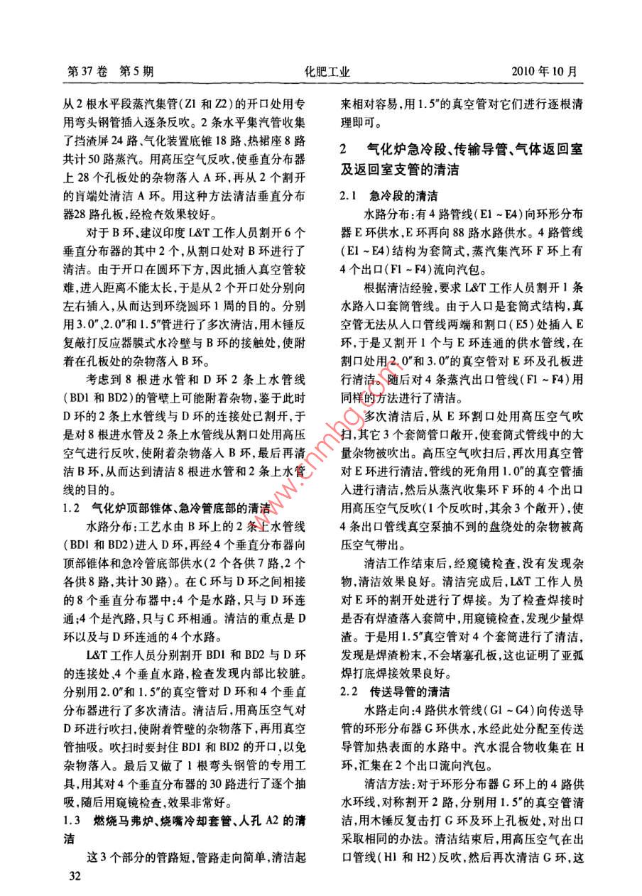 第37卷第5期化肥工業(yè)2010年10月Shell氣化爐水汽系統(tǒng)的清潔李亞?wèn)|(鶴壁煤電股份有限公司氣化廠458030)摘要根據(jù)相關(guān)企業(yè)原始開車操作經(jīng)驗(yàn),詳細(xì)闡述了Shell 氣化爐水汽系統(tǒng)的清潔方法。該氣化爐水汽管道很復(fù)雜,清洗也較麻煩,但清洗后效果很好,達(dá)到了預(yù)期目的。關(guān)鍵詞Shell 氣化爐水汽系統(tǒng) 清潔Cleaning of Water and Steam System in Shell GasiferLi Yadong(Gasification Plant of Hebi Coal and Eletricity Co., Ltd. 458030)Abstract Based on the original start-up operation experiences of the other similar enterprises, adetailed description is given of the cleaning method for the water and steam system in the Shell gasifier.The above-mentioned water and steam pipes in the gasifier are quite complicated, and their cleaning istroublesome , but the result after cleaning is very satisfactory, ataining the expected objective.Keywords Shell gasifer water and steam system cleaning中原大化集團(tuán)公司年產(chǎn)500 kt甲醇生產(chǎn)裝置(RMW1),再通過(guò)6個(gè)垂直分布器(ABI ~ AB6)采用Shell粉煤氣化技術(shù),核心設(shè)備氣化爐為印度進(jìn)入A環(huán)(RMW2)。氣化反應(yīng)器的膜式水冷壁Larsen & Toubro公司(簡(jiǎn)稱L&T)制造。氣化爐186路供水由2個(gè)環(huán)供應(yīng),A環(huán)供應(yīng)75路, B環(huán)供組對(duì)時(shí),在對(duì)氣化爐內(nèi)件割口處檢查中發(fā)現(xiàn)存在.應(yīng)111路。擋渣屏24路供水也由2路構(gòu)成,A環(huán).較多的雜物。氣化爐水汽系統(tǒng)管路分布多且走向供應(yīng)14路,6個(gè)垂直分布器(AB1 ~ AB6)供應(yīng)復(fù)雜,為保證所涉及到的加熱表面的各條管路中10路(其中4個(gè)垂直分布器各供2路,其余2個(gè)水量分配均勻,在各條水路的人口和蒸汽過(guò)熱器各供1路)。氣化裝置底部錐體18 路供水由2個(gè)的出口安裝了拉蒙式限流孔板。這些限流孔板的垂直分布器各供9路。熱裙座8路供水由A環(huán)供內(nèi)徑在φ5~10mm,很小的異物都可能減小限流應(yīng)。所以,A環(huán)總計(jì)供水97路(75 +14+8),B環(huán)孔板的截面積,甚至發(fā)生完全堵塞孔板,這將會(huì)導(dǎo)總計(jì)供水111路,6個(gè)垂直分布器總計(jì)供水28路致加熱表面嚴(yán)重?fù)p毀,甚至發(fā)生爆管。目前國(guó)內(nèi)(10+18)。已開車的Shell氣化爐,在試車過(guò)程中都出現(xiàn)了不1.1A環(huán)、B環(huán)及6個(gè)垂直分布器的清潔同程度的管路堵塞現(xiàn)象,延誤了開車進(jìn)程,造成了割下A環(huán)側(cè)面上的2個(gè)2.0"盲頭,用1.5”的較大的經(jīng)濟(jì)損失。真空管插入抽吸,用木錘反復(fù)敲打反應(yīng)器膜式水冷壁與A環(huán)接觸處及6個(gè)垂直分布器,使附著在1氣化爐 反應(yīng)段的清潔管壁上和孔板處的雜物落入A環(huán)。考慮到6個(gè)反應(yīng)段水路分布:膜式水冷壁186 路,氣化爐垂直分布器上的28個(gè)孔板采用這種方法效果不底部錐體18路,擋渣屏24路,熱裙座8路,共計(jì)明顯,于是采用反吹的方法。反吹前先對(duì)蒸汽出236路。工藝水由8條管線(A1 ~A8)進(jìn)入B環(huán)口進(jìn)行清潔,用窺鏡檢查無(wú)雜物后再用高壓空氣本文作者的聯(lián)系電話:0392 296617131第37卷第5期化肥工業(yè)2010年10月從2根水平段蒸汽集管(Z1和Z2)的開口處用專來(lái)相對(duì)容易,用1.5”的真空管對(duì)它們進(jìn)行逐根清用彎頭鋼管插人逐條反吹。2條水平集汽管收集理即可。了擋渣屏24路、氣化裝置底錐18路熱裙座8路2氣化爐急冷段、傳輸導(dǎo)管、氣體返回室共計(jì)50路蒸汽。用高壓空氣反吹,使垂直分布器及返回室支管的清潔上28個(gè)孔板處的雜物落人A環(huán),再?gòu)?個(gè)割開的盲端處清潔A環(huán)。用這種方法清潔垂直分布2.1急冷 段的清潔器28路孔板,經(jīng)檢查效果較好。水路分布:有4路管線(E1 ~E4)向環(huán)形分布對(duì)于B環(huán)建議印度L&T工作人員割開6個(gè)器E環(huán)供水,E環(huán)再向88路水路供水。4路管線垂直分布器的其中2個(gè),從割口處對(duì)B環(huán)進(jìn)行了(E1 ~E4)結(jié)構(gòu)為套簡(jiǎn)式,蒸汽集汽環(huán)F環(huán)上有清潔。由于開口在圓環(huán)下方,因此插入真空管較4個(gè)出口(F1 ~ F4)流向汽包。難,進(jìn)人距離不能太長(zhǎng),于是從2個(gè)開口處分別向根據(jù)清潔經(jīng)驗(yàn),要求L&T工作人員割開1條左右插入,從而達(dá)到環(huán)繞圓環(huán)1周的目的。分別水路人口套筒管線。由于人口是套簡(jiǎn)式結(jié)構(gòu),真用3.0" 2.0"和1.5"管進(jìn)行了多次清潔,用木錘反空管無(wú)法從入口管線兩端和割口(E5)處插人E復(fù)敲打反應(yīng)器膜式水冷壁與B環(huán)的接觸處,使附環(huán),于是又割開1個(gè)與E環(huán)連通的供水管線,在著在孔板處的雜物落入B環(huán)。割口處用2.0”和3.0”的真空管對(duì)E環(huán)及孔板進(jìn)考慮到8根進(jìn)水管和D環(huán)2條上水管線行清潔。隨后對(duì)4條蒸汽出口管線(F1~F4)用(BDI和BD2)的管壁上可能附著雜物,鑒于此時(shí)同樣的方法進(jìn)行了清潔。D環(huán)的2條上水管線與D環(huán)的連接處已割開,于多次清潔后,從E環(huán)割口處用高壓空氣吹是對(duì)8根進(jìn)水管及2條上水管線從割口處用高壓掃,其它3個(gè)套筒管口敞開,使套簡(jiǎn)式管線中的大空氣進(jìn)行反吹,使附著雜物落入B環(huán),最后再清量雜物被吹出。高壓空氣吹掃后,再次用真空管潔B