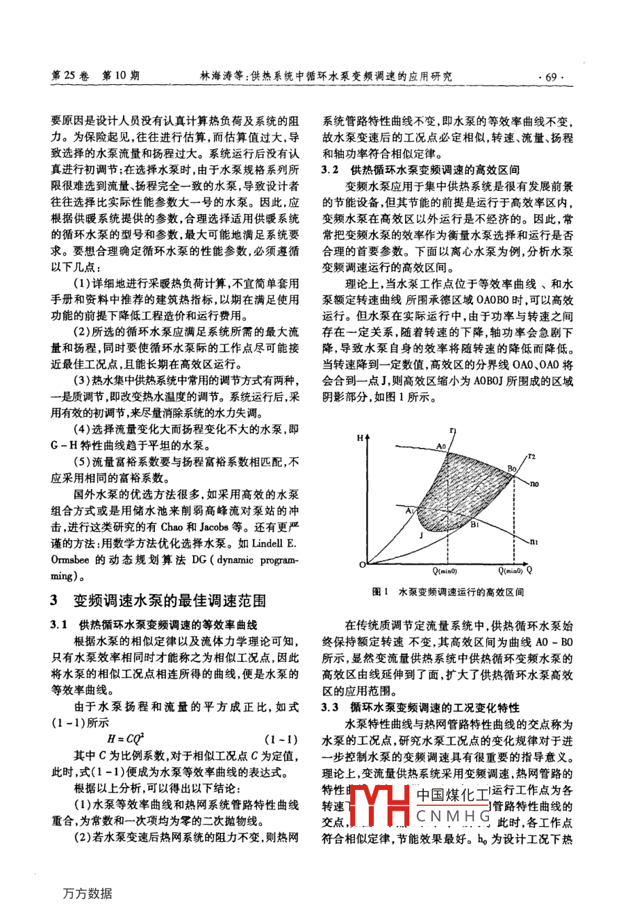 第25卷第10期吉林工程技術(shù)師范學(xué)院學(xué)報VoL. 25 No. 102009年10月Journal of Jjlin Teachers Instiute of Engineering and TechnologyOct 2009供熱系統(tǒng)中循環(huán)水泵變頻調(diào)速的應(yīng)用研究林海濤,劉海龍,劉志平(吉林農(nóng)業(yè)大學(xué)規(guī)劃建設(shè)處,吉林長春130118)[摘要]循環(huán)水泵作為供熱 系統(tǒng)的重要運(yùn)行設(shè)備,其優(yōu)化運(yùn)行對整個供熱系統(tǒng)的經(jīng)濟(jì)運(yùn)行有著重要意義。本文針對循環(huán)水泵運(yùn)行效率低以及存在的相關(guān)控制問題.提出將變頻調(diào)速技術(shù)應(yīng)用于供熱循環(huán)水泵,用調(diào)速泵代替定速泵。對循環(huán)水泵設(shè)置變頻調(diào)速在供熱管網(wǎng)中的節(jié)能效果進(jìn)行了分析研究。[關(guān)鍵詞]節(jié)能;循環(huán)水泵;變頻調(diào)速;特性曲線[中圖分類號] TH38[文獻(xiàn)標(biāo)識碼] A[文章編號] 1009 - 9042(2009)10 -0068 -04The Application of Water Circulating Frequency Control in Heating SystemLIN Hai -tao, LIU Hai - long, LU Zhi - ping( Planning and Construction Department, Jilin Agricultural University, Changchun Jilin 130118, China)Abstract : Being the important operational equipment, the optimal operation of circulation waterpump has important significance for economy operation of the whole heating system. As for thelow eficiency of the circulating water pump as well as the existence of the related control prob-lem, variable frequency goverming technique is proposed to apply in the heating circulation wa-ter pump and constant speed pump is replaced by variable speed pump in this paper. Then, ananalysis is made on the energy saving principles and efficiency of water pumps setting speedregulation through frequency variation in heating system.Key words: energy saving; circulating water pump; frequency speed control; characteristic供熱系統(tǒng)中,循環(huán)水泵是控制和調(diào)節(jié)的重要設(shè)潛力,其潛力挖掘的焦點(diǎn)是提高水泵的運(yùn)行效率。備,其運(yùn)行狀況對熱網(wǎng)的水力狀況起決定性作用。據(jù)估計,提高水泵系統(tǒng)運(yùn)行效率的節(jié)能潛力可達(dá)利用水泵和管路的性能曲線對水泵運(yùn)行工況進(jìn)行分300 ~500億千瓦時/年,相當(dāng)于6 ~ 10個裝機(jī)容量為析和研究,可以達(dá)到減輕水力失調(diào)和節(jié)約電能的目.1 000MW級的大型火力發(fā)電廠的年發(fā)電總量。水泵的。變頻技術(shù)是在水泵的電機(jī)加變頻調(diào)速裝置,自也是最主要的耗電設(shè)備容量大、耗電多。加上其長動調(diào)節(jié)水泵電機(jī)的轉(zhuǎn)速,達(dá)到控制流量的目的。這期連續(xù)運(yùn)行并常常處于低負(fù)荷及變負(fù)荷運(yùn)行狀態(tài),種方法操作簡單,節(jié)電效果明顯,是控制供暖負(fù)荷較其節(jié)能潛力更加巨大。我國采暖能耗高,是相近氣理想的方法。候條件發(fā)達(dá)國家的3~5倍,采暖用能占全國商品用能9.6%。供暖能耗占全國建筑總能耗的55%以1水泵變頻調(diào)速節(jié)能的現(xiàn)狀上,為供暖地區(qū)社會能耗的21. 4%。水泵在國民經(jīng)濟(jì)各部門的數(shù)量眾多,分布面極2循環(huán)水泵性能參數(shù)的合理確定廣,耗電量巨大。據(jù)有關(guān)部門統(tǒng)計,全國水泵電動機(jī)裝機(jī)總?cè)萘考s35 000MW ,耗電量約占全國電力消耗中國煤化工容量普遍偏大,致總量的5%左右,目前,水泵運(yùn)行中還有很大的節(jié)能使循CNMHG耗電量偏大。主收稿日期:2009-06-18作者簡介:林海濤(1975- ),男,吉林長春人,吉林農(nóng)業(yè)大學(xué)規(guī)劃建設(shè)處 工程師,主要從事供熱系統(tǒng)交頻調(diào)速的研究。第25卷第10期林海濤等:供熱系統(tǒng)中循環(huán)水泵變頻調(diào)速的應(yīng)用研究●69.要原因是設(shè)計人員沒有認(rèn)真計算熱負(fù)荷及系統(tǒng)的阻系統(tǒng)管路特性曲線不變,即水泵的等效率曲線不變,力。為保險起見,往往進(jìn)行估算,而估算值過大,導(dǎo)故水泵變速后的工況點(diǎn)必定相似,轉(zhuǎn)速、流量、揚(yáng)程致選擇的水泵流量和揚(yáng)程過大。系統(tǒng)運(yùn)行后沒有認(rèn)和軸功率符合相似定律。真進(jìn)行初調(diào)節(jié);在選擇水泵時,由于水泵規(guī)格系列所3.2供熱循環(huán)水泵 變頻調(diào)速的高效區(qū)間限很難選到流量、揚(yáng)程完全一致的水泵, 導(dǎo)致設(shè)計者變頻水泵應(yīng)用于集中供熱系統(tǒng)是很有發(fā)展前景往往選擇比實(shí)際性能參數(shù)大一號的水泵。因此,應(yīng)的節(jié)能設(shè)備,但其節(jié)能的前提是運(yùn)行于高效率區(qū)內(nèi),根據(jù)供暖系統(tǒng)提供的參數(shù),合理選擇適用供暖系統(tǒng)變頻水泵在高效區(qū)以外運(yùn)行是不經(jīng)濟(jì)的。因此,常的循環(huán)水泵的型號和參數(shù),最大可能地滿足系統(tǒng)要.常把變頻水泵的效率作為衡量水泵選擇和運(yùn)行是否求。要想合理確定循環(huán)水泵的性能參數(shù),必須遵循合理的首要參數(shù)。下面以離心水泵為例,分析水泵以下幾點(diǎn):變頻調(diào)速運(yùn)行的高效區(qū)間。(1)詳細(xì)地進(jìn)行采暖熱負(fù)荷計算,不宜簡單套用理論上,當(dāng)水泵工作點(diǎn)位于等效率曲線、和水手冊和資料中推薦的建筑熱指標(biāo),以期在滿足使用.泵額定轉(zhuǎn)速曲線所圍承德區(qū)域OAOBO時,可以高效功能的前提下降低工程造價和運(yùn)行費(fè