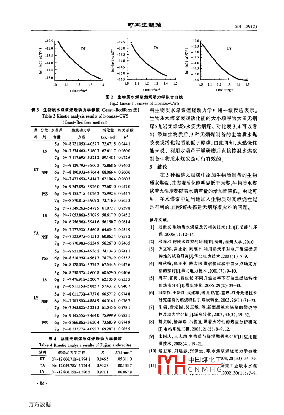第29卷第2期可再生能驃Vol 29 No. 22011年4月Renewable Energy ResourcesApr.2011生物質(zhì)水煤漿燃燒特性及動力學(xué)分析鄧暉,林榮英,羅祖云,林誠(福州大學(xué)化學(xué)工程與技術(shù)研究所,福建福州350108)摘要:采用熱綜合分析儀,利用TG-DTG熱分析技術(shù)研究了以福建省無煙煤、水葫蘆添加劑制備的生物質(zhì)煤漿的燃嬈特性,并與煤粉的燃燒特性進行了對比。結(jié)果表明,生物質(zhì)水煤漿的著火溫度比煤粉低,并隨著水葫蘆添加量的增加呈降低趨勢。動力學(xué)分析得出的表觀活化能從大到小順序為龍巖無煙煤、大田無煙煤、永安無煙煤、龍巖生物質(zhì)水煤漿、大田生物質(zhì)水煤漿、永安生物質(zhì)水煤漿。關(guān)鍵詞:生物質(zhì)水煤漿;熱重分析;著火溫度;動力學(xué)分析中圖分類號:TK6;TQ534.4文獻標志碼:A文章編號:1671-5292(2011)02-0081-04Combustion characteristic and kinetics analysis onbiomass coal water slurryDENG Hui, LIN Rong-ying, LUO Zu-yun, LIN Cheng(Institute of Chemical Engineering and Technolog, Fuzhou University, Fuzhou 350108, China)Abstract: In this paper, the combustion characteristic of biomass coal water slurry (biomassCWS), which made up of Fujian anthracite, water hyacinth and dispersant was studied by thermalanalysis with TG-DTG method. The combustion characteristic of biomass coal water slurry wascompared with that of coal. The results showed that the kindling point of biomass coal water slurrywas lower than that of coal, and decreased with the increase of biomass content. The order ofparent activation energies was Longyan coal, Datian coal, Yongan coal, Longyan biomass-CWS, Daian biomss-CWS and Yongan -biomss-CWS.Key words: biomass coal water slurry; thermal analysis; kindling point kinetics analysis引言漿是劉世義提出的利用工業(yè)上的污泥制煤漿叫福建省98%的煤炭資源均為揮發(fā)分低、灰熔本課題提出利用水葫蘆、福建無煙煤以及其點低、著火點高、燃燒性差、粉碎性強的低活性無他助劑制備新型生物質(zhì)水煤漿,作為替代重油用煙煤,限制了其在福建省多種地方工業(yè)中的直接于燃燒,以降低燃料成本,既提髙了無煙煤的燃燒應(yīng)用。氣化活性又降低了煤的用量,并且充分利用了生目前,采煤機械化程度的提高使粉煤的產(chǎn)量物質(zhì)資源急劇增加,世界各國開發(fā)了以煤代油的新型潔凈前期試驗得出的生物質(zhì)水煤漿具有良好的流燃料——煤漿燃料,種類主要有油煤漿、水煤漿、動性和穩(wěn)定性,但還需進一步研究生物質(zhì)水煤漿的油水煤漿、甲醇煤漿、生物質(zhì)水煤漿。已開發(fā)的各燃燒特性,為其應(yīng)用于工業(yè)生產(chǎn)作出評價。熱重分析種煤漿一般都選用揮發(fā)分含量高、活性好的煤。甲是研究煤的燃燒特性最常用的方法之一,它利用熱醇煤漿由于甲醇的來源限制以及成本高,使其開天平在一定氣氛和一定程序升溫的條件下,研究發(fā)應(yīng)用受到限制。目前文獻上査到的生物質(zhì)水煤煤的重量隨溫度變化的規(guī)律—燃燒特性曲線收稿日期:201003-25。基金項目:福建省科技廳青年人才項目資助(2006F3070)作者簡介:鄧暉(1983-),男,福建明人,碩士,主要從事煤化T的研究工LE中國煤化工CNMHG通訊作者:林榮英(1972-),女,福建建甌人,博士,副教授,主要從事煤化工、生切m配wus:y@fzu.edu.cn可再生能源0l1,29(2)從而確定煤的著火溫度等,并且通過特征數(shù)據(jù)可時平行線的交點C所對應(yīng)的溫度T定義為著火以確定煤樣的燃燒性能。利用TG-DIG直接確定溫度。煤粉及其在不同條件下制得的生物質(zhì)水煤漿在空本試驗中,經(jīng) NETZSCH409測量的熱分析曲氣氣氛下的著火點,具有快捷、簡便的特點國。線即為TG曲線,其一階導(dǎo)數(shù)即為DTG曲線,利試驗內(nèi)容用 NETZSCH409自帶分析軟件能夠準確地確定1.1樣品制備生物質(zhì)水煤漿燃燒時的著火溫度。試驗采用的煤樣為福建3種不同產(chǎn)地的無煙在3種福建無煙煤中,分別添加2.5%,3%和煤:大田無煙煤(DT)、永安無煙煤(YA)、龍巖無35%的生物質(zhì),以1%木質(zhì)素磺酸鈉作為分散劑煙煤(LY),煤樣的工業(yè)分析和元素分析見表1。試制備生物質(zhì)水煤漿,利用熱天平在空氣氣氛下,以驗選用3種陰離子分散劑:聚苯乙烯磺酸(PSS)、程序升溫法進行燃燒試驗,可以得到生物質(zhì)水煤亞甲基萘磺酸鹽甲醛縮合物(NSF)、木質(zhì)素磺酸漿的重量隨溫度變化的燃燒特性曲線。以同樣的鈉(LS)。測試條件對生物質(zhì)(水葫蘆)進行熱重分析,二者褒1煤樣的工業(yè)分析和元素分析的燃燒特性曲線如圖1所示。通過TG-DTG法可Table I Proximate analysis and ultimate analysis of coal以得到不同配比的生物質(zhì)水煤漿的著火溫度(表工業(yè)分析元素分析F M, A V va C H 0 N S2)。大田72.1004921.2826934473.321.232680.57043永安80.190.7113.722482908098140247064008物盾龍巖66730.9719075.887.3572.861693510.801.10制備生物質(zhì)水煤漿的步驟如下:將新鮮水葫蘆洗凈,經(jīng)120℃干燥24h后,通過德國 IKA AI1分析研磨機研磨,所得水葫蘆粉狀物作為生物質(zhì)。30將無煙煤用球磨機研磨至粒度小于0.075mm,占10020030040050060070080075%,稱取質(zhì)量分數(shù)為55%的無煙粉煤,分散劑用溫度量為整個試樣質(zhì)量的1%(質(zhì)量分數(shù))。將干燥研圖1生物質(zhì)水煤漿燃燒特性曲線(大田無煙煤Fig 1 Combustion characteristic curves for磨后的水葫蘆按整個試樣的2%,3%,35%(質(zhì)Datian biomass-CWS量分數(shù))摻入,其余為水,恒溫25℃