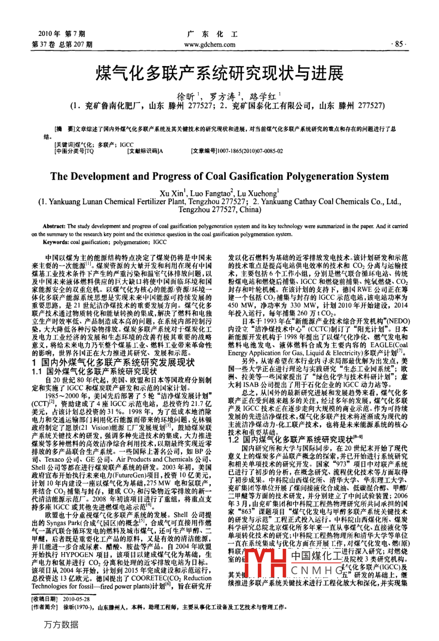2010年第7期廣東化工第37卷總第207期www.gdchem.com●85.煤氣化多聯(lián)產(chǎn)系統(tǒng)研究現(xiàn)狀與進(jìn)展徐昕',羅方濤',路學(xué)紅1(1.兗礦魯南化肥廠,山東滕州277527; 2.兗礦國泰化工有限公司,山東滕州277527)[擠 要]文章綜述了國內(nèi)外煤氣化多聯(lián)產(chǎn)系統(tǒng)及其關(guān)鍵技 術(shù)的研究現(xiàn)狀和進(jìn)展,對當(dāng)前煤氣化多聯(lián)產(chǎn)系統(tǒng)研究的重點(diǎn)和存在的問題進(jìn)行了總|關(guān)鍵詞)煤氣化;多聯(lián)產(chǎn); ICCC中圖分類號TQ[文獻(xiàn)標(biāo)識碼]A[文章編號100-7186120)7-0085-02The Development and Progress of Coal Gasification Polygeneration SystemXu Xin', Luo Fangtao', Lu Xuehong'(1. Yankuang Lunan Chemical Fertilizer Plant, Tengzhou 277527; 2. Yankuang Cathay Coal Chemicals Co., Ltd,Tengzhou 277527, China)Abstract: The study development and progress of coal gasifcation polygeneration system and its key tchnology were summarized in the paper. And it camriedon the summary to the research key point and the existence question in the coal gasification polygeneration system.Keywords: coal gaication; polyeneraion; 1GCC中國以煤為主的能源結(jié)構(gòu)特點(diǎn)決定了煤炭仍將是中國未發(fā)以化石燃料為基礎(chǔ)的近零排放發(fā)電技術(shù)。該計劃研發(fā)和示范來主要的一一次能源"。煤炭資源的大量開發(fā)和利用在現(xiàn)有中國的技術(shù)重點(diǎn)是提高電站供電效率的技術(shù)和CO,分離與運(yùn)輸技煤基工業(yè)技術(shù)條件下產(chǎn)生的嚴(yán)重污染和溫室氣體排放問題,以術(shù),主要包括6個工作小組,分別是燃?xì)饴?lián)合循環(huán)電站、傳統(tǒng)及中國未來液體燃料供應(yīng)的巨大缺口將使中國面臨環(huán)境和國粉煤電站和燃饒后捕集、IGCC和燃燒前捕集、純氧燃燒、CO2家能源安全的雙重危機(jī)。以煤氣化為核心的能源資源/環(huán)境封存和葉輪機(jī)械。在該計劃的支持下,德國RWE公司正在籌體化多聯(lián)產(chǎn)能源系統(tǒng)思想是實(shí)現(xiàn)未來中國能源可持續(xù)發(fā)展的建一個包括CO2捕集與封存的IGCC示范電站,該電站功率為重要思路,是21世紀(jì)潔凈煤技術(shù)的重要發(fā)展方向。煤氣化450 MW,凈功率為330 MW,計劃2010年開始建設(shè),2014聯(lián)產(chǎn)技術(shù)通過物質(zhì)轉(zhuǎn)化和能量轉(zhuǎn)換的集成,解決了燃料和電獨(dú)年投入運(yùn)行,每年捕集260萬o立生產(chǎn)時效事低、產(chǎn)品制造成本高的問題,在系統(tǒng)內(nèi)部控制污日本于 1993年在“新能源產(chǎn)業(yè)技術(shù)綜合開發(fā)機(jī)構(gòu)"(NEDO)內(nèi)設(shè)立“潔凈煤技術(shù)中心”(CCTC)制訂了“陽光計劃”。日本及電力工業(yè)經(jīng)濟(jì)的發(fā)展和生態(tài)環(huán)境的改善有極其重要的戰(zhàn)略新能源開發(fā)機(jī)構(gòu)于1998年提出了以煤氣化凈化、燃?xì)獍l(fā)電和意義,將給未來電力乃至整個煤基工業(yè)、燃料工業(yè)帶來革命性燃料電池發(fā)電、液體燃料合成為主要內(nèi)容的EAGLE(Coal的影響,世界各國正在大力推進(jìn)其研究、發(fā)展和示范。Energy Application for Gas, Liquid & Electricity)多 聯(lián)產(chǎn)計劃7。1國內(nèi)外煤氣化多聯(lián)產(chǎn)系統(tǒng)研究發(fā)展現(xiàn)狀另外,從寄希望在本行業(yè)內(nèi)尋求局部最優(yōu)解為出發(fā)點(diǎn),美1.1 國外煤氣化多聯(lián)產(chǎn)系統(tǒng)研究現(xiàn)狀國一些大學(xué)正在進(jìn)行理論與實(shí)踐研究“生態(tài)工業(yè)園系統(tǒng)”;歐自20世紀(jì)80年代起,美國、歐盟和日本等國政府分別制洲、拉美等一些國家提出了“綠色化學(xué)與技術(shù)科研計劃”;意定和實(shí)施了IGCC和煤炭聯(lián)產(chǎn)研發(fā)和示范的國家計劃。大利ISAB公司提出了用于石化企業(yè)的IGCC動力站等。1985~2000年,美國先后部署了5輪“潔凈煤發(fā)展計劃”總之,從同外的最新研究進(jìn)展和發(fā)展趨勢來看,煤氣化多(CCT)?,資助建成了4座IGCC示范電站,總投資約21.7億聯(lián)產(chǎn)正在受到越來越多的關(guān)注,經(jīng)過多年的發(fā)展,煤氣化多聯(lián)美元,占該計劃總投資的31 %。1998 年,為了低成本地消除產(chǎn)及IGCC技術(shù)正在逐步走向大規(guī)模的商業(yè)示范。作為叮持續(xù)電力和交通運(yùn)輸部J利用化石能源而帶來的環(huán)境問題,克林頓發(fā)展的先進(jìn)潔凈煤技術(shù),煤氣化多聯(lián)產(chǎn)技術(shù)將逐漸成為現(xiàn)代的政府制定了愿景(21 Vision)能源 廠發(fā)展規(guī)劃),鼓勵煤炭聯(lián)主流潔凈煤動力一化工聯(lián)產(chǎn)技術(shù),也將是未來能源系統(tǒng)的核心產(chǎn)系統(tǒng)關(guān)鍵技術(shù)的研發(fā),強(qiáng)調(diào)多種先進(jìn)技術(shù)的集成,大力推進(jìn)技術(shù)和重要基礎(chǔ)。煤炭等多種燃料的高效潔凈綜合利用技術(shù),以期最終實(shí)現(xiàn)近零1.2國內(nèi)煤氣化多聯(lián)產(chǎn)系統(tǒng)研究現(xiàn)狀1-甸排放的多產(chǎn)品聯(lián)合生產(chǎn)系統(tǒng)。一些國際上著名公司,如BP公國內(nèi)研究所和大學(xué)與國際同步,在20世紀(jì)末開始了現(xiàn)代司、Texaco公司、GE公司Air Products and Chemicals公司意義上的煤炭多產(chǎn)品聯(lián)產(chǎn)概念的探索,并已開始進(jìn)行系統(tǒng)研究Shell公司等都在進(jìn)行煤炭聯(lián)產(chǎn)系統(tǒng)的研發(fā)。2003年初,美國和相