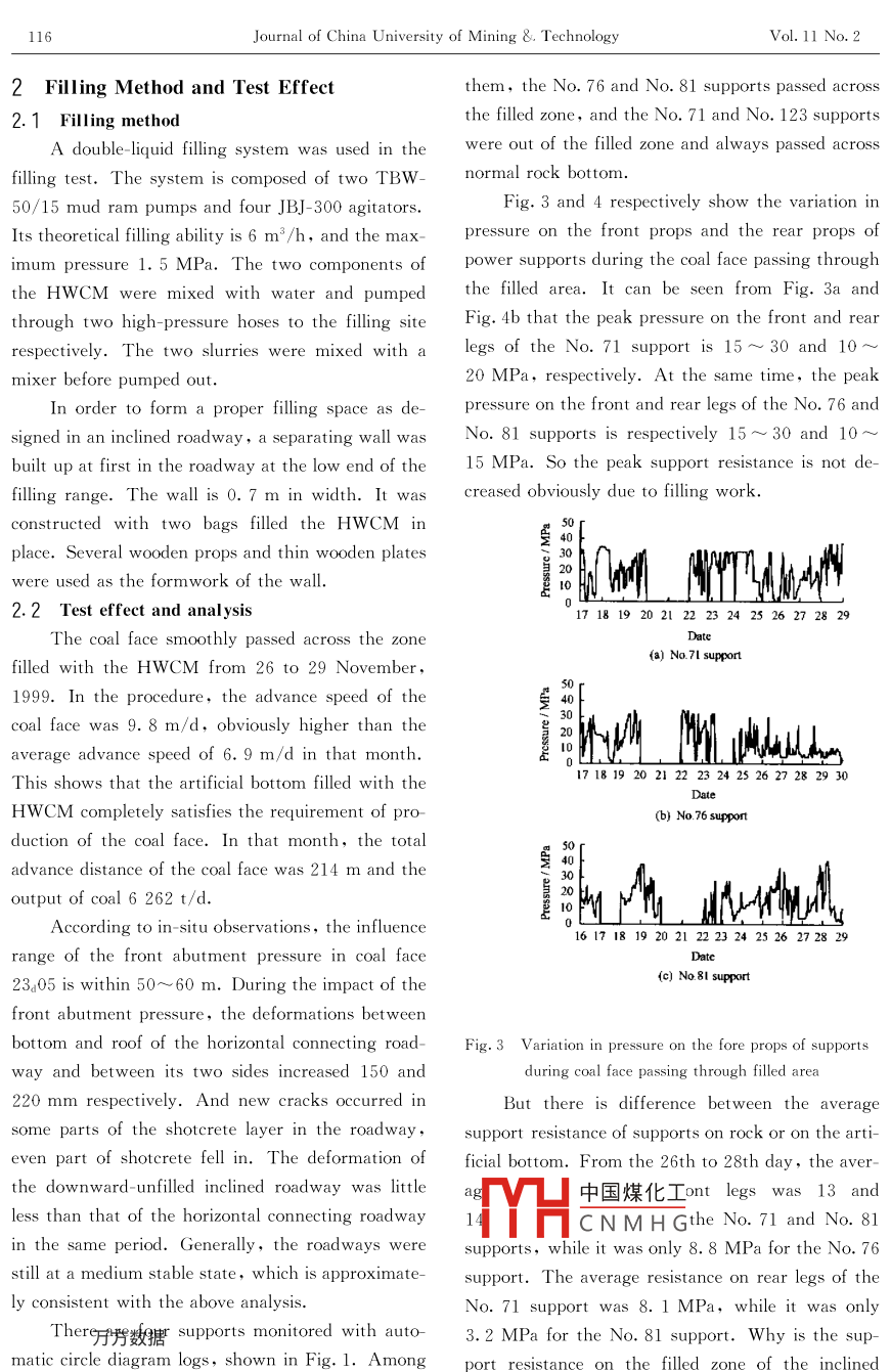 Dec.2001Journal of China University of Mining & TechnologVol 11 No. 2Study on Filling Cross-Roadway inFully-Mechanized Coal Faces withHigh Water-Content MaterialZHOU Hua- qiang(周華強), WANG Guang-eei(王光偉)LEI Wen-cheng(雷文成)2, Ll Feng(李峰)2, Q0 Qing-he(曲慶賀)21. College of Mineral and Energy Resources, CUMT, Xuzhou, Jiangsu 221008, P R China2. Baodian Colliery, Yanzhou Mining Group Co. Ltd, Zoucheng, Shandong 273513, P R ChinaAbstract: A new method using high water-content material to mechanically fill cross-roadways to formartificial bottom for coal faces was introduced. The reasonable determination of filling range, the opti-mization of the compounding ratio of high water-content material, and the filling technique were dicussed in detail. This new method has been spread after industrial testing in Baodian Collierwith the traditional method, the manual wooden chock method, the new one decreases about 40% ofthe filling range and cost in dealing every one set of cross-roadway in the testing conditionKey words: fully-mechanized coal face; cross-roadway high water-content material; filling; artificialCLC numnrt: TD 327 Document code:a Article ID: 1006-1266(2001)02-0113-05In Chinese coal mines, sublevel main entries theoretical study. The method has the followingare often used where thick coal seams or/and multi- backwardness such as high wood consume, highple coal seams are mined in strips. It is very conve- cost, slow construction speed, great air leakagenient for auxiliary haulage, but requires driving an easy spontaneous combustion and so on. Thereforeinclined cross-roadway at a interval of several hun- it is very useful and necessary to explore an economdred meters to connect the production heading and ic and convenient way of forming artificial bottomthe sublevel main entry. The cross-roadways that and roof. UShigh water-content materiallocate inside a coalface must be filled in advance to (HwCM) to mechanically fill a cross-roadway toform artificial bottom or/and roof for the supports form artificial bottom for mechanized coal faces,aand conveyer of the coalface to pass across. The new test is discussed in detail as follows. It has beenamount of work to fill a cross-roadway inside a coal successively used in Baodian Colliery.face is not big, but very important. If the filling 1 Optimization of Filling Parametersfails to lead to production stop of a high-output and1.1 Conditions of the test fieldhigh-efficiency coalface for one day, the economicThe in-situ test of filling HWCm was arraloss will be up to several million RMBIt the first cross-roadway of the center extractiime. the manual wooden chockgallery of fully-mechanized coal face 23.05 in Baomethod has been used to fill this kind of cross-roadH出中國煤化工1. the testing roadN MH G ofand parameters has been mainly dependent on engiand the drainage roadway of the wining districtneer's experience because of lack of systematicallyBicgrapdlda a ua qian 963-), male, from Chonging. Ph. D. asociate profesor, engaged in the th on strata control and fill-114Journal of china University of mining & TechnologVol, 11 No. 2downward. The distance between the open-off cut 400 mm in thickness. The bolt spacing is 700 mmand the roadway is 165 mX 800 mm. The thickness of shotcrete layer isTrack way100 mm. Before filling test, the road way has everundergone the influence of mining overlaying coalface 2306. The surrounding rock of the testingroadway is still in good condition. The deformationsbetween bottom and floor and bet ween two sides areabout 100 mm. Only has the minority of shotcretelayer taken place smallLocation of coal face 172125Observation date(Nov, 1999The average thickness of the coalseam In coface 23 05 is 3. 4 m, and the depth of excavationnear the testing spot 430 m, the dip angle 3. The(I-I section)bottom and roof conditions of the coal seam areshown in Fig. 2. The phenomenon regulations ofFig 1 Location of the test roadwayunderground pressure of coalfaces in 3d coal seamadjacent to the test spot are shown in Table 1This cross-roadway consists of two parts. Oneis the horizontal portion whose bottom is 0. 6m low-Rock Column/Thickness[ Lithologic characterer than the floor of the coal seam. and the other isShallow grey, small slicesthe inclined portion. The heFinesandell jointed, hard and 5-6trapezoid cross section, whose width is 3. 2 m at topand 4. 3 m at bottom and height 3 m. The slopeof the inclined roadway is 20, and the cross0.5 Grey and black coloon is a semi-circular arch with a height of 3 mFinesandWell beddirsiltstone slicesa width of 3.2 m, and a net section area of 8.6 m2The two portions are supported with bolt-shotcretDunesand13.0bedding hard and denseing. All the bolts are 16X 1 600 mm in specifica-tions, which are anchored with concrete ofFig 2 Columnar section of rocks around the test roadwayTable 1 Phenomenon of underground pressure of coalfaces in 3a coal seamCoalface First caving Periodical caving Front pressure influence Load on support/kNDynamic pressuredistance/mdistance/mdistance/m31274340331351.17FDT4X554K chock-shield power supports are way lower than the floor of the coal seam must beused in coal face 23.05. From the data in Table 1filled, and the allowable specific pressure of fillithe theoretical value of the specific pressure on sup- materials is required properly higher than the pres-port floor-bar is 1.8 MPa under the condition of av- sure on the floor-bares of power supports.erage support working resistance and 2. 1 MPa unThe interaction between an inclined roadwayder the maximum support working resistanceand a coal face should be concerned in order to deal2 Selection of filling range中國煤化工This interaction dependso fill a cross-roadway as artificial bottom of aHCNMHGdway to the coal seatcoal face must assure that supports in the coal face The farther the inclined roadway is from the seamcan stride across the roadway safely, and the floor, the smaller the influence of 