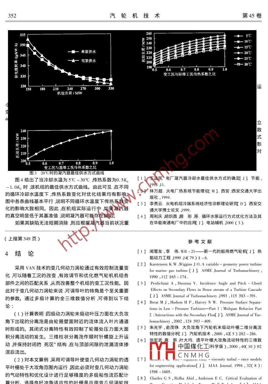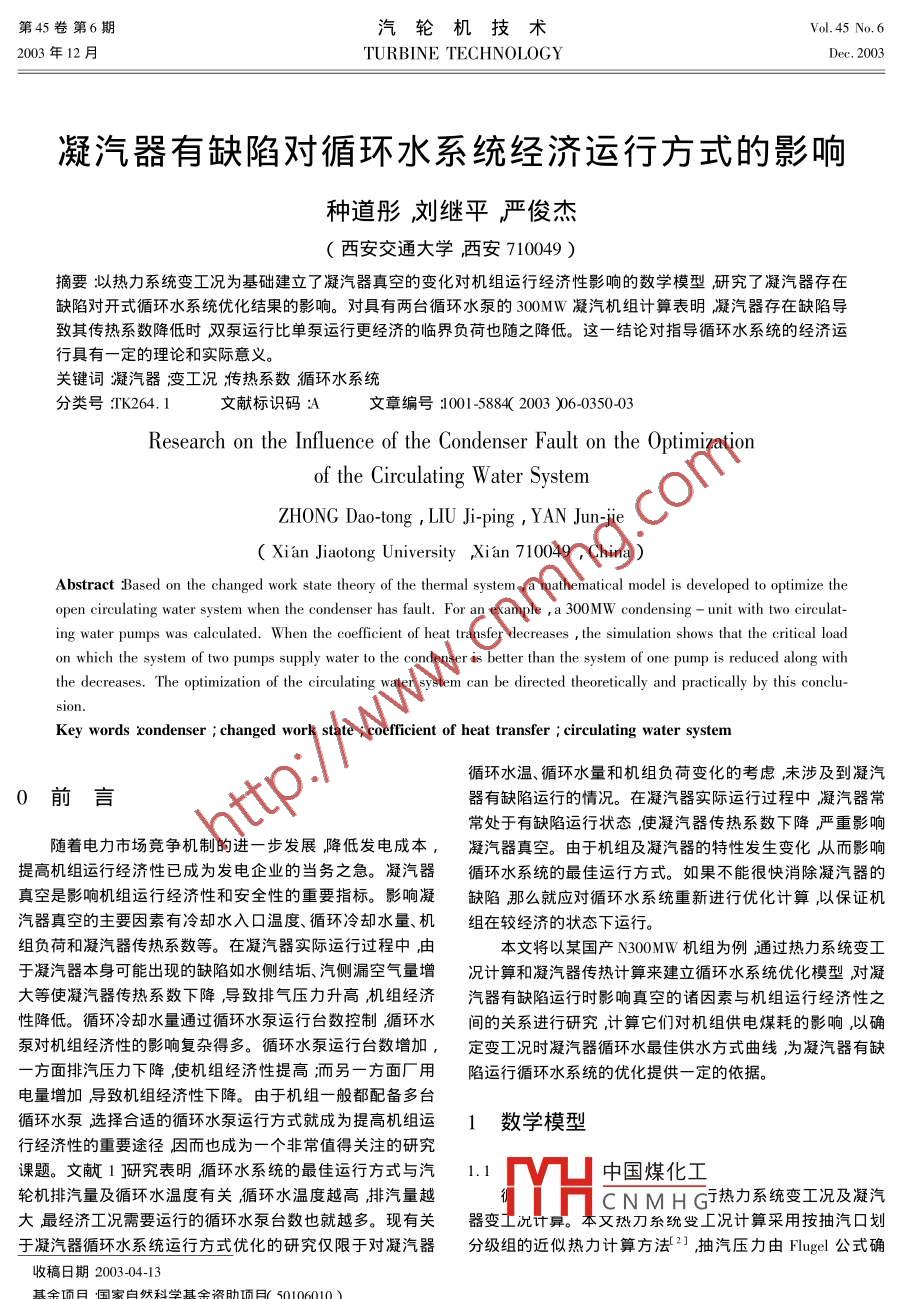 第45卷第6期汽輪機(jī)技術(shù)Vol. 45 No.62003年12月TURBINE TECHNOLOGYDec.2003凝汽器有缺陷對(duì)循環(huán)水系統(tǒng)經(jīng)濟(jì)運(yùn)行方式的影響種道彤,劉繼平,嚴(yán)俊杰(西安交通大學(xué),西安710049 )摘要:以熱力系統(tǒng)變工況為基礎(chǔ)建立了凝汽器真空的變化對(duì)機(jī)組運(yùn)行經(jīng)濟(jì)性影響的數(shù)學(xué)模型研究了凝汽器存在缺陷對(duì)開(kāi)式循環(huán)水系統(tǒng)優(yōu)化結(jié)果的影響。對(duì)具有兩臺(tái)循環(huán)水泵的300MW凝汽機(jī)組計(jì)算表明凝汽器存在缺陷導(dǎo)致其傳熱系數(shù)降低時(shí),雙泵運(yùn)行比單泵運(yùn)行更經(jīng)濟(jì)的臨界負(fù)荷也隨之降低。這-結(jié)論對(duì)指導(dǎo)循環(huán)水系統(tǒng)的經(jīng)濟(jì)運(yùn)行具有-定的理論和實(shí)際意義。關(guān)鍵詞凝汽器變工況;傳熱系數(shù)循環(huán)水系統(tǒng)分類號(hào):TK264. 1文獻(xiàn)標(biāo)識(shí)碼:A文章編號(hào):1001-5884 2003 )06-0350-03Research on the Influence of the Condenser Fault on the Optimizationof the Circulating W ater SystemZHONG Dao-tong , LIU Ji-ping , YAN Jun-jie( Xian Jiaotong University ,Xian 710049 , China )Abstract :Based on the changed work state theory of the thermal system , a mathematical model is developed to optimize theopen circulating water system when the condenser has fault. For an example ,a 300MW condensing - unit with two circulat-ing water pumps was calculated. When the coefficient of heat transfer decreases , the simulation shows that the critical loadon which the system of two pumps supply water to the condenser is better than the system of one pump is reduced along withthe decreases. The optimization of the circulating water system can be directed theoretically and practically by this conclu-sion.Key words condenser ; changed work state ; cofficient of heat transfer ; circulating water system循環(huán)水溫、循環(huán)水量和機(jī)組負(fù)荷變化的考慮,未涉及到凝汽0前言器有缺陷運(yùn)行的情況。在凝汽器實(shí)際運(yùn)行過(guò)程中凝汽器常常處于有缺陷運(yùn)行狀態(tài),使凝汽器傳熱系數(shù)下降,嚴(yán)重影響隨著電力市場(chǎng)競(jìng)爭(zhēng)機(jī)制的進(jìn)一步發(fā)展 降低發(fā)電成本,凝汽器真空。 由于機(jī)組及凝汽器的特性發(fā)生變化,從而影響提高機(jī)組運(yùn)行經(jīng)濟(jì)性已成為發(fā)電企業(yè)的當(dāng)務(wù)之急。凝汽器循環(huán)水系統(tǒng)的最佳運(yùn)行方式。如果不能很快消除凝汽器的真空是影響機(jī)組運(yùn)行經(jīng)濟(jì)性和安全性的重要指標(biāo)。影響凝缺陷那么就應(yīng)對(duì)循環(huán)水系統(tǒng)重新進(jìn)行優(yōu)化計(jì)算,以保證機(jī)汽器真空的主要因素有冷卻水入口溫度、循環(huán)冷卻水量、機(jī)組在較經(jīng)濟(jì)的狀態(tài)下運(yùn)行。組負(fù)荷和凝汽器傳熱系數(shù)等。在凝汽器實(shí)際運(yùn)行過(guò)程中,由本文將以某國(guó)產(chǎn)N300MW機(jī)組為例通過(guò)熱力系統(tǒng)變工于凝汽器本身可能出現(xiàn)的缺陷如水側(cè)結(jié)垢、汽側(cè)漏空氣量增況計(jì):算和凝汽器傳熱計(jì)算來(lái)建立循環(huán)水系統(tǒng)優(yōu)化模型對(duì)凝大等使凝汽器傳熱系數(shù)下降,導(dǎo)致排氣壓力升高,機(jī)組經(jīng)濟(jì)汽器有缺陷運(yùn)行時(shí)影響真空的諸因素與機(jī)組運(yùn)行經(jīng)濟(jì)性之性降低。循環(huán)冷卻水量通過(guò)循環(huán)水泵運(yùn)行臺(tái)數(shù)控制循環(huán)水間的關(guān)系進(jìn)行研究,計(jì)算它們對(duì)機(jī)組供電煤耗的影響,以確泵對(duì)機(jī)組經(jīng)濟(jì)性的影響復(fù)雜得多。循環(huán)水泵運(yùn)行臺(tái)數(shù)增加,定變工況時(shí)凝汽器循環(huán)水最佳供水方式曲線,為凝汽器有缺-方面排汽壓力下降,使機(jī)組經(jīng)濟(jì)性提高;而另一方面廠用陷運(yùn)行循環(huán)水系統(tǒng)的優(yōu)化提供-定的依據(jù)。電量增加導(dǎo)致機(jī)組經(jīng)濟(jì)性下降。由于機(jī)組一般都配備多臺(tái)循環(huán)水泵選擇合適的循環(huán)水泵運(yùn)行方式就成為提高機(jī)組運(yùn)1 數(shù)學(xué)模型行經(jīng)濟(jì)性的重要途徑因而也成為-個(gè)非常值得關(guān)注的研究課題。文獻(xiàn)1 ]研究表明,循環(huán)水系統(tǒng)的最佳運(yùn)行方式與汽.1中國(guó)煤化工輪機(jī)排汽量及循環(huán)水溫度有關(guān),循環(huán)水溫度越高排汽量越.YHc N M H G于熱力系統(tǒng)變工況及凝汽大最經(jīng)濟(jì)工況需要運(yùn)行的循環(huán)水泵臺(tái)數(shù)也就越多?,F(xiàn)有關(guān)器變工況計(jì)異。本又熱刀糸統(tǒng)歲. [況計(jì)算采用按抽汽口劃于凝汽器循環(huán)水系統(tǒng)運(yùn)行方式優(yōu)化的研究?jī)H限于對(duì)凝汽器分級(jí)組的近似熱力計(jì)算方法[2]抽汽壓力由Flugel 公式確收稿日期2003-04-13基金項(xiàng)目國(guó)家自然科學(xué)基金資助項(xiàng)目( 50106010 )作者簡(jiǎn)介扁殖蕤滿78- )男西安交通大學(xué)熱能工程碩士研究生。第6期種道彤等凝汽器有缺陷對(duì)循環(huán)水系統(tǒng)經(jīng)濟(jì)運(yùn)行方式的影響351凝汽器總體傳熱系數(shù)。而/Tolq。=h,-hee( 12)(1)D。Np-N T,Alm =-.(13)式中D為通過(guò)某-級(jí)組的蒸汽流量 p為蒸汽壓力下標(biāo)1、In(4 +8)δ2分別表示級(jí)組前后,有下標(biāo)0表示為基準(zhǔn)工況參數(shù