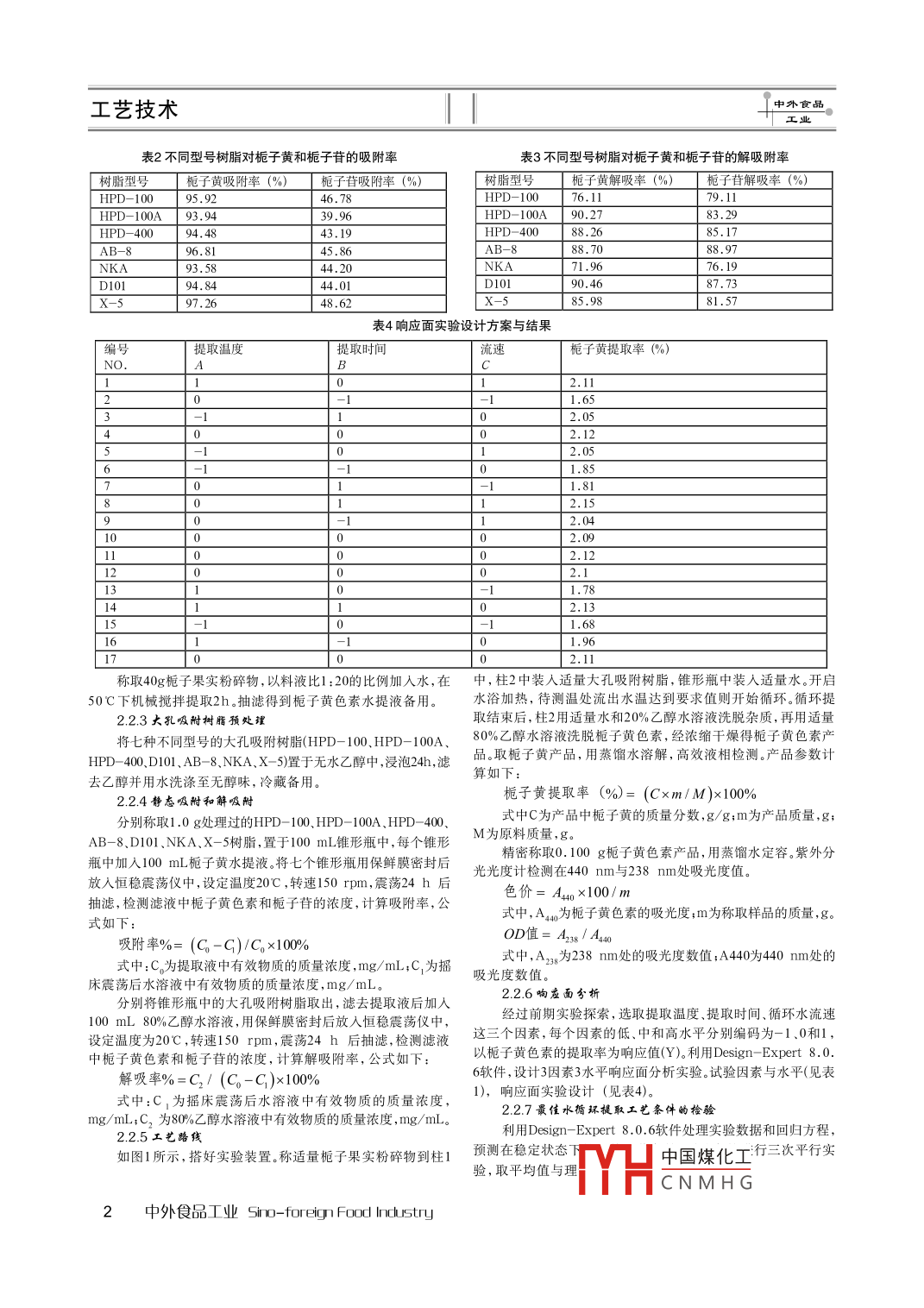 中外食工藝技術(shù)循環(huán)水提取梔子黃色素的研究逯恒馮雯*朱興一(浙江工業(yè)大學(xué)綠色制藥協(xié)同創(chuàng)新中心藥學(xué)院浙江杭州310014)摘要:為了從梔子果實中分離純化得到了品質(zhì)較高的梔子黃色素,創(chuàng)新的采用了循環(huán)水提取與大孔樹脂分離純化相結(jié)合的方法。通過靜態(tài)吸附與解吸附實驗篩選樹脂,并利用響應(yīng)面實驗設(shè)計對禔取工藝條件進行優(yōu)化。結(jié)釆表明,HIPD-100A樹脂對梔子黃色素選擇性髙,適宜純仳梔子黃色素循環(huán)水提取梔子黃的較佳實驗條件為:提取溫度6σ℃,提取時間4.5h,循環(huán)流速12mL/min,此條件下,梔子黃色素提取率達到2.14%,梔子黃產(chǎn)品OD小于0.35,色價大于420。該方法工藝簡單,成本低,梔子黃提取率較高,為梔子黃色素的工業(yè)生產(chǎn)提供參考。關(guān)鍵詞:梔子果實梔子黃色素循環(huán)水提取分離純化中圖分類號TS2023文獻標(biāo)識碼:A文章編號:1672-5336(201506-0001-031引言苷標(biāo)準(zhǔn)品(≥98%),購于中國食品藥品鑒定研究院;大孔吸附樹梔子黃色素是一種水溶性的類胡蘿卜素,有較高的營養(yǎng)價脂:HPD-10HPD=104、AB-8、HPD-40、NKA、D101、x-5,值,極易被人體吸收,在體內(nèi)可轉(zhuǎn)化成維生素A,補充人體維生均購于滄州寶恩化工有限公司素研究表明,梔子黃色素還有抗癌和抗氧化的特性(。因此,2.2實驗方法梔子黃色素在食品、藥品等行業(yè)有廣泛應(yīng)用,是一種著色力強、2.2.1梔子黃色素和梔子苷標(biāo)準(zhǔn)曲線安全性好并具有營養(yǎng)保健作用的天然植物色素。(1)梔子黃色素標(biāo)準(zhǔn)曲線的制備。精密稱取西紅花苷I標(biāo)準(zhǔn)梔子果實中有效成分的提取方法有溶劑浸提法34、滲漉品(≥98%0525mg,去離子水稀釋制備梯度溶液,高效液相色法凹、超聲提取法、微波提取法等。其中乙醇浸提法較其他方譜檢測峰面積。色譜條件:色譜柱: Eclipse XDB-C18柱(4.6法更適于工業(yè)生產(chǎn),但是生產(chǎn)工藝比較復(fù)雜,而且乙醇成本較10mm);流動相:乙腈/水(20:80,v/v,0-5min;50:50高。以水代替乙醇,可以節(jié)省成本,但提取率偏低,且提取液中V/v,5-25min);流速:1.0mL/min;色譜柱柱溫:25℃;檢測雜質(zhì)含量高,純化困難。本文采用循環(huán)水提取與大孔樹脂分離波長:440nm;進樣量:10uL。以峰面積為縱坐標(biāo),進樣質(zhì)量純化相結(jié)合的方法,得到純度較高的梔子黃。此方法成本較低,(Hg)為橫坐標(biāo)繪制標(biāo)準(zhǔn)曲線。梔子黃色素標(biāo)準(zhǔn)曲線為工藝簡單,為梔子黃色素工業(yè)生產(chǎn)提供參考y=3732.7x+2.283(R2=0.9995)2材料與方法(2)梔子苷標(biāo)準(zhǔn)曲線的制備。精密稱取梔子苷標(biāo)準(zhǔn)品(≥98%)9.33mg,去離子水稀釋制備梯度溶液,高效液相色譜檢21材料與試劑測峰面積。色譜條件:色譜柱: Edipse XDB-C1(4.6mm×250梔子果實,購于浙江省遂昌縣,于45℃烘箱中烘干24h,粉mm,5um);柱溫:25C;流動相:乙腈-水(12:88);波長:238nm碎至約40目,避光陰涼處備用;西紅花苷標(biāo)準(zhǔn)品(≥98%),梔子流速:6mL/min;進樣量:10uL。以峰面積為縱坐標(biāo),進樣液所海綿F令含質(zhì)量(ug)為橫坐標(biāo)繪制梔子苷的標(biāo)準(zhǔn)曲線。梔子苷標(biāo)準(zhǔn)曲線圖為:y=1454.0x-1.182(R2=1)。2.22梔子黃色素提取液的制備原料樹脂測溫處圖表1實驗裝置圖圖表3流速和時間對梔子黃提取率影響的響應(yīng)面及等高線圖表1試驗因素與水平因素代碼水平提取溫度C提取時間h圖表2流速和溫度對梔子黃提取率影響的響應(yīng)面及等高線圖〖循環(huán)流速收稿日期:2015-03-20項目資助:浙江省科技廳公益技術(shù)研究項目“基于杋槭化學(xué)反應(yīng)的植物有效成分選擇性提取關(guān)鍵技術(shù)硏究”,項目編號:2013C3200作者簡介:逯恒(1991—),男,山東臨沂人,碩士研究生,從事機械化學(xué)方面的研究。中國煤化工通訊作者:馮雯(1979—),女,浙江寧波人,醫(yī)學(xué)碩士,從事機械化學(xué)方面研究CNMHG中外食品工業(yè)- foreign Food Industri工藝技術(shù)中外宦品工業(yè)表2不同型號樹脂對梔子黃和梔子苷的吸附率表3不同型號樹脂對梔子黃和梔子苷的解吸附率樹脂型號梔子黃吸附率(%)梔子苷吸附率(%樹脂型號梔子黃解吸率(%)梔子苷解吸率(%)HPD-10046.78HPD-10076.11HPDHPD-100A90.2783.29HPD-4008826LAB=8887NKa71.96DIOl87.73972648.6285.9881.57表4響應(yīng)面實驗設(shè)計方案與結(jié)果提取溫度提取時間梔子黃提取率(%)ABC1.65002.122.05「000123456700000I100000001001.812.042.121.781.68稱取40g梔子果實粉碎物,以料液比1:20的比例加入水,在中,柱2中裝入適量大孔吸附樹脂,錐形瓶中裝人適量水。開啟50℃下機械攪拌提取2h。抽濾得到梔子黃色素水提液備用。水浴加熱,待測溫處流岀水溫達到要求值則開始循環(huán)。循環(huán)提2.2.3大孔吸附樹脂預(yù)處理取結(jié)束后,柱2用適量水和20%乙醇水溶液洗脫雜質(zhì),再用適量將七種不同型號的大孔吸附樹脂(HPD-100、HPD-100A、80%乙醇水溶液洗脫梔子黃色素,經(jīng)濃縮干燥得梔子黃色素產(chǎn)HPD-400D101、 AB-8NKA、x-5)置于無水乙醇中,浸泡24,濾品,取梔子黃產(chǎn)品,用蒸餾水溶解,高效液相檢測。產(chǎn)品參數(shù)計去乙醇并用水洗滌至無醇味,冷藏備用2.24靜態(tài)吸附和斛吸附梔子黃提取率(%)=(Cxm/M)×100%分別稱取1.0g處理過的HPD-100,HPD-100A、HPD-400式中C為產(chǎn)品中梔子黃的質(zhì)量分