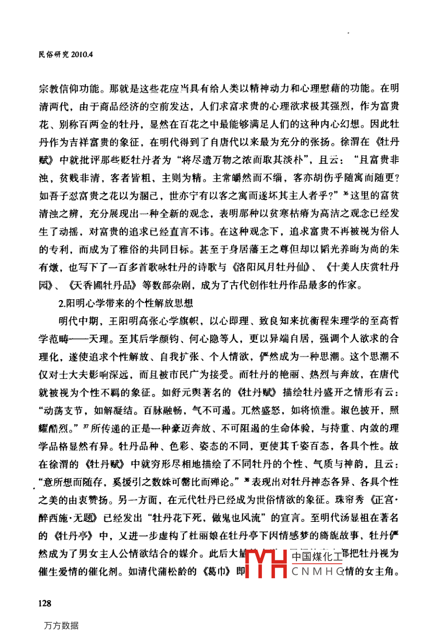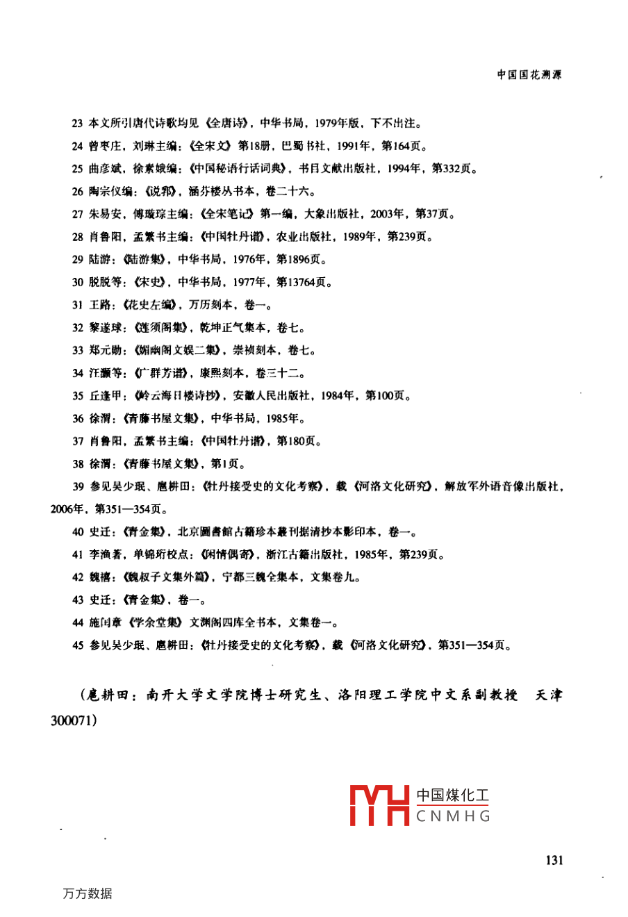中國國花溯源扈耕田摘要:中國正式有國花,始于晚清。然而“國花”的名稱卻至遲在明代中期已經(jīng)出現(xiàn)。考察明清時期國花名稱的出現(xiàn)、指屬及演進(jìn),探尋其間所隱寓的民間心理,對我們理解民族心態(tài)、民族習(xí)俗均有重要意義。關(guān)鍵詞:國花溯源牡丹國花往往是一個國家民族精神、民族心態(tài)的典型體現(xiàn)。中國最早在何時出現(xiàn)國花這一名稱,最早的國花是指什么,她又是因何而被稱為國花,這無疑是關(guān)涉中華民族心態(tài)、民族精神的一個重要問題。1904年(一說1903年)清王朝曾敕立牡丹為國花,并在北京頤和園為牡丹建立國花臺,慈禧親命刻“國花臺”三字于石上。當(dāng)代學(xué)者大都以為此乃中國有國花的起始。如果從現(xiàn)代意義的國花概念來看,這自然是正確的。然而,如果認(rèn)真加以考察,我們就會發(fā)現(xiàn),在文獻(xiàn)記載中,中國早已有國花之名,而且可以確指的僅有牡丹。也就是說,牡丹被稱為國花,在欽定之前有著一個長期被民間認(rèn)可的過程。惜時至今日,這一問題尚未得到系統(tǒng)的梳理,故不揣淺陋,特加考索,并乞教于方家。、國花之稱的文獻(xiàn)考寨(一)明代中期“國花”一詞最早出現(xiàn)系指牡丹根據(jù)筆者的考索,在明代之前古籍中雖有“南國花”、“故國花”等記載,但“國花”并非一個獨立的詞。至明代“國花”作為一個詞始最早出現(xiàn)?,F(xiàn)存最早的記載為李夢陽丹盛開群友來看》一詩:中國煤化工吾家何處牡丹園,揚子崗西古宋原。忽有CNMHG駐江村。憐香中國國花溯源實怕青蘿掩,在野虛愁蔓草繁。碧草舂風(fēng)筵席罷,何人道有國花存。李夢陽(1473-1530),字獻(xiàn)吉,號空同。原籍慶陽(今屬甘肅),童年時徙居于河南開封,為明代前七子領(lǐng)袖。詩中所云“古宋原”即指開封一帶。據(jù)其卒年可知,牡丹最遲在嘉靖九年(1530)已經(jīng)有了國花之稱明代中期另有一處將釷丹稱為國花的記載。邵經(jīng)濟(jì)《柳亭賞牡丹和弘兄韻》有紅芳獨抱春心老,綠醑旋添夜色妍。自信國花來絕代,漫憑池草得新聯(lián)。香窺蜂蝶偏多恨,笑隔云沙亦可仙。勝賞百年拚共醉,繁華那更勝今年。2邵經(jīng)濟(jì)(1493-1558),字仲才,號泉臣,仁和(今浙江杭州)人。該詩雖寫作年代尚無法認(rèn)定,但自不晚于作者的卒年除此之外,明代中期黃省曾的《江南曲》三十首之二十七亦出現(xiàn)了國花一詞九逵擔(dān)雜英,朱門競相買。國花委青郊,零落無人采?!?黃省曾(1490-1540)字勉之,號五岳山人,明代吳縣(今江蘇蘇州)人。惜其詩中之國花所指,今已無法考實。二)晚明牡丹稱為國花者漸眾且出現(xiàn)國花臺建筑至晚明,文獻(xiàn)中將牡丹稱之為國花者漸眾。劉侗《帝京景物略》一書中有北京極樂寺因廣種牡丹而修建國花堂的記載,國花堂遂成為考察國花起源的一條重要線索。(帝京景物略》一書刊刻于崇禎八年(1635),故周士琦先生曾據(jù)此認(rèn)定國花堂的建立應(yīng)在1635年之前?!粐ㄌ媒⒌木唧w時間,周先生卻沒能予以詳考。其實袁中道《坷雪齋集》對此有明確記載極樂寺左有國花堂。前堂以牡丹得名。記癸卯夏,一中貴造此堂既成,招石洋與余飲。伶人演《白兔記》。座中中貴五六人皆哭欲絕,遂不成歡而別。這里明確提到了國花堂建立的時間為“癸卯夏”。袁中道(15701623),字小修,湖北公安人,為著名的公安派三袁之一。中國煤化了卯夏為明萬歷三十一年(1603)夏。這比周士琦先生提出的HHCNMHG121民俗研究20104在袁氏詩文中除“國花堂”之外,亦有單獨提到“國花”一詞者。萬歷四十四年(1616)楊鶴主盟,袁中道等人參與了海淀李威畹園舉行的一次文人雅集。其衠海淀李戚畹園大會》詩有云:“野鶴止同家鶩狎,國花長作圃蔬看?!?所謂李戚畹園乃明神宗朱翊鈞外祖父李偉所建,簡稱“李園”。又因李偉被封為武清侯,亦稱武清侯別業(yè)”,其正式名稱則為“清華園”。其故址位于今北京大學(xué)西墻外,方圓十里,在“都下為名園第一”。7袁中道詩中并未明確所謂的國花究系何指,但考察其園中花卉的種植情況,此一問題便不難解決。據(jù)記載,清華園“植物配置方面,花卉大片種植的比較多,而以牡丹和竹最負(fù)盛名于當(dāng)時,園中有牡丹千計,…園中牡丹有很多異種,以‘綠蝴蝶’為最,開時是稱花海。”8可見清華園之花以牡丹最負(fù)盛名,種植極多,且有花海之稱。袁中道詩中所云“國花長作圃蔬看”自是言牡丹種植之普遍、種植面積之大,故所稱“國花”仍然是指牡丹。與袁中道生活大約同時的一些文人,在其詩文中亦有將牡丹稱之為國花者。如著名詩人、浙江金壇王彥泓(1593-1642)侑有贈》詩云:“國花第一數(shù)姚黃,更共明珠字夜光?!薄阍娭械囊S為牡丹珍品,素有花王之稱。福建郭良翰(生卒年不詳有云:“人生若行路,前經(jīng)險阻,則后必通衢,亦似國花。葩艷獨先,則零落必早?!薄愦颂庪m未明言國花之所指,但文中將國花與葩艷花開之先后進(jìn)行對比,指出國花晚開,正與牡丹暮春始開的特點相吻合。因此結(jié)合當(dāng)時牡丹已經(jīng)被許多人稱為國花的事實,這里的國花指牡丹是無疑義的。除了以上數(shù)人,詩文中“國花”一詞在晚明文集中還出現(xiàn)過一次。沈德符《長至夜聽寒仙歌即席賦贈》云:“合閎添宮線,幃開見國花。顏溫初過酒,吻燥偶需