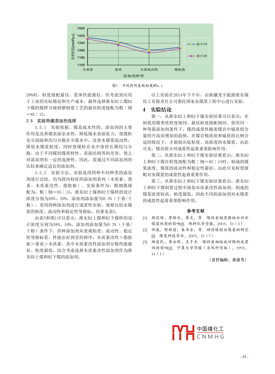 2016年第22期中國高新技術(shù)企業(yè)NO22.201(總第373期)Cumulativity NO 373)提高新疆準東煤水煤漿成漿濃度的實驗研究趙天運王秋生張向沛(新疆龍宇能源準東煤化工有限責任公司,新疆烏魯木齊83000摘要:新疆龍宇能源準東煤化工年產(chǎn)40億立方煤制天然氣氣化工藝采用碎煤加壓氣化與水煤漿氣化工藝組合,充分利用煤礦生產(chǎn)的塊煤和粉煤,提高煤炭資源的利用率,但新疆準東煤田的煤做水煤漿氣化存在成漿性差的問題,怎樣提高新疆準東煤的水煤漿濃度是目前急需解決的問題。文章以新疆準東煤田某露天礦煤為研究對象,研究了提高水煤漿濃度的辦法。關(guān)鍵詞:準東煤;水煤漿;成漿濃度;碎煤加壓;露夭煤礦文獻標識碼:中圖分類號:TQ536文章編號:1009-2374(2016)22-0033-03Dol:10.35351cnki1-446/m.016.20171概述槳試樣,在105℃~110℃下干燥至恒定,干燥后的試樣煤炭是我國的基礎(chǔ)能源,占能源消費總量的70%左質(zhì)量占原樣質(zhì)量的百分數(shù)作為水煤漿濃度右,將來以煤炭為主的能源結(jié)構(gòu)難以改變,隨著水煤漿3.1.2水煤槳粘度測定方法。水煤槳粘度測定方氣化技術(shù)不斷發(fā)展,人們對生產(chǎn)經(jīng)營效益最大化要求越法參照GBT188564200進行,用NS4C型水煤漿粘度來越高,煤的成漿性是水煤漿氣化技術(shù)的核心,完善的計進行測定。制漿工藝對提高水煤漿的濃度和降低水煤漿的成本起著3.1.3水煤漿穩(wěn)定性測定方法。水煤漿穩(wěn)定性測至關(guān)重要的作用。研究中發(fā)現(xiàn)影響水煤漿成漿濃度的因定方法參照GB/T18856.5-2002采用插棒法進行測定素較多,包括制漿用煤的煤巖組分、粒度級配、添加劑32常規(guī)制漿工藝成漿性實驗等均對水煤漿成漿濃度產(chǎn)生影響,下面就如何提高準東在試驗室內(nèi),模擬單磨機制漿工藝生產(chǎn)條件,選擇煤水煤漿濃度進行實驗?zāi)举|(zhì)素改性添加劑,添加量分別在0.3%、0.5%(干基/干粉)比例時,對準東B2上煤和B2下煤煤樣進行成漿性2實驗原料及添加劑實驗,實驗結(jié)果見表2釆用準東煤田某露天礦B2層煤,煤質(zhì)牌號為不粘結(jié)表2常規(guī)制漿工藝條件下的成漿性實驗結(jié)果煤,B2煤層厚度為20米左右,煤層按照成因環(huán)境及煤巖組分可分為B2上和B2下,從煤巖顯微組分上看,B2上惰堞樣名稱添加劑量表觀粘度/穩(wěn)定性濃度%流動性MPa| XXUBG性質(zhì)組組分高,鏡質(zhì)組組分低,B2下鏡質(zhì)組組分明顯高于55.2B2上,B2上及B2下煤的工業(yè)分析與元素分析及煤巖組分龍宇1#分別見表1CCCC表B2上及B2下煤的工業(yè)分析與元素分析(a3.2.1由常規(guī)制漿工藝條件下實驗結(jié)果可以看工業(yè)分析(%元素分析(%出:常規(guī)制漿工藝條件下,在添加劑量為0.3%、0.5%名「MM4 CRCo Cad Had- oad Nade(干基/干粉)時,淮東B2上煤樣的成漿濃度為55.2%B22244692411.774056.1%,準東B2下煤樣的成漿濃度為56.3%、57.5%;同82209412034134328746436268213921160052時隨著添加劑量由0.3%增加到0.5%(干基/干粉)準東B2上煤和B2下煤樣的濃度分別提高0.9和1.2個百B2上及B2下煤的煤巖組分分析b占煤樣名稱。惰質(zhì)組(%)鏡質(zhì)組(%)。礦物質(zhì)(%)3.2.2煤樣的成漿濃度偏低會降低后續(xù)氣化系統(tǒng)9.10.94的氣化效率,增加生產(chǎn)成本,同時考慮煤漿流動性和穩(wěn)B2下474.80.6定性對工業(yè)生產(chǎn)的影響等因素33分級研磨工藝成漿性實驗3實驗根據(jù)國家中國煤化工分級研磨制漿3.1實驗方法工藝,通過優(yōu)什3.1.1水煤漿濃度測定方法。水煤漿濃度測定方率,進而提高煤限廈CNM漿的堆積效能疋位等。在實驗室法參照GB/T18856.2-2002進行,即稱取一定量的水煤對準東B2上煤和B2下煤樣進行了系列的粒度級配和可磨33表3分級研磨制漿工藝條件下的成漿性實驗結(jié)果煤樣名稱添加劑量/%濃度流動性表觀粘度MPas穩(wěn)定性0.358.6B龍宇1#1289B1237B龍宇2并B表4準東B2上煤和B2下煤的最佳粒度級配實驗結(jié)果煤樣鉭:細粉比實際濃度表觀黏度粒度分布(累積含量)/(MPa.s)流動性穩(wěn)定性(8h)14mm<0.45mm<0.075mm<0.0451158723302185:1558.631266B88.7842.9834.5549.6538.14909.68119898.0238.8932.17龍宇2#85:1588.4359.74128545,81表5四種添加劑成漿性能比較煤樣濃度(%)添加劑類表觀黏度(MPas)流動性穩(wěn)定性(8h)58.63木質(zhì)素1401C+B5846萘系1352C+龍宇1#木質(zhì)素改性1266B脂肪族59.68木質(zhì)素萘系l319龍守259.86木質(zhì)素改性1237B59.82脂肪族1282B性試驗硏究,獲得它們最佳粒度級配和比例(粗粉:細準東B2上煤和B2下煤樣在同一添加劑比例情況下粉=80%:20%時,粒度級配最佳,漿體性能最好。但考釆用分級硏磨工藝比常規(guī)單磨機工藝的濃度分別提高慮到應(yīng)用于工業(yè)的實際情況和生產(chǎn)成本,我們最終選擇3個百分點以上,同時煤漿的流動性和穩(wěn)定性大幅度的粒度級配為粗粉:細粉=85%:15%)。提高。添加劑選擇常規(guī)工藝中所用的木質(zhì)素改性添加劑3.4準東制漿用煤最佳粒度級配確定分別在添加量為0.3%、0.5%(干基/干粉)時,對分級將制備好的準東煤粗、細粉分別按照90:10研磨制漿工藝的最髙成漿濃度進行系列實驗,實驗結(jié)果85∶15、80:20的比例混合制漿,并對制得的煤漿進行見表3濃度、粘度、穩(wěn)定性、流變特性等性能測試;準東B2上由分級研磨制漿工藝實驗結(jié)果可以看出:采用分級煤和B2下煤的設(shè)計濃度分別為58%、59%,添加劑的添加研磨制漿工藝條件下,在添加劑量為0.3%、0.5%(