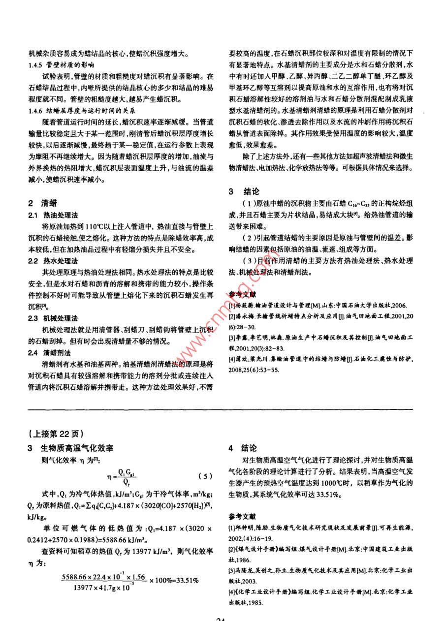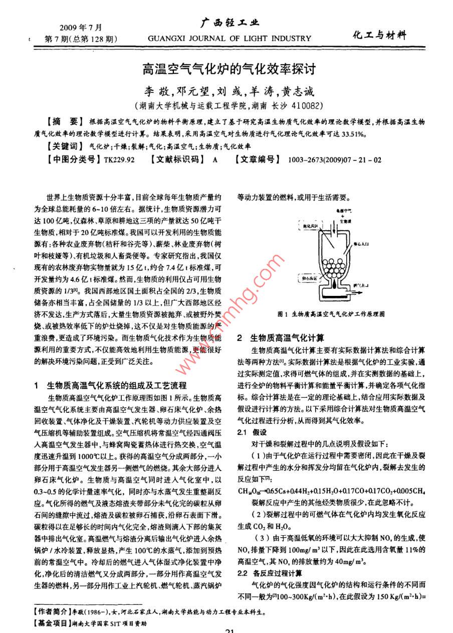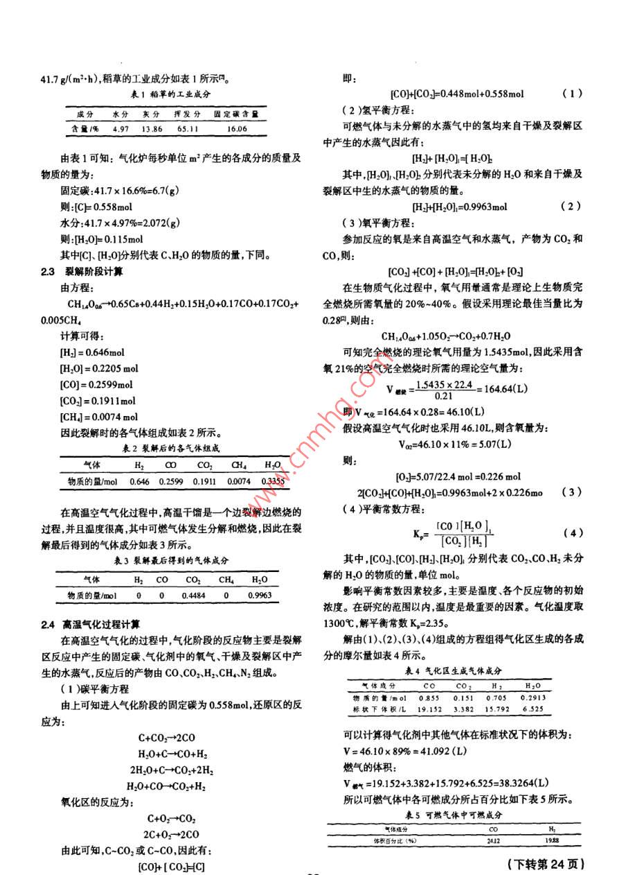 廣西輕工業(yè)2009年7月第7期(總第128期)GUANGXI JOURNAL OF LIGHT INDUSTRY化工與材料高溫空氣氣化爐的氣化效率探討李敬,鄧元望,劉彧,羊濤,黃志誠(湖南大學機械與運載工程學院,湖南長沙410082)[摘要]根據(jù)高溫空氣氣化爐的物料平衡原理,建立了基于研究高溫生物質(zhì)氣化效率的理論教學模型, 并根據(jù)高溫生物質(zhì)氣化效率的理論數(shù)學模型進行計算。結(jié)果表明,采用高溫空氣對生物質(zhì)進行氣化理論氣化效率可達33.51%。[關(guān)鍵詞]氣化爐;干燥;裂解;氣化;高溫空氣;生物質(zhì);氣化效率[中圖分類號] TK229.92 [文獻標識碼] A [文章編號] 1003 -2673(200907 -21-02 :世界.上生物質(zhì)資源十分豐富,目前全球每年生物質(zhì)產(chǎn)量約等動力裝置的燃料,或用于生活需要。為全球總能耗量的6-10倍左右。據(jù)統(tǒng)計,生物質(zhì)資源潛力可群中氣達100億噸,僅森林、草原和耕地這三項的產(chǎn)量就達50億噸千施化風網(wǎng)生物質(zhì),相對于20億噸標準煤。我國可以開發(fā)利用的生物質(zhì)能源有:各種農(nóng)業(yè)廢棄物(秸稈和谷殼等)、薪柴、林業(yè)廢棄物(樹, $6h[葉和枝婭等)、有機垃圾和人畜糞便等。專家研究指出,我國僅has現(xiàn)有的農(nóng)林廢棄物實物量就為15億t,約合7.4億t標準煤,可開發(fā)量約為4.6億↑標準煤。然而,生物質(zhì)的利用僅占可用生物UJ質(zhì)資源的1/3%。我國西部地區(qū)國土面積占全國的2/3,生物質(zhì)儲備亦相當豐富,占全國儲量的1/3以上,但廣大西部地區(qū)經(jīng)濟不發(fā)達,生產(chǎn)方式落后,大量生物質(zhì)資源被拋棄、或被野外焚團1生物質(zhì)高溫空氣氣化爐工作原理圈燒、或被熱效率低下的爐灶燒掉,這不僅是對生物質(zhì)能源的嚴重浪費,更造成了環(huán)境污染。而生物質(zhì)氣化技術(shù)作為生物質(zhì)能2生物質(zhì)高溫氣化計算源利用的重要方式,不僅能高效地利用生物質(zhì)能源,更能很好生物質(zhì)高溫氣化計算主要有實際數(shù)據(jù)計算法和綜合計算的解決環(huán)境污染問題,正受到廣泛關(guān)注。法等兩種方法"。實際數(shù)據(jù)計算法是根據(jù)氣化爐的工業(yè)實驗,通過實際測定值,求得可燃氣體的組成,并在實測數(shù)據(jù)的基礎(chǔ)上,1生物 質(zhì)高溫氣化系統(tǒng)的組成及工藝流程進行全爐的物料平衡計算和能量平衡計算,并確定各項氣化指生物質(zhì)高溫空氣氣化爐工作原理圖如圖1所示。生物質(zhì)高標。綜合計算法是在一-定的理論基礎(chǔ)上,結(jié)合應(yīng)用實際數(shù)據(jù)及溫空氣氣化系統(tǒng)主要由高溫空氣發(fā)生器、卵石床氣化爐、余熱假設(shè)進行計算的方法。以下采用綜合計算法對生物質(zhì)高溫空氣回收裝置、氣體凈化及干燥裝置、汽輪機等動力供應(yīng)裝置及空氣化過程進行分析,從而得到其氣化效率。氣壓縮機等輔助裝置組成??諝鈮嚎s機將常溫空氣經(jīng)四通閥壓2.1假設(shè)入高溫空氣發(fā)生器中,與蜂窩陶瓷蓄熱體進行熱交換,空氣溫對干燥和裂解過程中的幾點說明及假設(shè)如下:度迅速升溫到1000以上。獲得的高溫空氣分成兩部分, - -小( 1 )由于氣化爐在運行過程中需要密閉,因此在干燥及裂部分用于高溫空氣發(fā)生器另-側(cè)燃氣的燃燒。其余大部分進入解過程中產(chǎn)生的水分和揮發(fā)分均留在氣化爐內(nèi),裂解去發(fā)生的卵石床氣化爐。生物質(zhì)與高溫空氣同時進入氣化室中,以反應(yīng)如下網(wǎng):0.3-0.5的化學計量速率氣化,同時亦與水蒸氣發(fā)生重整副反CHyOo +O65Cs+044H2+0.15H.0+0.17C0+0.17C0+0005CH,應(yīng)。氣化所得的燃氣及液態(tài)熔渣夾帶部分未氣化完的碳粒從卵裂解反應(yīng)中產(chǎn)生的其他烴類物質(zhì)很少,在此忽略不計。石間的縫隙中流過,熔渣及碳粒被卵石捕獲,沿卵石表面下滑。(2 )裂解過程中的可燃氣體在氣化爐內(nèi)均發(fā)生氧化反應(yīng)碳粒得以在足夠長的時間內(nèi)氣化完全,熔渣則滴入下部的集灰生成CO2和HO。器中排出氣化室。高溫燃氣與熔渣分離后輸出氣化爐進人余熱(3)由于高溫低氧的環(huán)境可以大大抑制NO,的生成,使鍋爐1水冷裝置,釋放顯熱,產(chǎn)生100C的水蒸氣,添加到預(yù)熱NO,排量下降到100mg/ m'以下,因此在此選用含氧量11%的前的常溫空氣中。冷卻后的燃氣進入氣體濕式凈化裝置中凈高溫空氣,其NO,的排放量約為40mg/ m'。化,凈化后的清潔燃氣又分成兩部分,一部分用作高溫空氣發(fā)2.2 各反應(yīng)過程計算生器的燃料,另-部分用作工業(yè)上汽輪機、燃氣輪機蒸汽鍋爐氣化爐的氣化強度因氣化爐的結(jié)構(gòu)和運行條件的不同而不同一般為2100~300Kg/( m*h),在此假設(shè)為150 Kg/(m2h)=[作者簡介]李敬(1986-).女,河北石家莊人,湖南大學熱能與動力工程專業(yè)本科生。[基金項目]湖南大學國家SIT項目資助41.7 g(m2h),稻草的工業(yè)成分如表1所示R。即:表1稻蕈的工業(yè)成分[CO)+(CO]=0.448mol+0.558mol(1)成分水分灰分揮發(fā)分固定碳含星(2 )氫平衡方程:含量/% 4.97 13.86 65.116.06可燃氣體與未分解的水蒸氣中的氫均來自干燥及裂解區(qū)中產(chǎn)生的水蒸氣因此有:由表1可知:氣化爐每秒單位m2產(chǎn)生的各成分的質(zhì)量及[H]+ [H20]=[ H2O}物質(zhì)的量為:其中,H20]JH2Ob分別代表未分解的H2O和來自干燥及固定碳:41.7x 16.6%=6.7(g)裂解區(qū)中生的水蒸氣的物質(zhì)的量