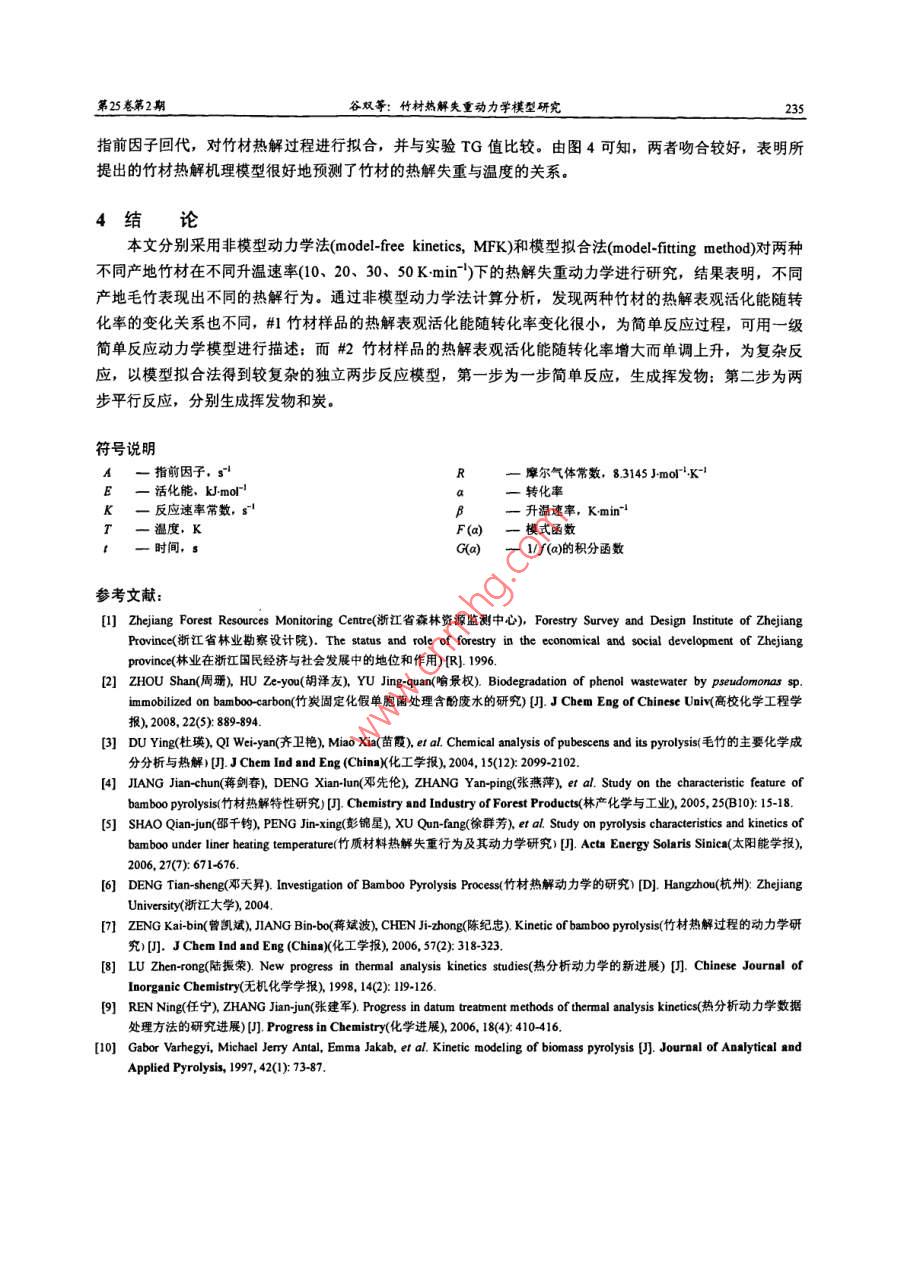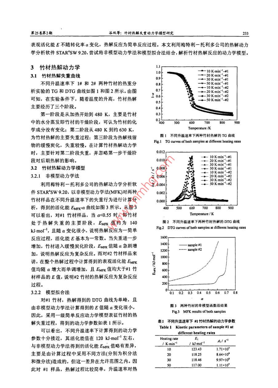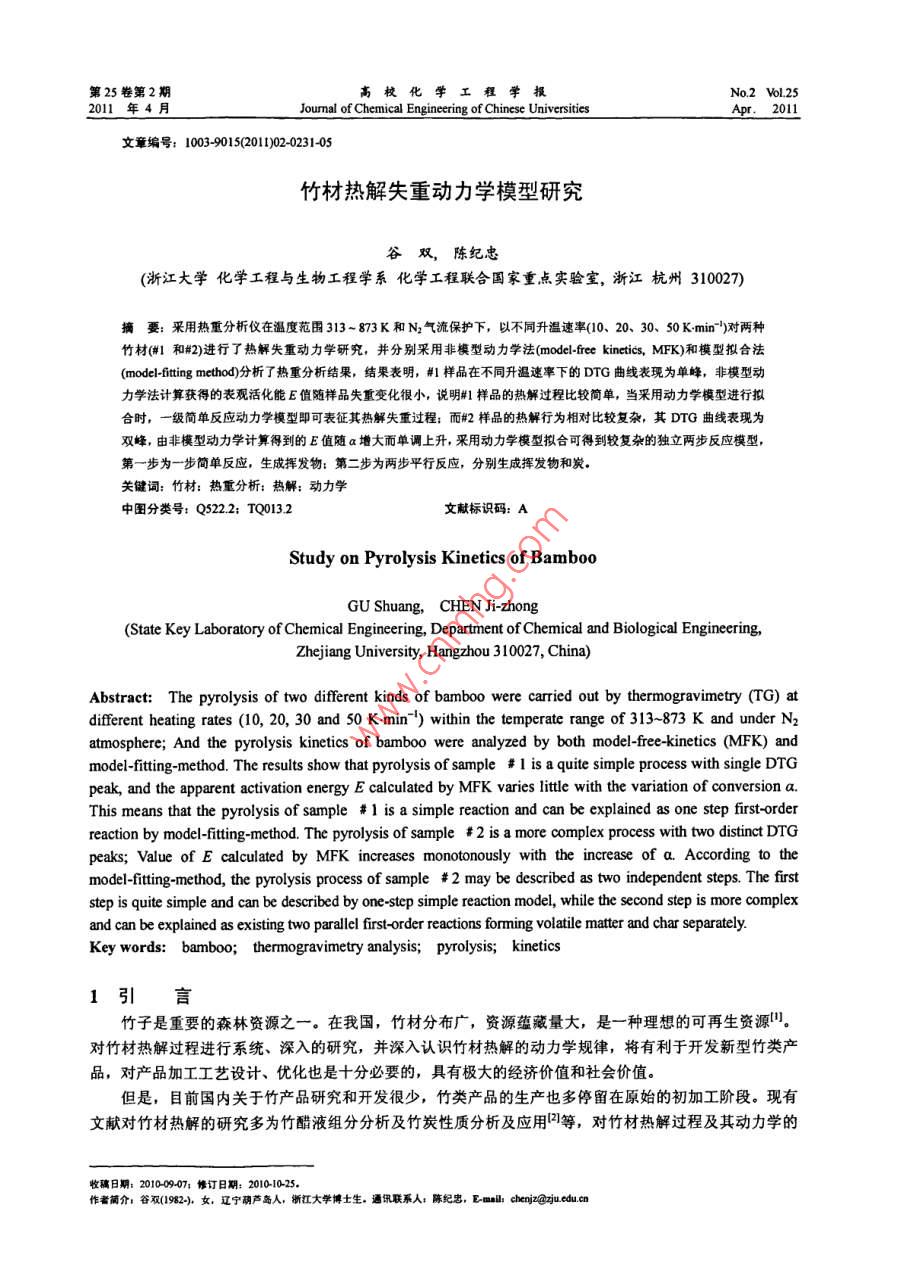第25卷第2期高?;瘜W(xué)工程學(xué)報No.2 Vol.252011年4月Joumnal of Chemical Engineering of Chinese Universitiespr. 2011文章編號: 1003-90152011)02-0231-05竹材熱解失重動力學(xué)模型研究谷雙,陳紀(jì)忠(浙江大學(xué)化學(xué)工程與生物工程學(xué)系化學(xué)工程聯(lián)合國家重點實驗室,浙江杭州310027)摘要:采用熱重分析儀在溫度范圍313- 873K和N2氣流保護(hù)下,以不同升溫速率(10、20、30、 50 K min~)對兩種竹材(#1和#2)進(jìn)行了熱解失重動力學(xué)研究,并分別采用非模型動力學(xué)法(model-frce kinetics, MFK)和模型擬合法(nmodel-fitig method)分析了熱重分析結(jié)果,結(jié)果表明,#1 樣品在不同升溫速率下的DTG曲線表現(xiàn)為單峰,非模型動力學(xué)法計算獲得的表觀活化能E值隨樣品失重變化很小,說明#1樣品的熱解過程比較簡單,當(dāng)采用動力學(xué)模型進(jìn)行擬合時,一級簡單反應(yīng)動力學(xué)模型即可表征其熱解失重過程:而#2 樣品的熱解行為相對比較復(fù)雜,其DTG曲線表現(xiàn)為雙峰,由非模型動力學(xué)計算得到的E值隨a增大而單調(diào)上升,采用動力學(xué)模型擬合可得到較復(fù)雜的獨立兩步反應(yīng)模型,第一步為一步簡單反應(yīng),生成揮發(fā)物:第二步為兩步平行反應(yīng),分別生成揮發(fā)物和炭。關(guān)鍵詞:竹材;熱重分析:熱解:動力學(xué)中圖分類號: Q22.2; TQ013.2文獻(xiàn)標(biāo)識碼: AStudy on Pyrolysis Kinetics of BambooGU Shuang, CHEN Ji-zhong(State Key Laboratory of Chemical Engineering, Department of Chemical and Biological Engineering,Zhejiang University, Hangzhou 310027, China)Abstract: The pyrolysis of two different kinds of bamboo were carried out by thermogravimetry TG) atdifferent heating rates (10, 20, 30 and 50 K min~) within the temperate range of 313~873 K and under N2atmosphere; And the pyrolysis kinetics of bamboo were analyzed by both model-free-kinetics (MFK) andmodel-itting-method. The results show that pyrolysis of sample # 1 is a quite simple process with single DTGpeak, and the apparent activation energy E calculated by MFK varies lttle with the variation of conversion a.This means that the pyrolysis of sample # 1 is a simple reaction and can be explained as one step firstorderreaction by model-itting. method. The pytolysis of sample #2 is a more complex process with two distinct DTGpeaks; Value of E calculated by MFK increases monotonously with the increase of a According to themode-iting-method, the pyrolysis process of sample # 2 may be described as two independent steps. The firststep is quite simple and can be described by one-step simple reaction model, while the second step is more complexand can be explained as existing two parallel first-order reactions forming volatile matter and char separately.Key words: bamboo; thermogravimetry analysis; pyrolysis; kinetics1引言竹子是重要的森林資源之一。在我國,竹材分布廣,資源蘊藏量大,是一種理想的可再生資源!"。對竹材熱解過程進(jìn)行系統(tǒng)、深入的研究,并深入認(rèn)識竹材熱解的動力學(xué)規(guī)律,將有利于開發(fā)新型竹類產(chǎn)品,對產(chǎn)品加工工藝設(shè)計、優(yōu)化也是十分必要的,具有極大的經(jīng)濟(jì)價值和社會價值.但是,目前國內(nèi)關(guān)于竹產(chǎn)品研究和開發(fā)很少,竹類產(chǎn)品的生產(chǎn)也多停留在原始的初加工階段?,F(xiàn)有文獻(xiàn)對竹材熱解的研究多為竹醋液組分分析及竹炭性質(zhì)分析及應(yīng)用2等,對竹材熱解過程及其動力學(xué)的收稿日期: 2010-09.07; 修訂日期: 2010-10-25.作者簡介:谷雙(1982)。 女遼寧葫蘆島人,浙江大學(xué)博士生。通訊聯(lián)系人:陳紀(jì)忠,E-mal chejz@zju edu.cn2332高?;瘜W(xué)工程學(xué)報2011年4月研究鮮見報道。杜瑛等對毛竹進(jìn)行主要化學(xué)成分分析,并給出了其慢速熱解的液體產(chǎn)物的詳細(xì)組成,探討了熱解溫度對產(chǎn)物組成的影響則:蔣劍春等對孝順竹進(jìn)行常規(guī)及快速熱解,研究了竹材在不同熱解條件下液相、固相及氣相產(chǎn)品的組成及得率差異4:邵千鈞等對兩種竹質(zhì)材料(毛竹和孝順竹)的熱解失重行為進(jìn)行了研究,并采用-級反應(yīng)過程描述其失重動力學(xué),得到主要熱解反應(yīng)的平均活化能');鄧天異通過假設(shè)熱解反應(yīng)級數(shù),建立竹材熱解動力學(xué)模型,分析了竹材熱解反應(yīng)的反應(yīng)級數(shù),認(rèn)為熱解反應(yīng)級數(shù)與升溫速率有著一定的關(guān)系,一 般為 1.5或2級問:曾凱斌對竹材的非等溫動力學(xué)過程進(jìn)行數(shù)據(jù)擬合,認(rèn)為半纖維素在較低溫度下熱解,僅生成揮發(fā)性組分,表現(xiàn)為第一-步熱解, 可以用簡單一級反應(yīng)描述;纖維素和木質(zhì)素在較高溫度下熱解,表現(xiàn)為第二步熱解,是競爭的平行一級反應(yīng),產(chǎn)物分別是揮發(fā)性組分和竹炭。第- -熱解過程 與熱解升溫速率有關(guān),而第二熱解過程與升溫速率無關(guān)"。目前,對于采用熱分析法研究固相反應(yīng)動力學(xué)已有多種數(shù)據(jù)處理方法。從操作方式上可以分為單一掃描速率法和多重掃描速率法間?,F(xiàn)有文獻(xiàn)對于生物質(zhì)熱解動力學(xué)的研究多采用單一掃描速率法。研究表明,使用單一掃描速率法得到的動力學(xué)結(jié)果并不可靠,往往不能反映固態(tài)反應(yīng)的本質(zhì):應(yīng)該采用多重掃描速率法來測定熱分析數(shù)據(jù),并通過用等轉(zhuǎn)化率法確定活化能隨轉(zhuǎn)