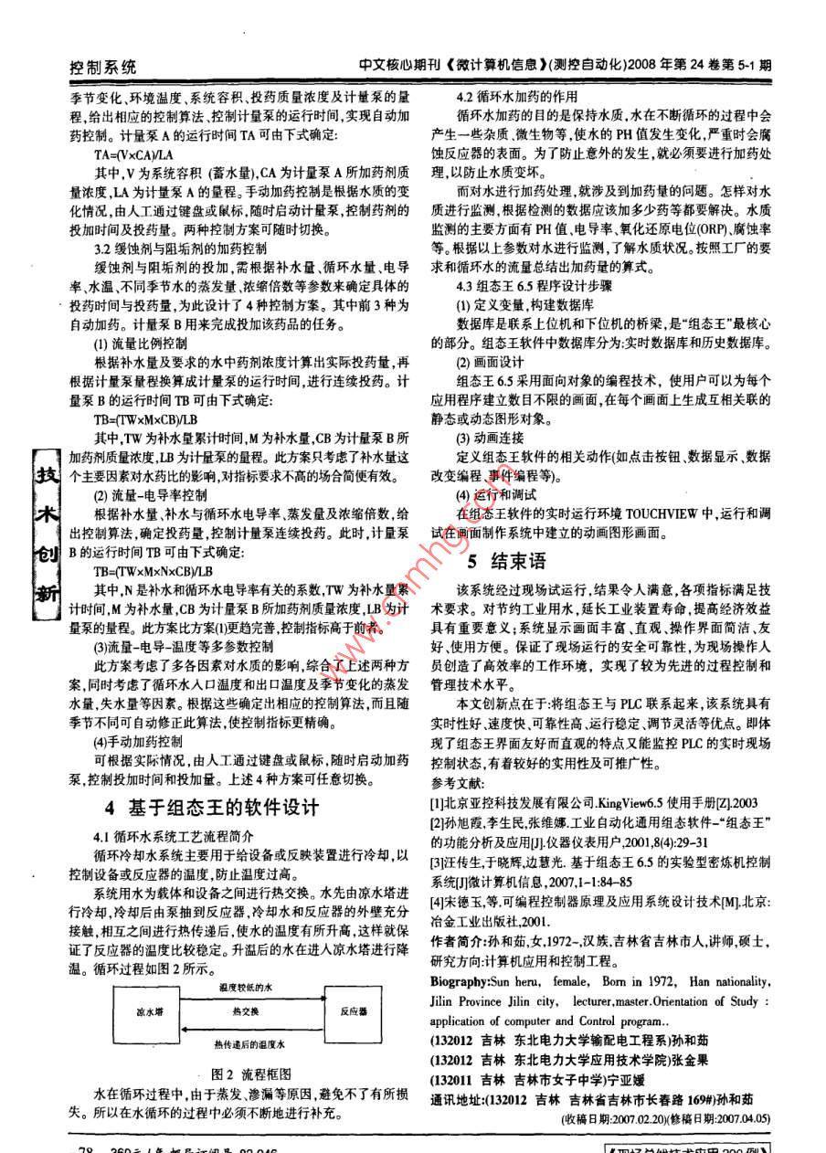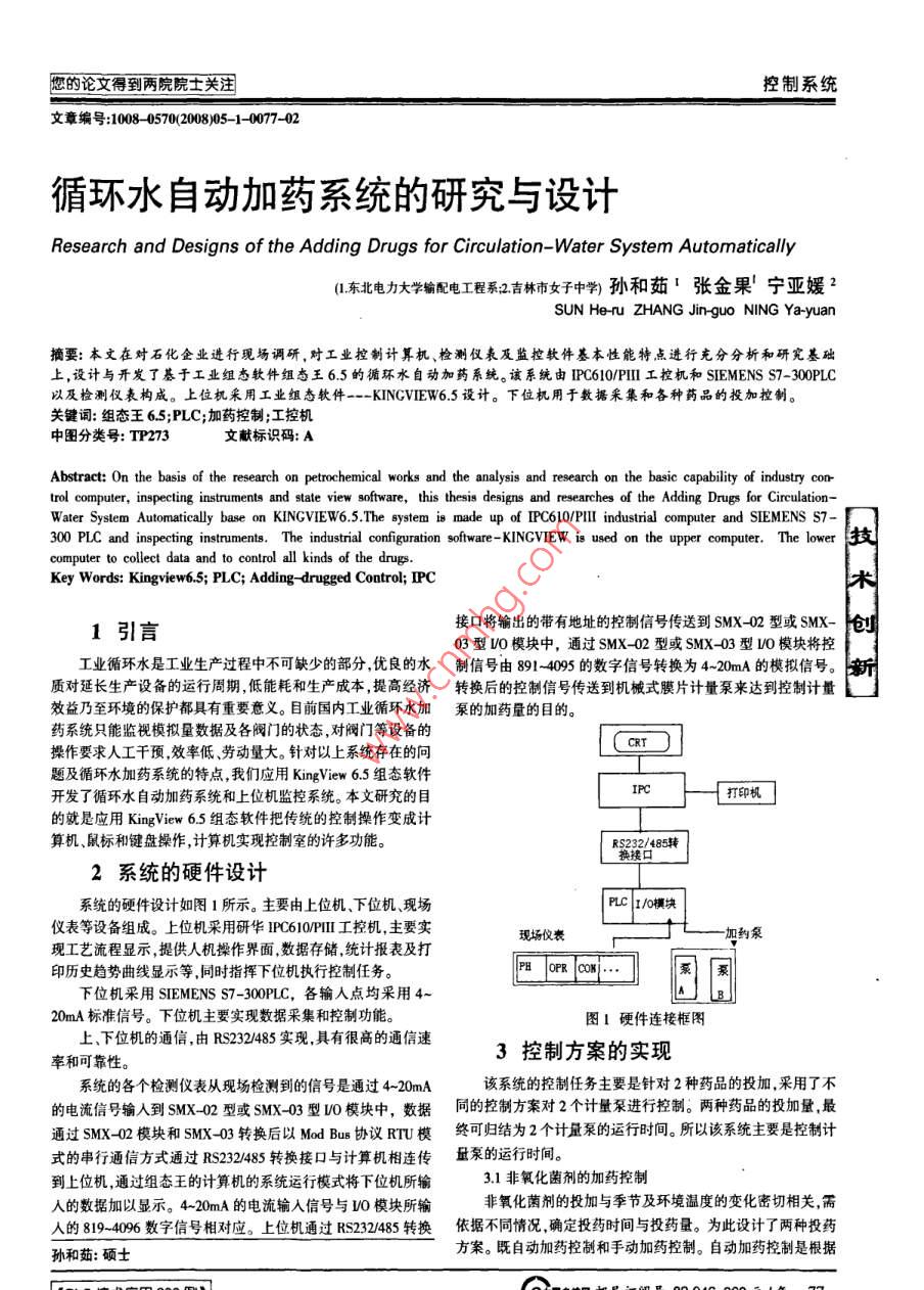您的論文得到兩院院士關(guān)注控制系統(tǒng)文章編號:1008-0570(200805-1-0077-02循環(huán)水自動加藥系統(tǒng)的研究與設(shè)計Research and Designs of the Adding Drugs for Circulation-Water System Automatically1東北電力大學(xué)輸配電工程系江吉林市女子中學(xué)孫和茹張金果寧亞媛2SUN He-ru ZHANG Jin-guo NING Ya-yuan摘要:本文在對石化企業(yè)進(jìn)行現(xiàn)場調(diào)研,對工業(yè)控制計算機、檢測儀表及監(jiān)控軟件基本性能特點進(jìn)行充分分析和研究基礎(chǔ)上,設(shè)計與開發(fā)了基于工業(yè)組態(tài)軟件組態(tài)王65的循環(huán)水自動加藥系統(tǒng)。該系統(tǒng)由IPC610PⅢ工控機和 SIEMENS S7-300PLC以及檢測儀表構(gòu)成。上位機采用工業(yè)組態(tài)軟件-- KINGVIEW6.5設(shè)計。下位機用于數(shù)據(jù)采集和各種藥品的投加控制關(guān)鍵詞:組態(tài)王65;PLC;加藥控制;工控機中圖分類號:TP273文獻(xiàn)標(biāo)識碼:AAbstract: On the basis of the research on petrochemical works and the analysis and research on the basic capability of industrytrol computer inspecting instruments and state view software, this thesis designs and researches of the Adding Drugs for CirculationWater System Automatically base on KINGVIEW6 5 The system is made up of IPC610/PIll industrial computer and SIEMENS S7300 PLC and inspecting instruments. The industrial configuration software-KINGVIEW is used on the upper computer. The lower scomputer to collect data and to control all kinds of the drugsKey Words: Kingview65; PLC; Adding-drugged Control; IPC1引言接口將輸出的帶有地址的控制信號傳送到SMX02型或SMx-]創(chuàng)03型o模塊中,通過SMX-02型或SMX-03型VO模塊將控工業(yè)循環(huán)水是工業(yè)生產(chǎn)過程中不可缺少的部分優(yōu)良的水制信號由891495數(shù)字信號轉(zhuǎn)換為4-2mA的模擬信號。質(zhì)對延長生產(chǎn)設(shè)備的運行周期,低能耗和生產(chǎn)成本提高經(jīng)濟轉(zhuǎn)換后的控制信號傳送到機械式膜片計量泵來達(dá)到控制計量效益乃至環(huán)境的保護都具有重要意義。目前國內(nèi)工業(yè)循環(huán)水加泵的加藥量的目的。藥系統(tǒng)只能監(jiān)視模擬量數(shù)據(jù)及各閥門的狀態(tài),對閥門等設(shè)備的操作要求人工千預(yù)效率低勞動量大。針對以上系統(tǒng)存在的問題及循環(huán)水加藥系統(tǒng)的特點,我們應(yīng)用 King view6.5組態(tài)軟件開發(fā)了循環(huán)水自動加藥系統(tǒng)和上位機監(jiān)控系統(tǒng)。本文研充的目的就是應(yīng)用 King view65組態(tài)軟件把傳統(tǒng)的控制操作變成計算機、鼠標(biāo)和鍵盤操作,計算機實現(xiàn)控制室的許多功能85轉(zhuǎn)2系統(tǒng)的硬件設(shè)計系統(tǒng)的硬件設(shè)計如圖1所示。主要由上位機、下位機、現(xiàn)場儀表等設(shè)備組成。上位機采用研華IPC60PI工控機,主要實現(xiàn)場儀表加約泵現(xiàn)工藝流程顯示,提供人機操作界面數(shù)據(jù)存儲統(tǒng)計報表及打印歷史趨勢曲線顯示等,同時指揮下位機執(zhí)行控制任務(wù)。下位機采用 SIEMENS S7-300PLC,各輸入點均采用20mA標(biāo)準(zhǔn)信號。下位機主要實現(xiàn)數(shù)據(jù)采集和控制功能。圖1硬件連接框圖上、下位機的通信,由RS232485實現(xiàn),具有很高的通信速率和可靠性。3控制方案的實現(xiàn)系統(tǒng)的各個檢測儀表從現(xiàn)場檢測到的信號是通過4~20mA該系統(tǒng)的控制任務(wù)主要是針對2種藥品的投加,采用了不的電流信號輸入到SMX∽02型或SMX-03型0模塊中,數(shù)據(jù)同的控制方案對2個計量泵進(jìn)行控制。兩種藥品的投加量最通過SMX-02模塊和SMX-03轉(zhuǎn)換后以 Mod bus協(xié)議R模終可歸結(jié)為2個計量泵的運行時間。所以該系統(tǒng)主要是控制計式的串行通信方式通過RS232485轉(zhuǎn)換接口與計算機相連傳量泉的運行時間。到上位機,通過組態(tài)王的計算機的系統(tǒng)運行模式將下位機所輸31非氧化菌劑的加藥控制人的數(shù)據(jù)加以顯示。4-20mA的電流輸入信號與LO模塊所輸非氧化菌劑的投加與季節(jié)及環(huán)境溫度的變化密切相關(guān)需入的819-4096數(shù)字信號相對應(yīng)。上位機通過Rs32/485轉(zhuǎn)換依據(jù)不同情況確定投藥時間與投藥量。為此設(shè)計了兩種投藥孫和茹:碩士方案。既自動加藥控制和手動加藥控制。自動加藥控制是根據(jù)控制系統(tǒng)中文核心期刊《微計算機信息》測控自動化)2008年第24卷第51期季節(jié)變化、環(huán)境溫度、系統(tǒng)容積、投藥質(zhì)量濃度及計量泵的量42循環(huán)水加藥的作用程,給出相應(yīng)的控制算法控制計量泵的運行時間,實現(xiàn)自動加循環(huán)水加藥的目的是保持水質(zhì),水在不斷循環(huán)的過程中會藥控制。計量泵A的運行時間TA可由下式確定:產(chǎn)生一些雜質(zhì)微生物等使水的PH值發(fā)生變化嚴(yán)重時會腐TA=(VXCAMLA蝕反應(yīng)器的表面。為了防止意外的發(fā)生,就必須要進(jìn)行加藥處其中V為系統(tǒng)容積(蓄水量,CA為計量泵A所加藥劑質(zhì)理以防止水質(zhì)變壞量濃度,LA為計量泵A的量程。手動加藥控制是根據(jù)水質(zhì)的變而對水進(jìn)行加藥處理,就涉及到加藥量的問題。怎樣對水化情況,由人工通過鍵盤或鼠標(biāo),隨時啟動計量泵控制藥劑的質(zhì)進(jìn)行監(jiān)測根據(jù)檢測的數(shù)據(jù)應(yīng)該加多少藥等都要解決。水