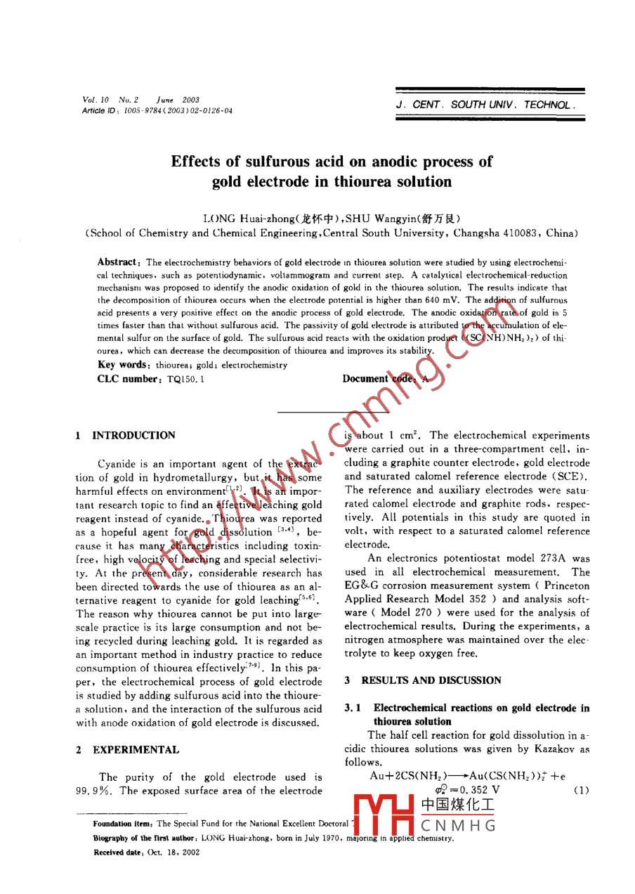 Vol. 10 Nu.2 June 2003J. CENT. SOUTH UNIV. TECHNOL.Article ID: 1005- 9784( 2003) 02-0126-04Effects of sulfurous acid on anodic process ofgold electrode in thiourea solutionLO)NG Huai-zhong(龍懷中) ,SHU Wangyin(舒萬(wàn)艮)(School of Chemistry and Chemical Engineering ,Central South University , Changsha 410083, China)Abstract: The electrochemistry behaviors of gold electrode in thiourea solution were studied by using electrochemi-cal techniques, such as potentiodynamic. voltammogram and current step. A catalytical electrochemical- reductionmechanisnl was proposed to0 identify the anodic oxidaion of gold in the thiourea solution. The results indicate thatthe decomposition of thiourea occurs when the electrode potential is higher than 640 mV. The addition of sulfurousacid presents a very positive effect on the anodic process of gold electrode. The anodic oxidation rate of gold is 5times faster than that without sulfurous acid. The passivity of gold electrode is attributed to the accumulation of ele-mental sulfur on the surface of gold. The sulfurous acid reacts with the oxidation product ((SC(NH)NH2)2) of thi-ourea, which can decrease the decomposition of thiourea and improves its stability.Key words: thiourea; gold; electrochemnistryCLC number: TQI50. 1Document code: A1 INTRODUCTIONis about 1 cm2. The electrochemical experimentswere carried out in a three-compartment cell, in-Cyanide is an important agent of the extrac-cluding a graphite counter electrode, gold electrodetion of gold in hydrometallurgy, but it has someand saturated calomel reference electrode ( SCE).harmful effects on environmentl-.2. It is an impor-The reference and auxiliary electrodes were satu-tant research topic to find an effective leaching goldrated calomel electrode and graphite rods, respec-reagent instead of cyanide. Thiourea was reportedtively. All potentials in this study are quoted inas a hopeful agent for gold dissolution [3.4), be-volt, with respect to a saturated calomel referencecause it has many characteristics including toxin-electrode.free, high velocity of leaching and special selectivi-An electronics potentiostat model 273A wasty. At the present day, considerable research hasused in all electrochemical measurement. Thebeen directed towards the use of thiourea as an al-EG&G corrosion measurement system ( Princetonternative reagent to cyanide for gold leaching 5.6i.Applied Research Model 352 ) and analysis soft-The reason why thiourea cannot be put into largeware ( Model 270 ) were used for the analysis ofscale practice is its large consumption and not be-electrochemical results. During the experiments, aing recycled during leaching gold. It is regarded asnitrogen atmosphere was maintained over the elec -an important method in industry practice to reducetrolyte to keep oxygen free.consumption of thiourea efectively-9. In this pa-er,the electrochemical process of gold electrode3 RESULTS AND DISCUSSIONis studied by adding sulfurous acid into the thioure-a solution, and the interaction of the sulfurous acid3. 1 Electrochemical reactions on gold electrode inwith anode oxidation of gold electrode is discussed.thiourea solutionThe half cell reaction for gold dissolution in a-2 EXPERIMENTALcidic thiourea solutions was given by Kazakov asfollows.The purity of the gold electrode usediAu+2CS(NH2)-一+ Au(CS(NH2))片+e99.9%. The exposed surface area of the electrode?=0.352V中國(guó)煤化工Foundation item: The Special Fund for the Narional Exellet Doetoral :.MHCNMHGBlograpby of the lirst aothor: L0NG Huai-zhong, born in July 1970, majoring in applied chenistry.Recived date; Ot.18, 2002LONG Hui-zhong, etul: Effectof sulfurous acid o anodic process of gold electrode in thioureu solution127Thiourea itself is unstable under an appropri-addition of sulfurous acid improves the anodic oxiate oxidizing condition and can be oxidized. Thedation of gold in thiourea solution.oxidation products of thioutea depend on the oxi-dants, such as hydrogen peroxide, ferric iron. I5.0was reported that with ferric iron etc, thiourea de-4.0composed as followsf'].2SC(NH2)2一→+(SC(NH)NH2)2+2H+ +2e(2)potentiodynamicpolarization curvesshown in Fig. I were obtained in 0.05 mol/L thiou-1.0-rea(TU) solution for a freshly ground stationarygold electrode starts from 0 to 1. 20 V vs SCE.From Fig. I it can be seen that the first anodic0.20 0.40 0.60 0.80 1.00 T.20shoulder a is close to the peak at 270 mV, and an-φ(vs SCE)/Vother anodic peak b appears when the potential is640 mV. Judging from the thermodynamics equi-1-<(HSO3)=5.0X10-6 mol/L. c(TU)=0;librium, peak a is assigned to reaction (1) where2-c(H2 SO,)= 1.0X 10-s mol/L, c(TU)=0. 05 mol/L;gold is oxidized, and peak b is assigned to reaction3 -c(H2SO3)= 5.0X 10-' mol/I. c(TU)=0.05 mol/L.Fig. 2 Potentiodynamic polarization curves of(2) where thiourea is oxidized.gold electrode in thiourea solution in thepresence of H2SO3 at scan rate of0.3mV/s,pH2.0and298K3-g3. 3 Passivation of anodic dissolution of gold in thi-2ourea solutionThe voltammogram curves shown in Fig. 3尼1were obtained in thiourea solution when the con-centration of sulfurous acid ranges from 5.0X 10mol/L to 5.0X10-5 mol/I. Comparison of curves1, 2, 3, shows that the anodic current density in .150.20 0.400.600.801.00 T.20creases with increasing concentration of sulfurousφ (Vs SCEYVacid, also indicating the increase of dissolution ve-Fig. 1 Potentiodynamic polarization curves oflocity of gold. From Fig. 3, the production of a-nodic oxidation can represent a stable phase on thegold electrode in thiourea solution atelectrode surface forming a passive film, because298 K and scan rate of 0. 3mV/s, pHthe anodic current decreases when the electrode po-2. 0 and c(TU)=0. 05 mol/Ltential is 0.27-0. 36 V.3.2 Anodic oxidation of gold in thiourea solution3.4 Effect of sulfurous acid on anodic dissolution'heof goldshown in Fig. 2 were obtained in thiourea solutionThe voltammogram curves shown in Fig. 4with different sulfurous acid 