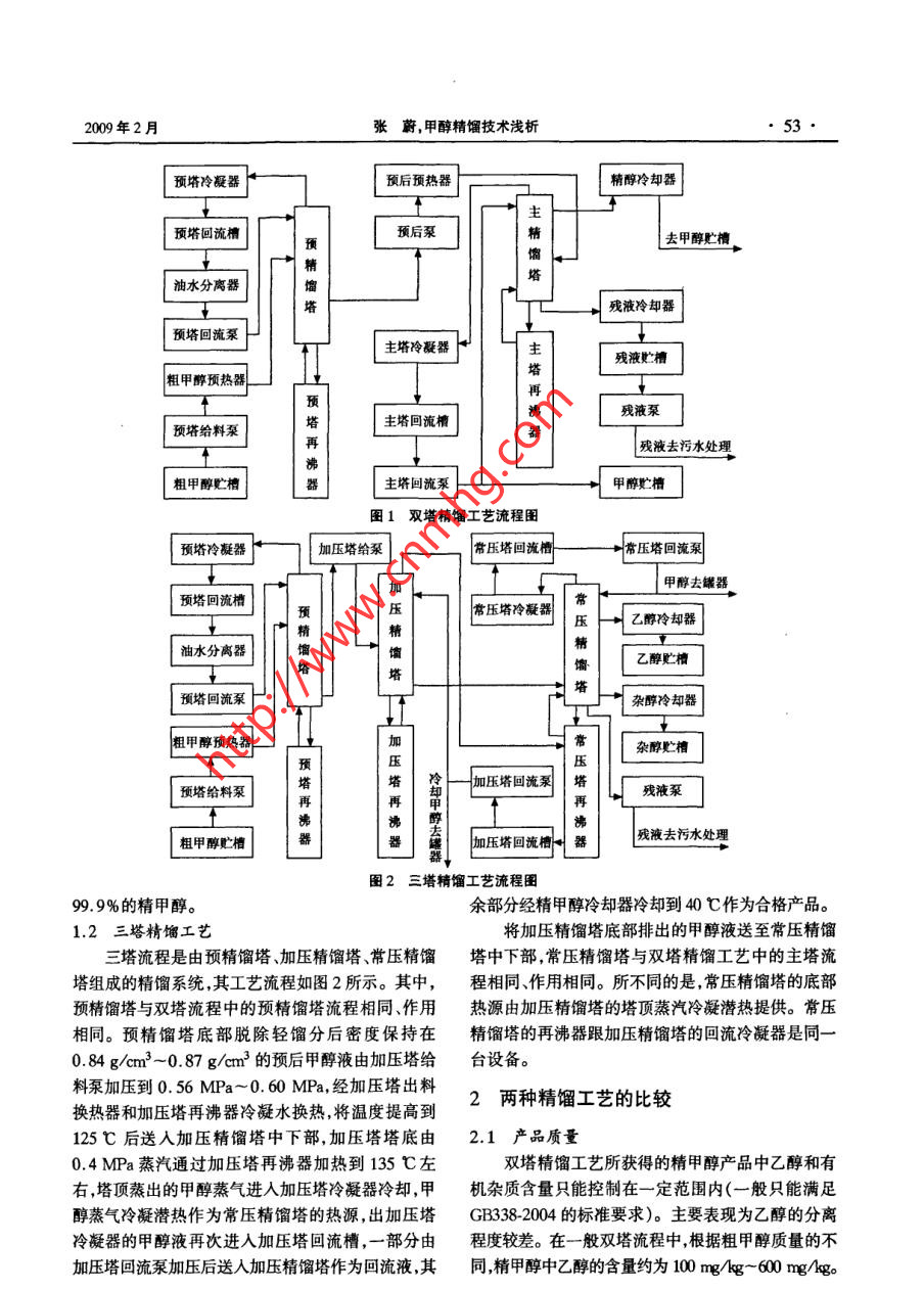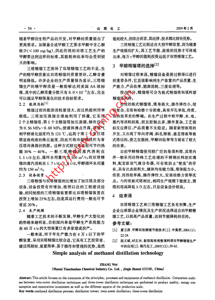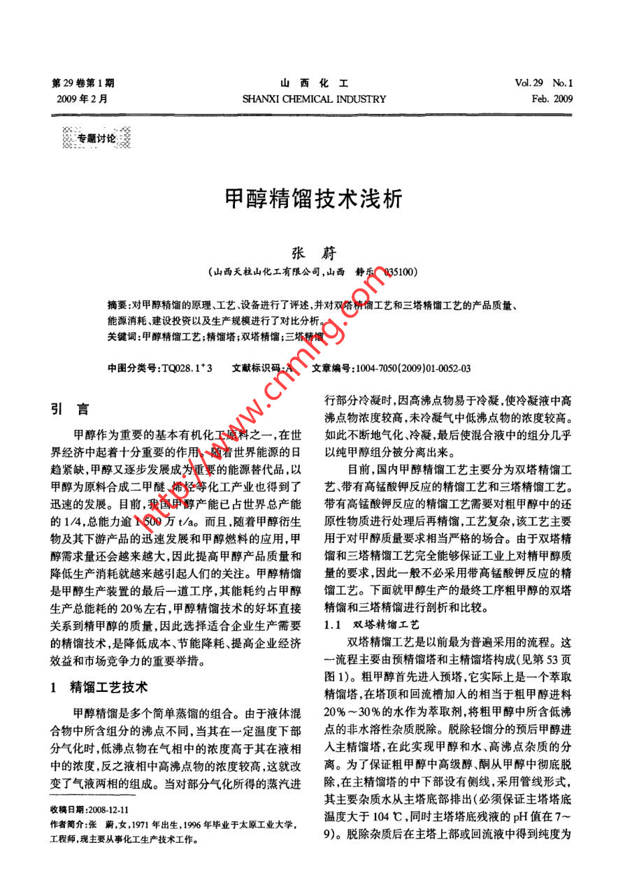 第29卷第1期山西化工Vol.29 No.12009 年2月SHANXI CHEMICAL INDUSTRYFeb. 2009專題討論甲醇精餾技術(shù)淺析長(zhǎng)蔚(山西天柱山化工有限公司,山西靜樂(lè)035100)摘要:對(duì)甲醇精餾的原理、工藝、設(shè)備進(jìn)行了評(píng)述,并對(duì)雙塔精餾工藝和三塔精餾工藝的產(chǎn)品質(zhì)量、能源消耗、建設(shè)投資以及生產(chǎn)規(guī)模進(jìn)行了對(duì)比分析。.關(guān)鍵詞:甲醇精餾工藝;精餾塔;雙塔精餾;三塔精餾中圖分類(lèi)號(hào):TQ028.1+3文獻(xiàn)標(biāo)識(shí)碼:A 文章編號(hào): 1004 7050(2009)01-0052-03行部分冷凝時(shí),因高沸點(diǎn)物易于冷凝,使冷凝液中高引言沸點(diǎn)物濃度較高,未冷凝氣中低沸點(diǎn)物的濃度較高。甲醇作為重要的基本有機(jī)化工原料之一,在世如此不斷地氣化冷凝,最后使混合液中的組分幾乎界經(jīng)濟(jì)中起著十分重要的作用。隨著世界能源的日以純甲醇組分被分離出來(lái)。趨緊缺,甲醇又逐步發(fā)展成為重要的能源替代品,以目前,國(guó)內(nèi)甲醇精餾工藝主要分為雙塔精餾工甲醇為原料合成二甲醚、烯烴等化工產(chǎn)業(yè)也得到了藝、帶有高錳酸鉀反應(yīng)的精餾工藝和三塔精餾工藝。迅速的發(fā)展。目前,我國(guó)甲醇產(chǎn)能已占世界總產(chǎn)能帶有高錳酸鉀反應(yīng)的精餾工藝需要對(duì)粗甲醇中的還的1/4,總能力逾1500萬(wàn)t/a。而且,隨著甲醇衍生原性物質(zhì)進(jìn)行處理后再精餾,工藝復(fù)雜,該工藝主要物及其下游產(chǎn)品的迅速發(fā)展和甲醇燃料的應(yīng)用,甲用于對(duì)甲醇質(zhì)量要求相當(dāng)嚴(yán)格的場(chǎng)合。由于雙塔精醇需求量還會(huì)越來(lái)越大,因此提高甲醇產(chǎn)品質(zhì)量和餾和三塔精餾工藝完全能夠保證工業(yè)上對(duì)精甲醇質(zhì)降低生產(chǎn)消耗就越來(lái)越引起人們的關(guān)注。甲醇精餾量的要求,因此一般不必采用帶高錳酸鉀反應(yīng)的精是甲醇生產(chǎn)裝置的最后一道工序,其能耗約占甲醇餾工藝。下面就甲醇生產(chǎn)的最終工序粗甲醇的雙塔生產(chǎn)總能耗的20%左右,甲醇精餾技術(shù)的好壞直接精餾和三塔精餾進(jìn)行剖析和比較。關(guān)系到精甲醇的質(zhì)量,因此選擇適合企業(yè)生產(chǎn)需要1.1雙塔精餾工藝的精餾技術(shù),是降低成本、節(jié)能降耗、提高企業(yè)經(jīng)濟(jì)雙塔精餾工藝是以前最為普遍采用的流程。這效益和市場(chǎng)競(jìng)爭(zhēng)力的重要舉措。一流程主要由預(yù)精餾塔和主精餾塔構(gòu)成(見(jiàn)第53頁(yè)圖1)。粗甲醇首先進(jìn)人預(yù)塔,它實(shí)際,上是-一個(gè)萃取1精餾工藝技術(shù)精餾塔,在塔頂和回流槽加人的相當(dāng)于粗甲醇進(jìn)料甲醇精餾是多個(gè)簡(jiǎn)單蒸餾的組合。由于液體混20% ~ 30%的水作為萃取劑,將粗甲醇中所含低沸合物中所含組分的沸點(diǎn)不同,當(dāng)其在- -定溫度下部點(diǎn)的非水溶性雜質(zhì)脫除。脫除輕餾分的預(yù)后甲醇進(jìn)分氣化時(shí),低沸點(diǎn)物在氣相中的濃度高于其在液相人主精餾塔,在此實(shí)現(xiàn)甲醇和水、高沸點(diǎn)雜質(zhì)的分中的濃度,反之液相中高沸點(diǎn)物的濃度較高,這就改離。為了保證粗甲醇中高級(jí)醇酮從甲醇中徹底脫變了氣液兩相的組成。當(dāng)對(duì)部分氣化所得的蒸汽進(jìn)除,在主精餾塔的中下部設(shè)有側(cè)線,采用管線形式,其主要雜質(zhì)水從主塔底部排出(必須保證主塔塔底收稿日期2008-12-11作者簡(jiǎn)介:張蔚,女 ,1971年出生, 1996年畢業(yè)于太原工業(yè)大學(xué),溫度大于104 C ,同時(shí)主塔塔底殘液的pH值在7~9)。脫除雜質(zhì)后在主塔上部或回流液中得到純度為工程師,現(xiàn)主要從事化工生產(chǎn)技術(shù)工作。2009年2月張蔚,甲醇精餾技術(shù)淺析●53●預(yù)塔冷凝器預(yù)后預(yù)熱器精醇冷卻器主下預(yù)塔回流槽預(yù)后泵精預(yù)|l 去甲醇貯槽。油水分離器答殘液冷卻器預(yù)塔回流泵_I主塔冷凝器殘液貯槽皆粗甲醉預(yù)熱器再預(yù)I佛|殘液泵塔主塔回流槽預(yù)塔給料泵器|殘液去污水處理沸粗甲醇貯槽|主塔回流泵甲醇貯槽圖1雙塔精餾工藝流程圄加壓塔給泵常壓塔回流槽一__一常壓塔回流泵↑加.甲醇去罐器、常壓塔冷凝器H乙醇冷卻器糖|餾乙醇貯槽雜醇冷卻器粗甲醇預(yù)熱器常雜醇貯槽開(kāi)加壓塔回流泵 塔再|(zhì)粗甲醇貯槽加壓塔回流槽器圖2三塔精餾工 藝流程圖99.9%的精甲醇。余部分經(jīng)精甲醇冷卻器冷卻到40 C作為合格產(chǎn)品。1.2三塔精餾工藝將加壓精餾塔底部排出的甲醇液送至常壓精餾三塔流程是由預(yù)精餾塔、加壓精餾塔、常壓精餾塔中下部,常壓精餾塔與雙塔精餾工藝中的主塔流塔組成的精餾系統(tǒng),其工藝流程如圖2所示。其中,程相同、作用相同。所不同的是,常壓精餾塔的底部預(yù)精餾塔與雙塔流程中的預(yù)精餾塔流程相同作用熱源由加壓精餾塔的塔頂蒸汽冷凝潛熱提供。常壓相同。預(yù)精餾塔底部脫除輕餾分后密度保持在精餾塔的再沸器跟加壓精餾塔的回流冷凝器是同一0.84 g/cm3 ~0.87 g/cm3的預(yù)后甲醇液由加壓塔給臺(tái)設(shè)備。料泵加壓到0. 56 MPa~0.60 MPa,經(jīng)加壓塔出料2兩種精餾 工藝的比較換熱器和加壓塔再沸器冷凝水換熱,將溫度提高到125C后送人加壓精餾塔中下部,加壓塔塔底由2.1 