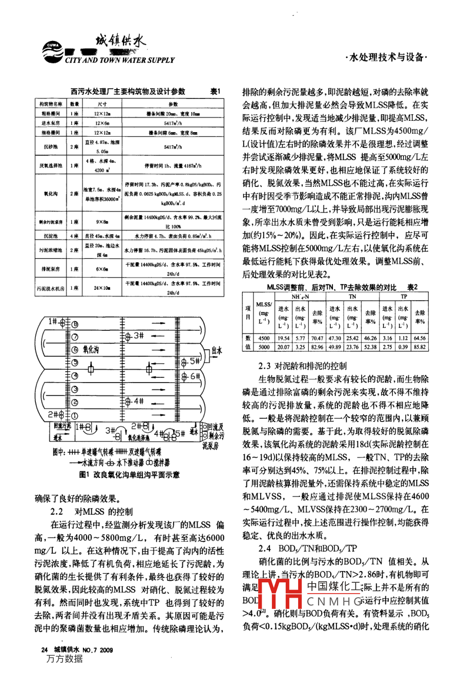 城鎮(zhèn)供水.水處理技術(shù)與設(shè)備.CITYAND TOWN WATER SUPPLY城市污水處理中的工藝運(yùn)行優(yōu)化張志軍(邯鄲市市政污水處理有限責(zé)任公司,河北邯鄲056002)摘要:由于實(shí)際進(jìn)水水質(zhì)與設(shè)計(jì)值有偏差,造成采用改良氧化溝工藝的邯鄲市西污水處理廠,運(yùn)行管理困難且費(fèi)用較高。針對(duì)該廠的實(shí)際運(yùn)行情況,探討了曝氣系統(tǒng)的DO、MLS. 泥齡等運(yùn)行參數(shù)的控制問題,并對(duì)各參數(shù)進(jìn)行了分析、優(yōu)化調(diào)整。結(jié)果顯示:該廠好氧區(qū)出水DO控制在2.5~3.5mg/L,缺氧區(qū)D0控制在0.3~0.7mg/L時(shí),可保證良好的除磷效果;將MLSS控制在5000mg/L左右,并通過排泥將泥齡控制在16~ 19d .左右時(shí),氧化溝系統(tǒng)可在最低運(yùn)行能耗下獲得最優(yōu)硝化、脫氮效果;避免過多的硝酸鹽隨回流污泥進(jìn)入?yún)捬踹x擇池也是該系統(tǒng)工藝控制的關(guān)鍵,適宜的進(jìn)水BOD3/TN比值以及穩(wěn)定可靠的反硝化控制,可進(jìn)一步提高該系統(tǒng)的處理效果,尤其是脫氮效果。關(guān)鍵詞:改良氧化溝;脫氮除磷;優(yōu)化控制邯鄲市西污水處理- -期工程是經(jīng)國家 發(fā)改委批準(zhǔn)的處理,最終進(jìn)行填埋或制肥。改良氧化溝的主要構(gòu)立項(xiàng),河北省利用世行貸款建設(shè)的城市基礎(chǔ)設(shè)施項(xiàng)目筑物及設(shè)計(jì)參數(shù)見表1。平面圖見圖1。之一。采用改良型推流式氧化溝工藝,建設(shè)規(guī)模為處2.工藝控制理能力10萬m/d,其中生活污水約占65%,工業(yè)廢水改良氧化溝工藝是集有機(jī)物降解、脫氮.除磷3 E約占35%。該工程于2004年5月建成投產(chǎn)。受收水管種功能于一體的生物處理技術(shù),因此該工藝的運(yùn)行控網(wǎng)及收水率制約,目前實(shí)際處理量為8.5 x 10'm'/d。制應(yīng)同時(shí)滿足各項(xiàng)功能的要求。針對(duì)該廠的進(jìn)水水質(zhì)該廠主要處理邯鄲市京廣鐵路東北部和鐵路以西區(qū)域特點(diǎn),在總結(jié)氧化溝工藝長期運(yùn)行控制經(jīng)驗(yàn)的基礎(chǔ)上,的生活污水及該區(qū)域內(nèi)的部分工業(yè)企業(yè)生產(chǎn)廢水,服得出了具體的優(yōu)化控制方式。務(wù)面積約50km',服務(wù)人口約45萬人,2020年 規(guī)劃收2.1 對(duì)曝氣系統(tǒng)DO的控制集污水量為20萬m/d,分兩期實(shí)施。運(yùn)行實(shí)踐表明,在該改良氧化溝脫氦除磷工藝中,由于生物除磷該污水廠的出水水質(zhì)始終優(yōu)于《污水綜合排放標(biāo)準(zhǔn)》(本身并不消耗氧氣,故實(shí)際供氧量只需考慮以下三部GB8978- -1996)的二級(jí)標(biāo)準(zhǔn),已達(dá)到了設(shè)計(jì)要求。分:脫碳需氧量、硝化需氧量及反硝化產(chǎn)氧量。在該1.工藝流程廠的實(shí)際運(yùn)行控制中,各段曝氣量- -般是根據(jù)在線DO該廠采用的改良氧化溝工藝,將氧化溝和厭氧選儀和便攜式DO儀的監(jiān)測(cè)值,通過調(diào)整曝氣轉(zhuǎn)碟開啟臺(tái)擇池合建為-一個(gè)處理單元,它是-一個(gè)多溝串聯(lián)系統(tǒng),數(shù)或葉輪轉(zhuǎn)速來控制的。經(jīng)長期的運(yùn)行實(shí)踐可得出各分為兩組,每組8個(gè)廊道,共安裝24臺(tái)轉(zhuǎn)碟曝氣機(jī),其區(qū)DO的控制范圍:氧化溝內(nèi)MLSS較高(-般可達(dá)到中單.雙速轉(zhuǎn)碟各12臺(tái),在各溝道內(nèi)交替均勻布置。4000~ 5800mg/L),一般保持缺氧區(qū)DO為0.3~0.7進(jìn)水與回流污泥在厭氧選擇池內(nèi)均勻混合后進(jìn)入氧化mg/L,好氧區(qū)DO控制在2.0~3.2mg/L, 若太低會(huì)溝,在溝內(nèi)往復(fù)循環(huán)流動(dòng)。由于該氧化溝工藝獨(dú)特的抑制硝化作用,太高則會(huì)使DO隨回流污泥進(jìn)入?yún)捬鯗闲秃娃D(zhuǎn)碟曝氣機(jī)的布置方式,為有機(jī)物的去除和脫區(qū),影響聚磷菌的釋磷,而且會(huì)使聚磷菌在好氧區(qū)消耗氮除磷創(chuàng)造了良好的宏觀和微觀環(huán)境,使得該系統(tǒng)最過多的有機(jī)物,從而影響對(duì)磷的吸收。從實(shí)際運(yùn)行效終能獲得穩(wěn)定、優(yōu)良的出水水質(zhì)。氧化溝出水進(jìn)入中r芬的險(xiǎn)咪加用-始終能保持在較高心進(jìn)水周邊出水的輻流式沉淀池,進(jìn)行泥水分離后,其的水YH中國煤化工DO的有效控制,尤出水一部分排放至廠區(qū)北部輸元河,另-部分通過抽其是CNMH G_3.5mg/L, 當(dāng)混升泵站及管路排入市內(nèi)沁河,做為景觀用水。污泥通合液進(jìn)入二沉池完成泥水分離后,充足的DO保證了聚過剩余污泥泵房排入污泥濃縮池及脫水機(jī)房進(jìn)行相應(yīng)磷菌能將磷牢牢地聚積于體內(nèi)而不釋放于水中,最終城鎮(zhèn)供水NO.7 200923城鎮(zhèn)供水零CITYAND TOWN WATER SUPPLY●水處理技術(shù)與設(shè)備.西污水處理廠主要構(gòu)筑物及設(shè)計(jì)參數(shù)表1排除的剩余污泥量越多,即泥齡越短,對(duì)磷的去除率就構(gòu)筑物名稱數(shù)量參會(huì)越高,但加大排泥量必然會(huì)導(dǎo)致MLSS降低。在實(shí)粗格柵間|座棚條問隙20m,寬度10m際運(yùn)行控制中,發(fā)現(xiàn)適當(dāng)?shù)販p少排泥量,即提高M(jìn)LSS,進(jìn)水梨房1座12x65417m'/h細(xì)格蛋間1座12X12m操條向敞6m,寬度8om結(jié)果反而對(duì)除磷更為有利。該廠MLSS為4500mg/沉砂池2庵直徑4.87m. 地操5417m/hL(設(shè)計(jì)值)左右時(shí)的除磷效果并不是很理想,經(jīng)