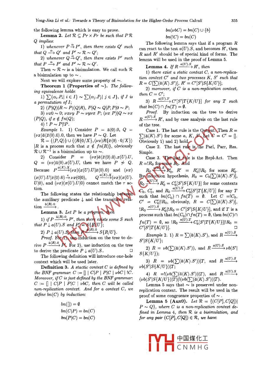 May 2004, Vol.19, No.3, pp.352- 363J. Comput. Sci. & Technol.Towards a Theory of Bisimulation for the Higher-Order ProcessCalculiYong-Jian Li and Xin-Xin LiuLaboratory of Computer Science, Institute of Software, The Chinese Academy of Sciences, Bcijing 100080P.R. China .E-mail: lyj238@ios.ac.cnReceived December 25, 2002; revised September 12, 2003.Abstract In this paper, a labelled transition semantics for higher-order process calculi is studied. The labelledtransition semantics is relatively clean and simple, and corresponding bisimulation equivalence can be easilyformulated based on it. And the congruence properties of the bisimulation equivalence can be proved easily.To show the correspondence between the proposed semantics and the well-established oncs, the bisimulation ischaracterized as a version of barbed equivalence and a version of context bisimulation.Keywords higher order process, labelled transition semantics, barbed bisimulation, context- bisimulation1 Introductioncated the definition of labelled transition relation.The second problem is the meaning of the label ofLabelled semantics achieved great success inhigher order output action in traditional LTS. Itearly studies of process calculi. Based on lblled only takes into account the object that the processsemantics, the idea of bisimulation was introduced emits, but not the context in which the emittedand formulated by Miner and Parkl,2 and has be- object is supposed to be used. For example, let uscome one of the most important notions in pro-consider an output action in HOπ's LTS[5].cess calculi. In mobility-free calculi such as cCsl3P v遠(yuǎn)(K), p'which has later become a blueprint for new processcalculi, a labeled transition system describes the where vca(K) represents the output object of P,operational behaviors of processes, and bisimula and P' represents the derivative of P. And thetion is defined on top of the labeled transition sys- whole transition rule does not contain any infor-tem (LTS) by imposing the following requirement: mation about the context in which emitted objecttwo processes are bisimilar if any action by one of is supposed to be used.ther can be matched by an equal action from theThis traditional higher order output transitionother in such a way that the resulting derivatives will cause the non naturalness problems in the def-are again bisimilar. Note that two matching actions inition of bisimulation. In more detail, when defin-must be syntactically identical. It is reasonable in ing some kind of bisimulation R of two examplefirst-order process calculus, because the effect of processes P, Q, we cannot use the traditional clausethe first-order object on the enviroument can be as below to define the matching of the higher-orderentirely represented by its syntax form.output actions of the two processes.When moving to more powerful process calculi●Whenever P與P', then Q' existss.t. Q牛Q'with mobility and higher order features, the tra- and P' RQ', where μ is a higher-order output ac-ditional labelled semantics become hard to work tion.(1with, and corresponding bisimulation formulationsUnlike first- order output action, the compari-are often much more elaborated, resulting in less son of labels of high order output action, for exam-satisfactory theories. It seems that two problems ple, processes, cannot be based on syntactic iden-have made traditional labelled semantics difficult tity in formulation of bisimulation, that would befor richer process calculi. The first is passing of too strong for any reasonable sernantic equivalence.local names out of the scope where they are deThomsen used bisimilarity instead of identity infined. The scope extrusion rule was introduced comparing labelslo), following earlier ideas of Aste-to cope with this4, but some delicate structure siano and Boudol[r別), but the resulting equivalencewas also introduced into the labels, which compli-is still too strong.*CorrespondenceThis work is Bupported by the National Natural Science Foundation of China under Grant No.60173020.中國煤化工MYHCNMHGYong-Jian Li et al: Towards a Theory of Bisimulation for the Higher Order Process Calculi353Sangiorgi had some very ilustrative examplesidea can be successfully applied to higher orderof the problems in his dissertationsl5. And heprocess calculi. In our labelled transition seman-pointed out that the separation between the ob-tics, there are three kinds of labels: T, a(U).q,ject part (i.e, the process emitted) and the con-a(K).0. As usual, P與P' represents internal com-text of a higher-order output prevents a satisfac-munication as traditional LTS. However p*OYp'tory treatment of the channels private to the two,and p4R2) P' represent that P can respond to theand then causes the problems of higher order bisim-ulation mentioned above. To avoid this separation tets a(V).Q and (K>.0 from context rspectivelyebetween object part and context of an output ac-and then becomes P'. We will show that our la-tion, he proposed a context bisimulation as belowbelled transition semantics are relatively clean andwhich explicitly takes into account the context inthe corresponding bisimulation equivalence can bewhich the emitted object is supposed to be used.easily obtained.To show the correctness and rationality of ourWhenever P IDOa\h14P', then Q' ex-semantics, we want to show the correspondenceists s.t.Q welakz+Q' and for all PG withbetween our labelled semantics and those well-fn(PG)n(6u2) = 0, (ub)(P'PG{K/U})R estabished. First, we want to relate our LTS with(ue)(Q'|PG{K2/U})-(2reduction semantics. And we will characterize ourBut this style of context bisimulation still seemsnew bisimulation in terms of a version of barbednon-natural and complex. First, the clauses of theequivalence. Second, we relate our LTS semanticsdefinition of bisimulation are not defined in a uni-to Sangorigi's LTS. And our new bisimulation willform style. The clause, which defines matching be-be characterized in terms 