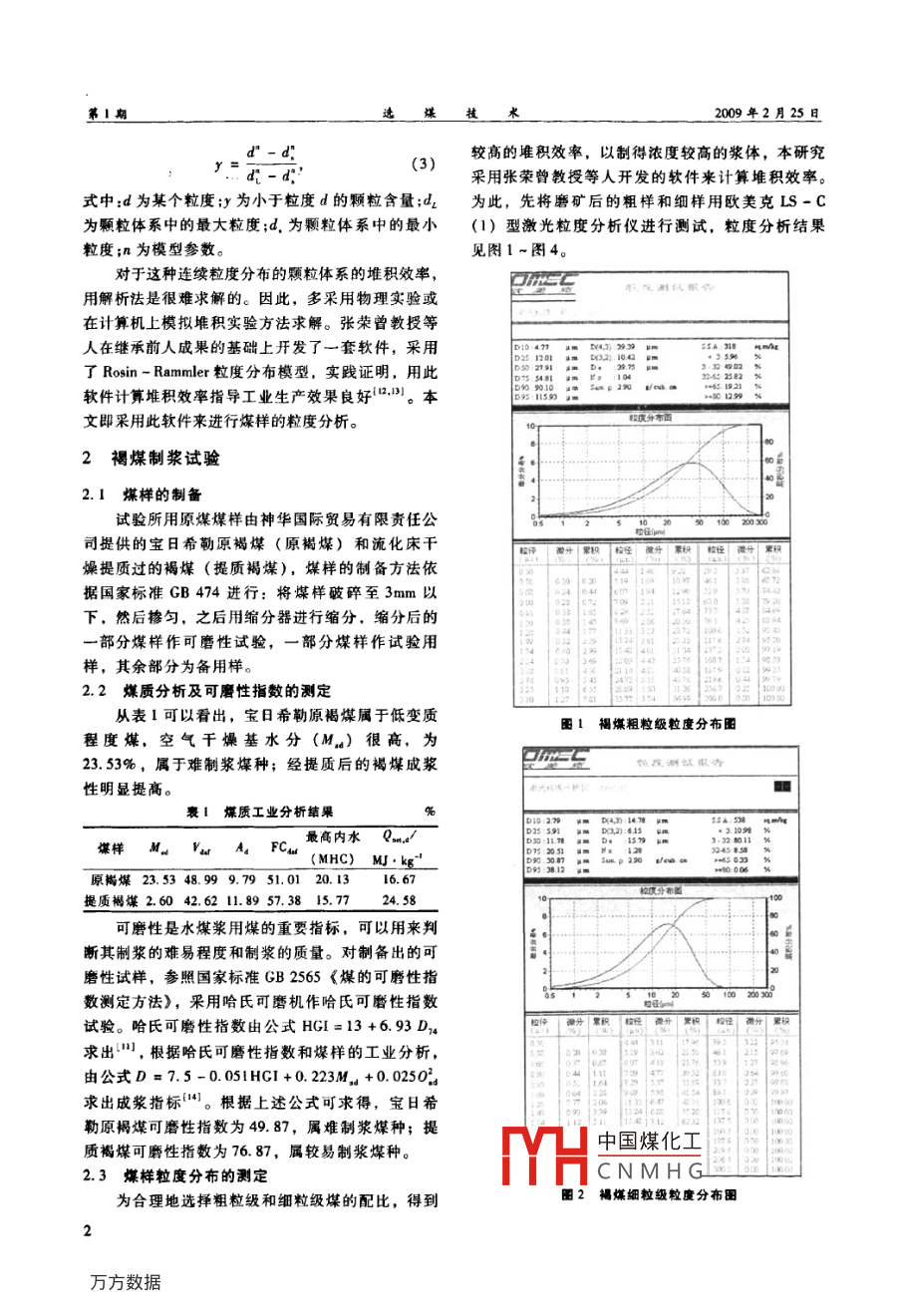 第1期選煤技末2009年2月COAL PREPARATION TECHNOLOGYFeb.2009文章編號(hào):1001-3571(2009)01-0001粒度分布對(duì)提質(zhì)褐煤水煤漿性能影響的研究高志芳,朱書全,黃波,王娜,官長平(中國礦業(yè)大學(xué)(北京),北京100083)摘要:為了研究顆粒粒度分布的堆積效率在難制漿煤種制備水煤漿過程中的作用,試驗(yàn)選用內(nèi)蒙古寶日希勒褐煤和氣流干燥管工藝提質(zhì)過的褐煤作為研究對(duì)象,并采用歐美克激光粒度測試儀進(jìn)行煤樣的粒度分析,應(yīng)用相關(guān)的軟件,計(jì)算出兩種煤樣在不同配比下的堆積效率,研究了粒度分布對(duì)兩種水煤漿濃度、粘度、流變性及穩(wěn)定性的彩響,結(jié)果喪明:提質(zhì)褐煤媟樣達(dá)到了較好的粒度分布,堆積效率提高6.74個(gè)百分點(diǎn),水煤漿的濃度相應(yīng)提高6.6個(gè)百分點(diǎn),達(dá)到60.83%滿足了工業(yè)要求。因此,合理的粒度分布能明顯改變提質(zhì)褐煤水煤漿的流變性,有效提高提質(zhì)褥煤水煤漿的濃度。關(guān)鍵詞:粒度分布;堆積效率;水煤漿;濃度;粘度;流變性;穩(wěn)定性中圖分類號(hào):TQ536文獻(xiàn)標(biāo)識(shí)碼:A水煤漿是20世紀(jì)70年代石油危機(jī)中發(fā)展起來研究卻較少。的一種新型燃料,它由65%-0%的煤、29%研究表明,在制漿過程中,采用合理的粒度級(jí)34%的水和少于1%的化學(xué)添加劑經(jīng)過一定的加工配不但可使煤顆粒達(dá)到較高堆積密度(高濃度),工藝制成的懸浮分散體系,具有低污染、易泵送、而且可使?jié){體具有較好的流動(dòng)性,同時(shí)粘度符合工燃燒效率高等優(yōu)點(diǎn),是煤基代油流體燃料。鑒于我業(yè)要求。文章就內(nèi)蒙古寶日希勒褐煤成漿性能以及國富煤貧油的國情,開發(fā)煤代油技術(shù)屬于我國的基提質(zhì)過的褐煤的成漿性能,研究了堆積效率對(duì)寶日本能源政策山。希勒提質(zhì)褐煤成漿性能的影響。褐煤是我國煤炭資源儲(chǔ)量中十分豐富的一類煤炭,地區(qū)分布也較廣泛,其中以內(nèi)蒙褐煤儲(chǔ)量最1粒度分布的數(shù)學(xué)模型多,且多形成于中生代侏羅紀(jì)。褐煤屬軟質(zhì)煤,其制備高濃度水煤漿的技術(shù)關(guān)鍵之一,是要求水特征是水分大,與煙煤等硬煤有很大差異??傮w來煤漿的粒度分布達(dá)到較高的堆積效率,亦即要求煤說,我國褐煤的煤質(zhì)特性是全水分高、發(fā)熱量低、粒堆積時(shí)空隙少,固體容積濃度高。為此,首先要含氧多、燃點(diǎn)低、易風(fēng)化變質(zhì)和自燃發(fā)火,硫分較搞清堆積效率與粒度分布的關(guān)系。在實(shí)際工作中低,灰分適中。目前,國內(nèi)褐煤多用于煤礦坑口發(fā)遇見的多屬連續(xù)分布的顆粒,研究連續(xù)分布顆粒體電或民用燃料,利用率低,污染嚴(yán)重。褐煤屬系的堆積特性必須先建立描述這種粒度分布的數(shù)學(xué)于難制漿煤種,在水煤漿技術(shù)的應(yīng)用與推廣過模型。最常用的粒度分布模型主要有 Rosin-程中,如何采用難制漿的煤種制得高濃度、低粘 Rammer、 Gaudin- Schuhmann、Ared及對(duì)數(shù)正態(tài)度、流動(dòng)性好的水煤漿一直是人們關(guān)注的問題“。分布模型7-l國內(nèi)外許多學(xué)者在褐煤提質(zhì)變性方面進(jìn)行了研究,(1)Roin- Rammer粒度分布模型為:證明了提質(zhì)可以顯著脫除褐煤內(nèi)部較高含量的內(nèi)在水分,降低其吸水性,改善褐煤的煤質(zhì);對(duì)褐exp煤制漿過程中煤表面物理化學(xué)性質(zhì)和添加劑的分子式中:d為某個(gè)粒度;R為大于粒度d的顆粒含量;d結(jié)構(gòu)特征對(duì)水煤漿性能的影響也做了比較深入的研為與R=0.368相對(duì)應(yīng)的粒度;n為模型參數(shù)。究;但是,對(duì)粒度堆積效率對(duì)成漿性能影響的(2) Gaudin- Schuhmann粒度分布模型為:基金項(xiàng)目:國家自然科學(xué)基金(編號(hào)為50074033)y=(d)修改稿收稿日期:2008-11-0作者簡介:高志芳(1978-),女,河北滄州人,中國礦業(yè)大學(xué)式中中國煤化工d的顆粒含量;d(北京)化學(xué)與環(huán)境工程學(xué)院在讀博士研究生,主要從事潔凈煤技術(shù)方面的研究。E-mil:gfrj66@163.c0m,聯(lián)系方式為顆CNMH參數(shù)158l1013302(3)Ared粒度分布模型為:第1期選媒技術(shù)2009年2月25日d-d(3)較高的堆積效率,以制得濃度較高的漿體,本研究di - d采用張榮曾教授等人開發(fā)的軟件來計(jì)算堆積效率式中:d為某個(gè)粒度;y為小于粒度d的顆粒含量;d2為此,先將磨礦后的粗樣和細(xì)樣用歐美克LS-C為顆粒體系中的最大粒度;d,為顆粒體系中的最小(1)型激光粒度分析儀進(jìn)行測試,粒度分析結(jié)果粒度;n為模型參數(shù)見圖1-圖4。對(duì)于這種連續(xù)粒度分布的顆粒體系的堆積效率,用解析法是很難求解的。因此,多采用物理實(shí)驗(yàn)或在計(jì)算機(jī)上模擬堆積實(shí)驗(yàn)方法求解。張榮曾教授等人在繼承前人成果的基礎(chǔ)上開發(fā)了一套軟件,采用B3:13了 Rosin- Rammer粒度分布模型,實(shí)踐證明,用此軟件計(jì)算堆積效率指導(dǎo)工業(yè)生產(chǎn)效果良好。本D251159,1“·“B文即采用此軟件來進(jìn)行煤樣的粒度分析。2褐煤制漿試驗(yàn)2.1煤樣的制備試驗(yàn)所用原煤煤樣由神華國際貿(mào)易有限責(zé)任公司提供的寶日希勒原褐煤(原褐煤)和流化床干累積9粒徑微分累積燥提質(zhì)過的褐煤(提質(zhì)褐煤),煤樣的制備方法依據(jù