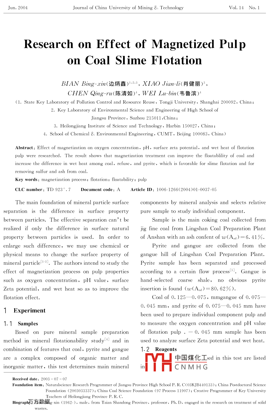 Jun.2004Journal of China University of Mining & TechnologyVol. 14 No. 1Research on Effect of Magnetized Pulon Coal slime flotationBIAN Bing-xin(邊炳鑫)23,XlAO,Jin-li(肖健麗)3,CHEN Qing(陳清如), WEI LU-bin(韋魯濱)(1. State Key Laboratory of Pollution Control and Resource Reuse, Tongji University, Shanghai 200092, China2. Key Laboratory of Environmental Science and Engineering of High School ofJiangsu Province, Suzhou 215011, China3. Heilongjiang Institute of Science and Technology, Harbin 150027, Chi4. School of Chemical & Environmental Engineering, CUMT, Beijing 100083, ChinaAbstract: Effect of magnetization on oxygen concentration, pH, surface zeta potential, and wet heat of flotationpulp were researched. The result shows that magnetization treatment can improve the floatability of coal andincrease the difference in wet heat among coal, refuse, and pyrite, which is favorable for slime flotation and forFur and ash from coalKey words magnetization process; flotation; floatability pulpCLC number: TD923+7 Document code: A Article ID: 1006-1266(2004)01-0037-05The main foundation of mineral particle surface components by mineral analysis and selects relativesurface propertpure sample to study individual componentbetween particles. The effective separation cant bemple is the main coking coal collected fromrealized if only the difference in surface naturalfine coal from Lingshan Coal Preparation Plantproperty between particles is used. In order to of Anshan with an ash confent of w(Aad)=6.41%enlarge such difference,wee chemical orPyrite andcollected from thephysical means to change the surface property of gangue hill of Lingshan Coal Preparation Plantmineral particle[1-3. The authors intend to study the Pyrite sample has been separated and processedeffect of magnetization process on pulp properties according to a certain flow process 5. Gangue issuch as oxygen concentration.value. suhand-selected coarse shale, no obvious pyriteZeta potential, and wet heat so as to improve the insertion is found (we(A d)=80. 62%)flotation effectCoal of 0. 125--0 075, mmgangue of 0.0750. 045 mm, and pyrite of 0. 075-0. 045 mm haveexpeRimenbeen used to prepare individual component pulp and1 Samplesto measure the oxygen concentration and ph valueBased on pure mineral sample preparation of flotation pulp0.045 mm sample has beenmethod in mineral flotationability study 4 and in used to analyze surface Zeta potential and wet heatcombination of features that coal, pyrite and gangue 1.2 Reagentsare a complex composed of organic matter andinorganic matter, this test determines main mineralYH中國(guó)煤化工 sed in this test are listedCNMHGReceived date: 2003-07-0Foundation item Naturalscience Research Programmer of Jiangsu Province High School P. R C(o3KJB440133): China Postdoctoral ScienceFoundation (2003033337): China Coal Science Foundation (97 Process 11907 ) Creative Programmer of Key UniversityTeachers of Heilongjiang Province P. R CBiograph HadHEg-xin (1962-). male, from Taian Shandong Province, professor, Ph. D, engaged in the research on treatment of solid38Journal of China University of mining & TechnologyVol 14 No. 1Table 1 Flotation agents in the experimentagent name code molecular formulapurityolecular weightroduction areaChOhuse oil >87%Shanghai Chemical Reagent CompanyThin diesel oil 0C5-17)HIndustrial productsDa Qing Oil Refinery1.3 Magnetization equipmentused in the experiment are listed in Table 2.The magnetizatioRectifierthe authors and is used to regulate magneticRectifierinteraction intensity with agitation intensity beingadjustable. The structure of the magnetized deviceFig. 1Direct-current4 Analysis equipmentThe main analysis and measurement equipmentFig 1 Construction of the magnetization equipmentTable 2 Measurement equipment in the experimentMeaH measurementPHS-2C acidometer PHS-29A±0.001Shanghai Science Instrument PlantE-potential meterZetamaster%UK Malvern Companyoxygen conntration ox0.1mg·1-1Germanys ScientificmeasurementMagnetic interactionIntensity measuringDigit MagnetometerCTS24Shanghai Zhenhong Industrialany lte.5 Magnetization flotation testintensity B=2T, agitateth n=200r/Individual component"magnetization flotation room temperature t=20 C, thXFG flotation machine. The concentration of individual component flotation pulpvolume of the flotation machine is 60 mL and the is determined as 50 g/L. The oxygen content inwater for flotation is the un-magnetized distilled 500 mL of pulp is shown in Fig. 2Accord9.5adjustable range of magnetization equipment, the9.0agent system is determined to have a collecting8agent usage of 1.5 kg/tls, a frothing agent usageof 100 g/t, an agent ratio of 15 1, a pulp0246810121416adjusting time of 2 min, a collecting agent adjustingtime of 1 min, a frothing agent adjusting time of 1Fig 2 Effect of magnetization time uponmin, a magnetic interaction intensity B of 0oxygen concentration of pulp0. 35T, a magnetization time of 0-15 min, and anIt can be seen from Fig. 2 that the pH values ofgitation rotational speed of 200 r/mithree pulpsincrease with the increaseAfter flotation, the floating matter is filtered, of magnetization time. But the gangue pulp showsdried, and weighed so that the mineral up floatingratio can be calculatedH中國(guó)煤化study that in order toCNMHUI UAy gell aCtivation, adding a certain2 Result and Discussionamount of oxygen to control the concentration is2. 1 Effect of magnetization process on oxygenbeneficial to mineral flotation 6. Fig. 2 indicatesco丹黢捃nthat the pulp oxygen concentration increases afterOn the conditions of magnetic interaction being magnetized and shows that magnetizationbian Bing-xin et alResearch on Effect of Magnetized Pulp on Coal Slime39process is favorable for slime flotationbetween mineral and collecting agent is good. The2. 2 The effect of magnetization process on data in Table 3 indicate that the decreasingflotation pulp PH valuemagnitude of electric potential of coal in magnetizedOn the